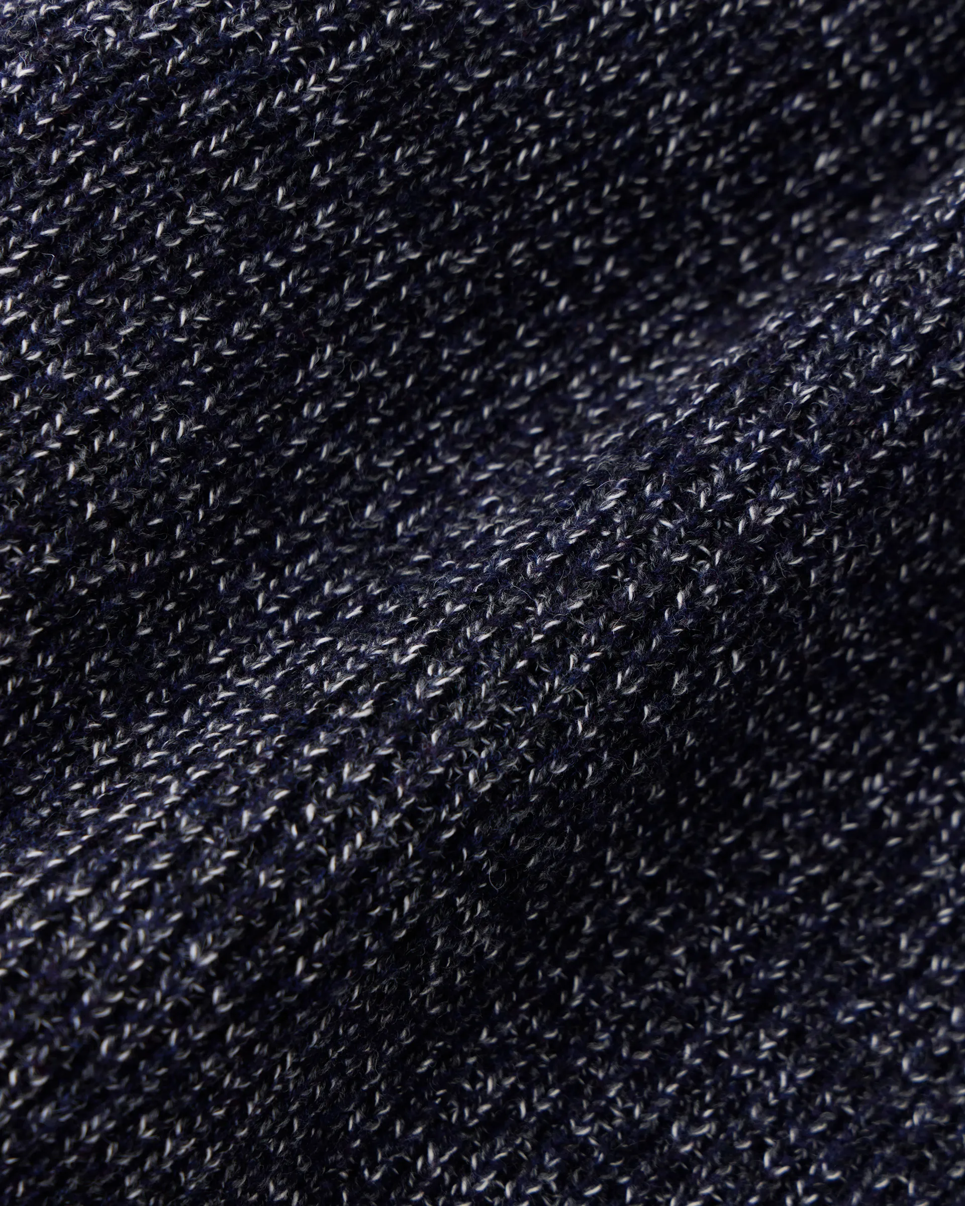 英国羊毛と南米ウールをブレンドした糸で編み立てたシャンブレー調のビーチニットジャケット。1930〜1960年代のアメリカ製ビーチジャケットにインスピレーションを受け、現代的に再構築しています。アウターとしてラフに羽織れる設計で、弾力とハリのある糸に甘撚り糸を加えて編み立てることで、細かな杢のような表情を表現。成型後にレザー工場に移し、襟裏や袖口など随所にカウレザーのディテールを加えています。