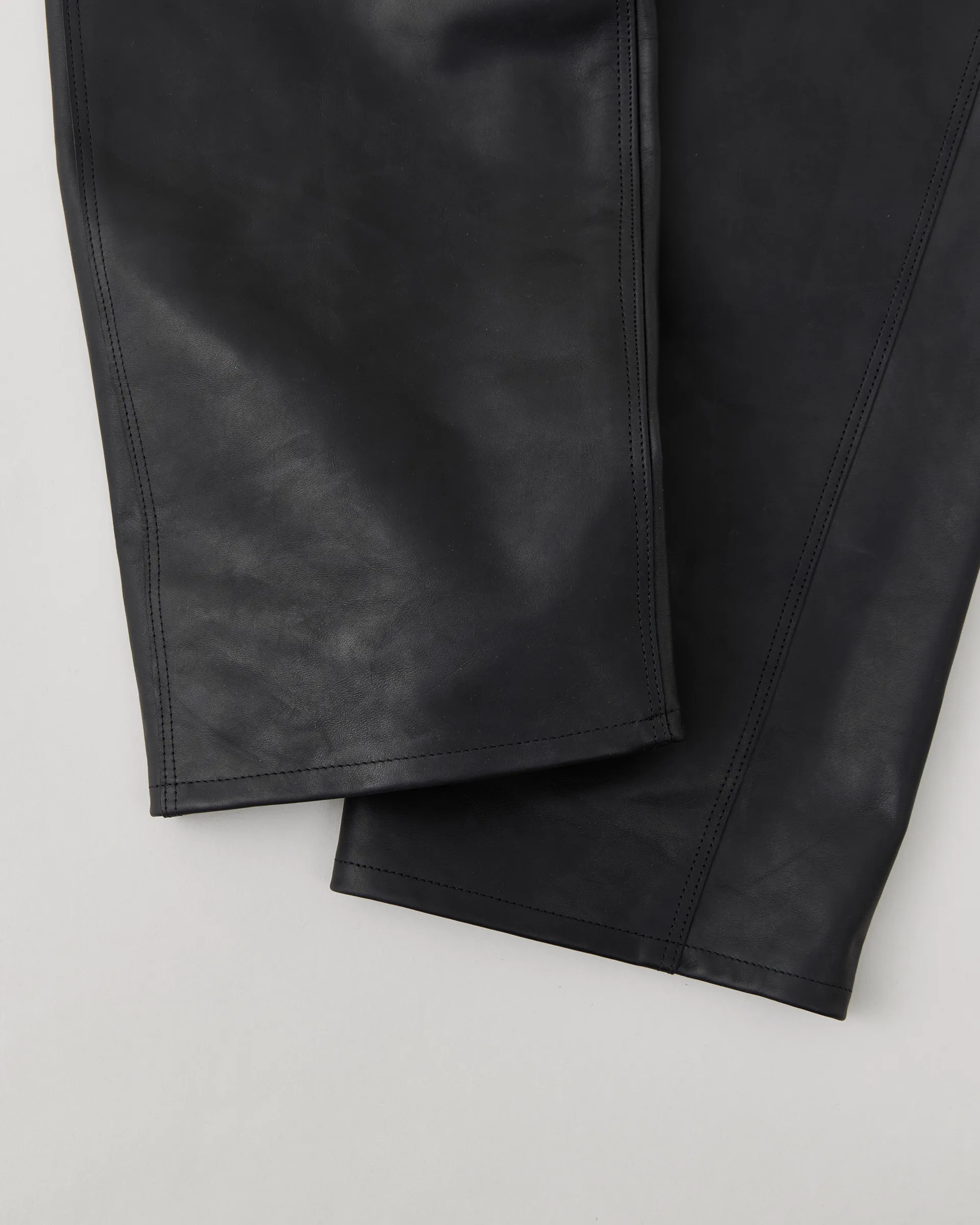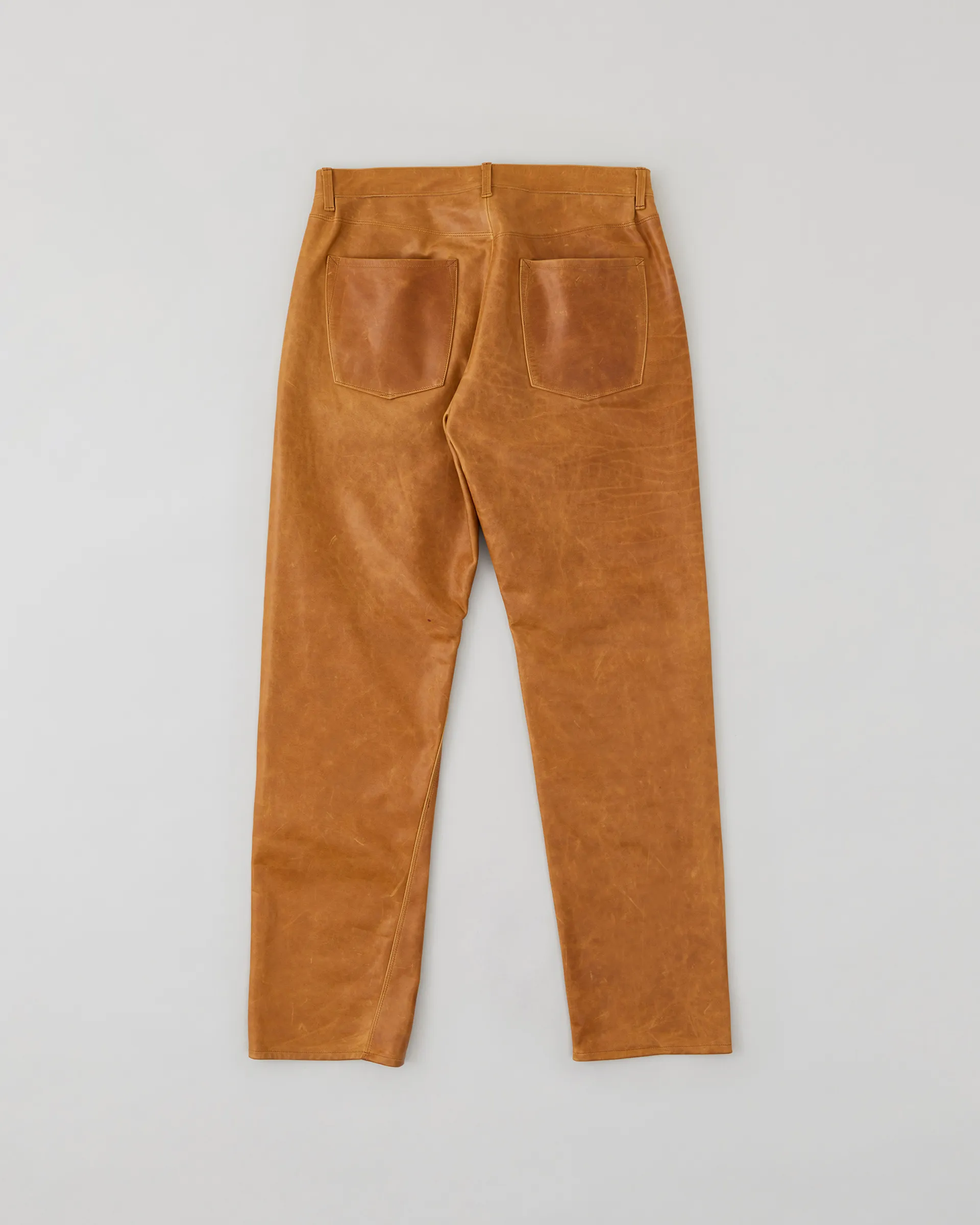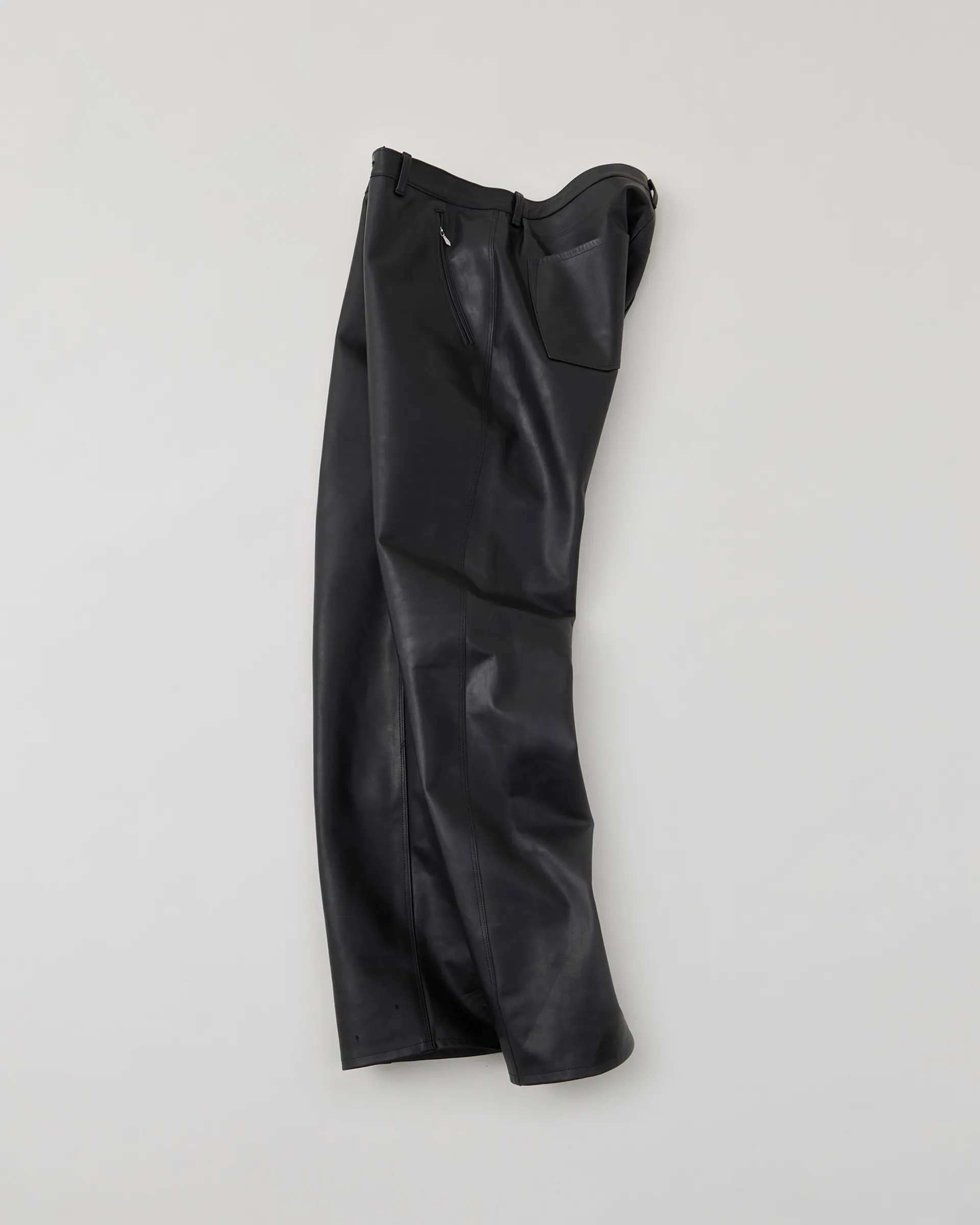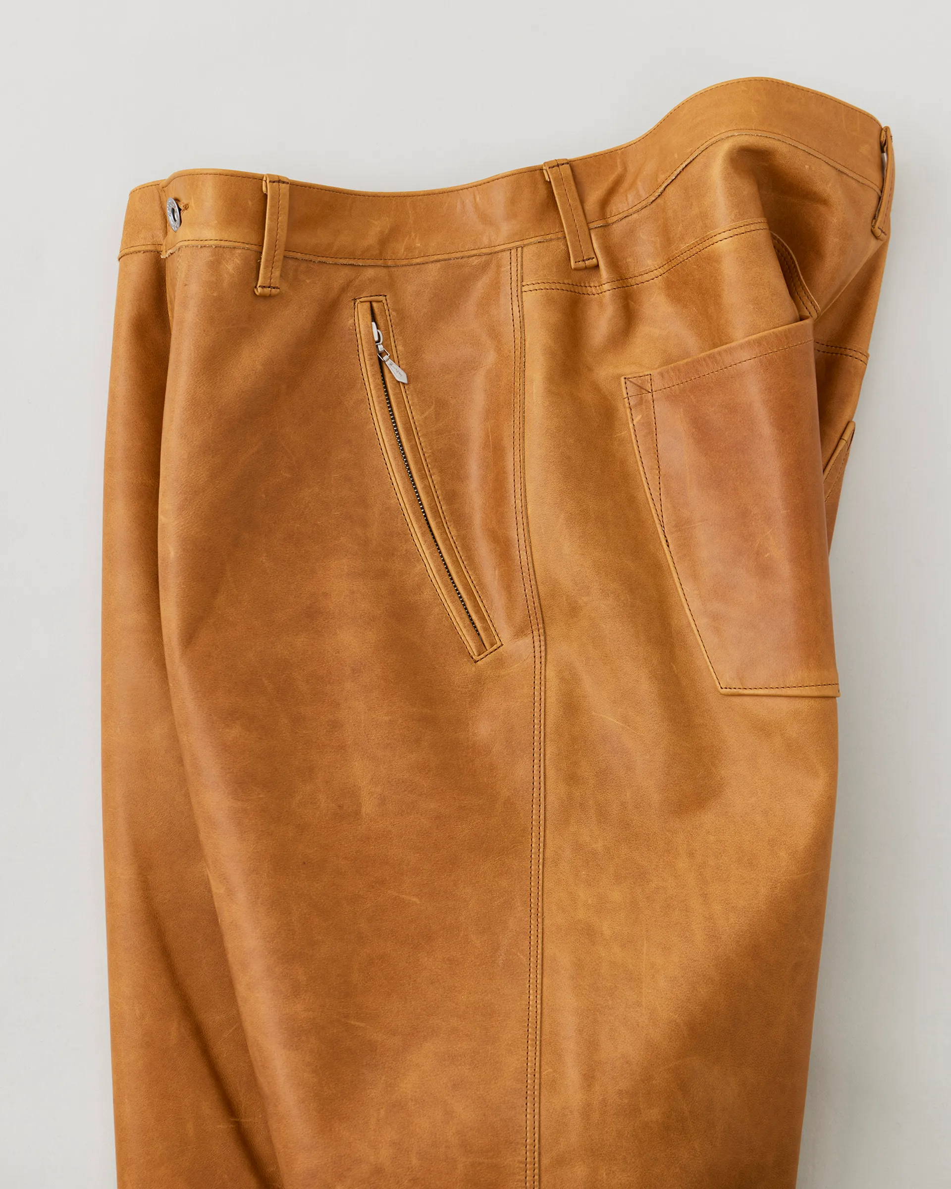1890年代の鉄鋼作業員が着⽤していたワークウェアをイメージソースに制作したストームパンツ。1950〜1960年代のデニムトラウザーの仕様を取り⼊れ、ヴィンテージデニムに⾒られる斜⾏した脇線をパターンカッティングによって表現しています。レザーは⼤判の原⽪にオイルをたっぷりと染み込ませたフランス産のオイルドプルアップレザーを使⽤。着用する毎に経年変化をお楽しみいただけます。