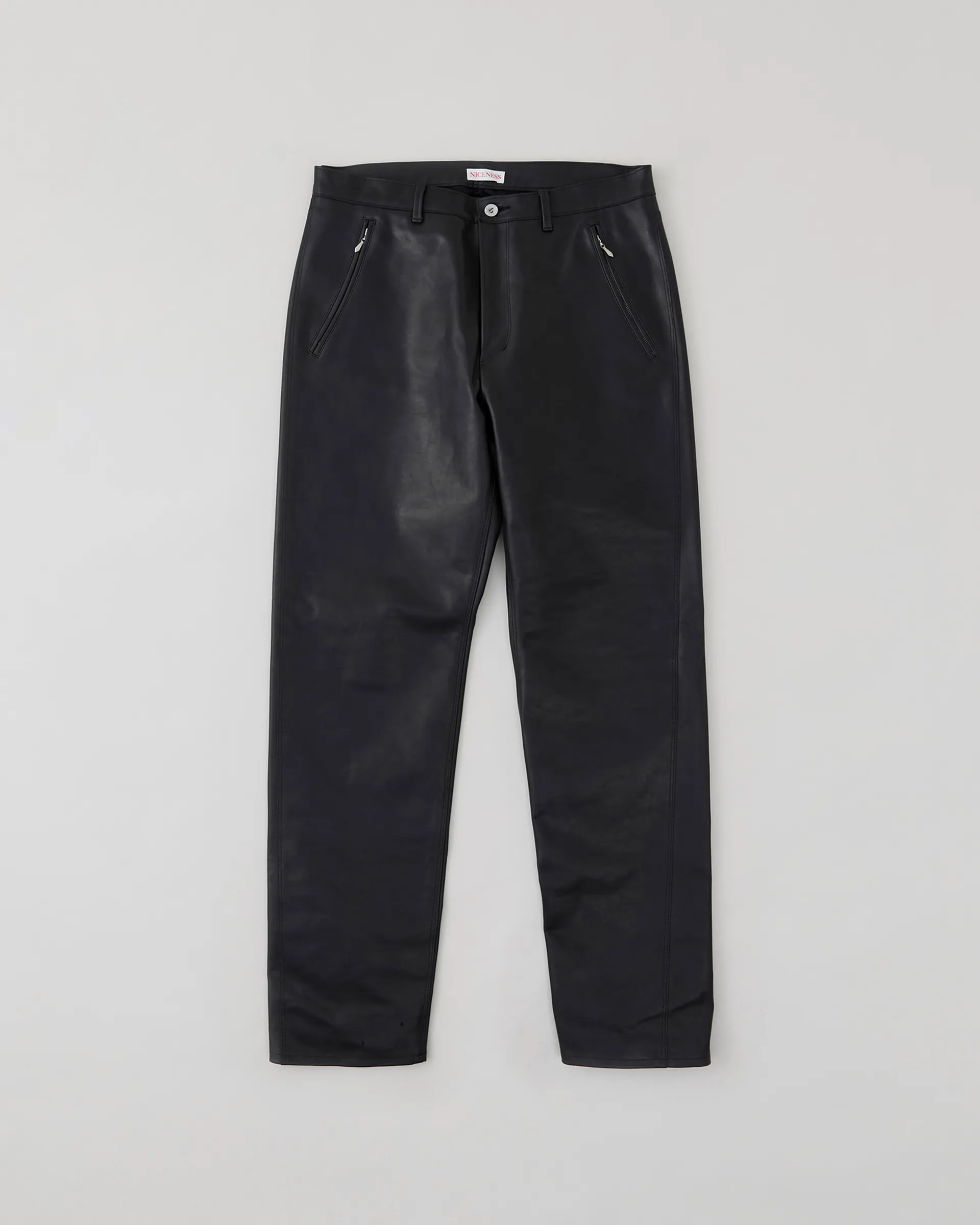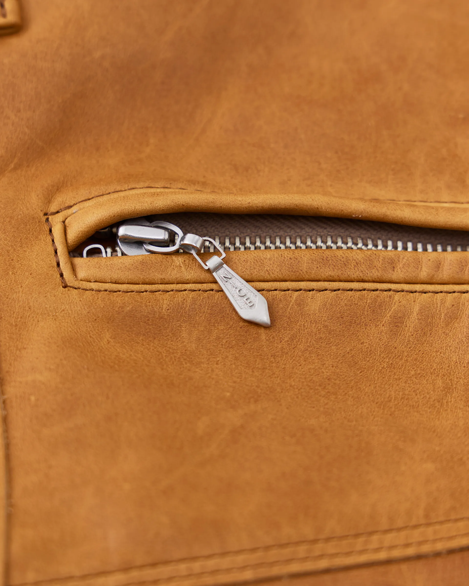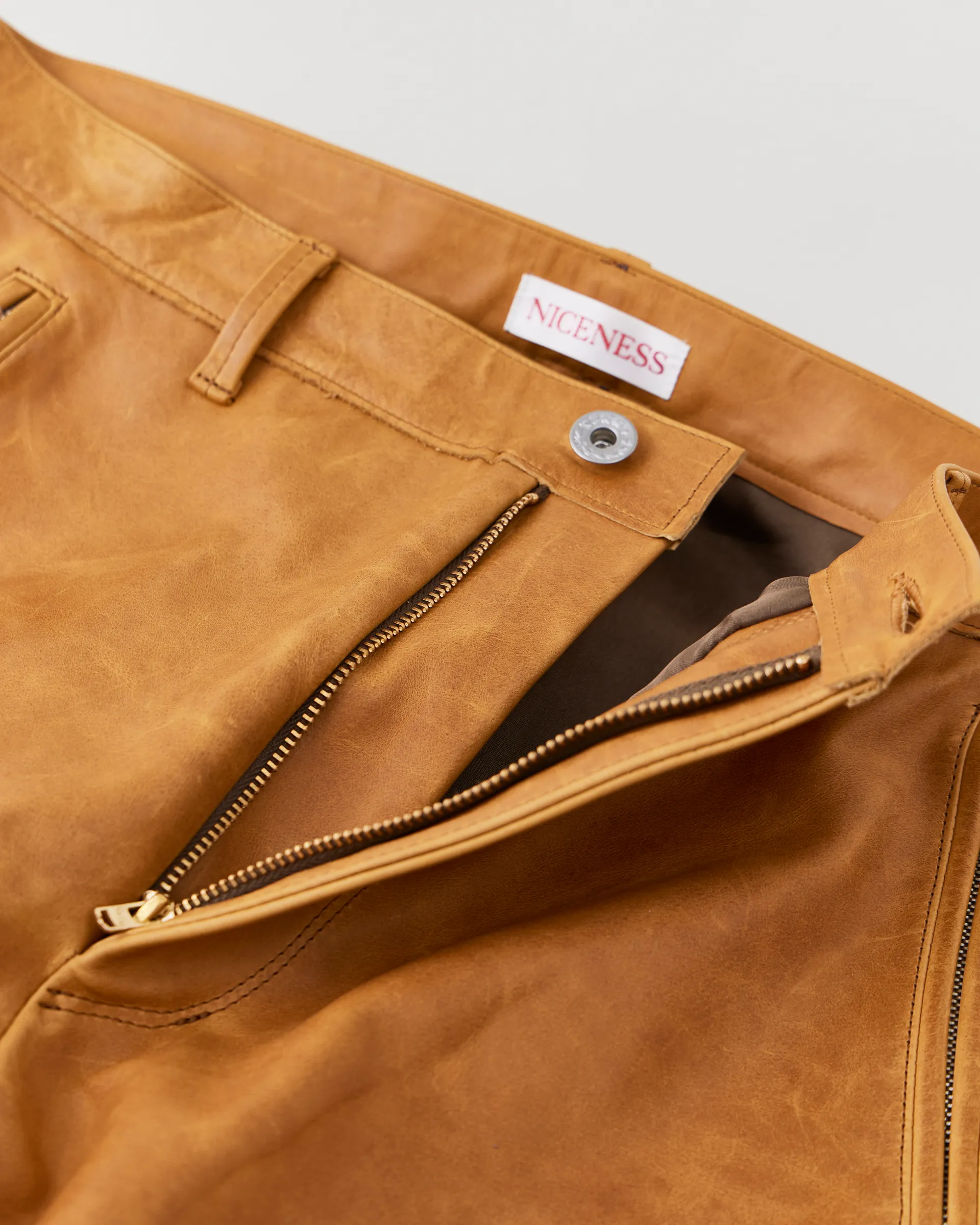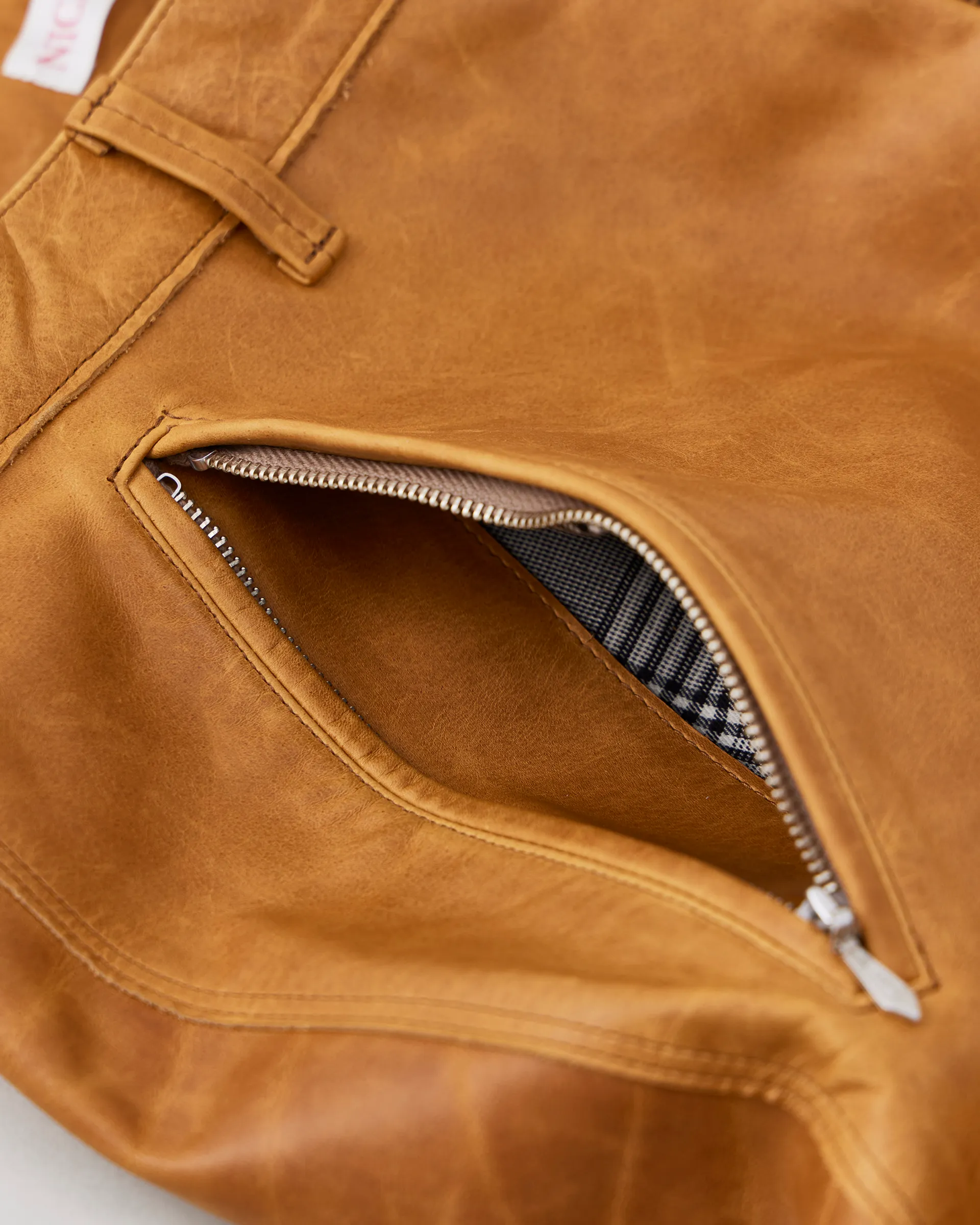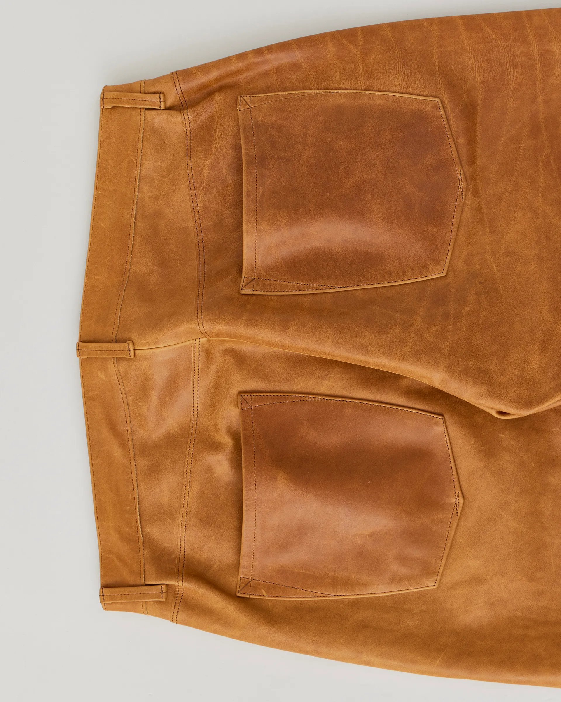 1890年代の鉄鋼作業員が着⽤していたワークウェアをイメージソースに制作したストームパンツ。1950〜1960年代のデニムトラウザーの仕様を取り⼊れ、ヴィンテージデニムに⾒られる斜⾏した脇線をパターンカッティングによって表現しています。レザーは⼤判の原⽪にオイルをたっぷりと染み込ませたフランス産のオイルドプルアップレザーを使⽤。着用する毎に経年変化をお楽しみいただけます。