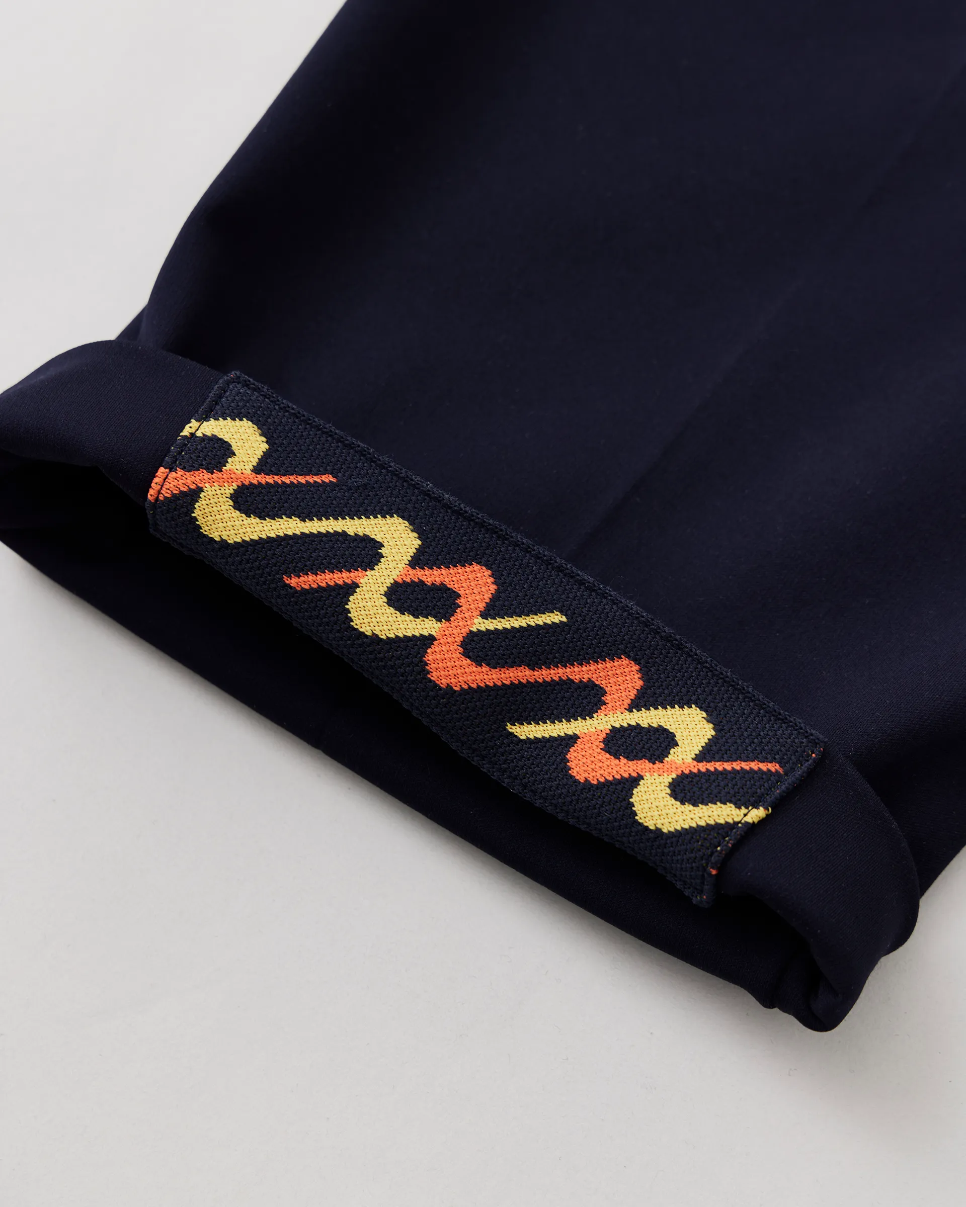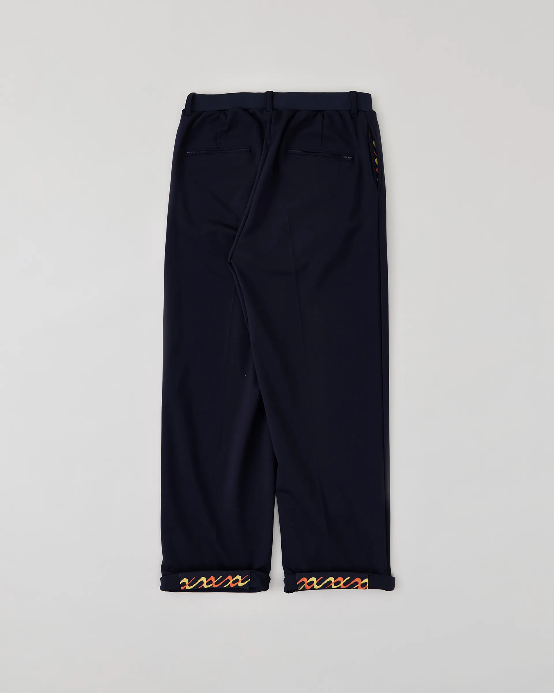 1970年代のジャージー組織を再現できる⽼舗⼯場と共に制作したビスポークジャージー生地で仕立てたトラックパンツ。デザインは1970年代のトラックスーツからインスピレーションを得ています。⽣地は⽢撚りの超⻑綿スビン綿と伸縮性に優れたポリエステルを用いて編み立て、表面はドライな質感でストレッチ性があり、裏面はスビン綿ならではのソフトな肌触りに。裾裏やポケット口に配したグラフィックテープが程よいアクセントとなっている。