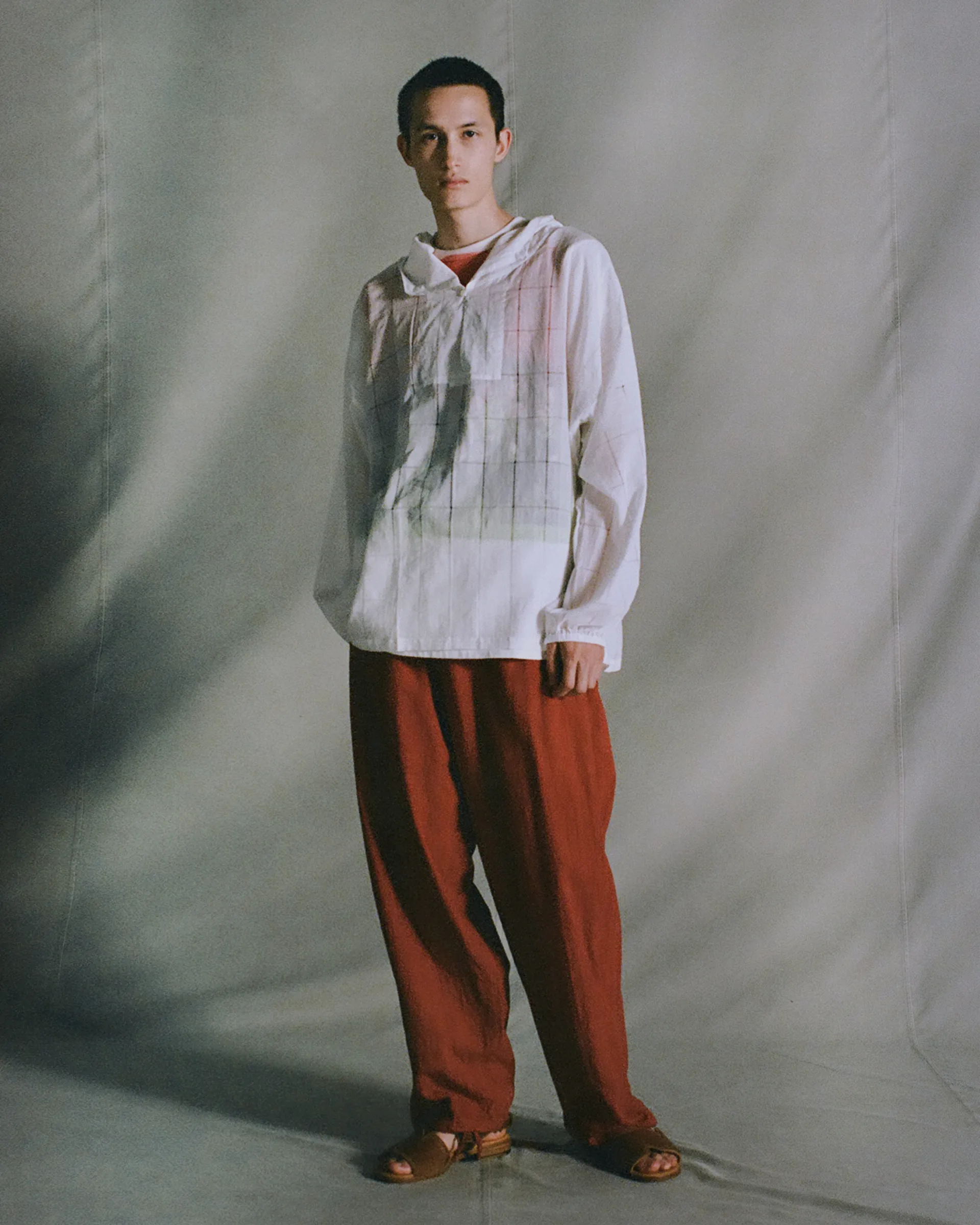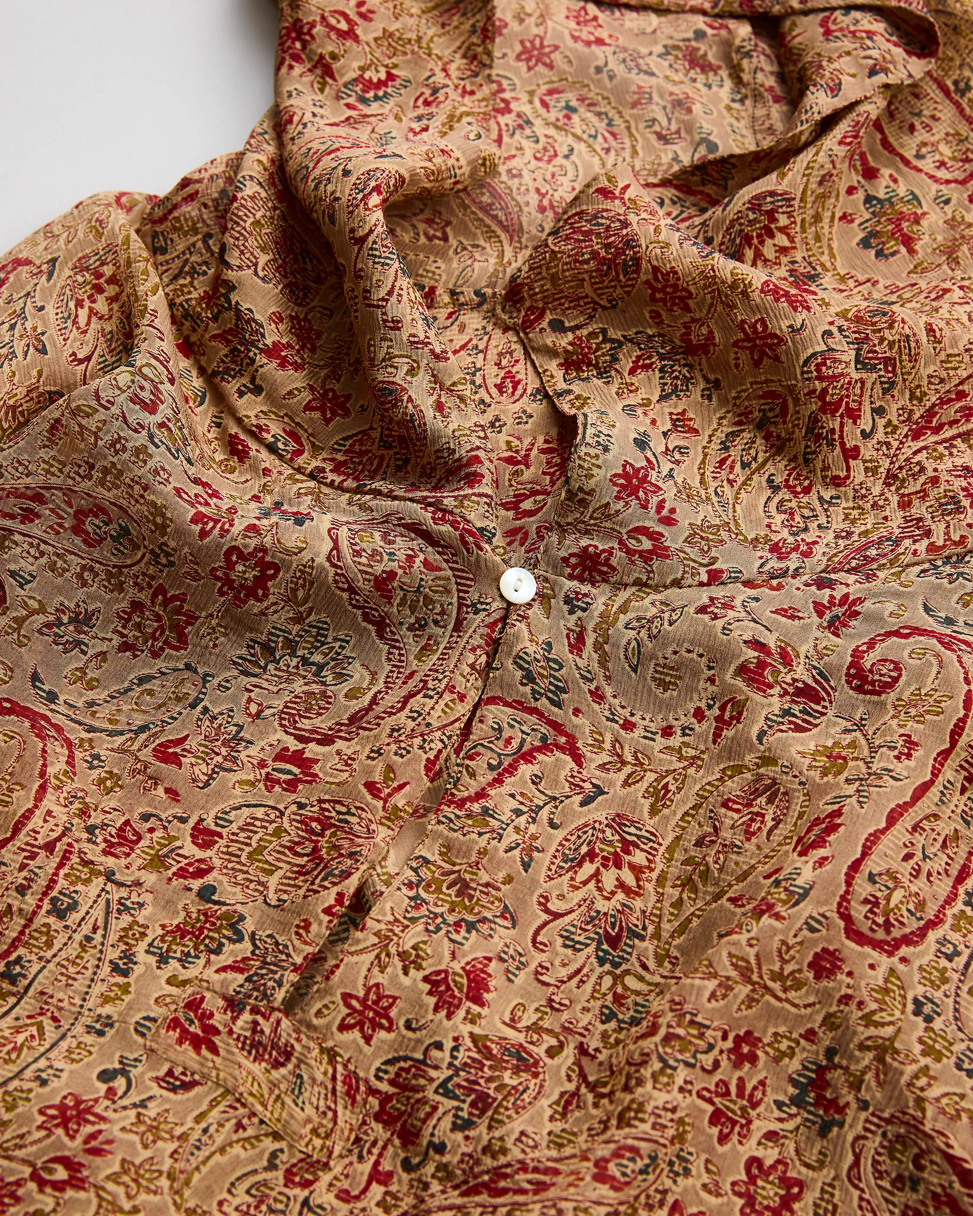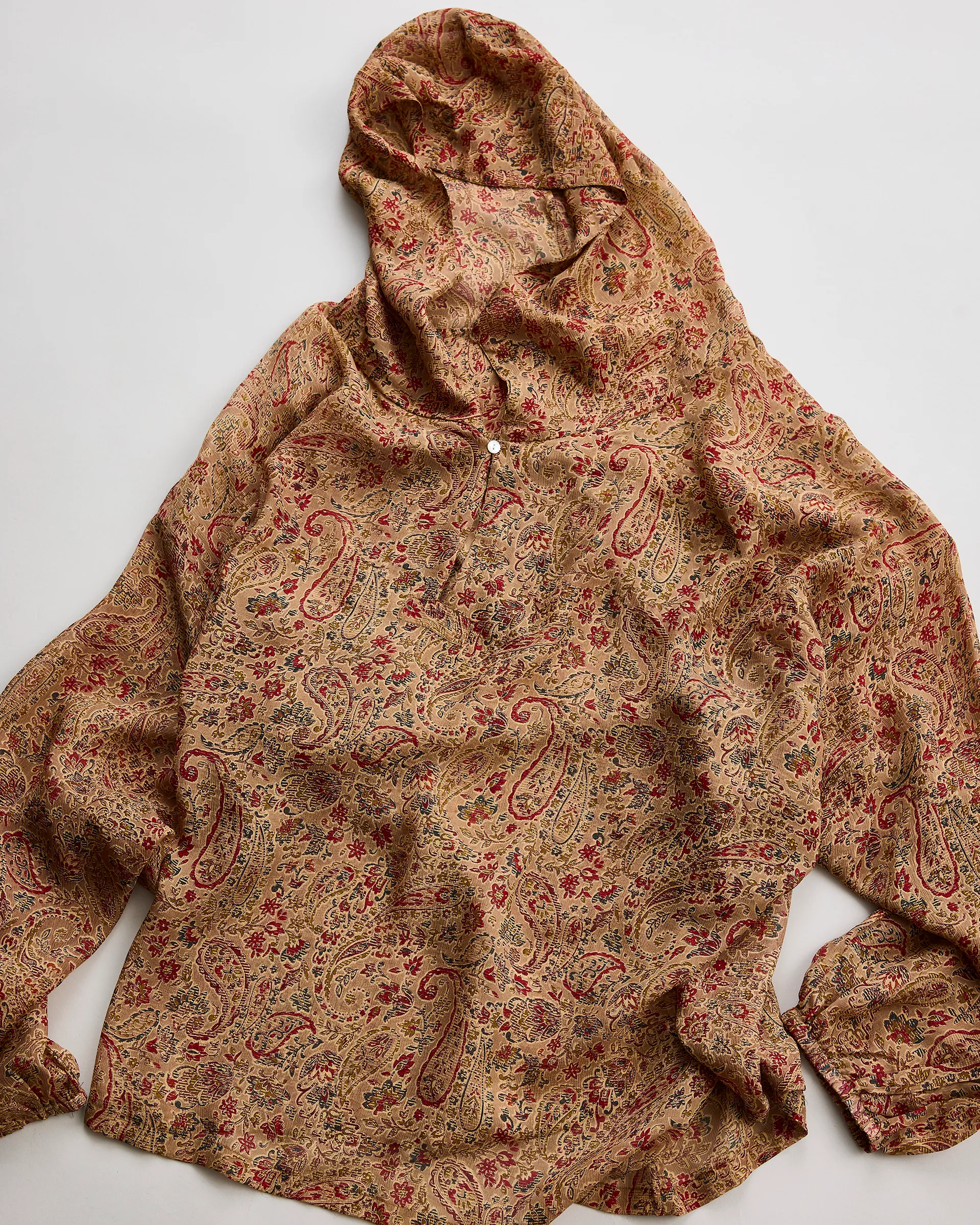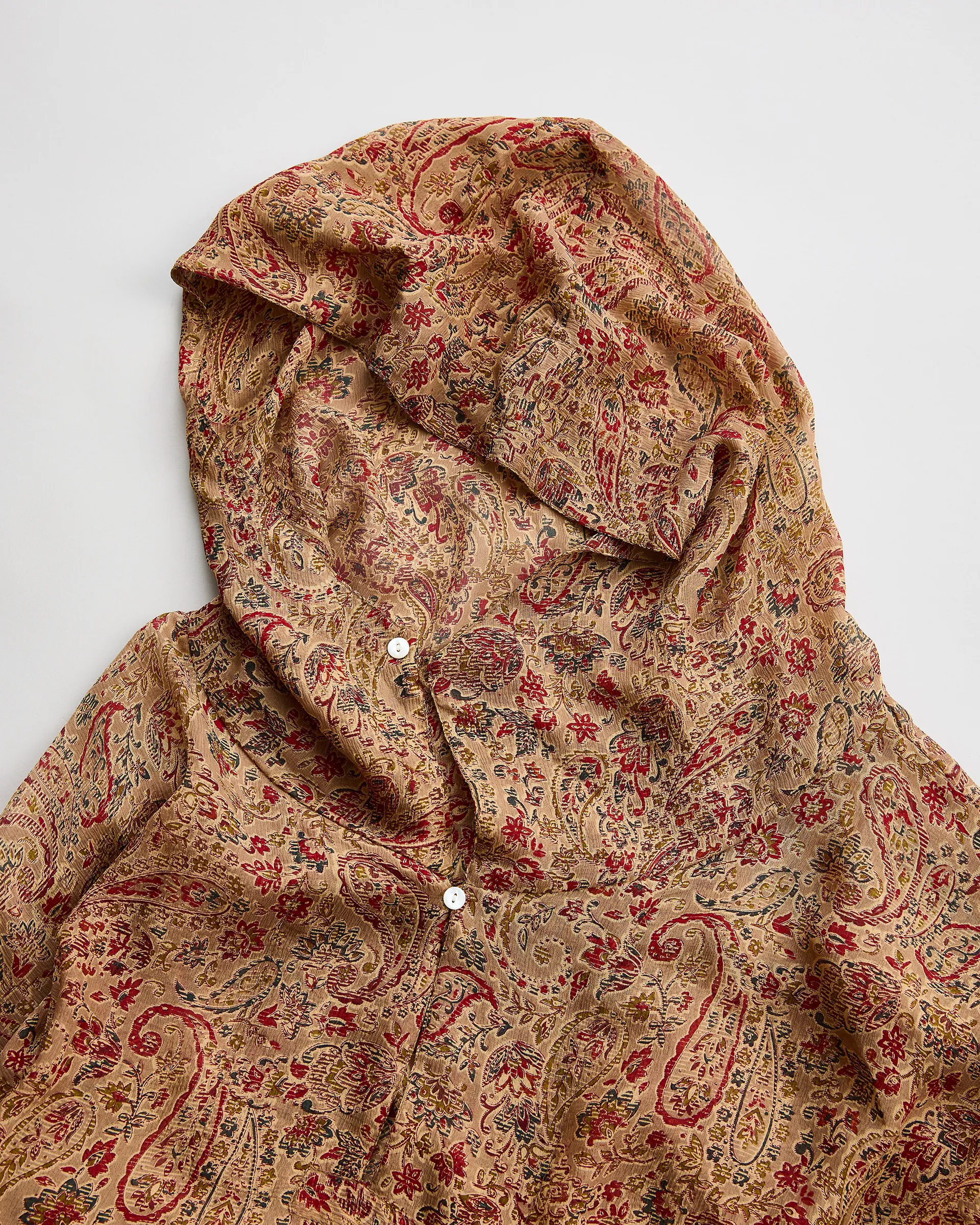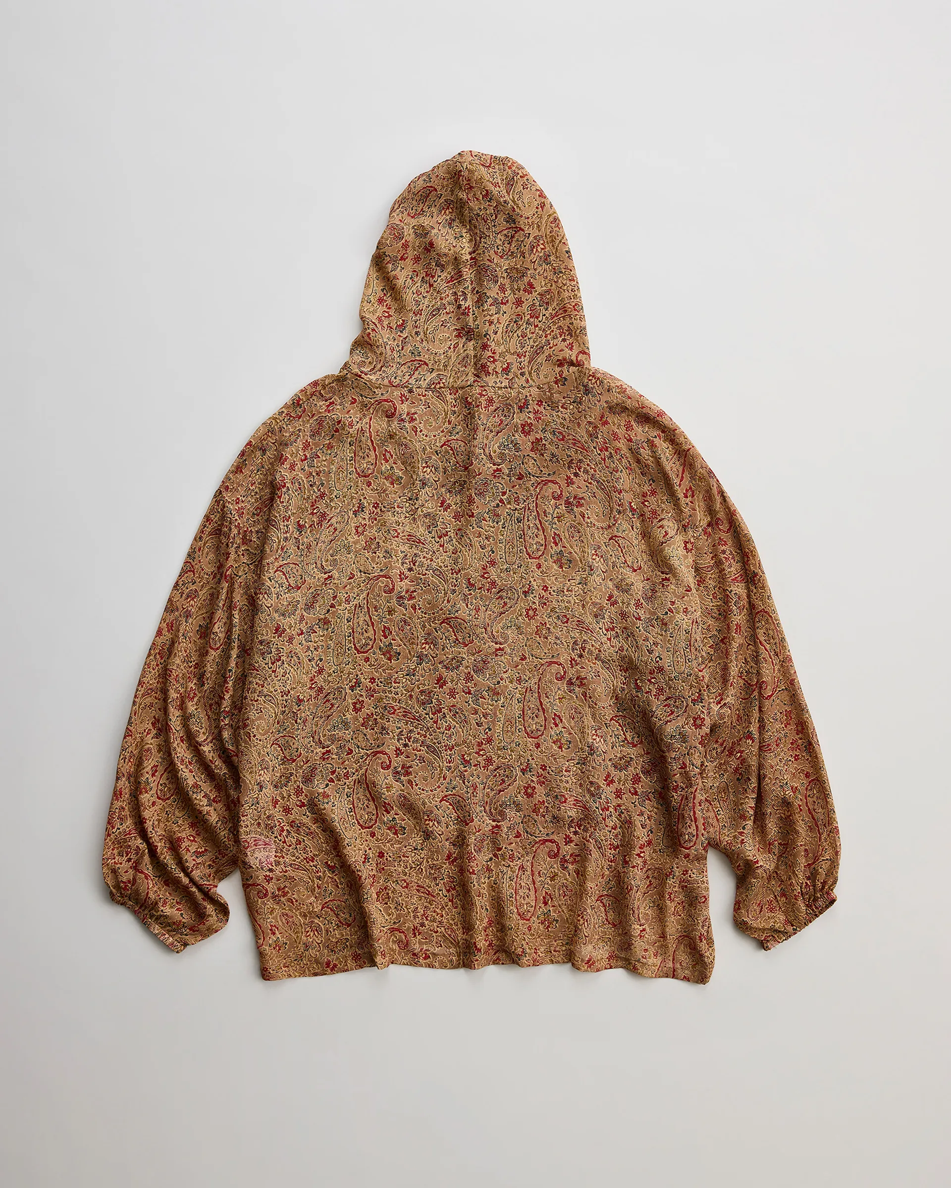 インド産シルクのシフォン生地を使用しスノーパーカーを製作。南インドのプリント工場に眠るデッドストック生地から選出された薄手で柔らかい素材。地が透けて見えるのが特徴です。型はスノーパーカー型を採用し、雪山でのカモフラージュを前提としたミリタリーアイテムをベースに設計。無骨なUKミリタリー感と繊細な生地、縫製を組み合わせて再構築した全く新しいデザイン。シルク特有の体温調整効果も兼ね備え、今シーズンのテーマ背景を元に選び抜かれた生地で独特の風合いを実現。