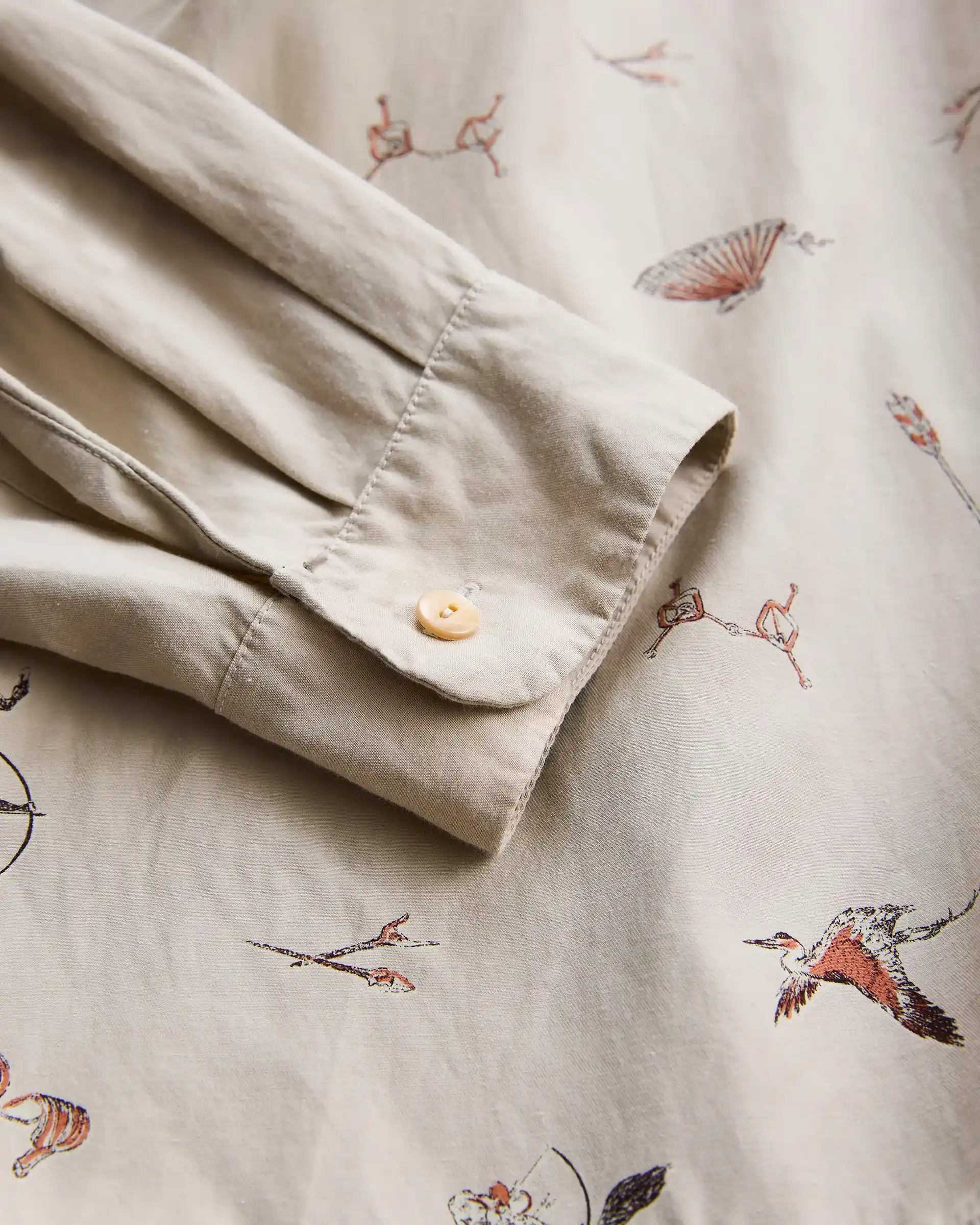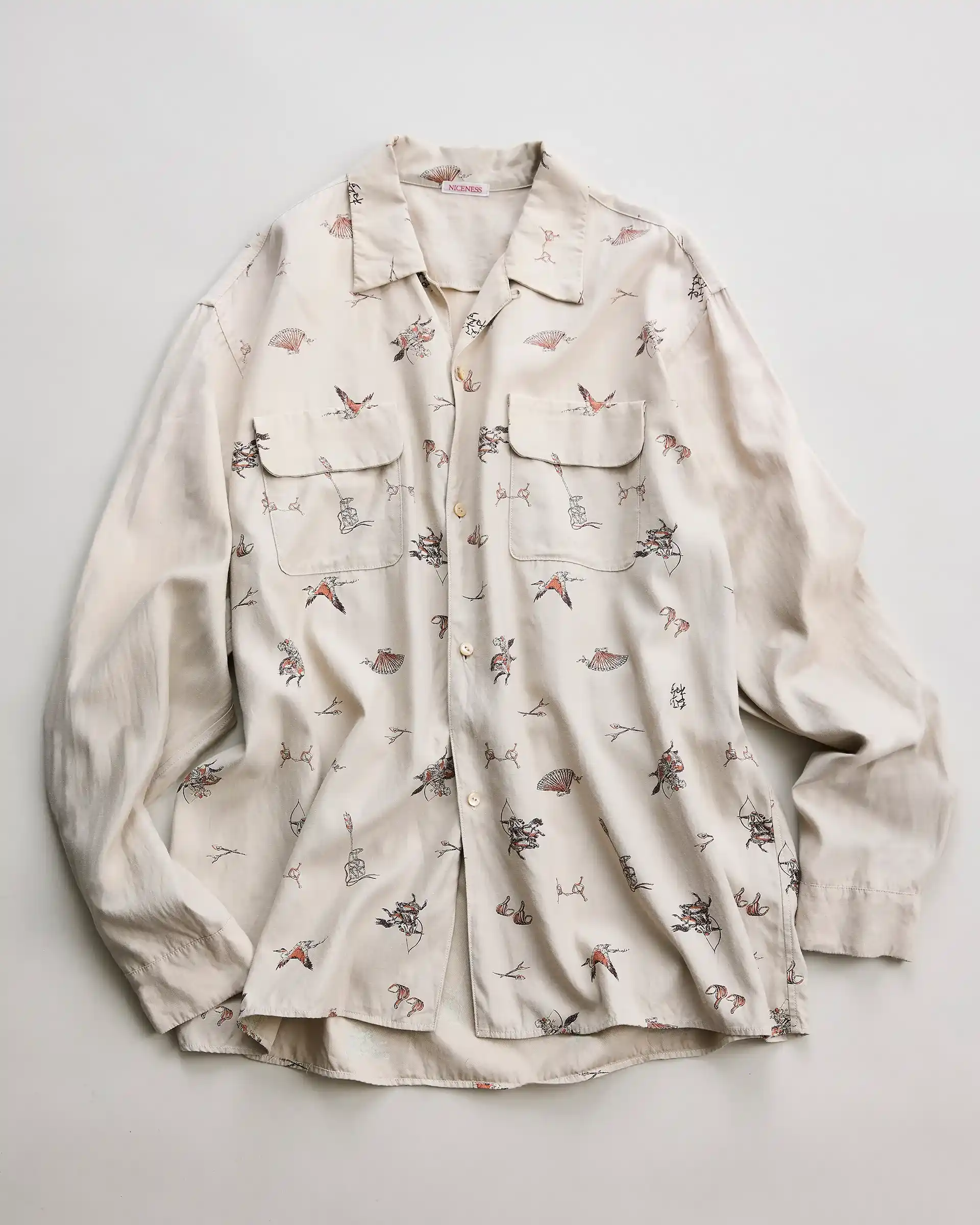 北陸の産地で織られたレーヨン×コットン交織ギャバジンを使用したボードシャツ。型は1940年代〜50年代のUSボードシャツをリファレンスとし、ややドロップショルダーでリラックス感のあるシルエットに再構築。アメリカのカウボーイ柄から着想を得て日本古来の武芸「流鏑馬」を写実的に描いたオリジナルグラフィック。弓矢や和鞍、大きな扇子、鶴や松などを描写。可抜染め生地に抜染と3色の着色抜染を施し奥行きを表現。製品後に日焼けスプレー→洗い→自然乾燥→こなし熱タンブラーの特殊加工により、プリントと素材の表情が馴染み静かな存在感を放っています。