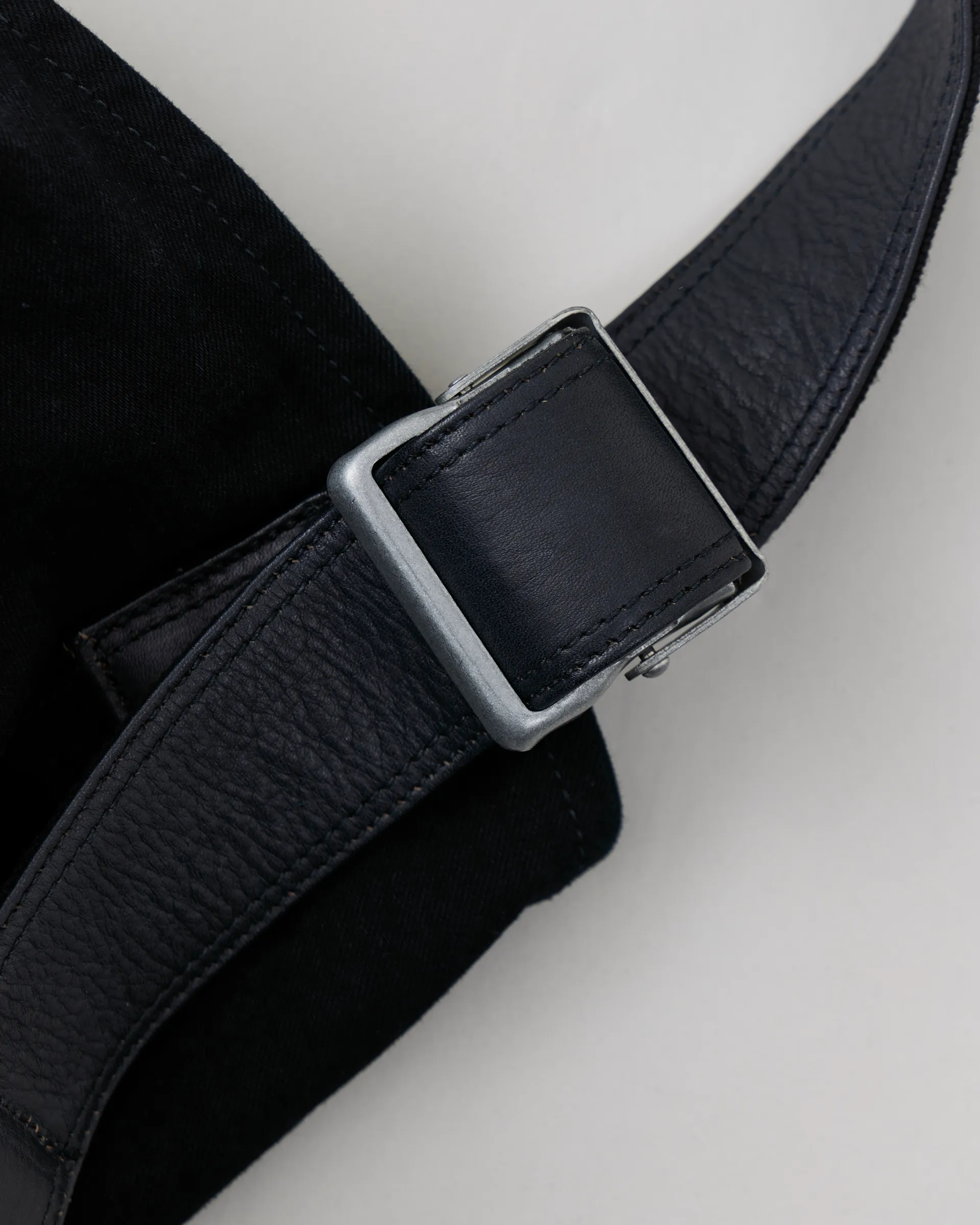 1960年代のデニムを研究しリプロダクトしたデニム生地を、オーバーダイ加工を施して使用したショルダーストラップ付きバッグ。エイジングによって黒が退色し、インディゴの表情が現れる設計です。デザインは1920〜50年代に登場した米国のツールバッグと、現代のメッセンジャーバッグを再構築しています。ショルダーストラップにはレザーを使用しています。