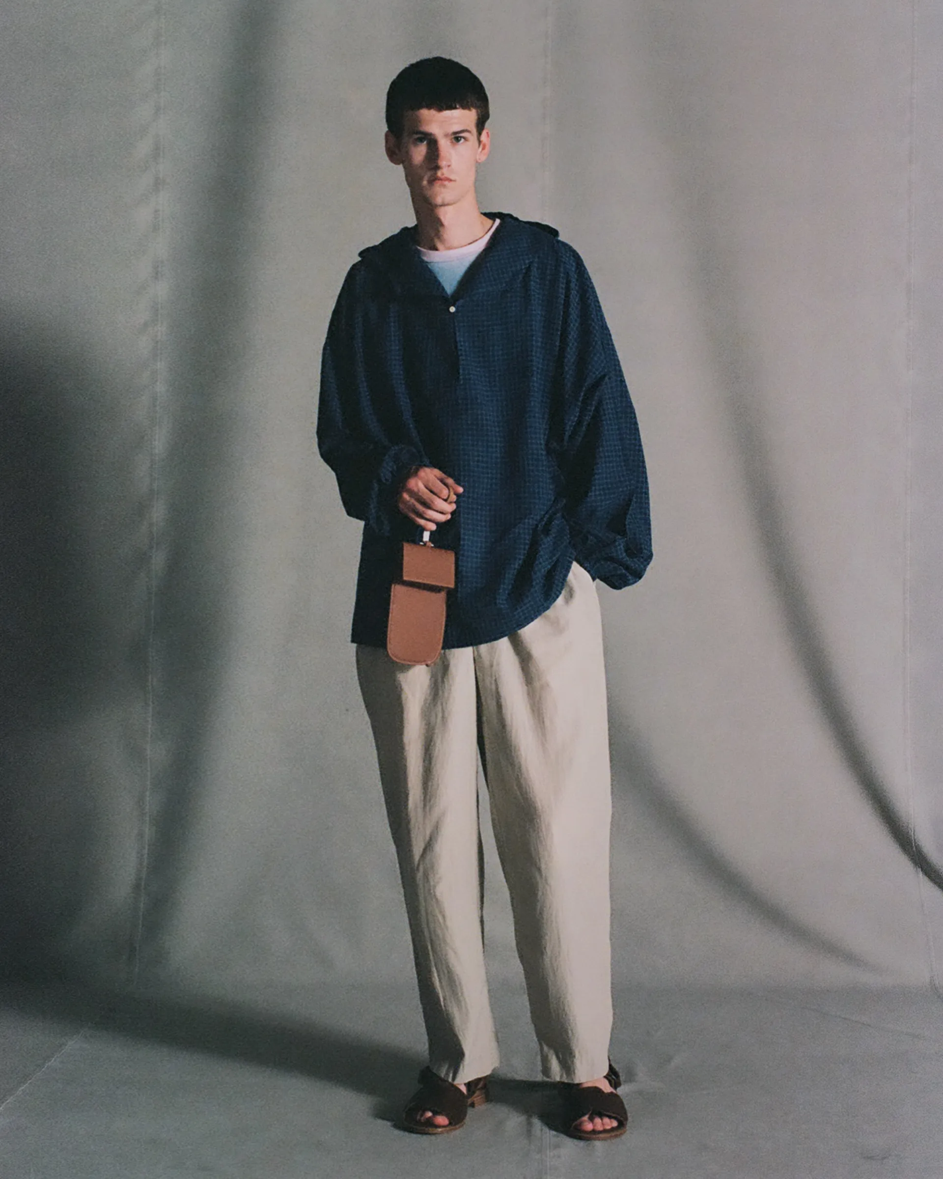 13ozの右綾で織り上げたノンウォッシュ生機デニム生地で製作したカバーオール。シルエットは1940年代のミリタリーカバーオールやヴィンテージジーンズをリファレンスとし、日本の着物に見られる直線的なニュアンスをミックス。生地はロープ染色によるピュアインディゴで芯白に染めた糸を使用し、ナチュラルなムラ糸による自然な毛羽立ちやザラついた風合いを持つ生機ならではの表情を持っています。職人の手作業によるムラ感を表現した製品加工が特徴。褪せやアタリを自然なムードで表現し「育てた表情」を感じられる一着です。