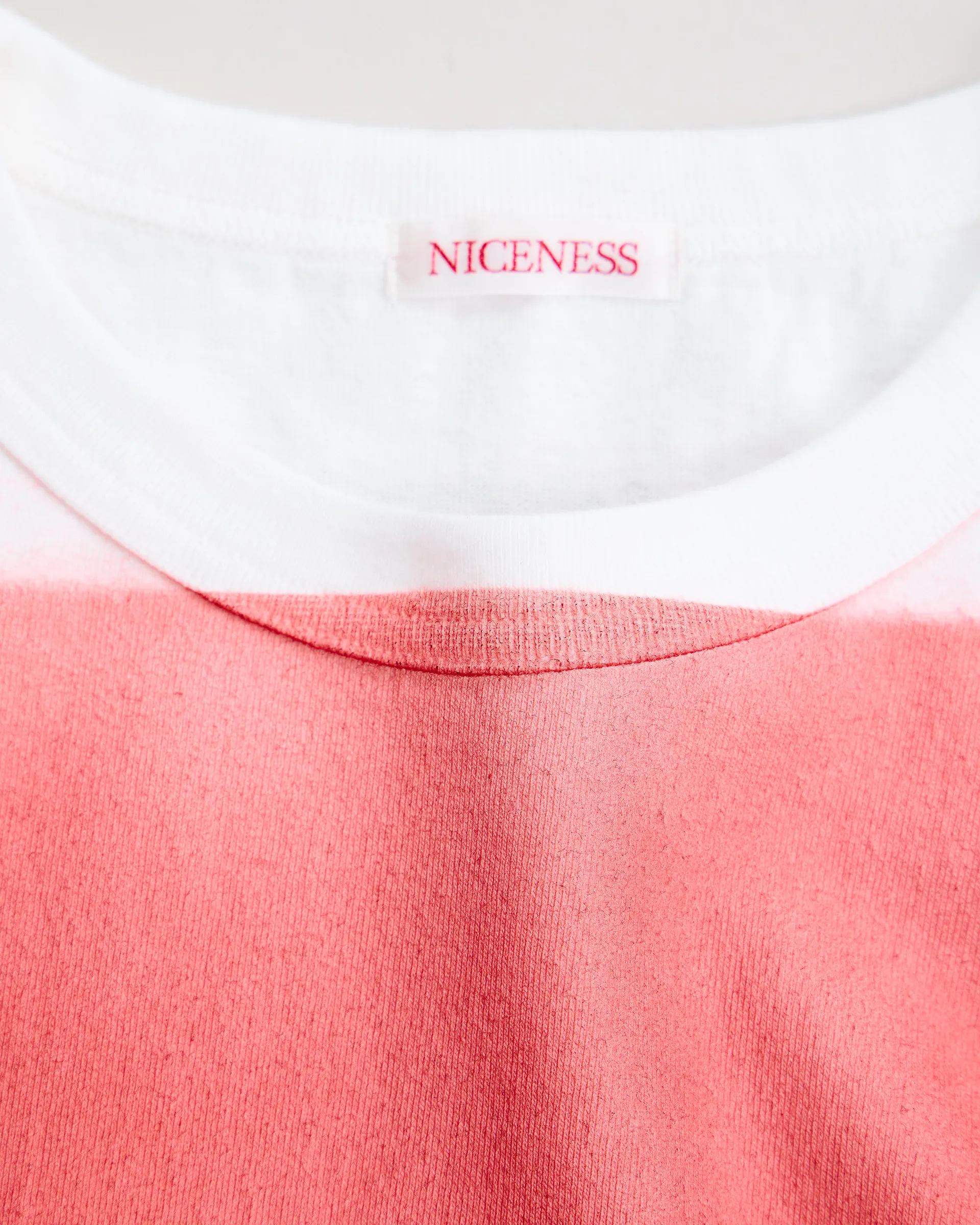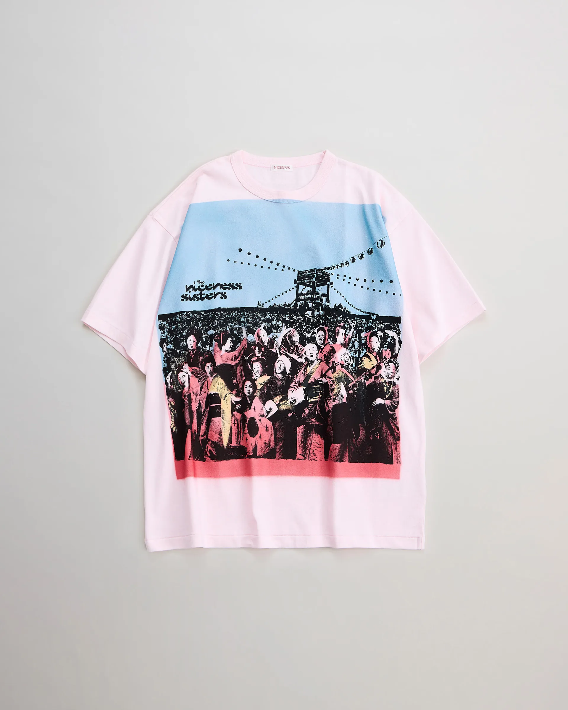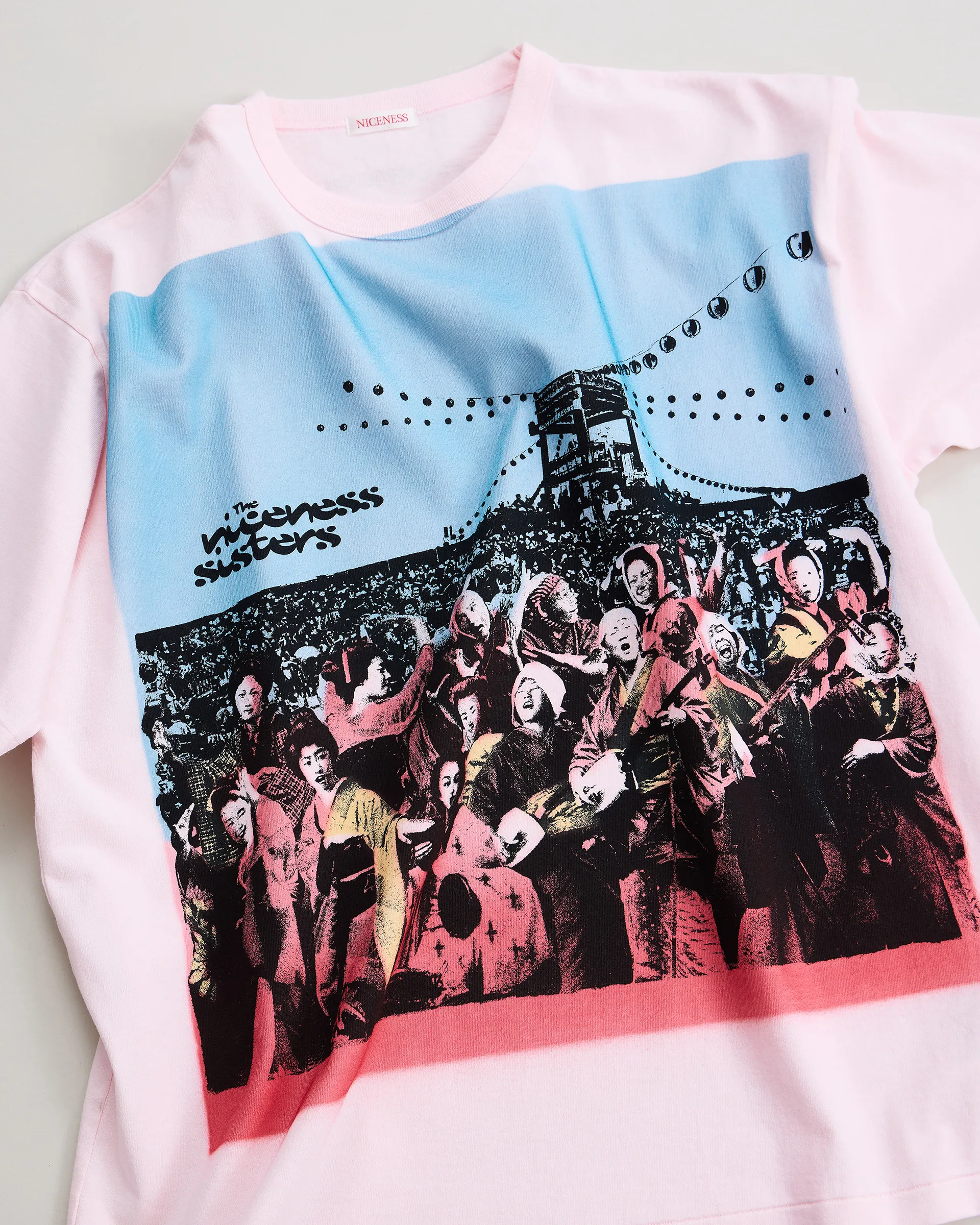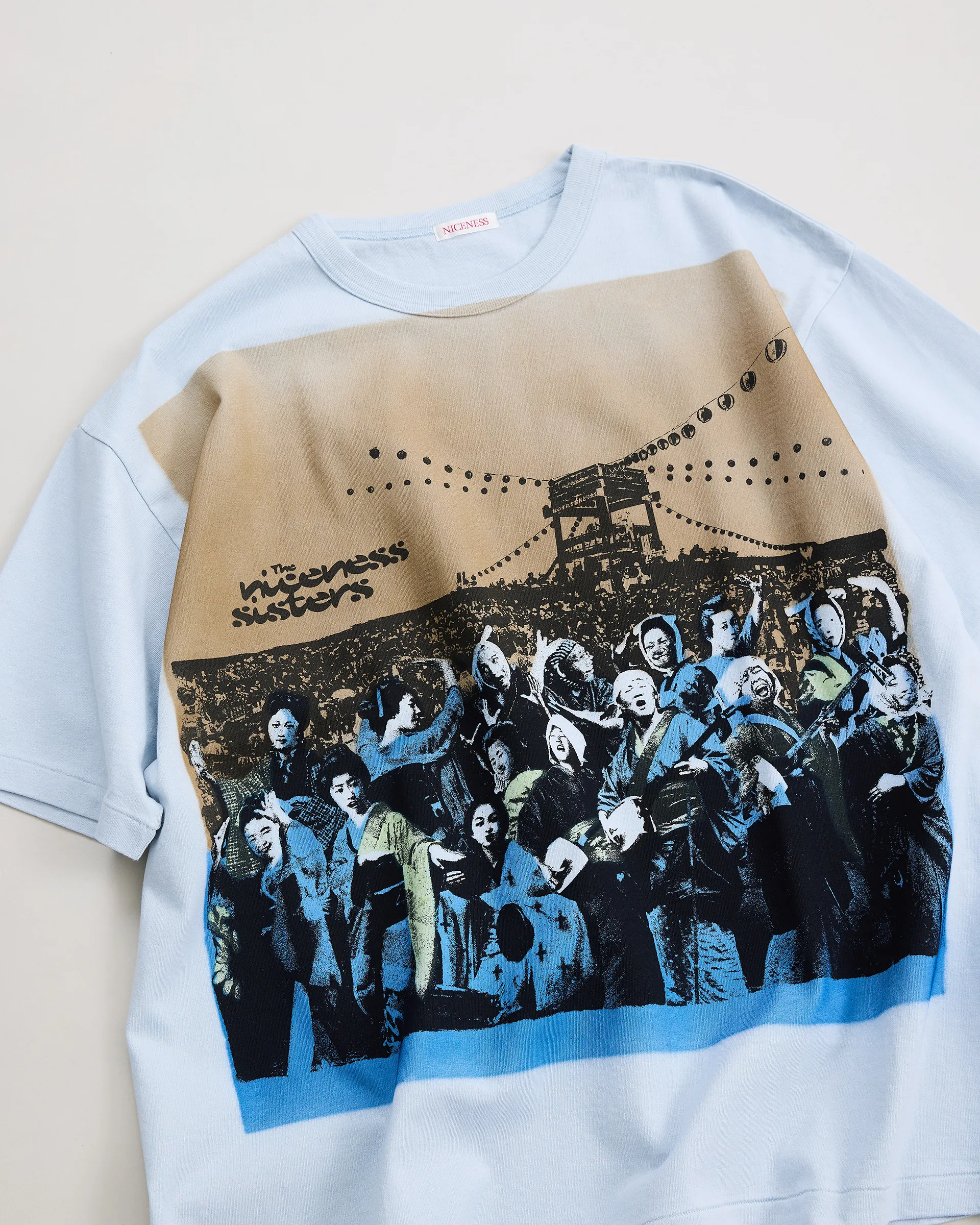しっかりとした肉感と素朴な風合いが特徴の天竺生地で製作したクルーネックTee 。柄は1990年代の音楽カルチャーを象徴するジャケットデザインからインスピレーションを得て、コラージュやハンドプリントによる視覚的インパクトとエネルギーを日本の”夏祭り”に置き換えサイケでスピリチュアルな独自の世界観を表現。着色部分はエアブラシによるステンシルプリントで一点一点職人の手作業にて施されています。幕末〜明治期の「横浜写真」から着想を得て色彩を甦らせるという試み。記憶と現実が交差する夏の風物詩のような力強きTシャツ。