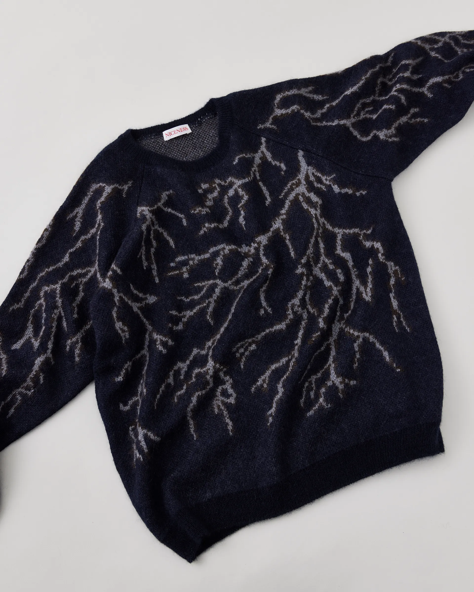 先染めのモヘアシルク糸を使用し、サンダー柄に編み立てたジャカードクルーネックセーター。1960年代のラグランスウェットシャツを背景としたデザインで、アメリカのアウトドアブランドに見られる稲妻モチーフのグラフィックをジャカードで再構築しています。ややゆったりとしたサイジングで、モヘアの毛足とシルクの光沢が上品なムードを加えています。