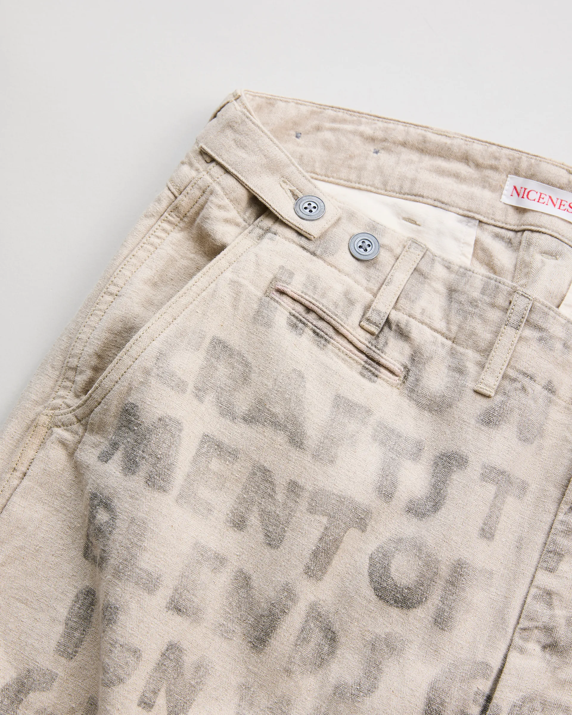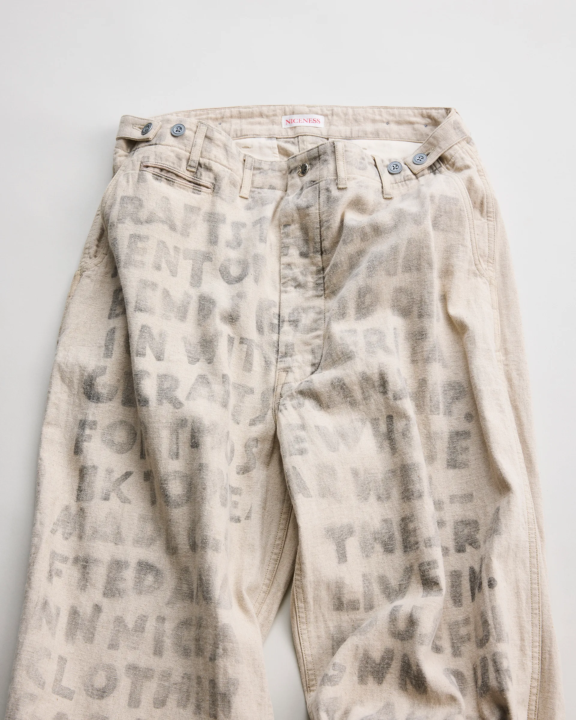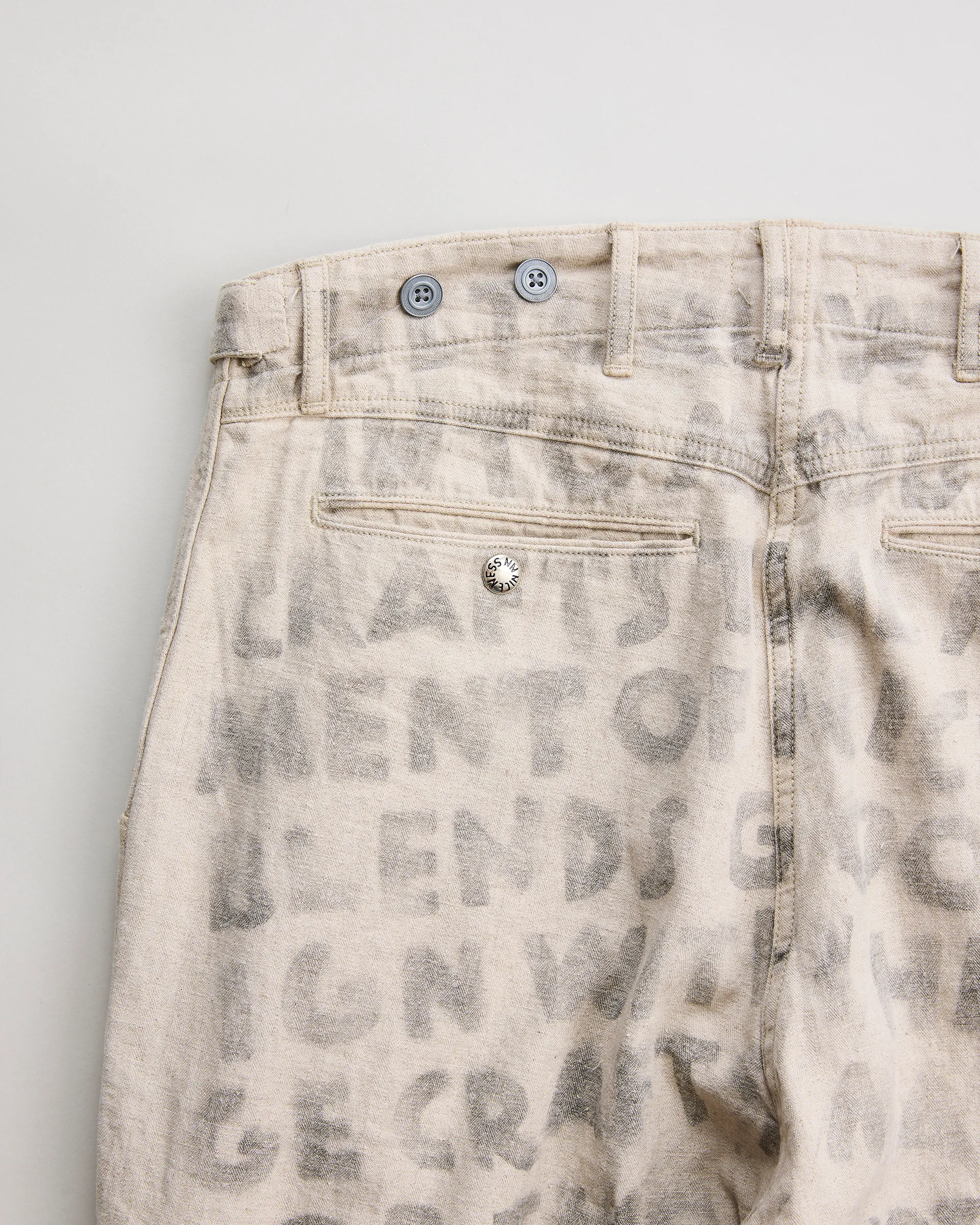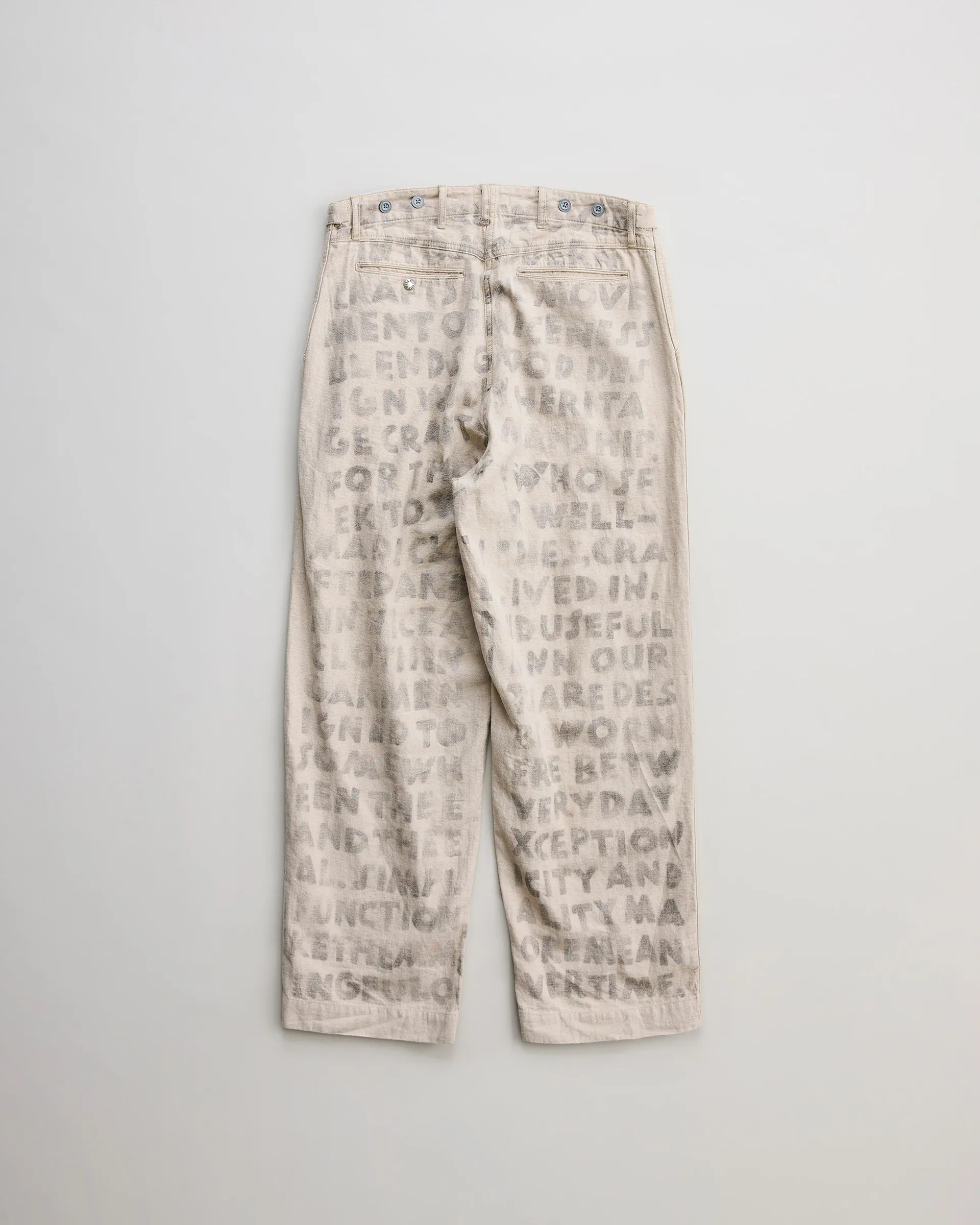 リネン60%・コットン40%の混紡糸を用いた綾織りの綿麻ヘリンボン素材で製作したユーティリティパンツ。前後どちらからも調整できる「前後倒し」サイドベルト仕様。ウエストの絞り位置によって異なるドレープが生まれ、シルエットやフィット感を自在に変化させられます。生地は麻の粗野感や独特の風合いを引き出す麻勝ちの混紡糸で仕上げ、10オンスの程よい肉感により通気性と耐久性を兼備した素材感が特徴。職人によるハンドステンシルプリントを施すことで一点一点にクラフト感と個性を吹き込み、唯一無二の味わいを実現した逸品です。