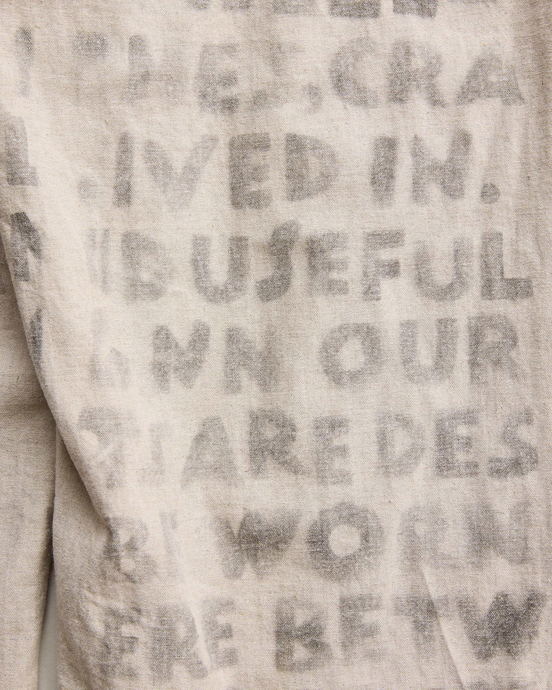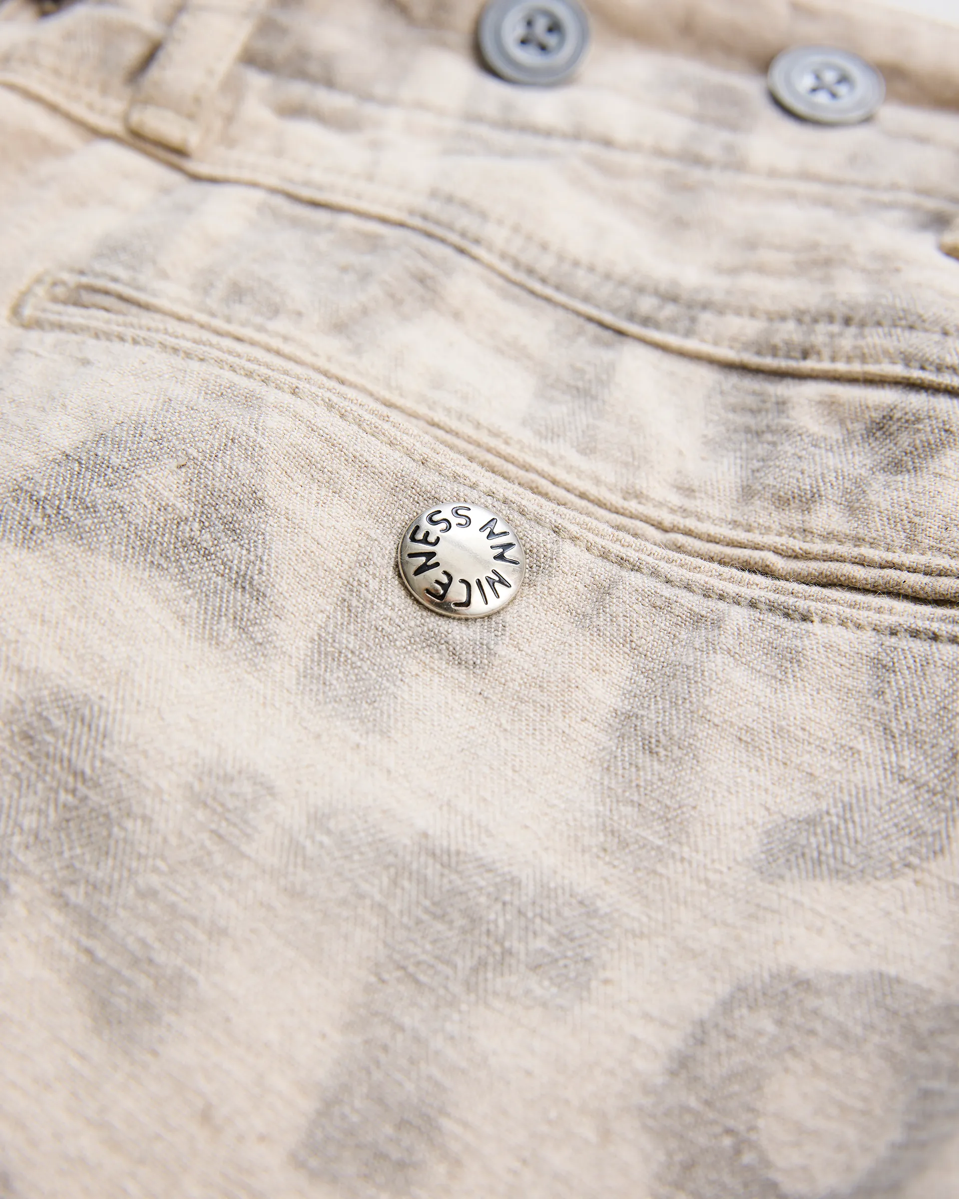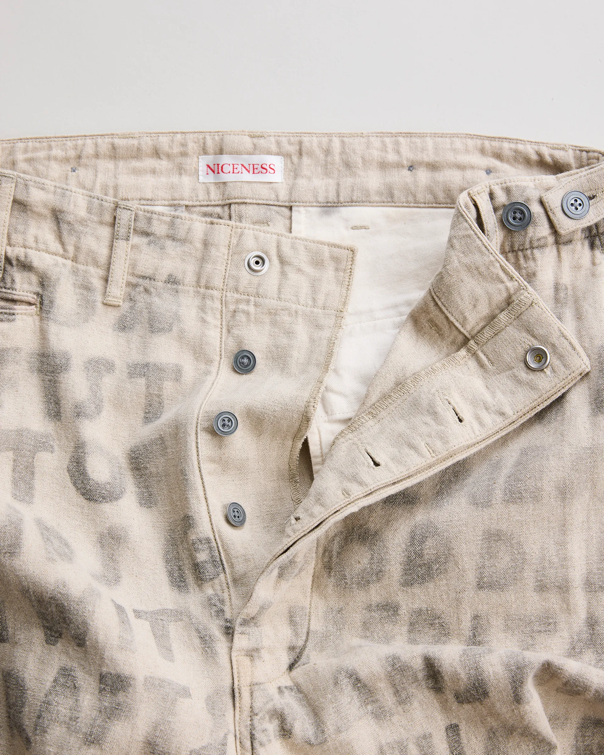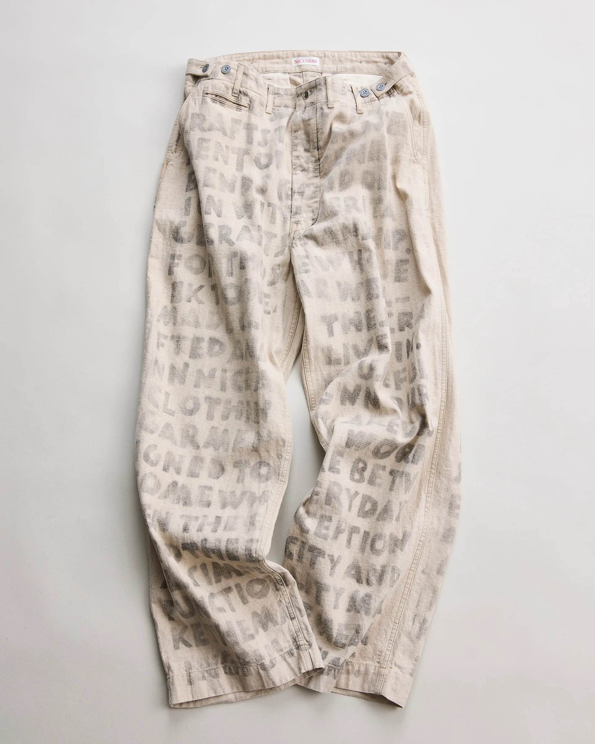 リネン60%・コットン40%の混紡糸を用いた綾織りの綿麻ヘリンボン素材で製作したユーティリティパンツ。前後どちらからも調整できる「前後倒し」サイドベルト仕様。ウエストの絞り位置によって異なるドレープが生まれ、シルエットやフィット感を自在に変化させられます。生地は麻の粗野感や独特の風合いを引き出す麻勝ちの混紡糸で仕上げ、10オンスの程よい肉感により通気性と耐久性を兼備した素材感が特徴。職人によるハンドステンシルプリントを施すことで一点一点にクラフト感と個性を吹き込み、唯一無二の味わいを実現した逸品です。