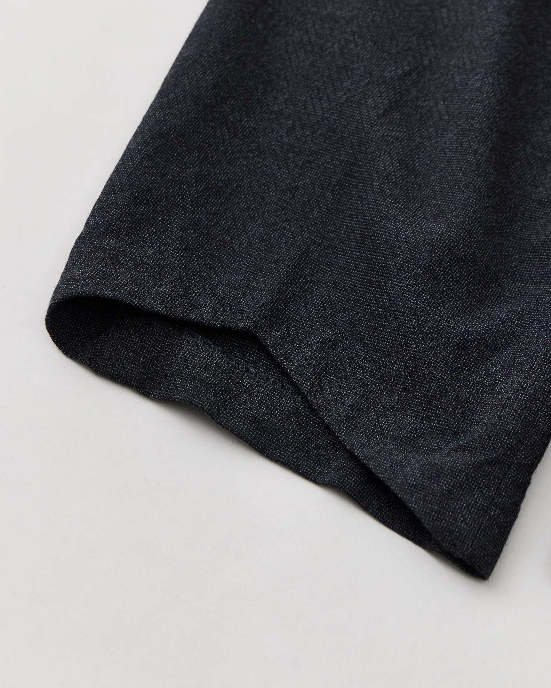 Z撚りのメリノウール糸を使⽤したヘリンボーン柄のビスポーク生地で仕立てたフライングVトラウザー。仕上げにエアタンブラーを施し、ふっくらとした⾵合いと⾃然な⽑⽻⽴ちを表現しています。1960〜70年代のミュージックシーンから着想を得た、フライングVギターになぞらえた後ろ裾のV字型カットアウトが特徴的なデザイン。クラシックな⾵格とモダンなシルエットを併せ持つ一本です。