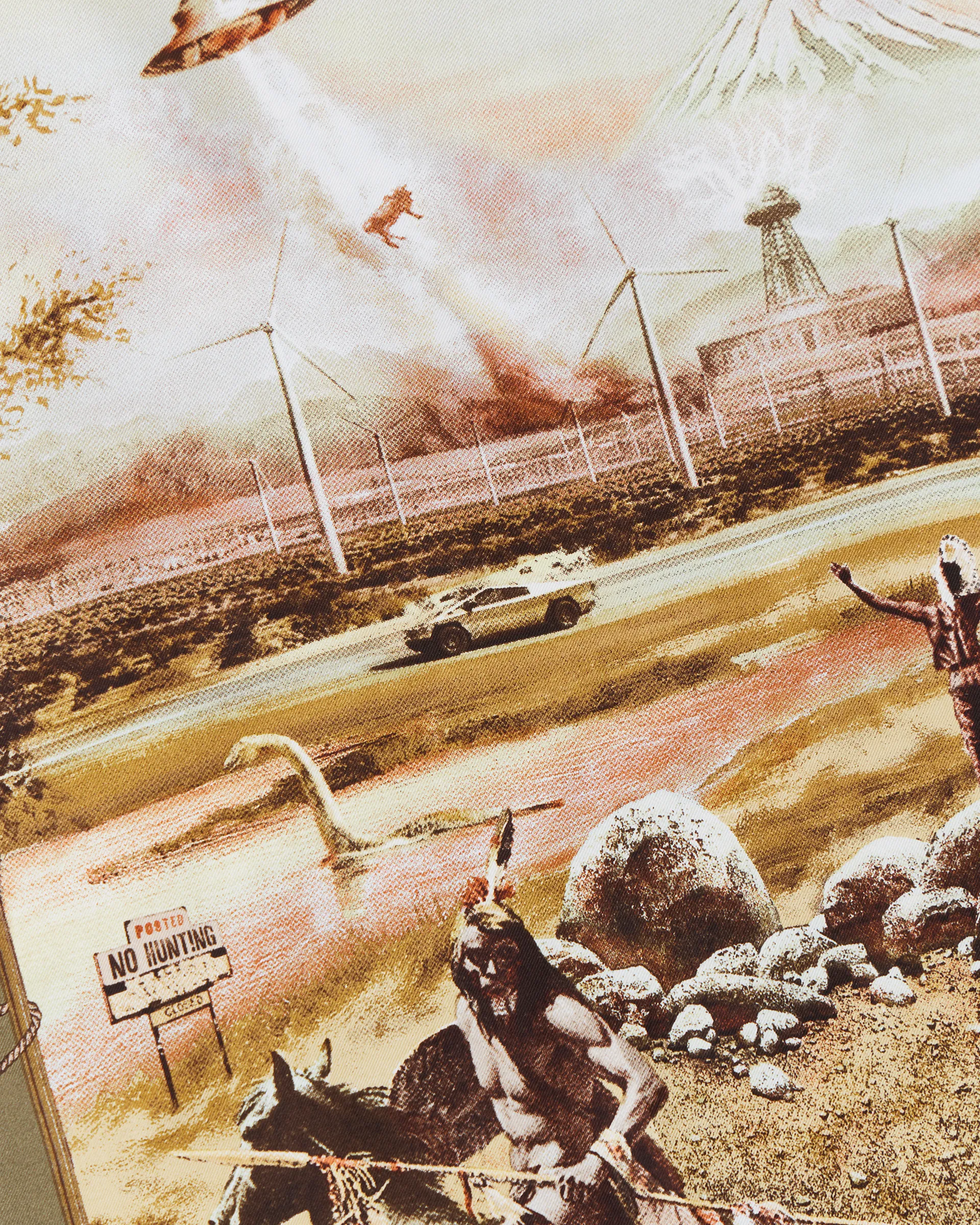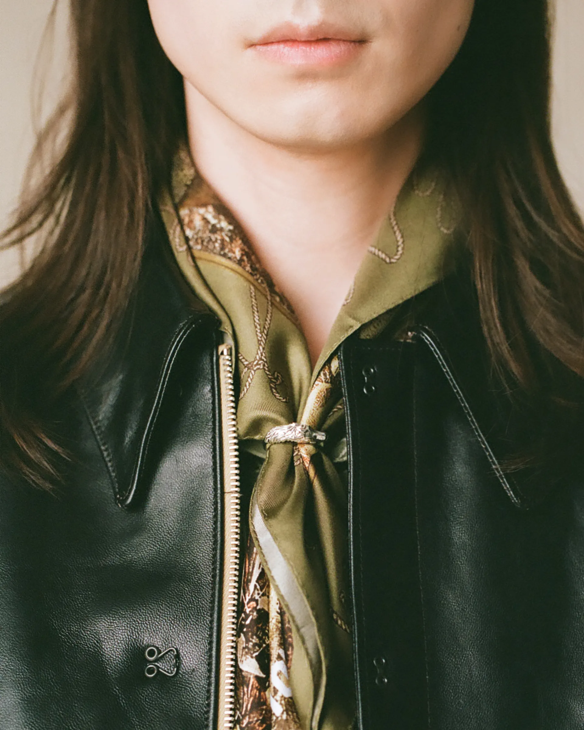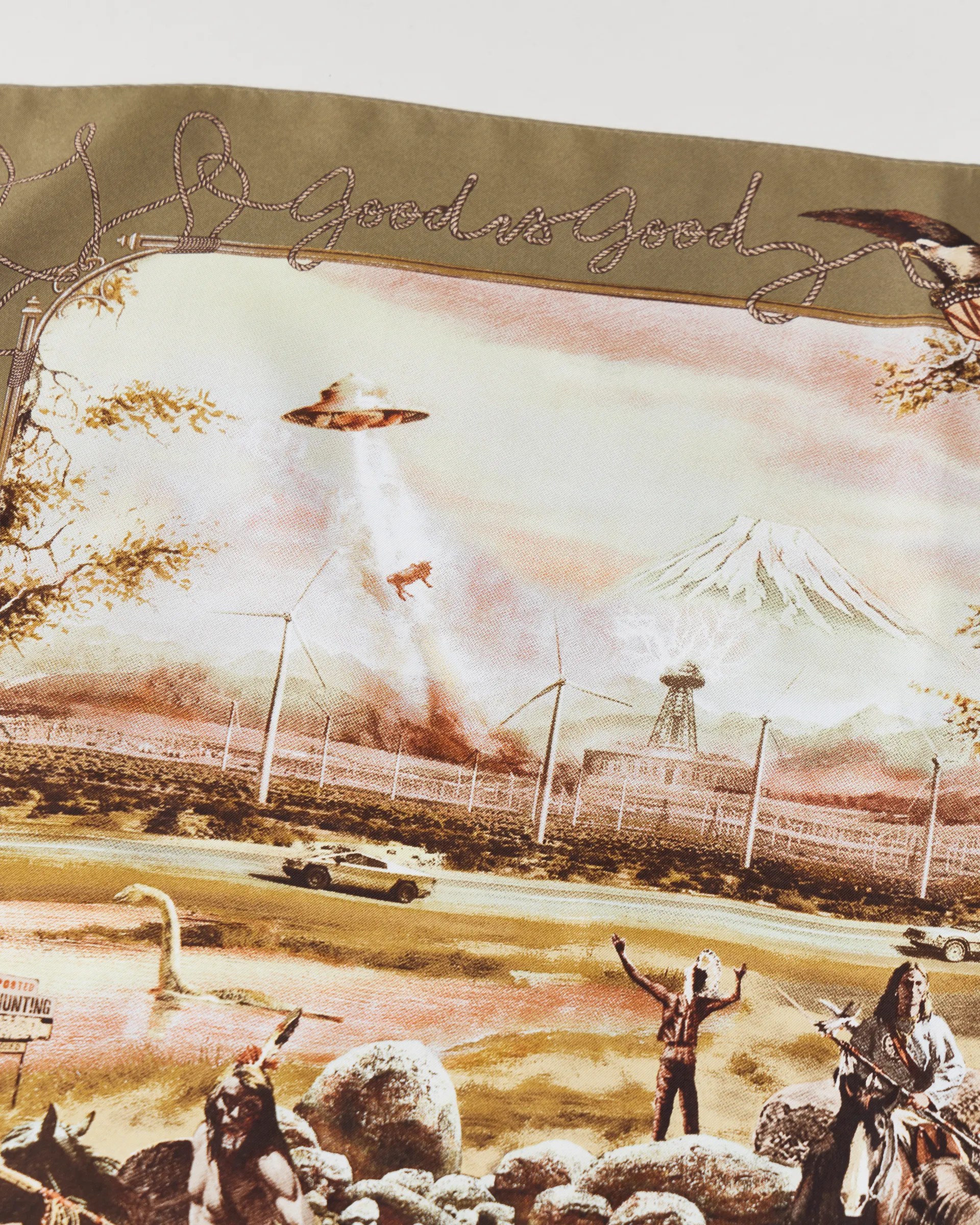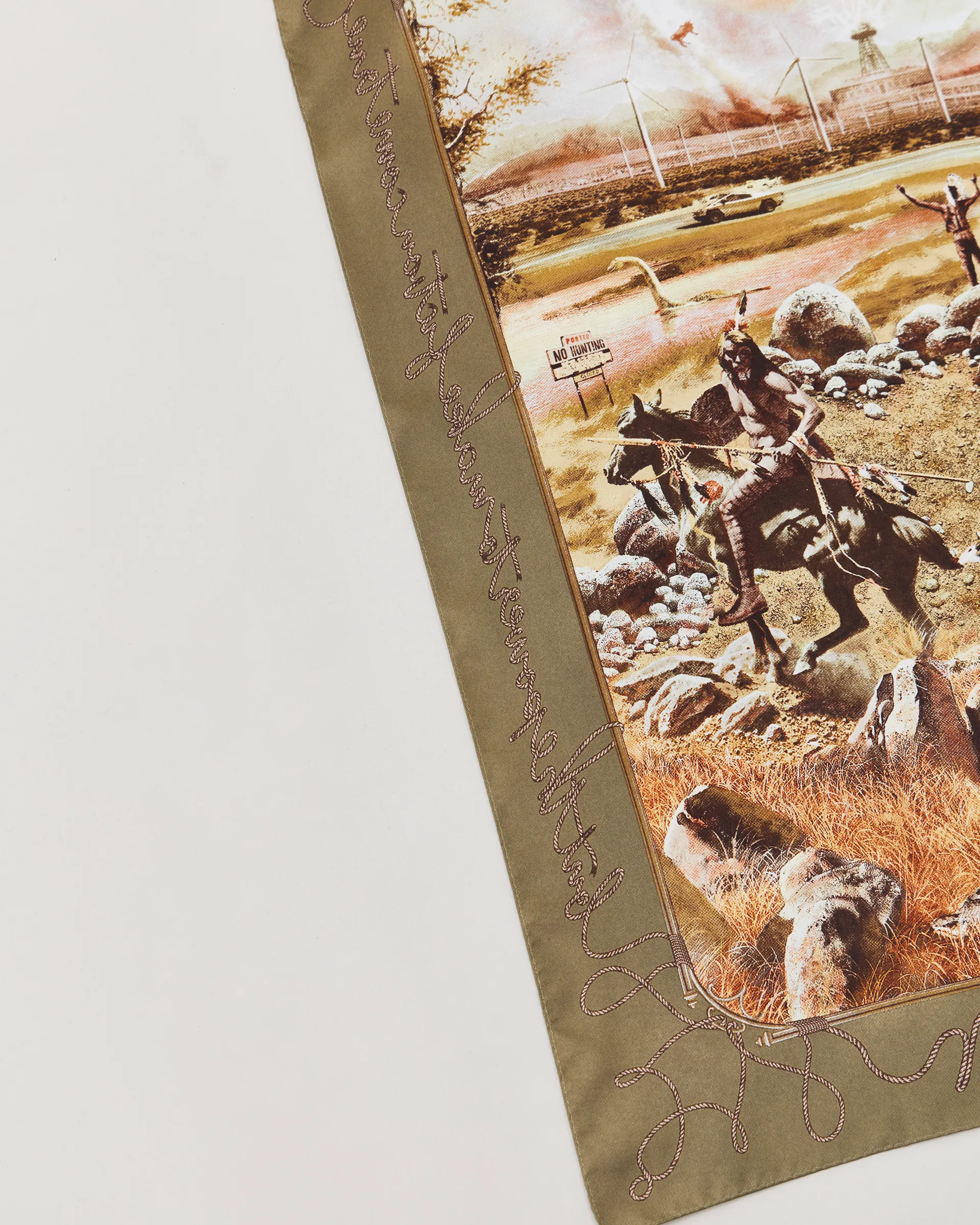オリジナル柄をシルクスクリーンプリントしたシルクツイル素材のスカーフ。色ごとに版分けし13版を使い、職人が手捺染しています。多色の重ね刷りにより奥行きのある表情と、豊かな色彩が特徴。グラフィックは今シーズンのテーマをシュールリアリスムのアプローチで表現しました。