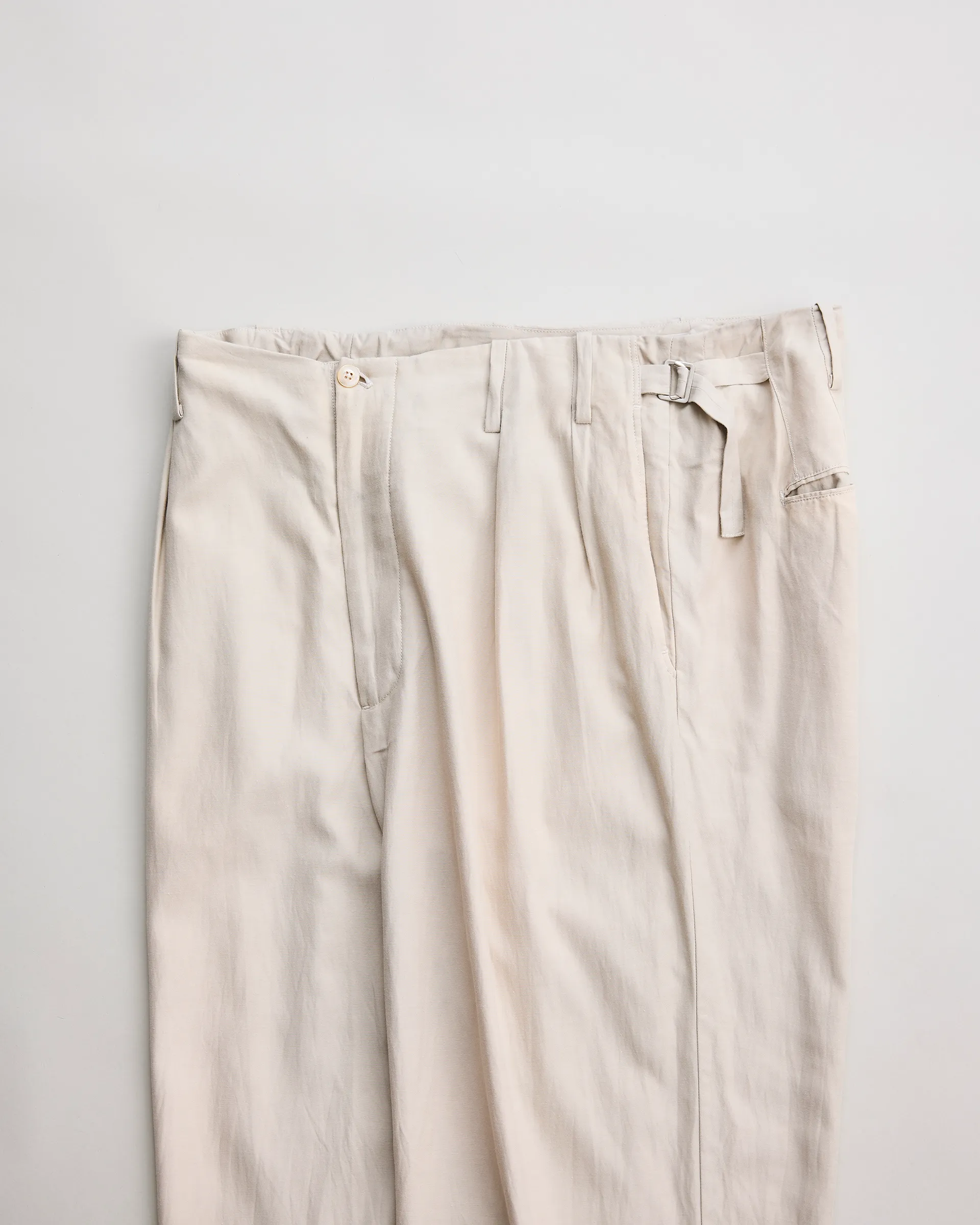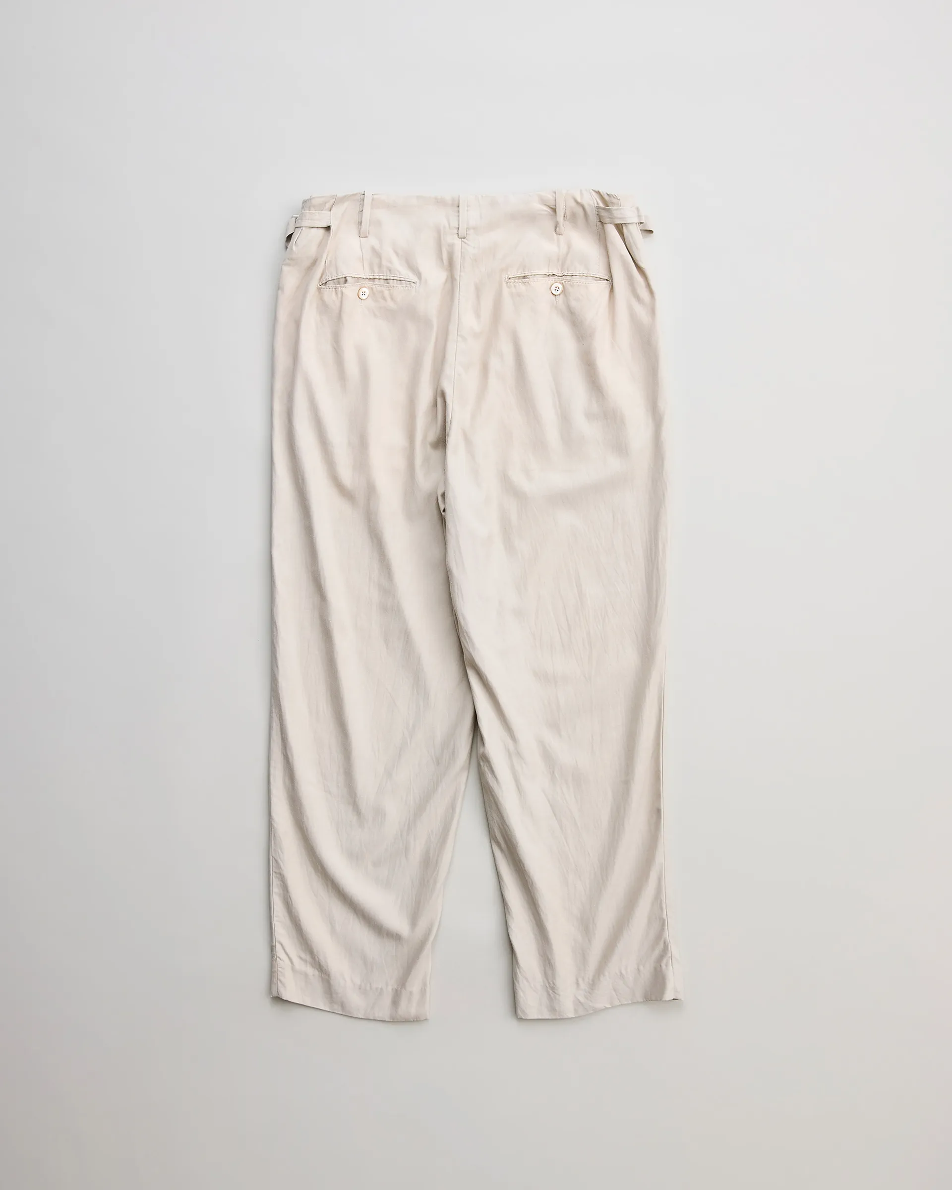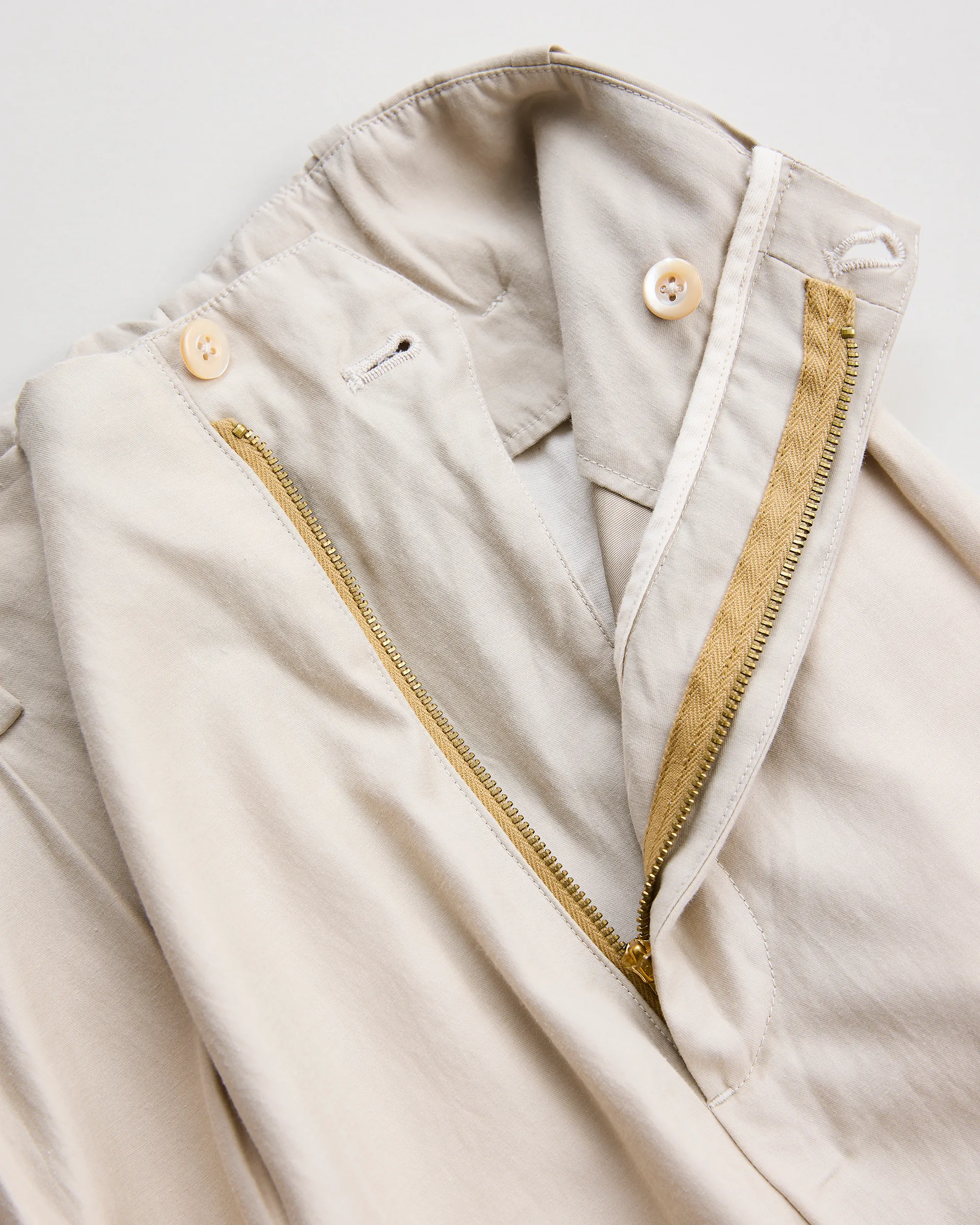 日本と西洋の美意識を背景に“ミリタリー×ドレス”のハイブリッドな構造美を融合させたレーヨン×コットン交織ギャバジンで製作したスラックス。フェード系の特殊加工により生み出された程よい落ち感、自然な光沢とくすみ感は、無地だからこそ際立つ素材の魅力です。ドレスディテール、ベルトレス仕様、深めのインタックなど、クラシックなディテールを継承しつつ、快適なフィットと可動性にも配慮した設計。朴訥とした個性を語りかけてくるような、ヴィンテージライクな佇まいのあるトラウザーに仕上がっています。