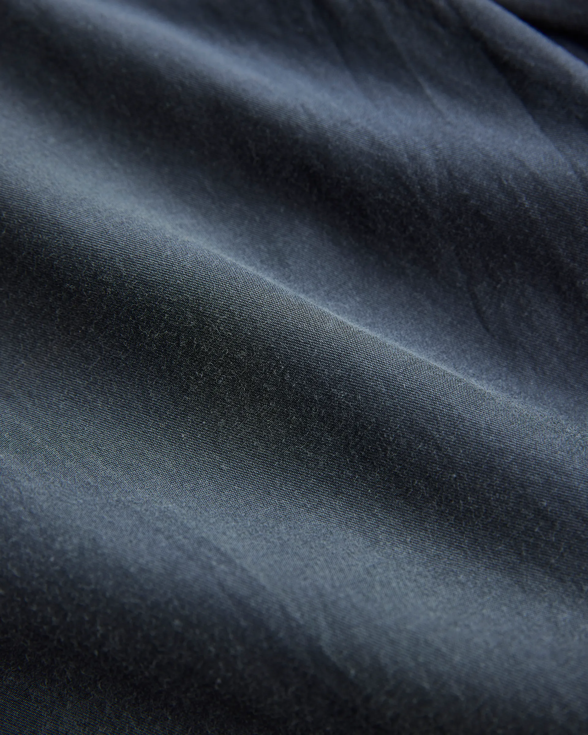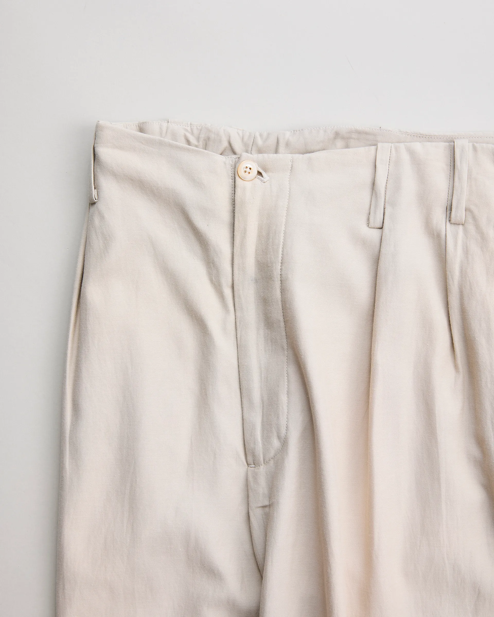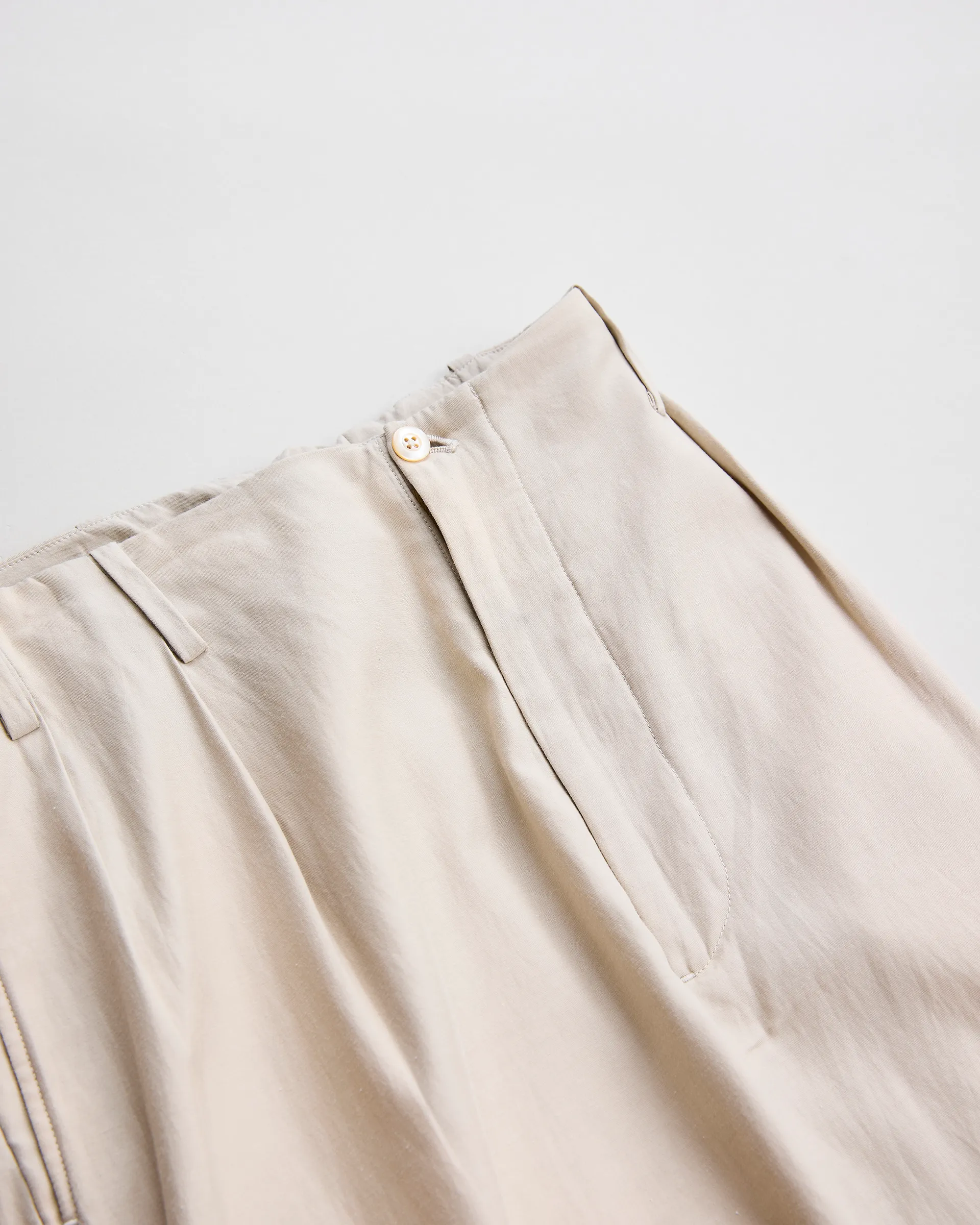 日本と西洋の美意識を背景に“ミリタリー×ドレス”のハイブリッドな構造美を融合させたレーヨン×コットン交織ギャバジンで製作したスラックス。フェード系の特殊加工により生み出された程よい落ち感、自然な光沢とくすみ感は、無地だからこそ際立つ素材の魅力です。ドレスディテール、ベルトレス仕様、深めのインタックなど、クラシックなディテールを継承しつつ、快適なフィットと可動性にも配慮した設計。朴訥とした個性を語りかけてくるような、ヴィンテージライクな佇まいのあるトラウザーに仕上がっています。