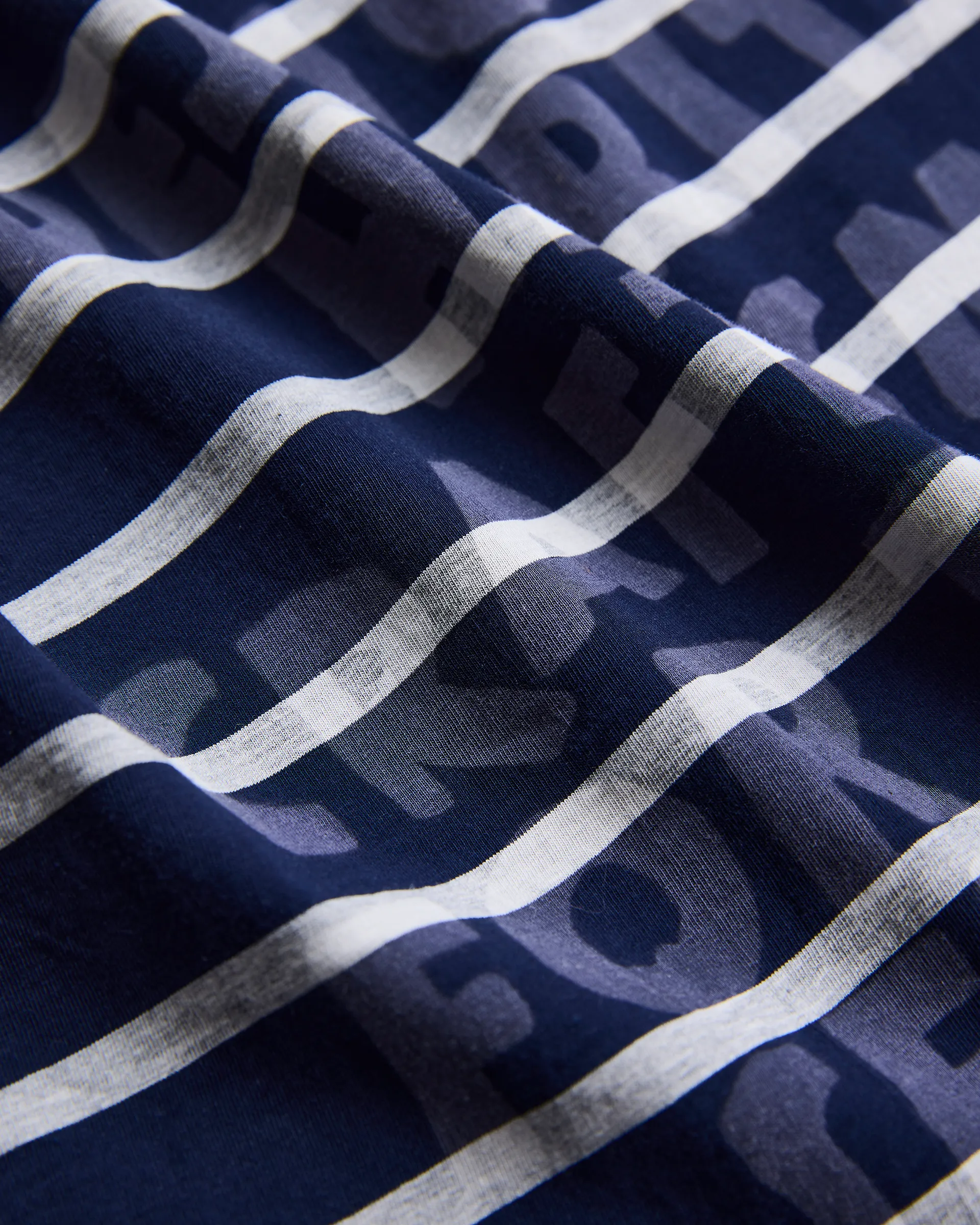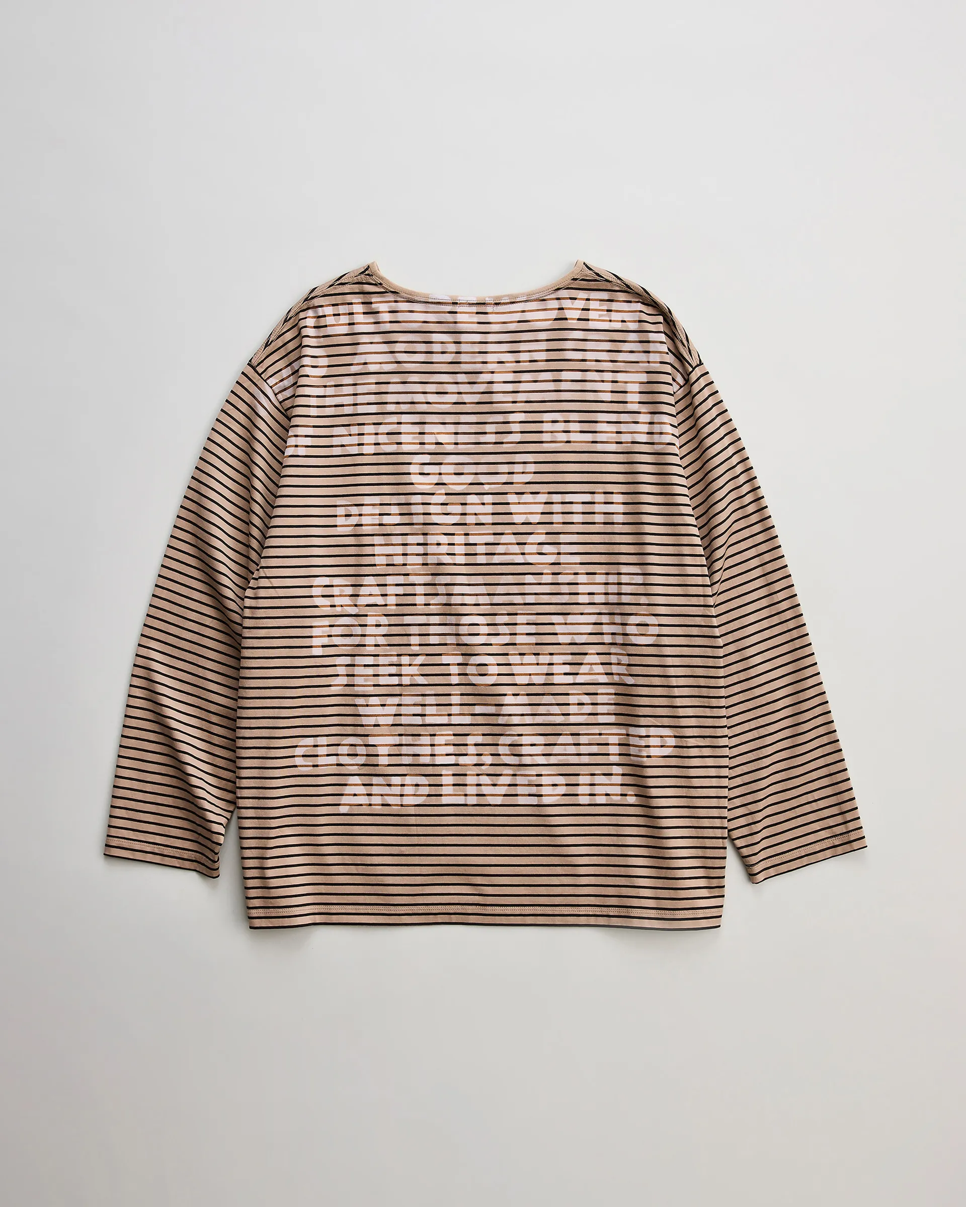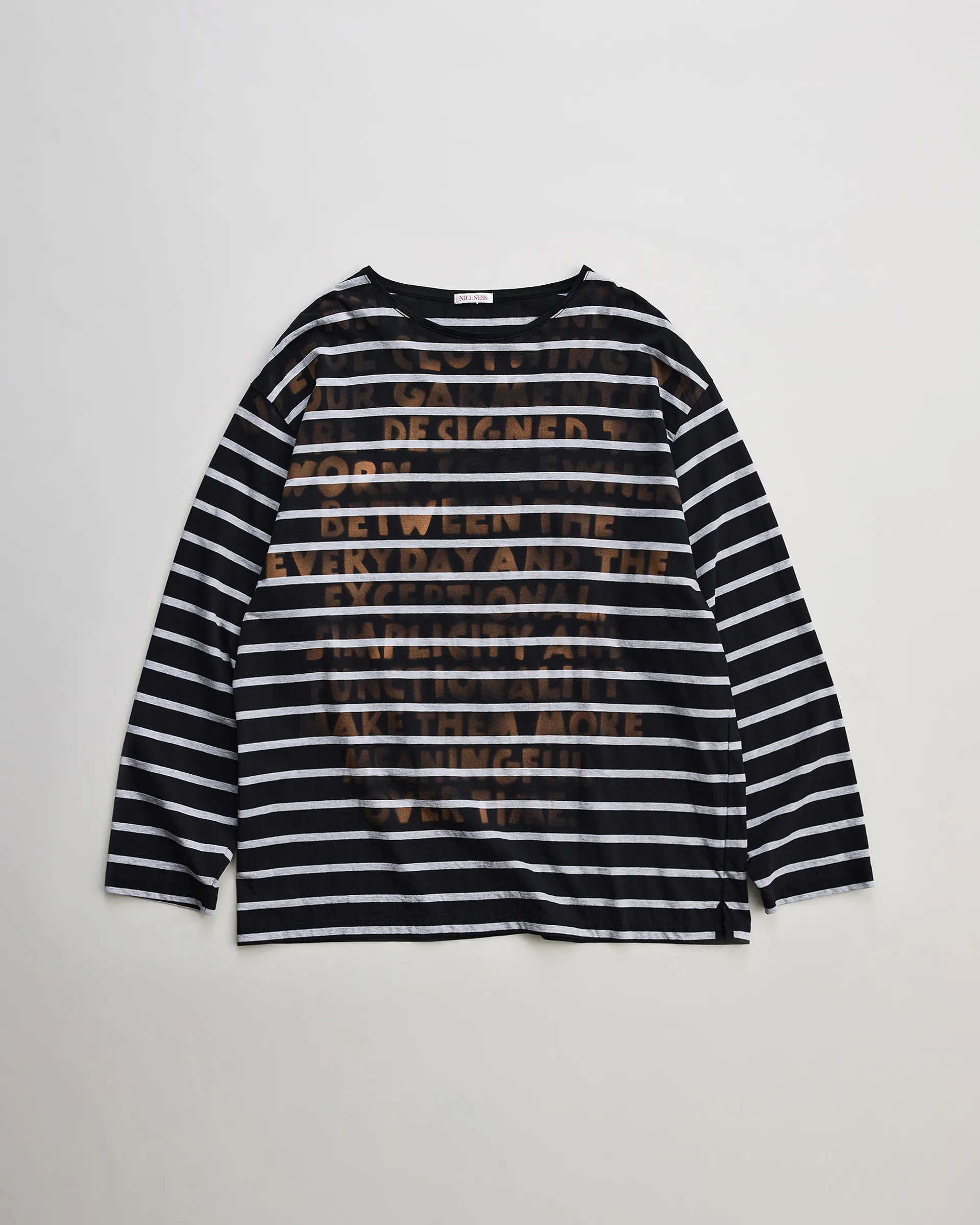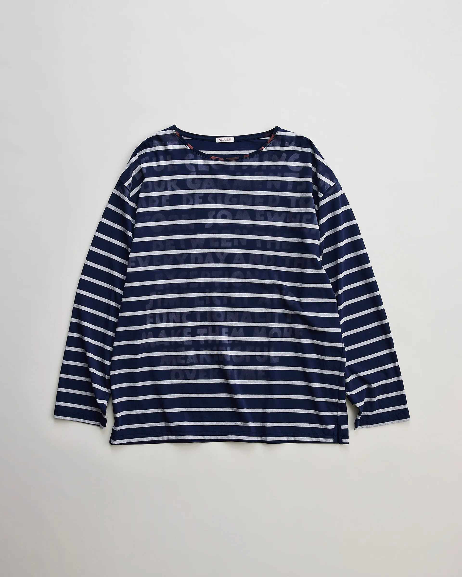 高品質な超長綿を原料にした強撚糸を使用しハイゲージで編み立てた生地を用いたステンシルブリーチバスクL/S Tee。1970年代のバスクシャツをリファレンスとし、細幅の付け襟などUSヴィンテージTシャツのディテールを取り入れています。透けにくい適度な肉感を持たせながらも、クリアーで上質な表面感を実現させています。プリントにはステンシル製版による抜染技法を採用。切り抜いたオリジナルフォント型にエアブラシで抜染剤を擦り込むように加工し、1点ごとに異なる風合いとヴィンテージ感を演出。手作業による力強さとクラシックを融合させた一着。