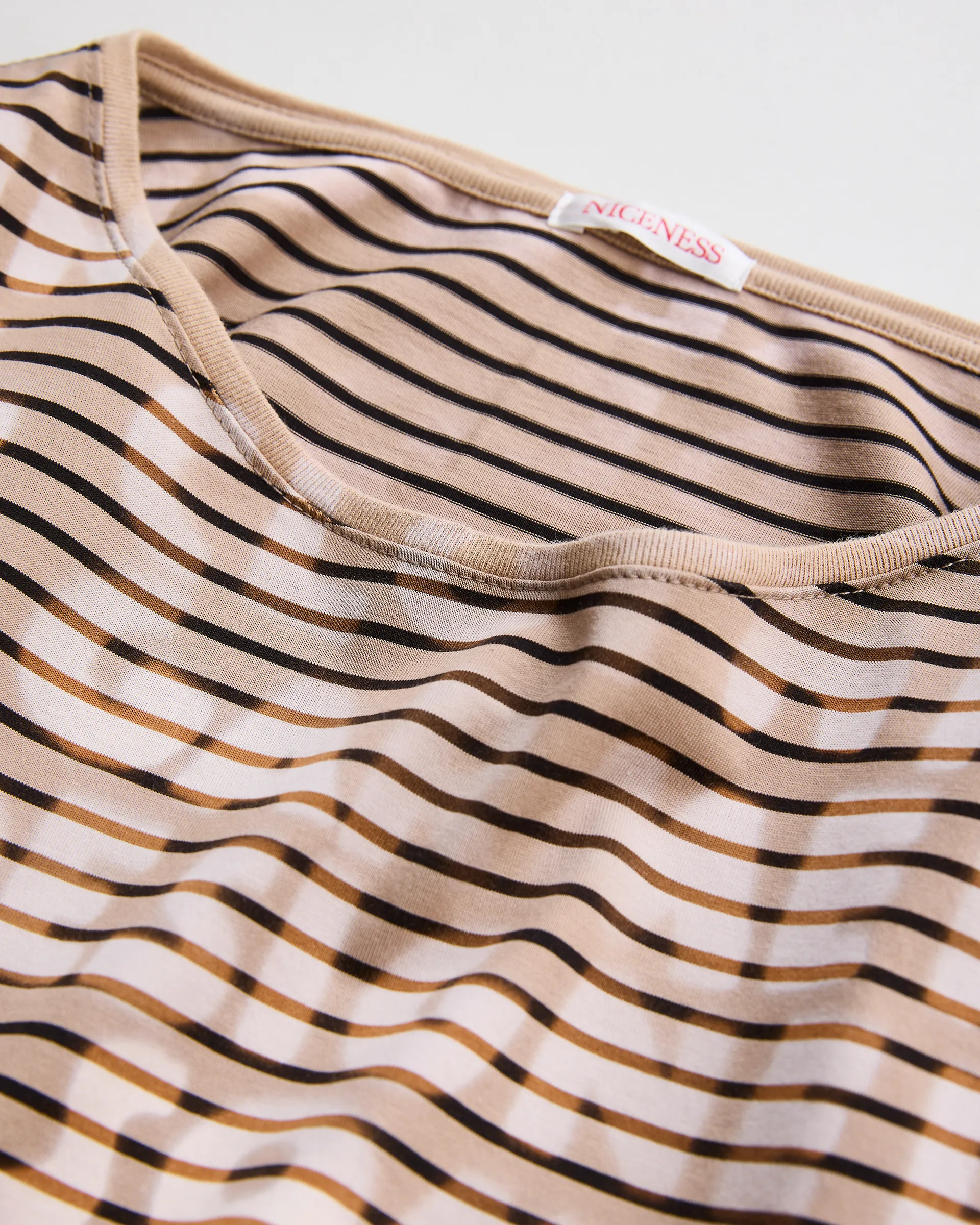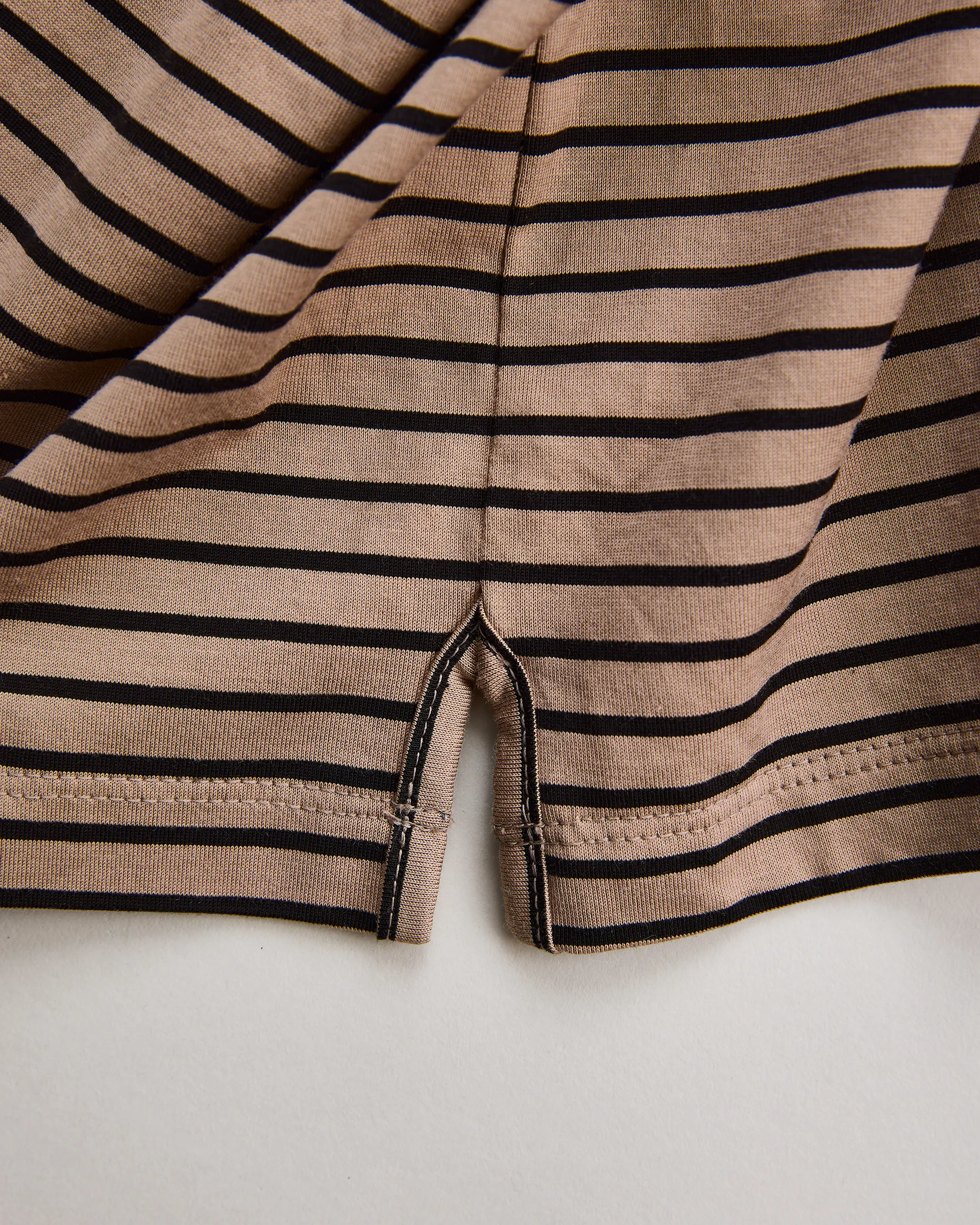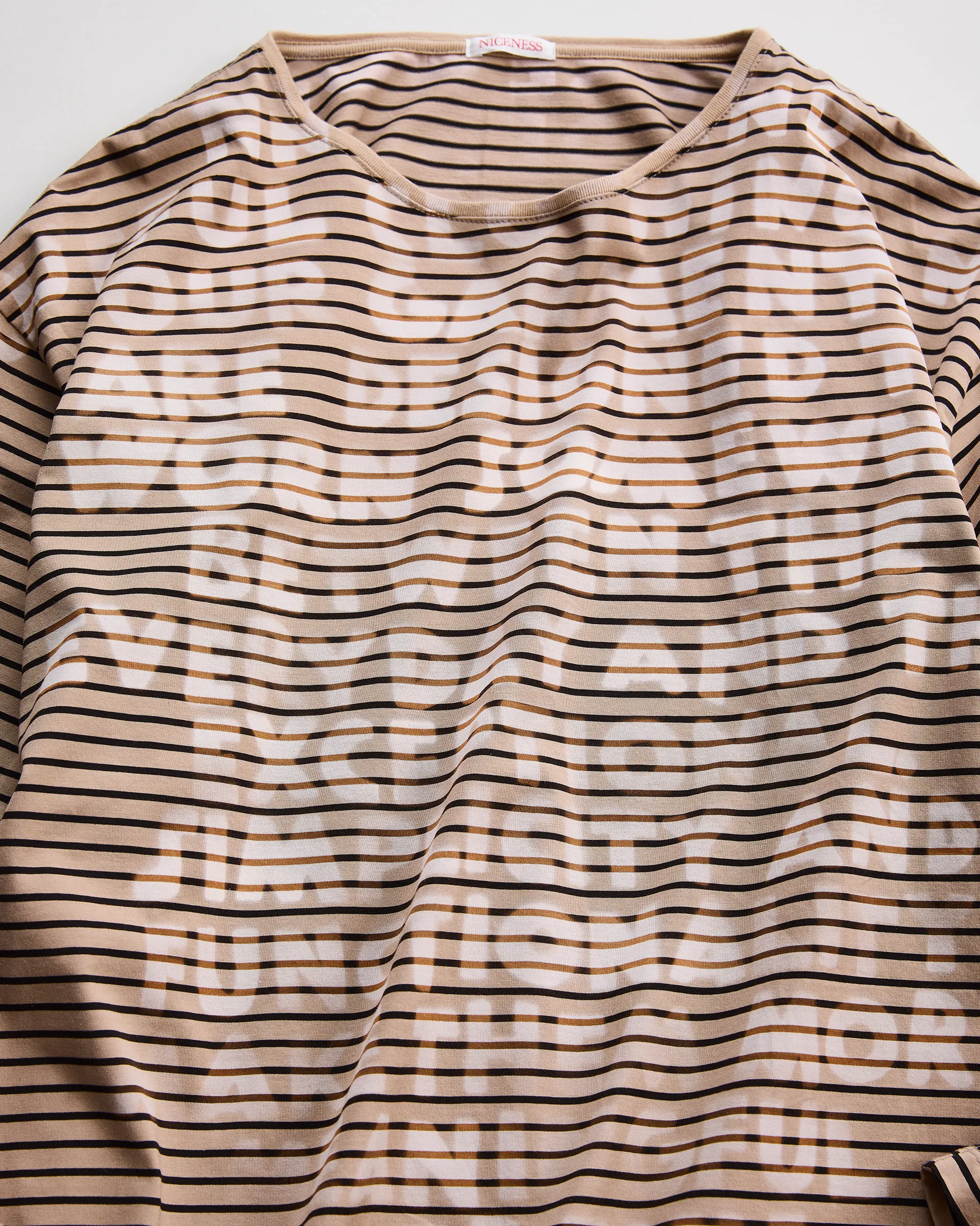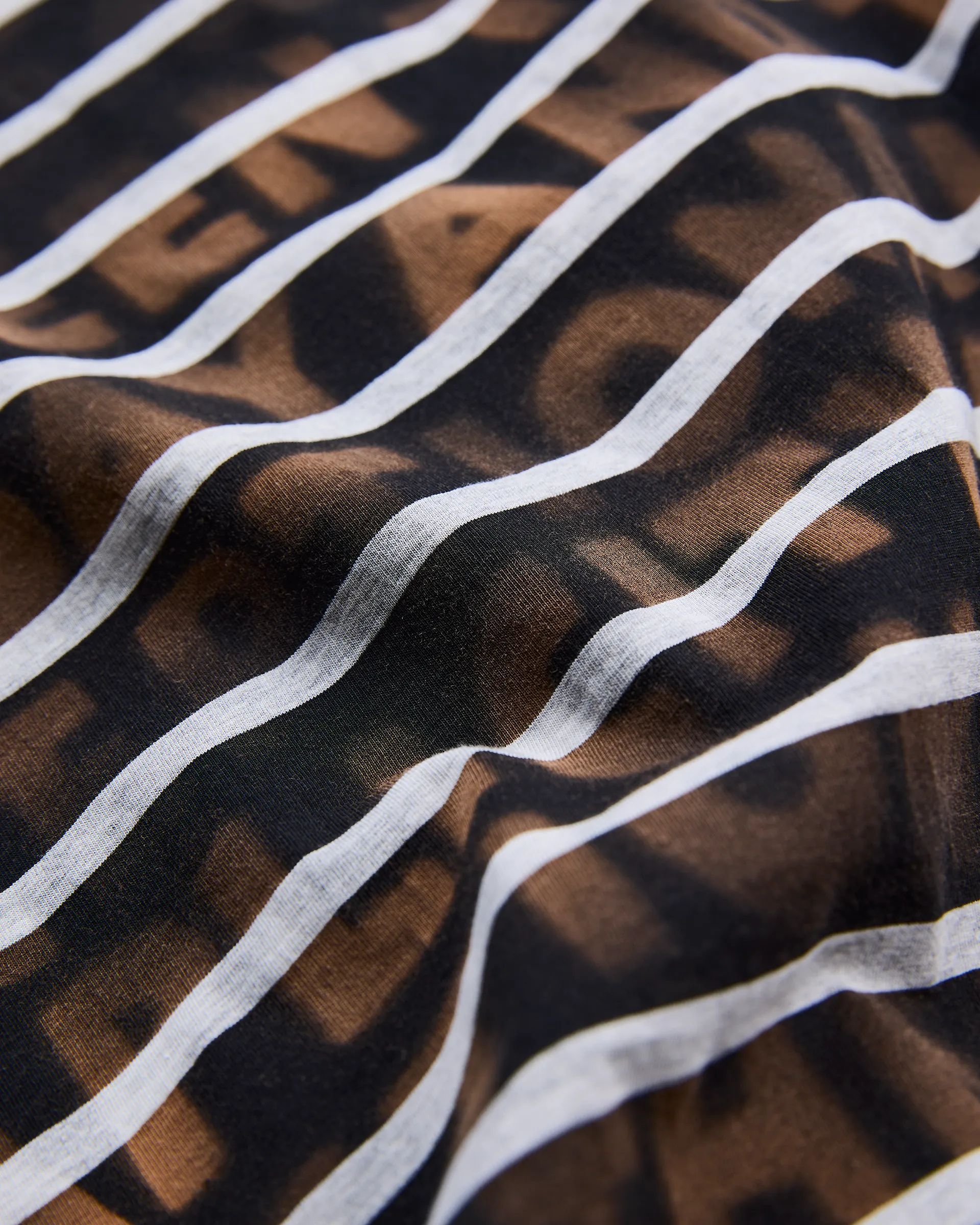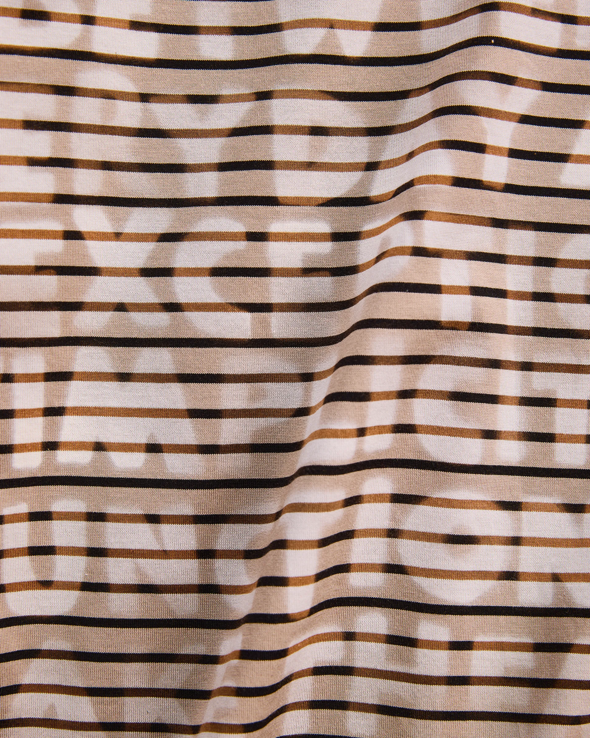 高品質な超長綿を原料にした強撚糸を使用しハイゲージで編み立てた生地を用いたステンシルブリーチバスクL/S Tee。1970年代のバスクシャツをリファレンスとし、細幅の付け襟などUSヴィンテージTシャツのディテールを取り入れています。透けにくい適度な肉感を持たせながらも、クリアーで上質な表面感を実現させています。プリントにはステンシル製版による抜染技法を採用。切り抜いたオリジナルフォント型にエアブラシで抜染剤を擦り込むように加工し、1点ごとに異なる風合いとヴィンテージ感を演出。手作業による力強さとクラシックを融合させた一着。