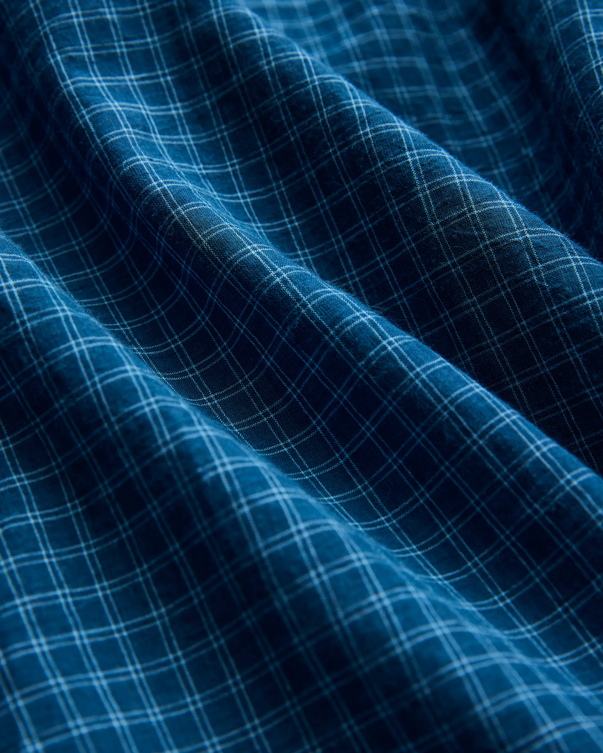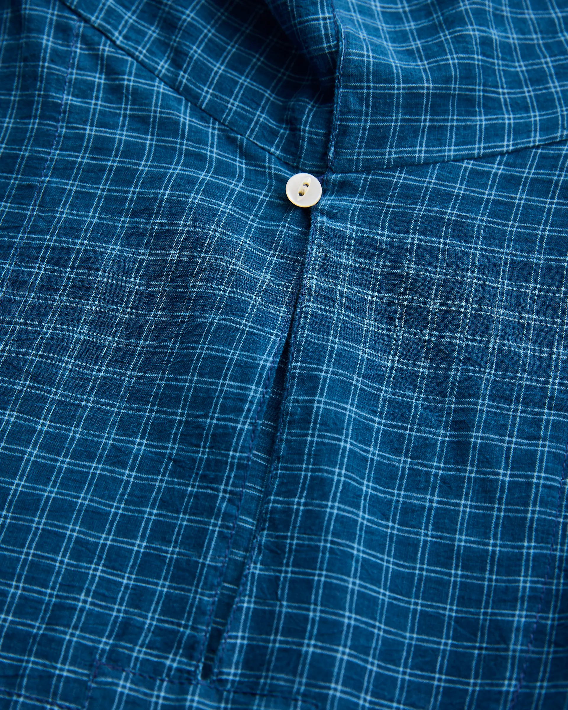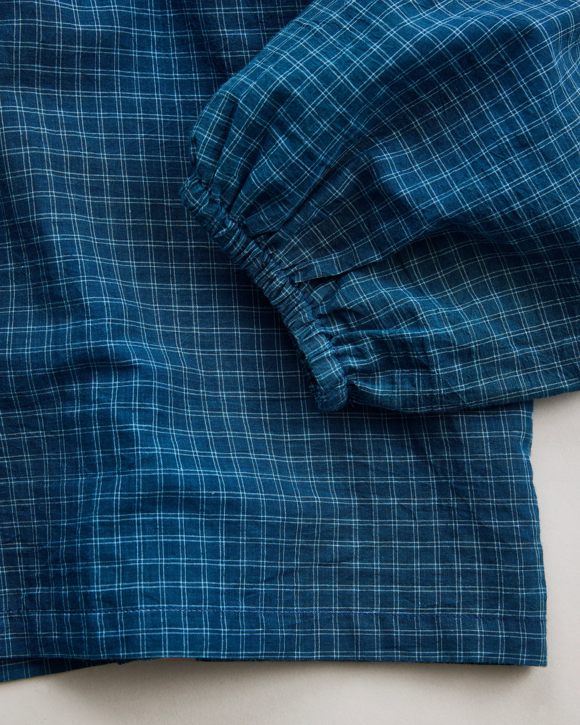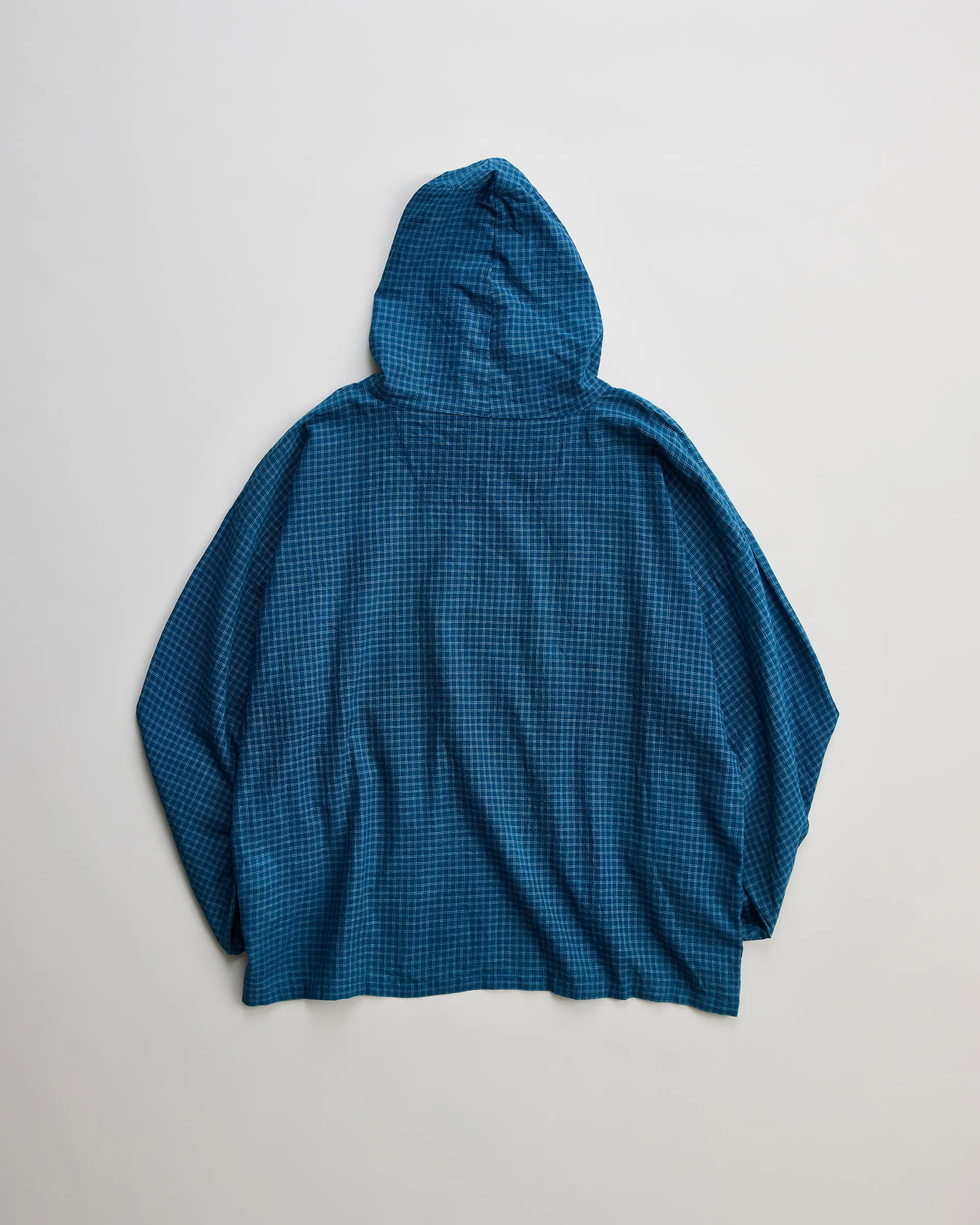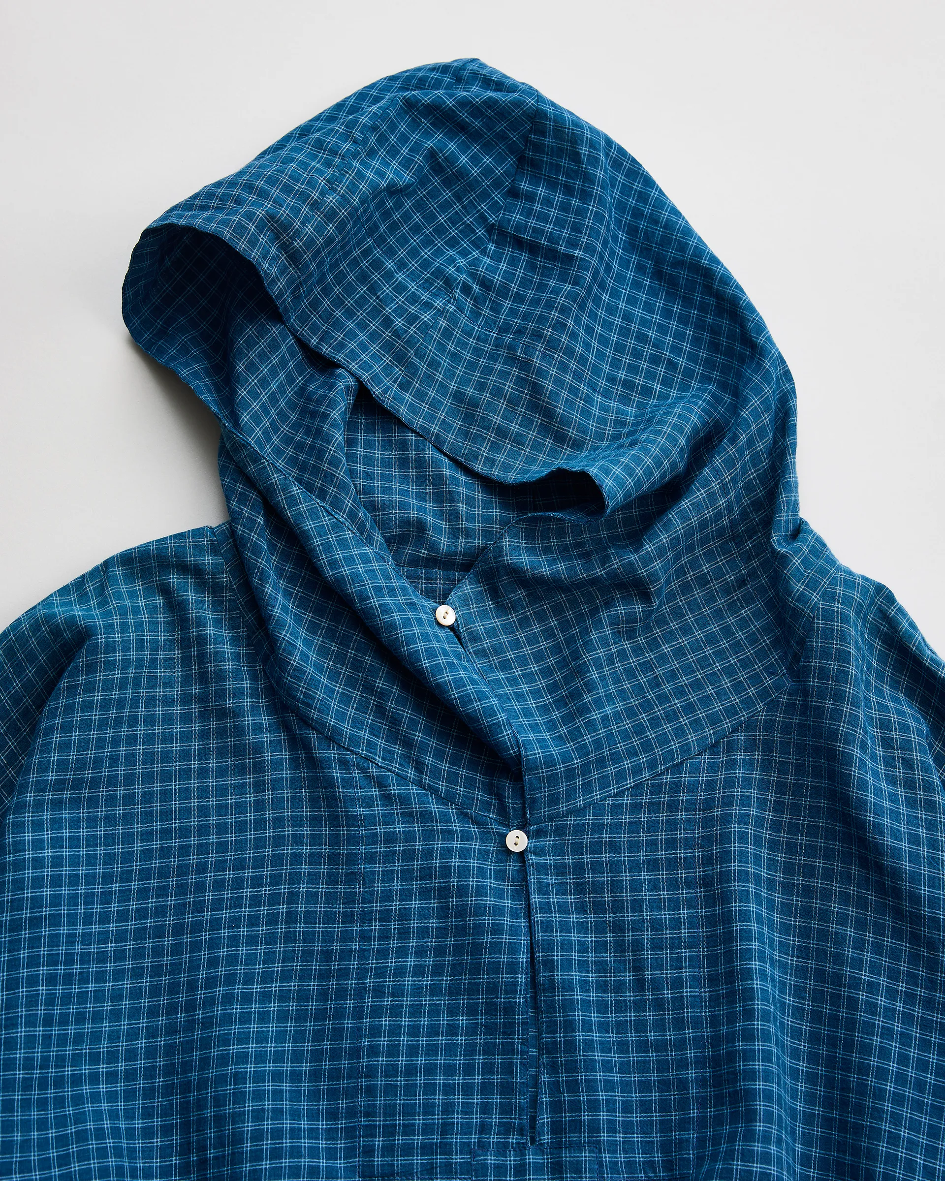 インドで手紡ぎ・手織りされ本藍による草木染めの先染めチェック柄を施したカディコットン生地で製作したスノーパーカー。極細糸で構成された精緻なパターンは、手織り機による製織では高い熟練度と集中力を要する極めて手間のかかる技術によって生み出されています。雪山でのカモフラージュ用途として誕生したミリタリーウェア「スノーパーカー」をリファレンスとし、無骨なUKミリタリーの空気感と繊細な縫製技術を融合させたデザイン。柔らかな肌触りと空気を含む軽やかな風合い、ファインヤーンならではのクリーンで上質な表情が融合した一着です。