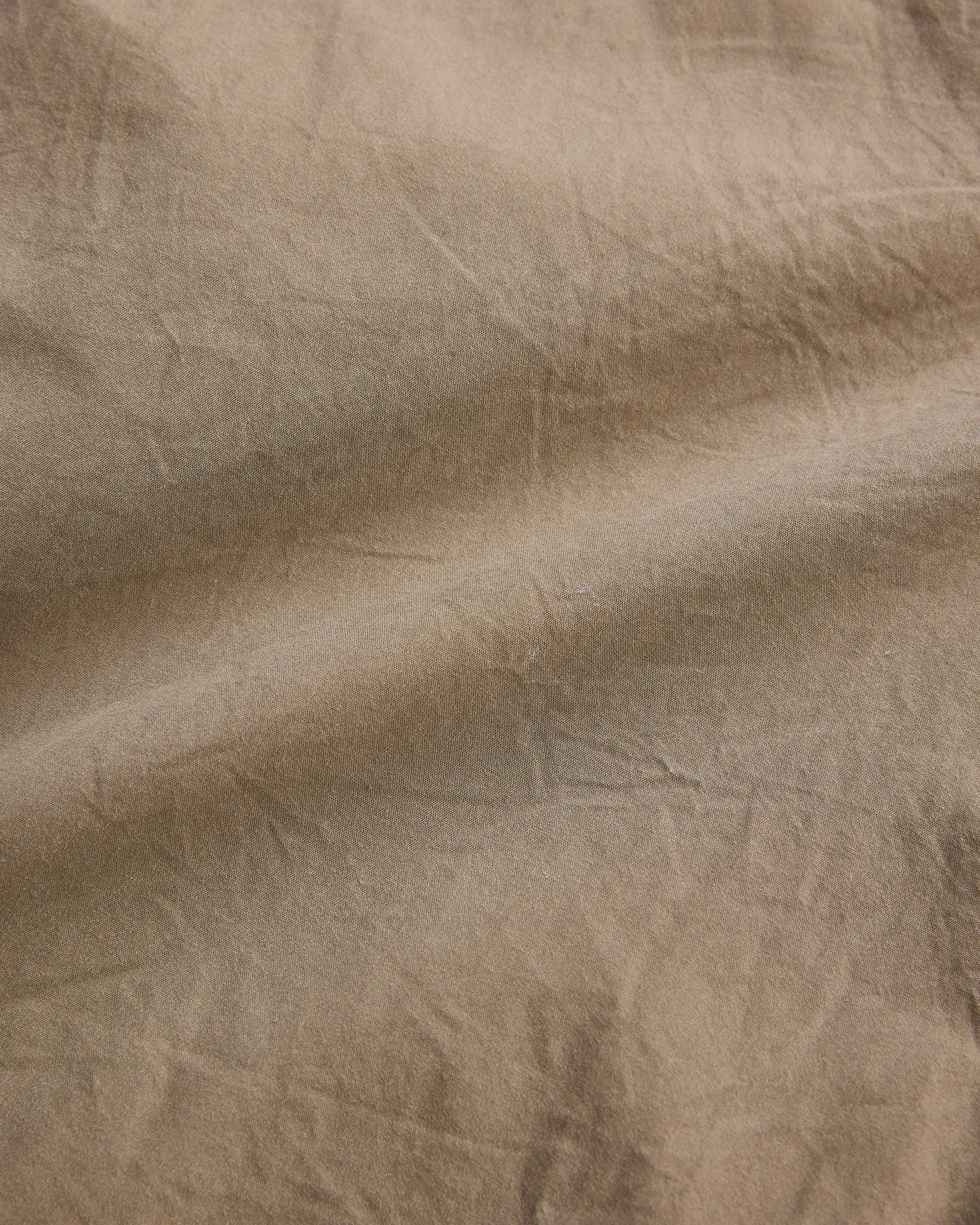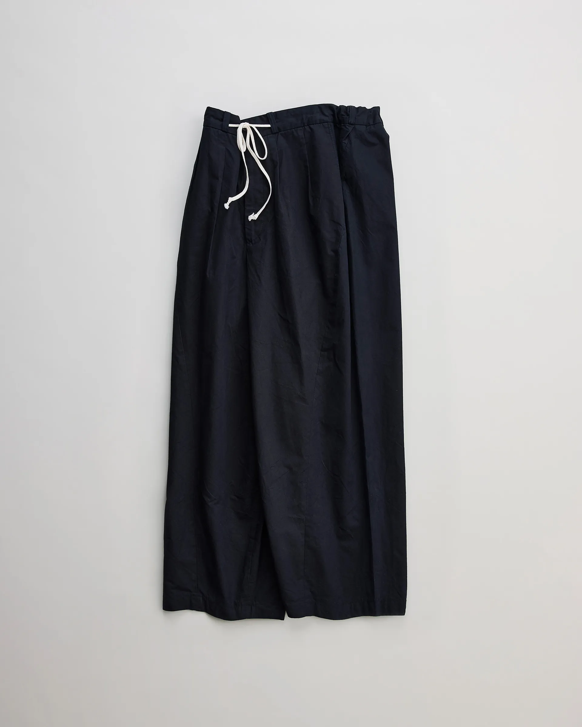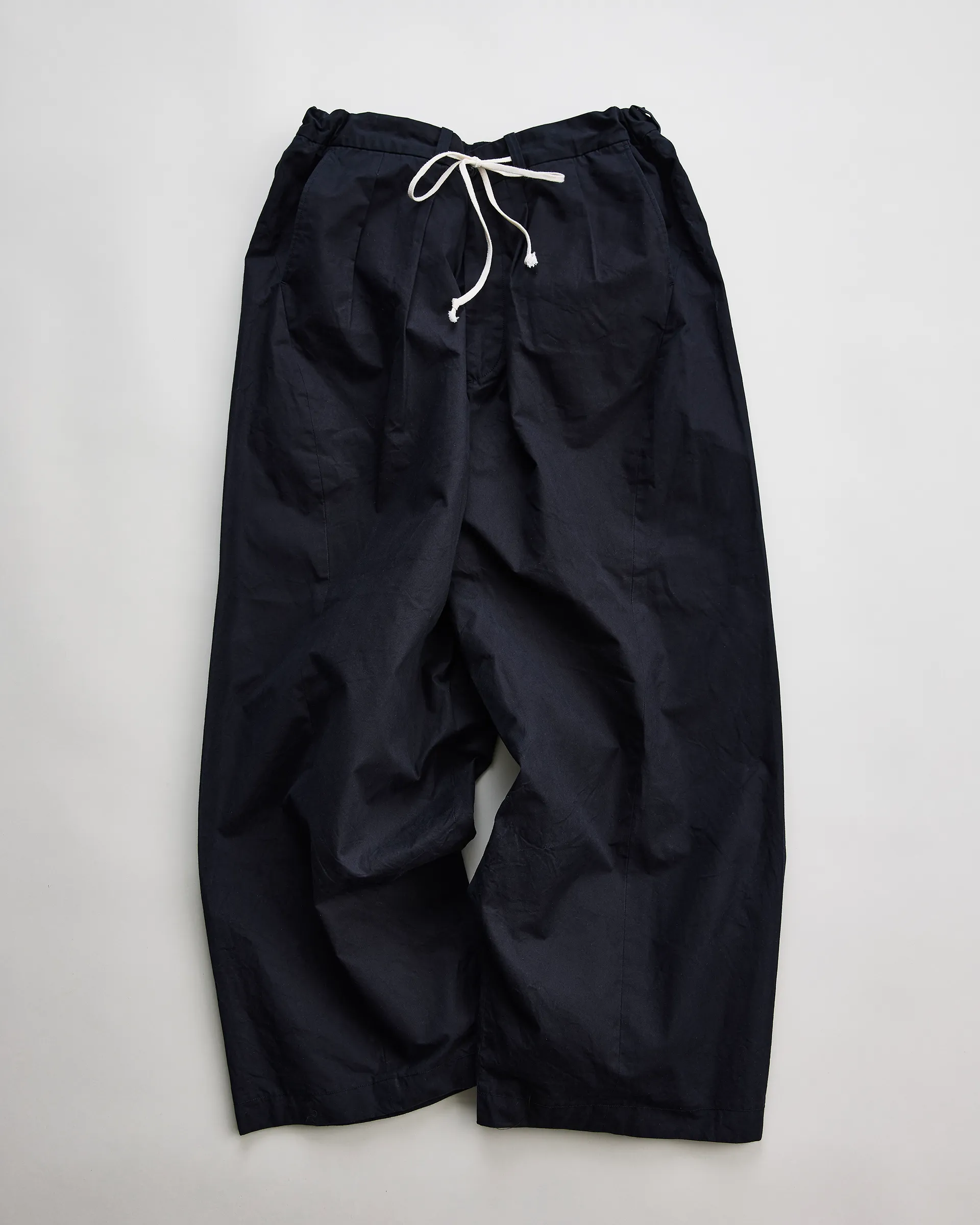 都市と自然、ドレスとワーク、伝統と革新という相反する価値観を静かに内包したルースシルエットのローバーパンツ。細番手の超長綿を限界まで高密度に打ち込んだ綿100%の先染め素材で製作しました。化学繊維を一切使わず、耐水圧900mmという優れた防水性・防風性を備えた究極の天然素材を採用。仕上げに撥水加工を施し実用性を確保。パターン設計に立体裁断を取り入れ、膝の屈伸を想定した構造に。ROVER(放浪者)の名の通り街からアウトドアまでを自在に横断し、時間の経過とともに表情を変え、着る者の個性とともに静かに育つ一本です。