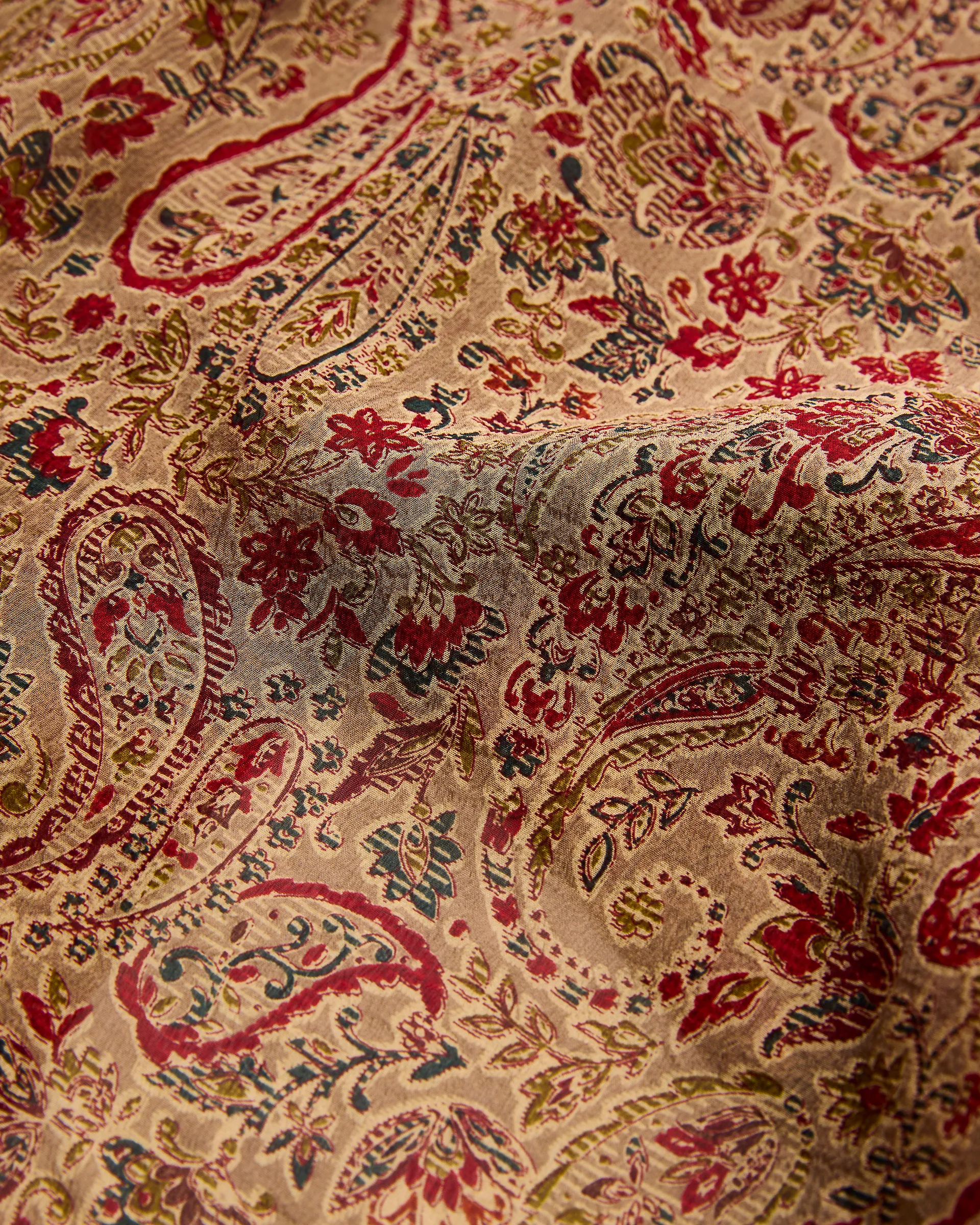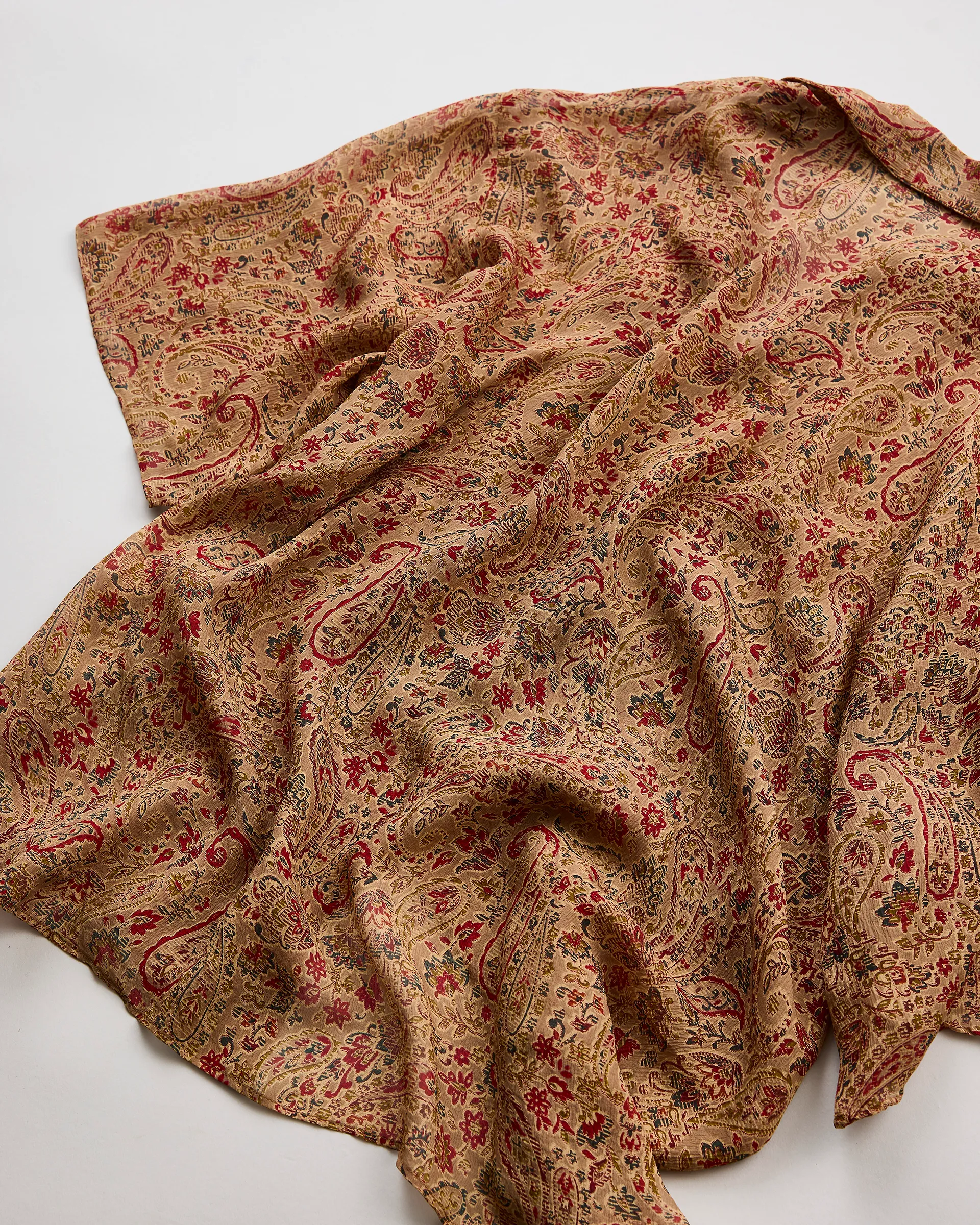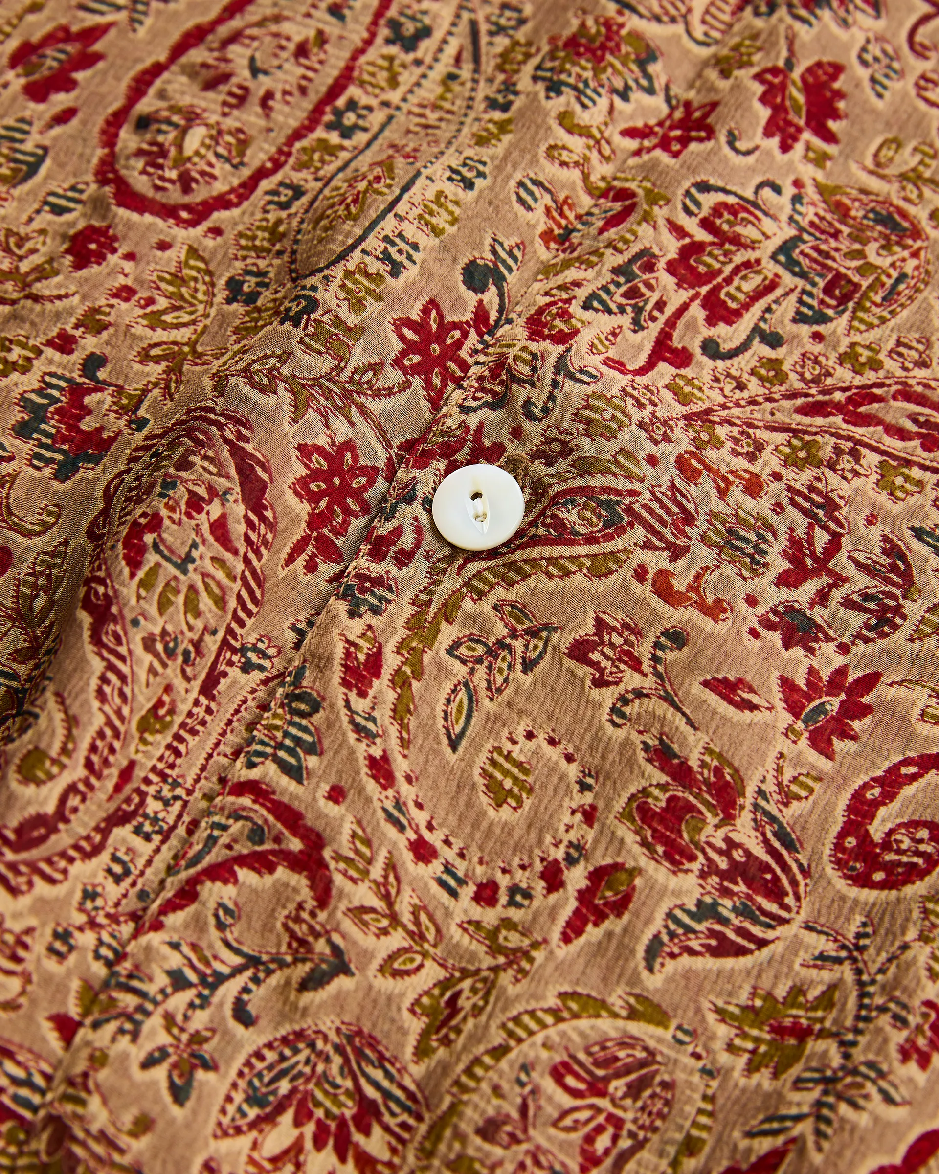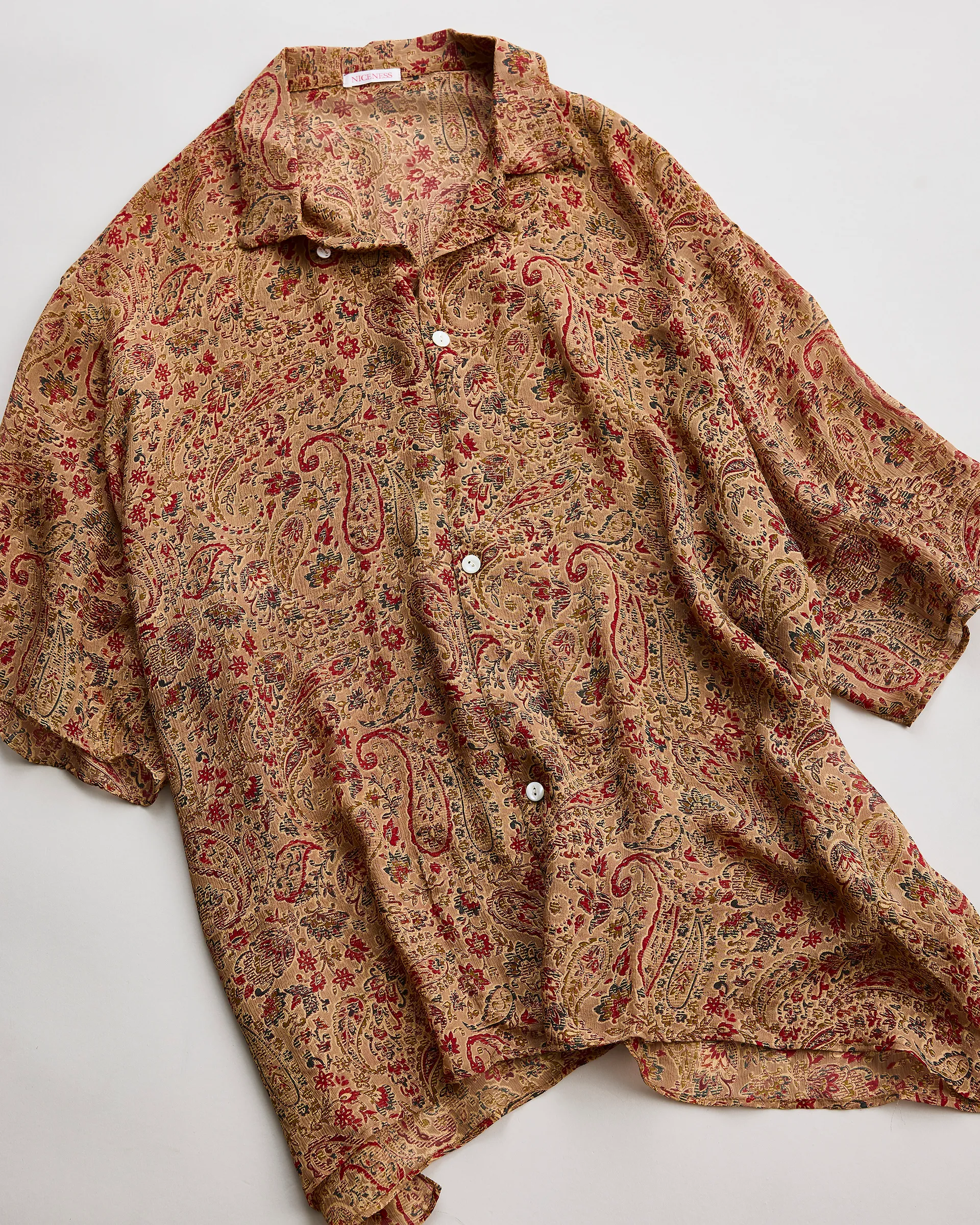南インドのプリント工場に眠っていたデッドストックのインド産シルクシフォン生地を使用したオープンカラーシャツ。型は1950年代のUSヴィンテージシャツをリファレンスとしたボックスシルエット。ラウンドカラーの柔らかな表情と、ゆとりある身頃によって、風を孕むような軽やかさと清涼感を感じさせます。極薄ながらもシルクが持つ体温調整機能によって、通気性と保温性の両方を備えています。