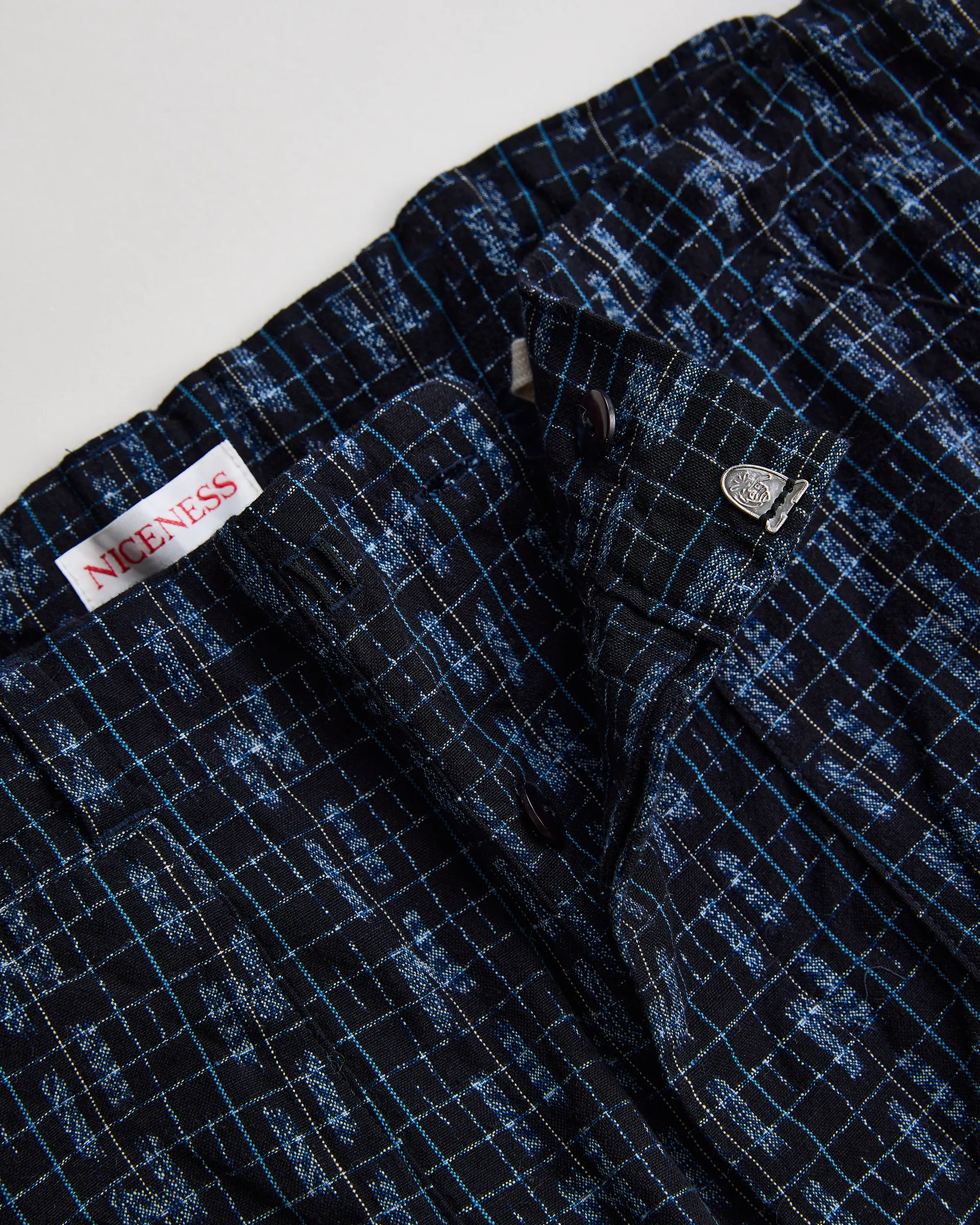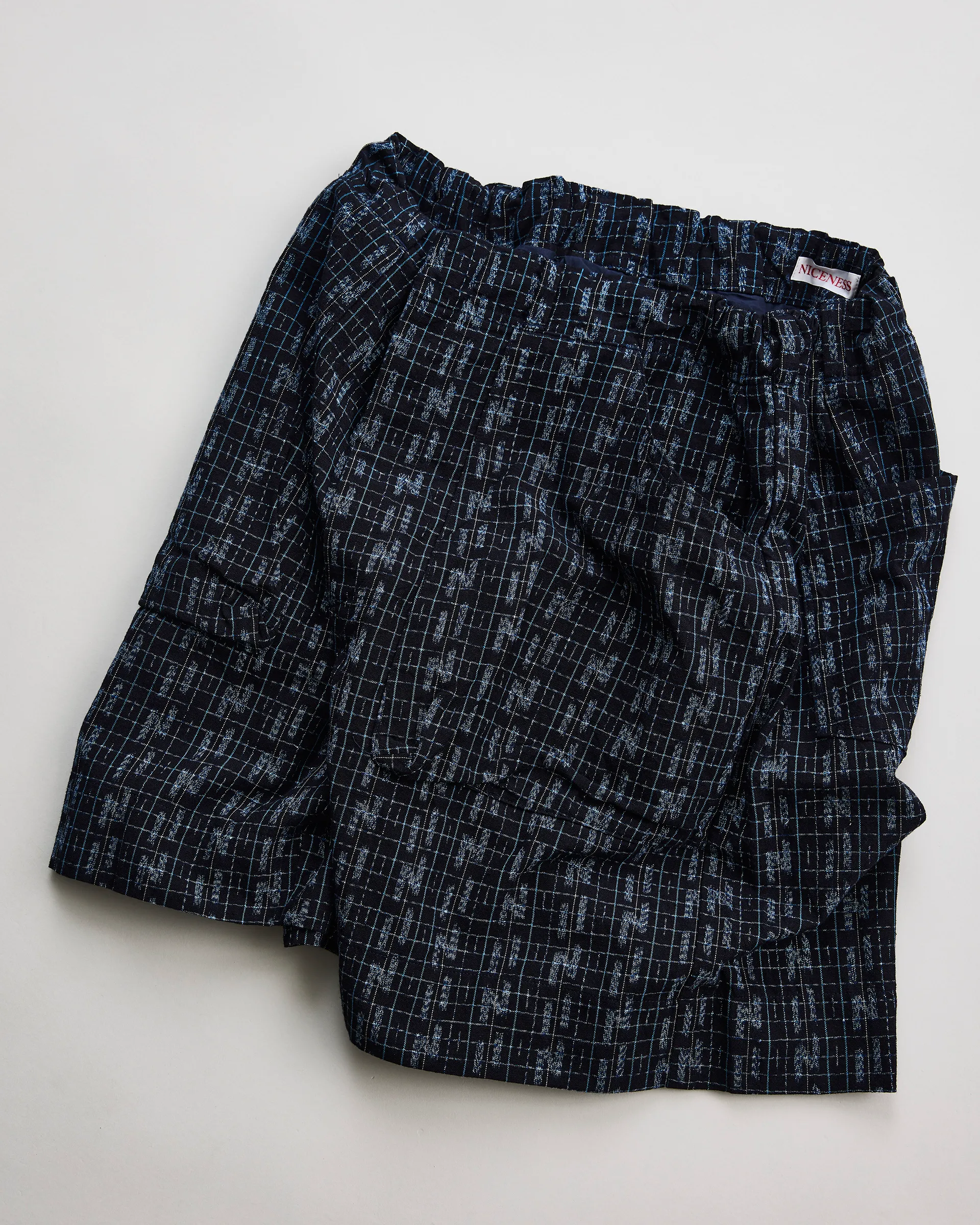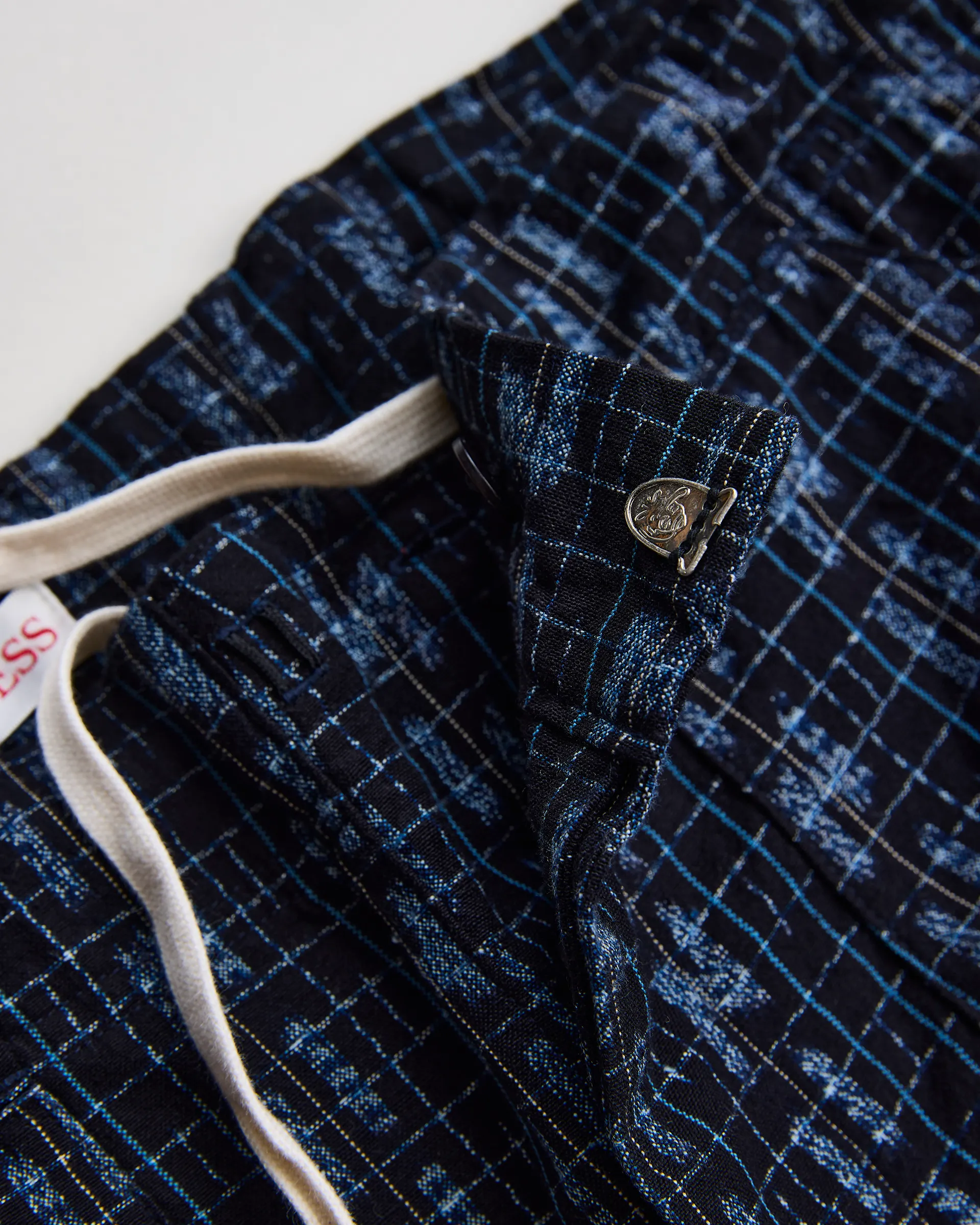 日本三大絣のひとつである久留米絣で製作したモンペショーツ。型は1960年代のワークトラウザーと日本の着物「もんぺ」の直線的構造を融合させています。生地は久留米絣を贅沢に使用し、柄は歴史ある「古代絣」とブランドを象徴する”N”をモチーフにした「N柄絣」です。ウエストはコードで調整するもんぺ構造で動きやすさと快適なフィット感を両立させています。ポケットには日本の山嶺と太陽のステッチワークや足袋の小鉤(こはぜ)をディテールに取り入れ和の精神性を表現。日本のクラフトマンシップを凝縮した特別な一本です。