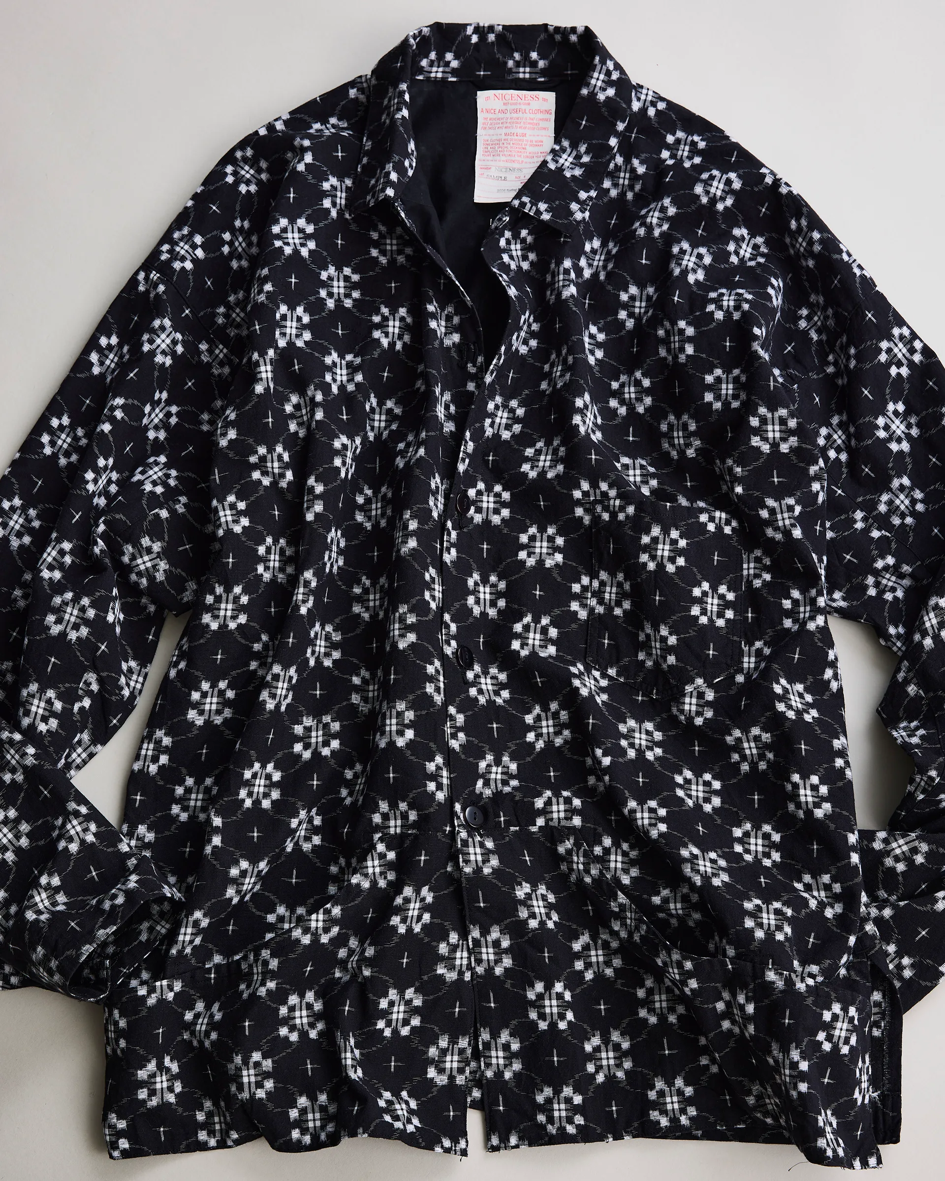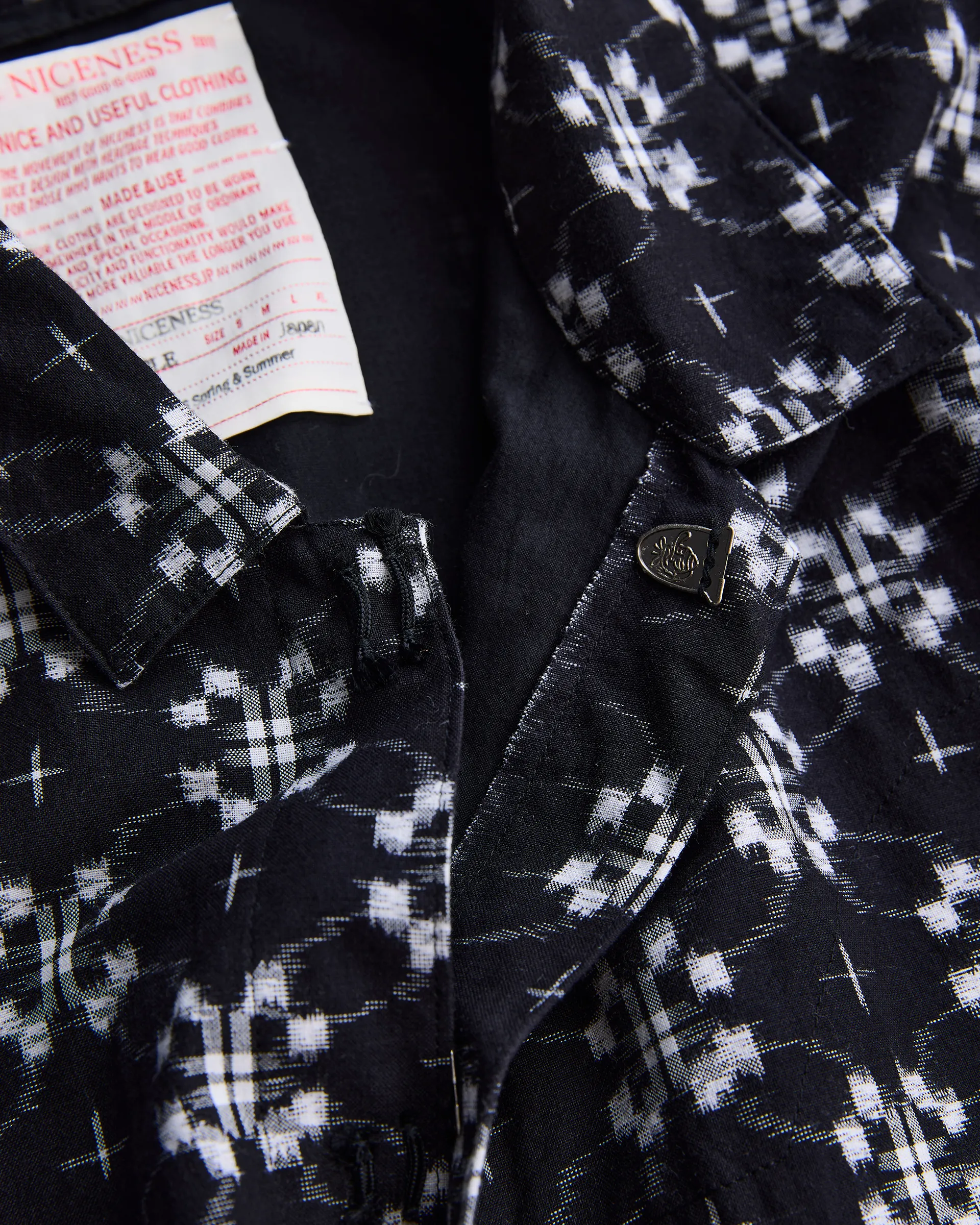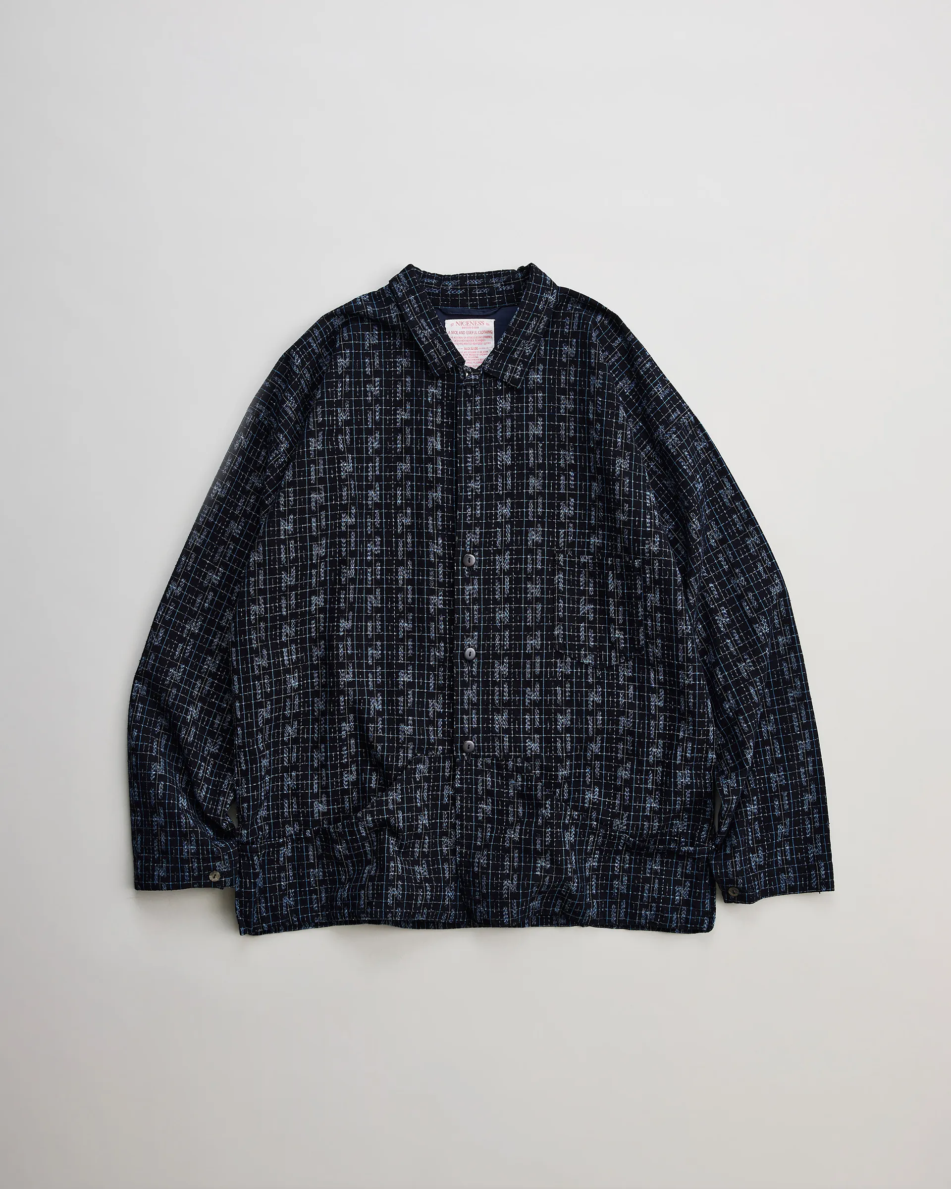 日本三大絣の一つに数えられる久留米絣を用いて仕立てたフジジャケット。型は1950年代のワークシャツと着物から着想を得た直線的なパターン。柄は精緻な文様を表現する「古代絣」と、ブランドを象徴する“N”をモチーフにした「N柄絣」の2種を使用。N柄絣には「文人絣」と呼ばれる白と藍の絣糸を満遍なく配置し、職人の手によって柄をずらすことで「N」を浮かび上がらせる唯一無二の柄に仕上げています。ヨーク裏の形状などは富士山と湖に浮かぶ風景を写し“縁起物”の願いを込めています。伝統と技術に敬意を払い現代的な感覚で再構築したスペシャルピース。