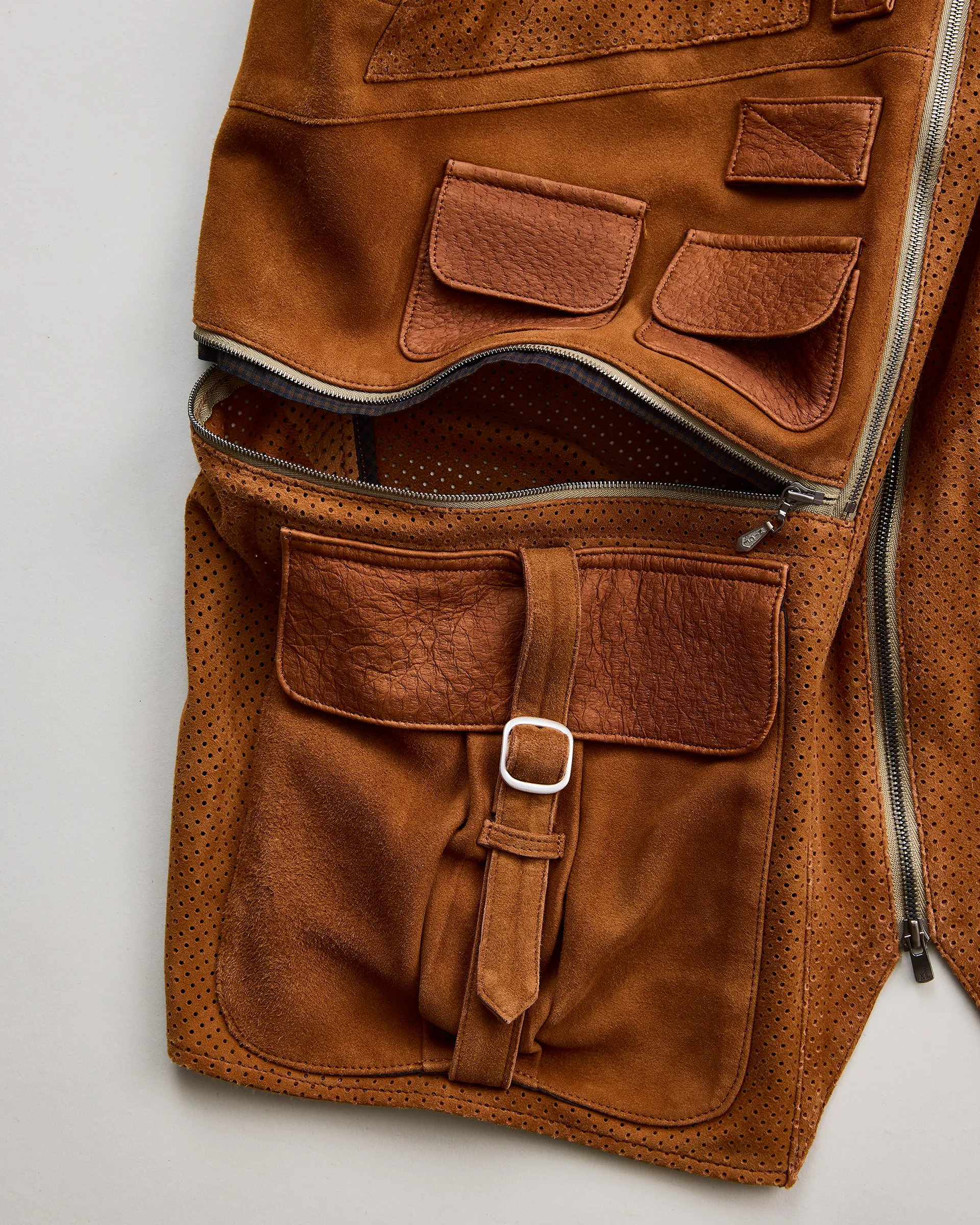 ヘアシープスエードとメッシュヘアシープを組み合わせたボディに、希少な南米ペッカリーをフロントポケットに配備したベスト。1970年代のキャリーオールジャケットをリファレンスとし現代的にアップデート。ヘアシープスエードは滑らかな毛艶と独特のくったりとした風合いが特徴で、メッシュヘアシープの細かな通気孔が軽やかな着心地を実現。フロントのペッカリーはオイル仕上げの素上げ加工によりマットな質感としなやかな手触りを表現し、ペッカリー本来の優れた耐久性も備える一着となっています。