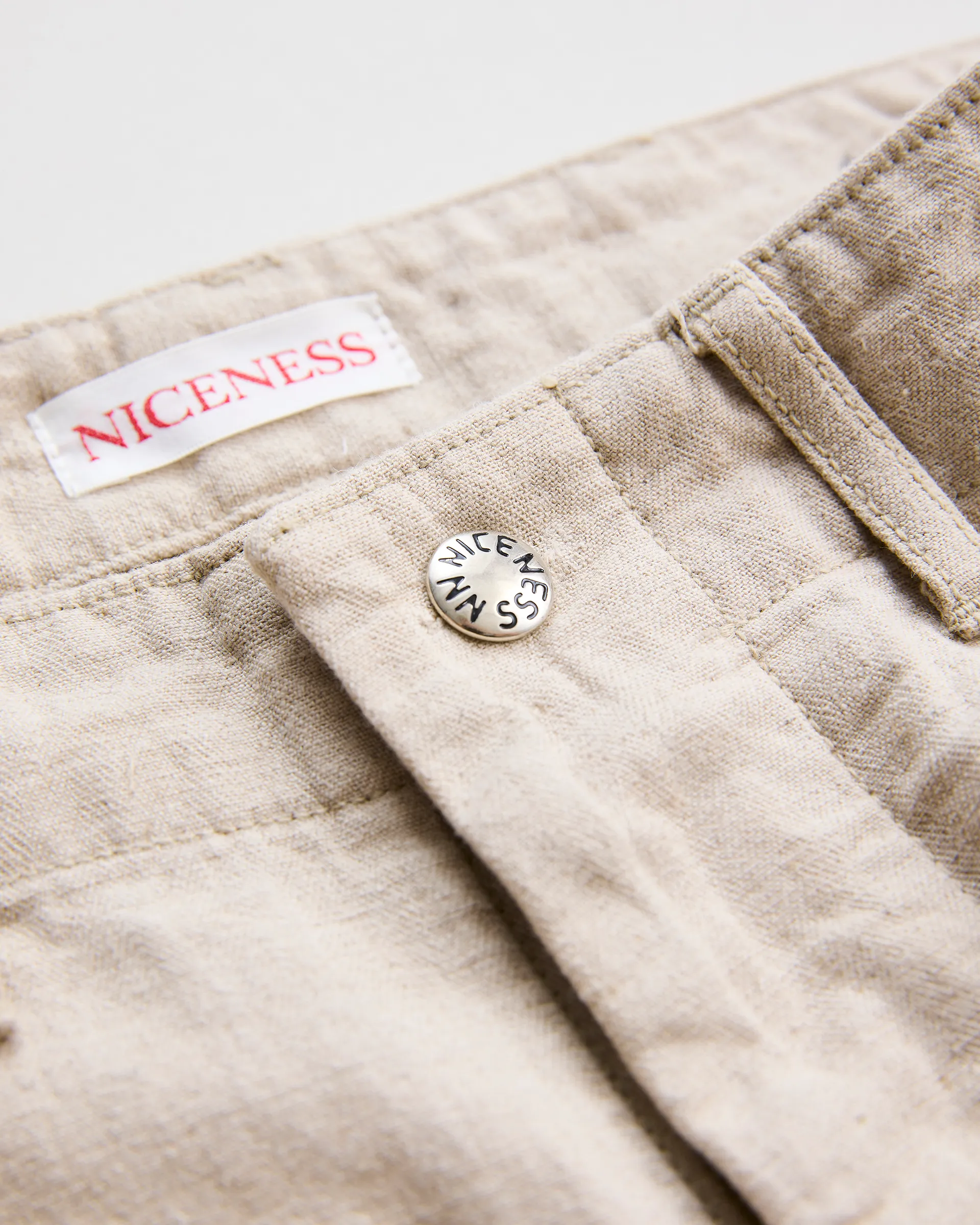 リネン60%・コットン40%の混紡糸を使った綾織りの綿麻ヘリンボン素材で製作したユーティリティパンツ。最大の特徴は前後どちらからも調整できる「前後倒し」サイドベルト仕様。ウエストの絞り位置によって異なるドレープが生まれ、シルエットやフィット感を自在に変えられます。生地は麻の粗野感や独特の風合いを引き出す“麻勝ち”の混紡糸で仕上げ、約10オンスの程よい肉感により通気性と耐久性を兼ね備えています。着始めから肌に馴染むよう、素材に適度なこなれ感を持たせる特殊な仕上げを施しています。