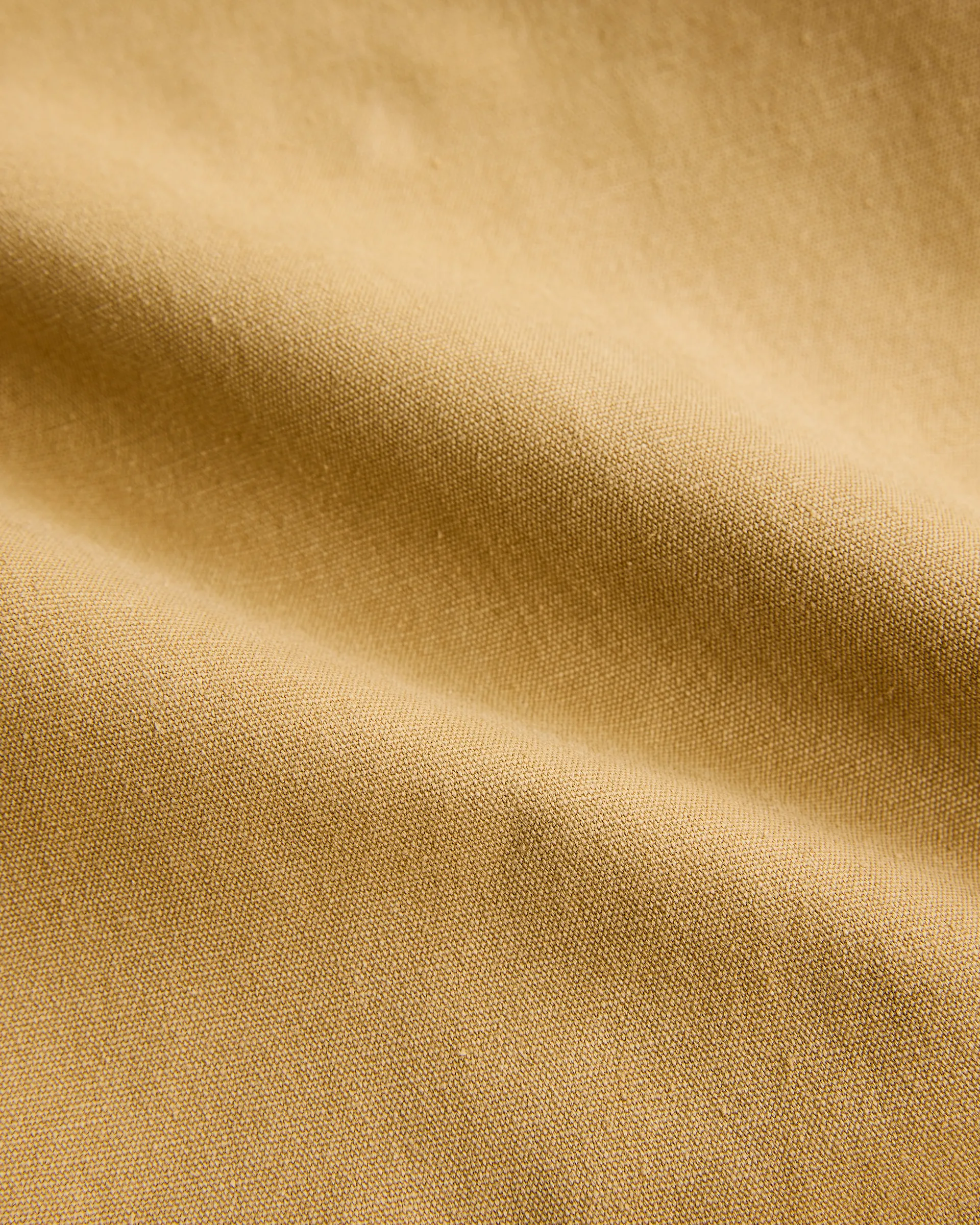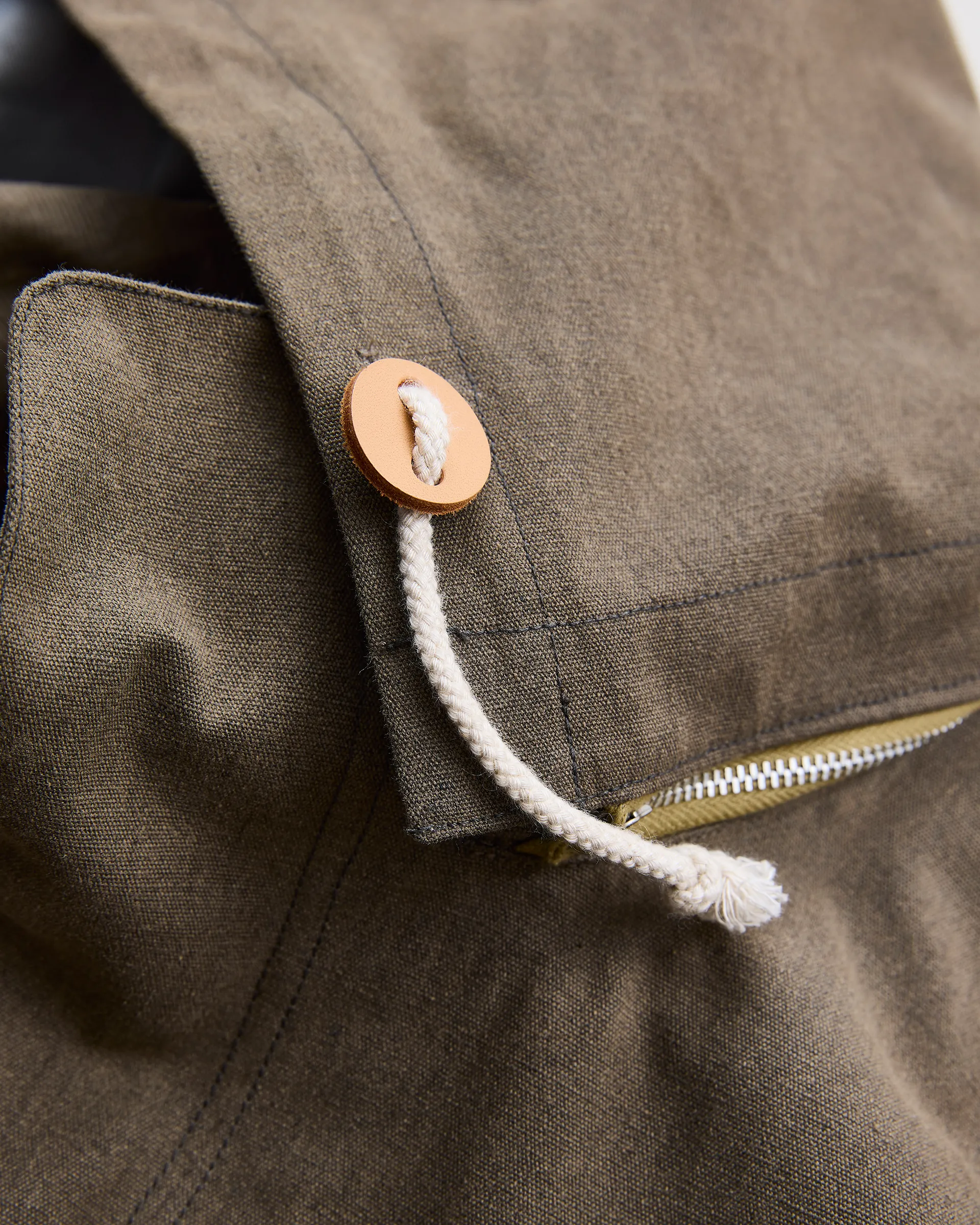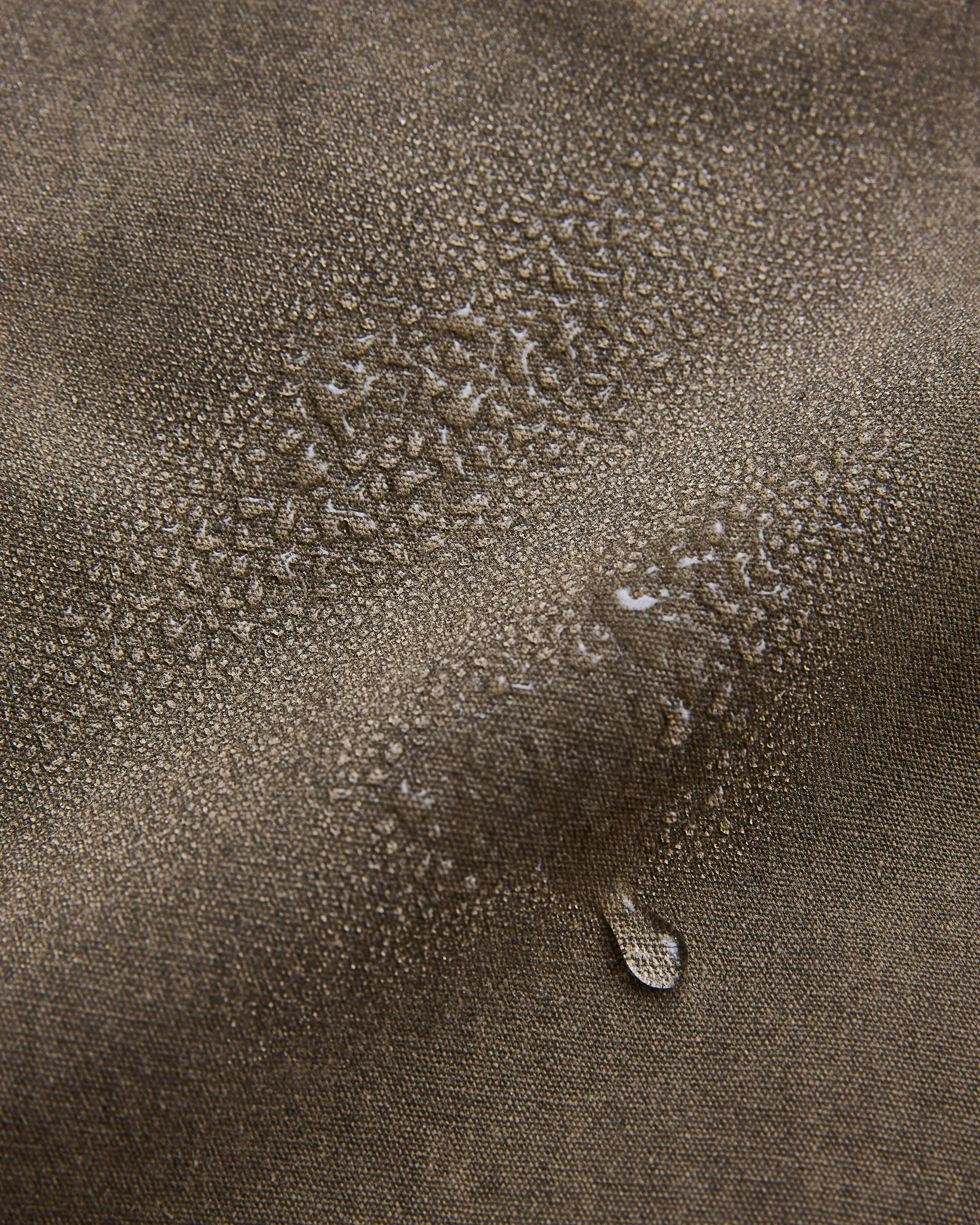 硫化染料で染め上げたコットンダック、中間層に熱可塑性ポリウレタン、裏面にナイロン100%の3層構造生地で製作した3レイヤーフィールドジャケット。型は1970年代のUS・UK・FR各国のフィールドジャケットの要素を織り交ぜたオリジナル。表地にはフェード加工と揉みほぐし加工を加えリアルなヴィンテージ感を演出し、その上から現代的な防水加工を施すことで視覚的な「着古し感」と機能面での「現代性」が同居する新マテリアルを実現。軽量でしなやかながら防水・防風性に優れ、表面のクラシカルな佇まいに反し裏面には止水テープが施された一着です。