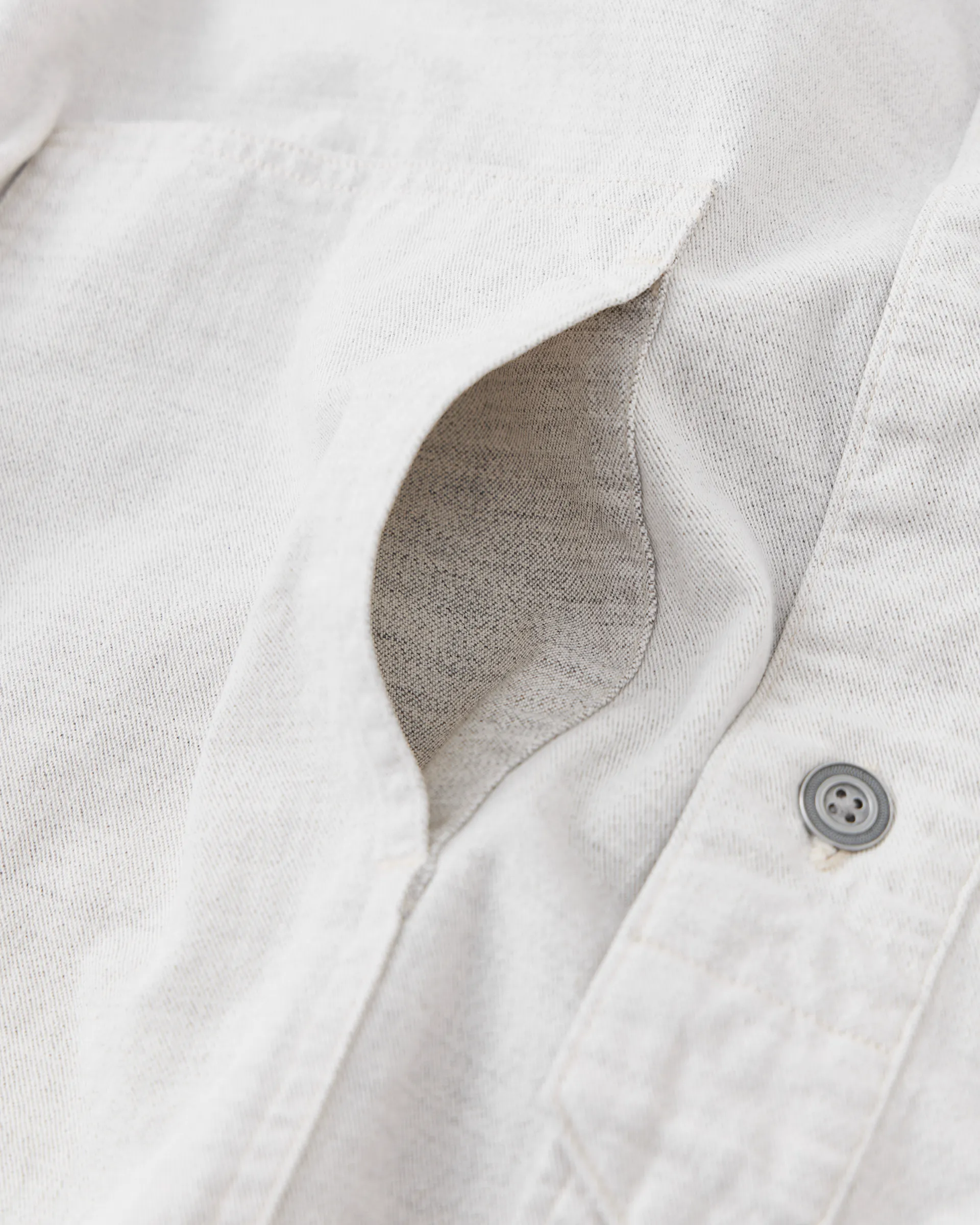 古着のエプロンから着想を得てリプロダクトした、生成×グレー杢のスノーデニムで制作したジャケット。1920〜30年代の米国陸軍のデニムプルオーバーをベースに、フロントやポケットの仕様をアップデートし、ブルゾンのように羽織れるシルエットに仕上げました。しっかりと綾目が立つ生地は、織りの隙間からグレー糸が覗くことで、遠目にはオートミールのようなニュアンスを醸し出します。