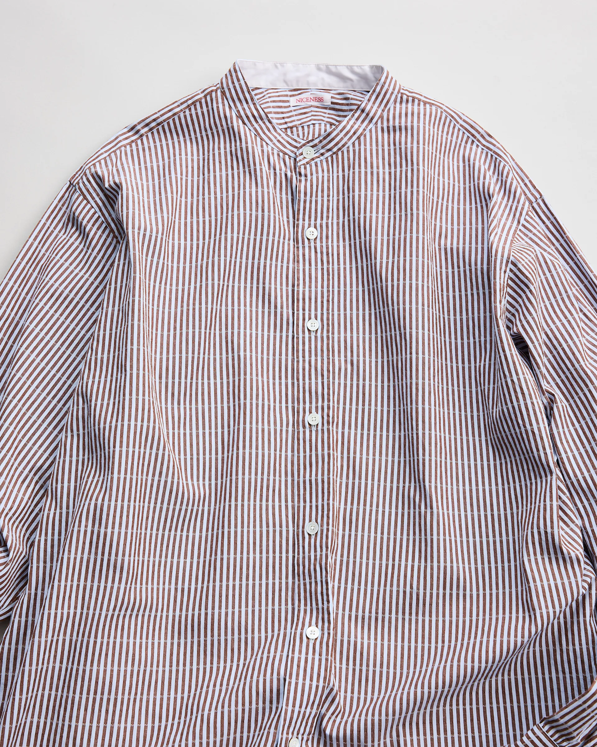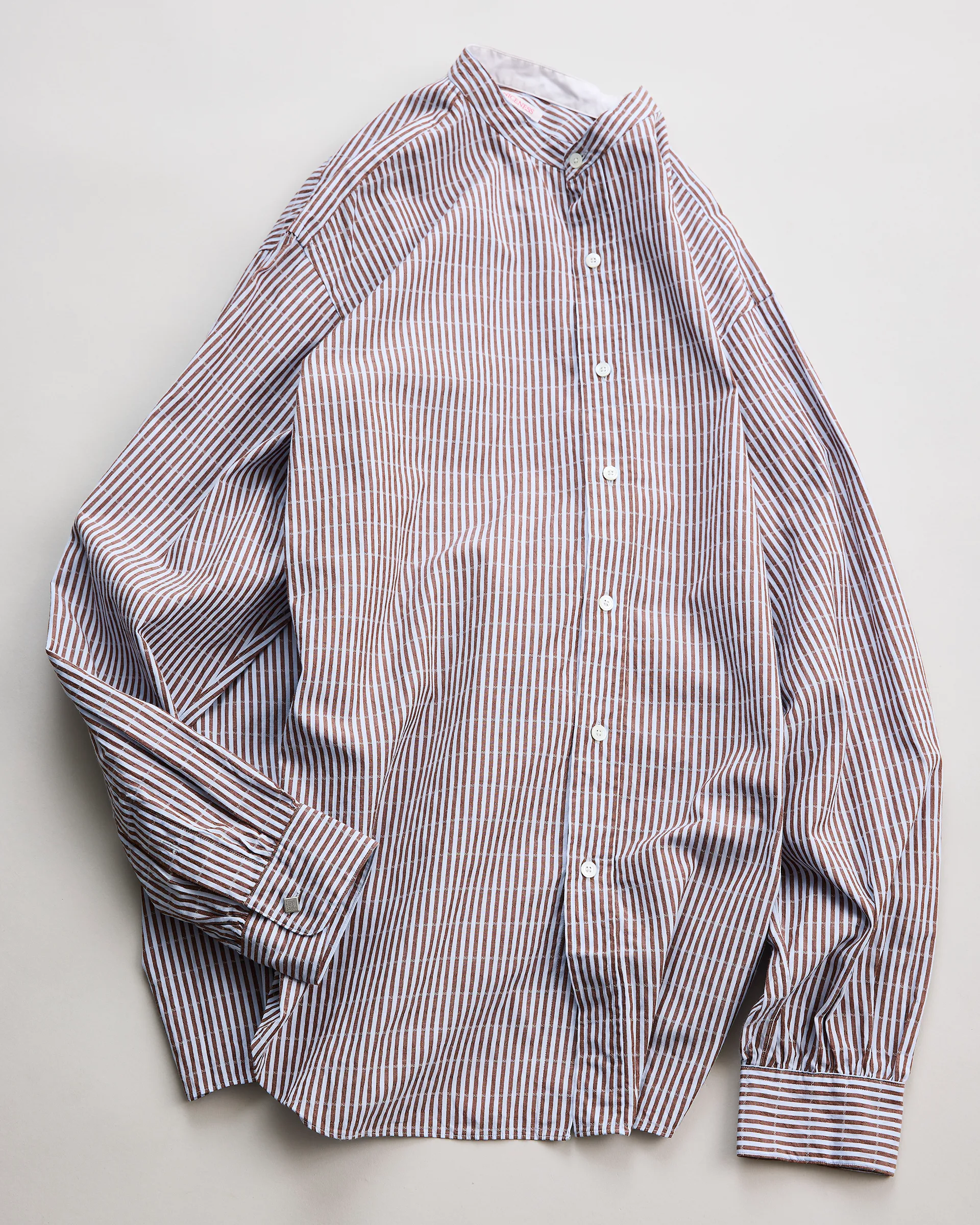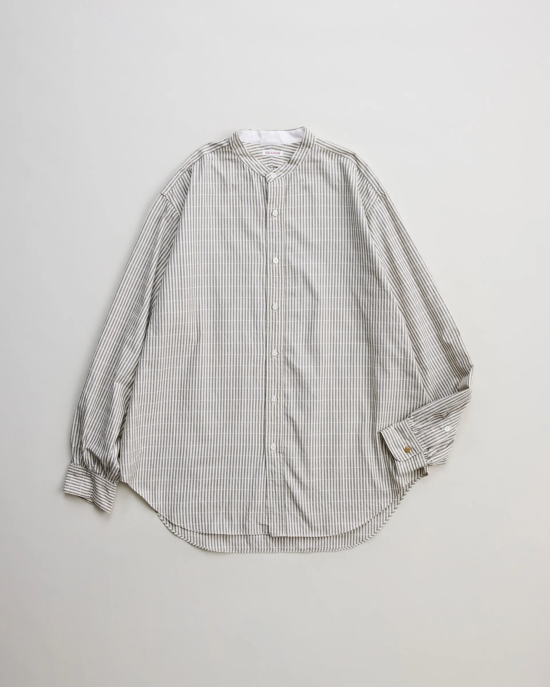 超長綿を用いてドビー織機で「N」柄を表現したビスポークのブロード生地で仕立てたバンドカラードレスシャツ。高い技術力を誇る日本のドレスシャツ専業工場にて縫製しています。デザインは1970年代のイギリスのシャツ型をベースに、袖や裾まわりにはフランスのドレスシャツの仕様を取り入れたハイブリッドな設計。経年変化による油分の抜けたドライなタッチを目指し、ウォッシュ加工を施しています。