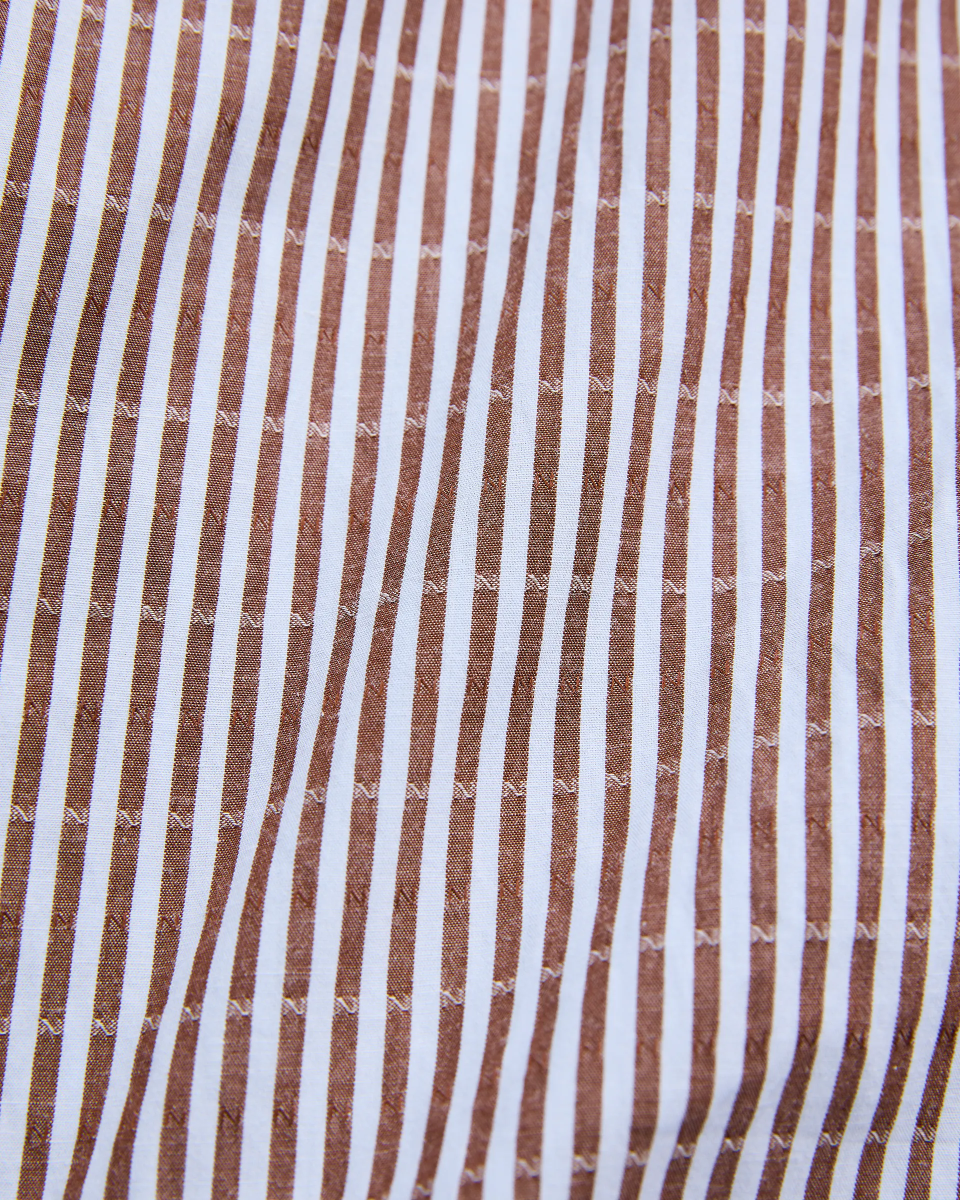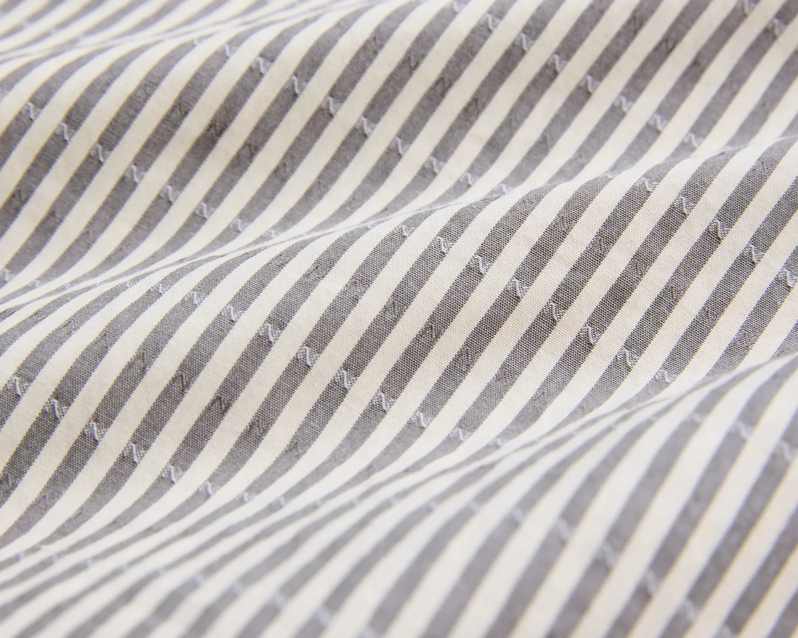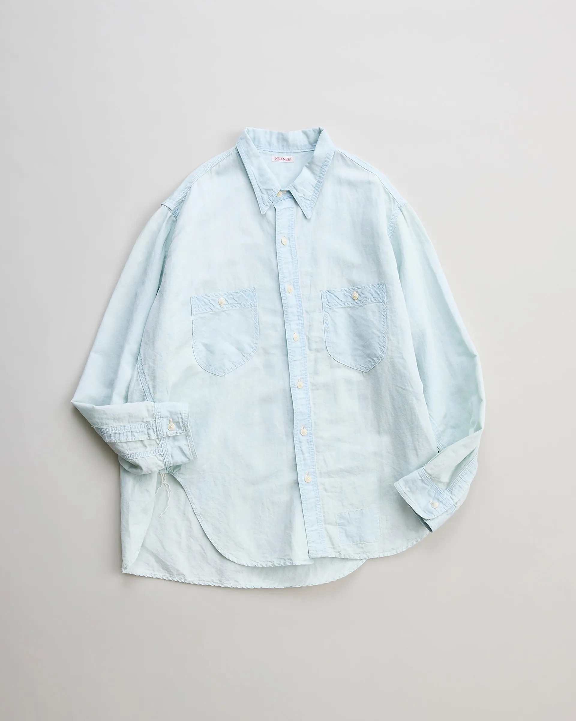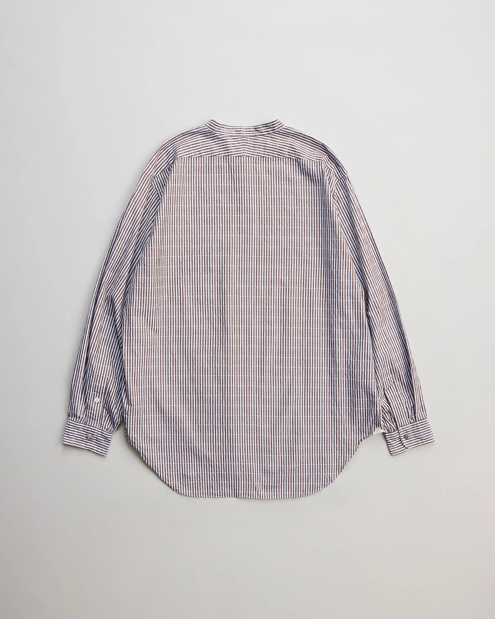 超長綿を用いてドビー織機で「N」柄を表現したビスポークのブロード生地で仕立てたバンドカラードレスシャツ。高い技術力を誇る日本のドレスシャツ専業工場にて縫製しています。デザインは1970年代のイギリスのシャツ型をベースに、袖や裾まわりにはフランスのドレスシャツの仕様を取り入れたハイブリッドな設計。経年変化による油分の抜けたドライなタッチを目指し、ウォッシュ加工を施しています。
