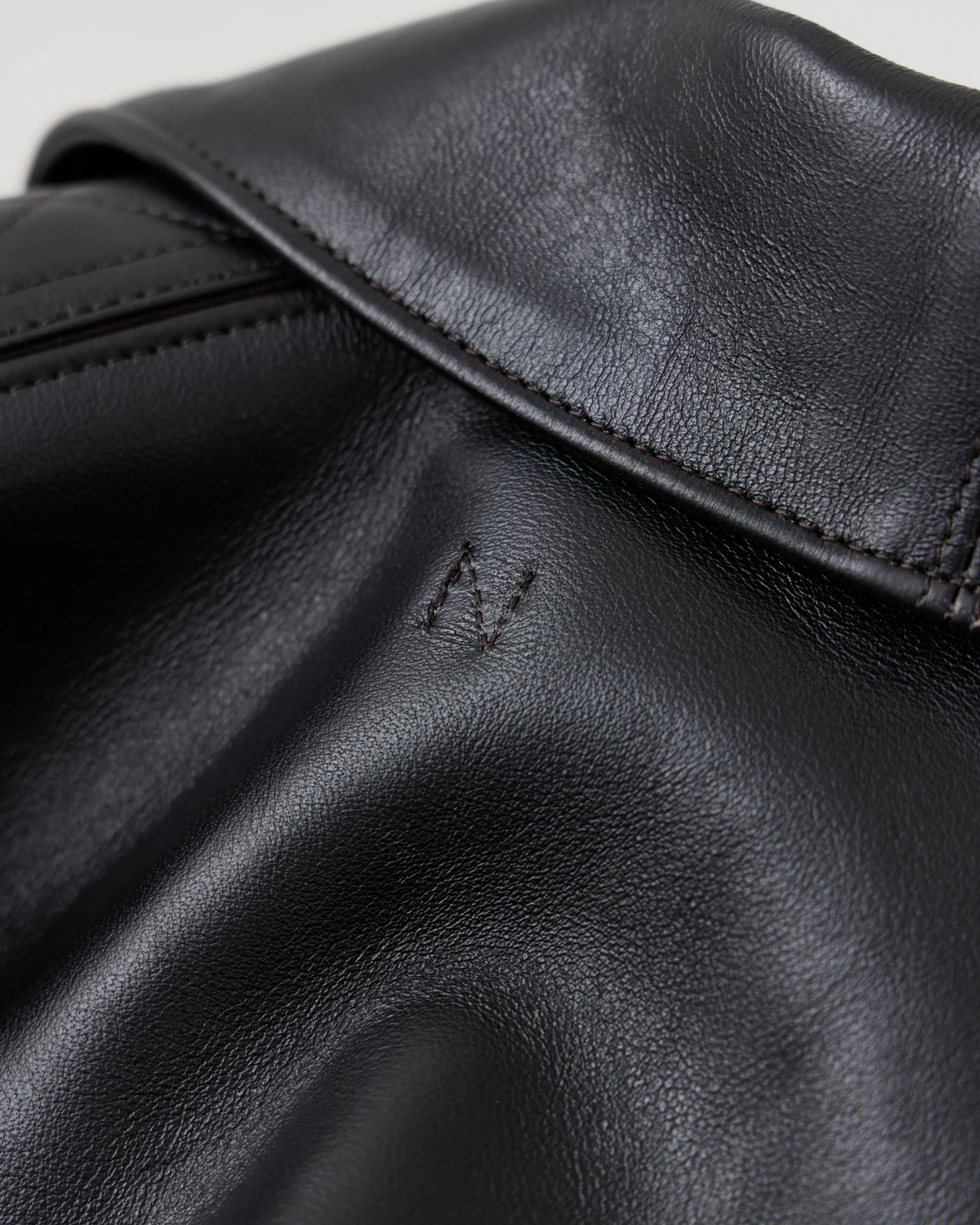イギリスから取り寄せた茶芯のラムレザーで製作したA2ジャケット。デザインは1930〜40年代のUSAFジャケットやアヴィエータージャケットをリファレンスとし、パターンはデニムジャケットの構成を取り入れています。ラムレザーは、タンニンで鞣した下地に対し、染色工程でも再度タンニンを加えることで、適度なハリのあるしっかりとした質感に仕上げています。茶芯のレザーの表面を黒の顔料で仕上げており、着用を重ねることで下地の茶色が表れ、ヴィンテージライクな風合いへと変化します。