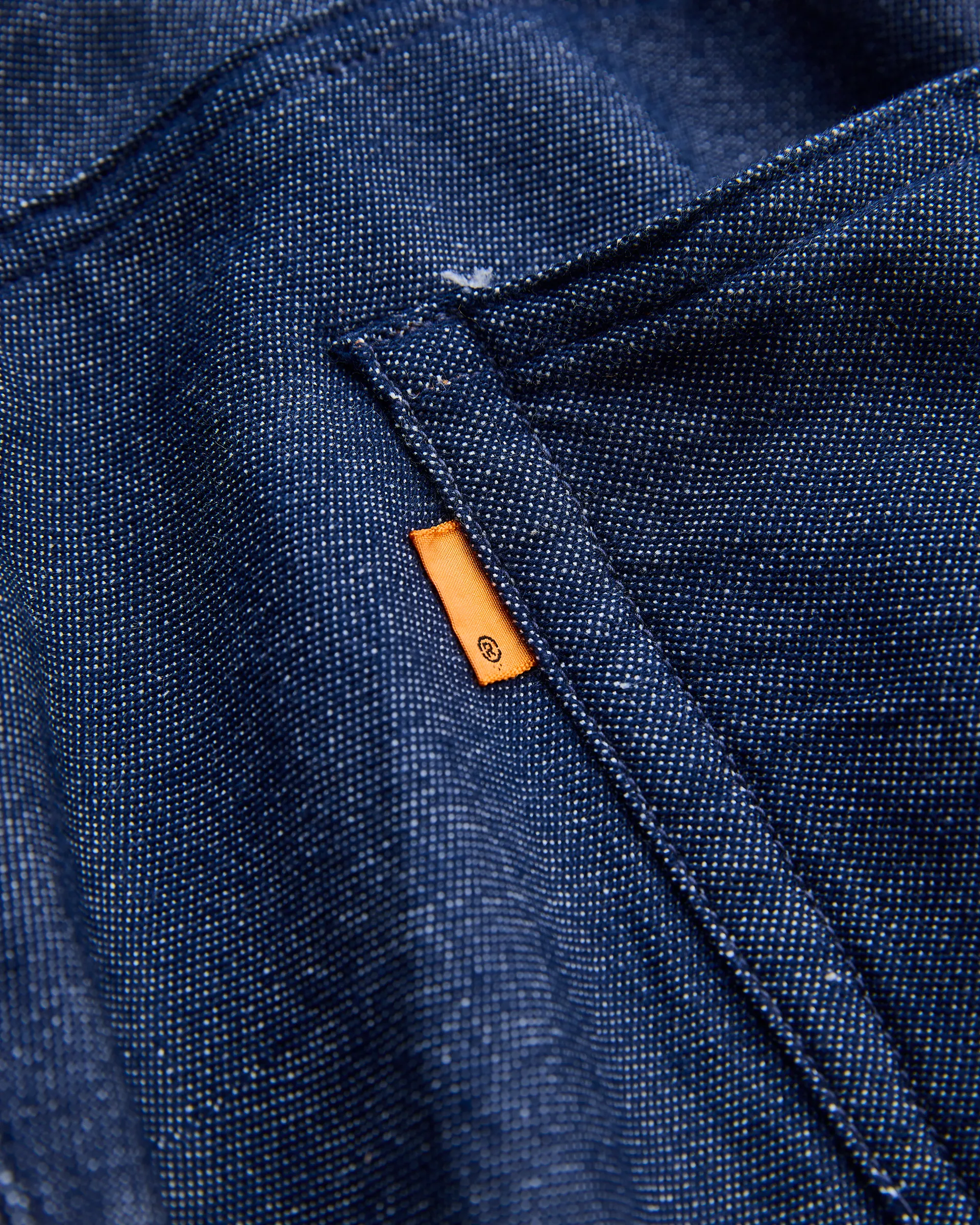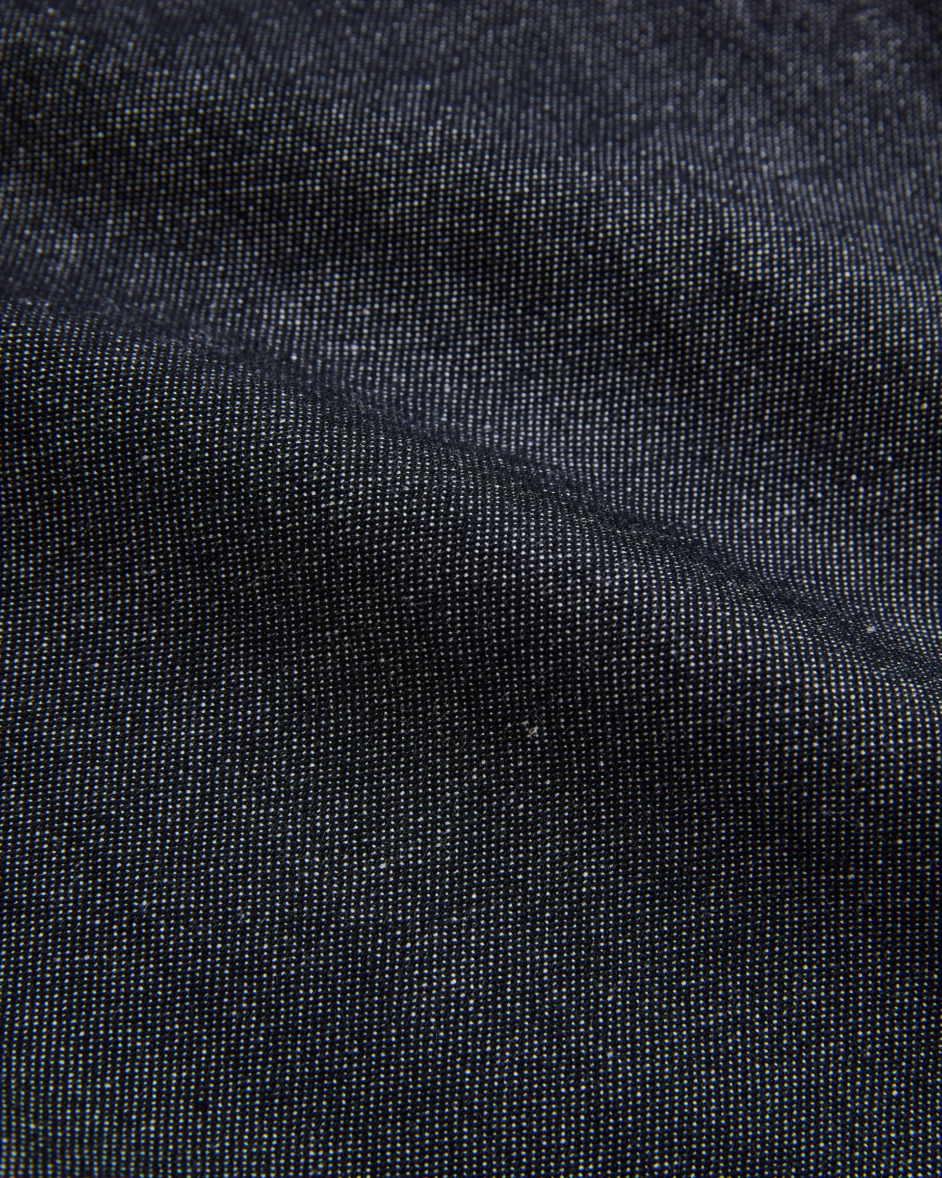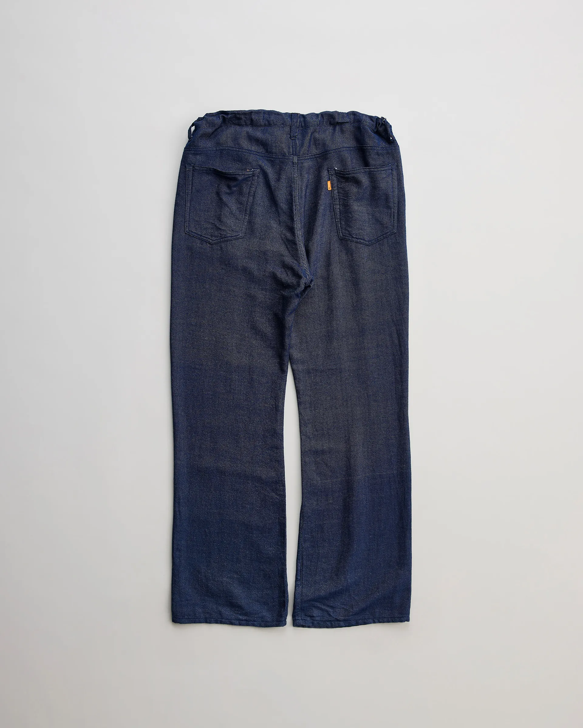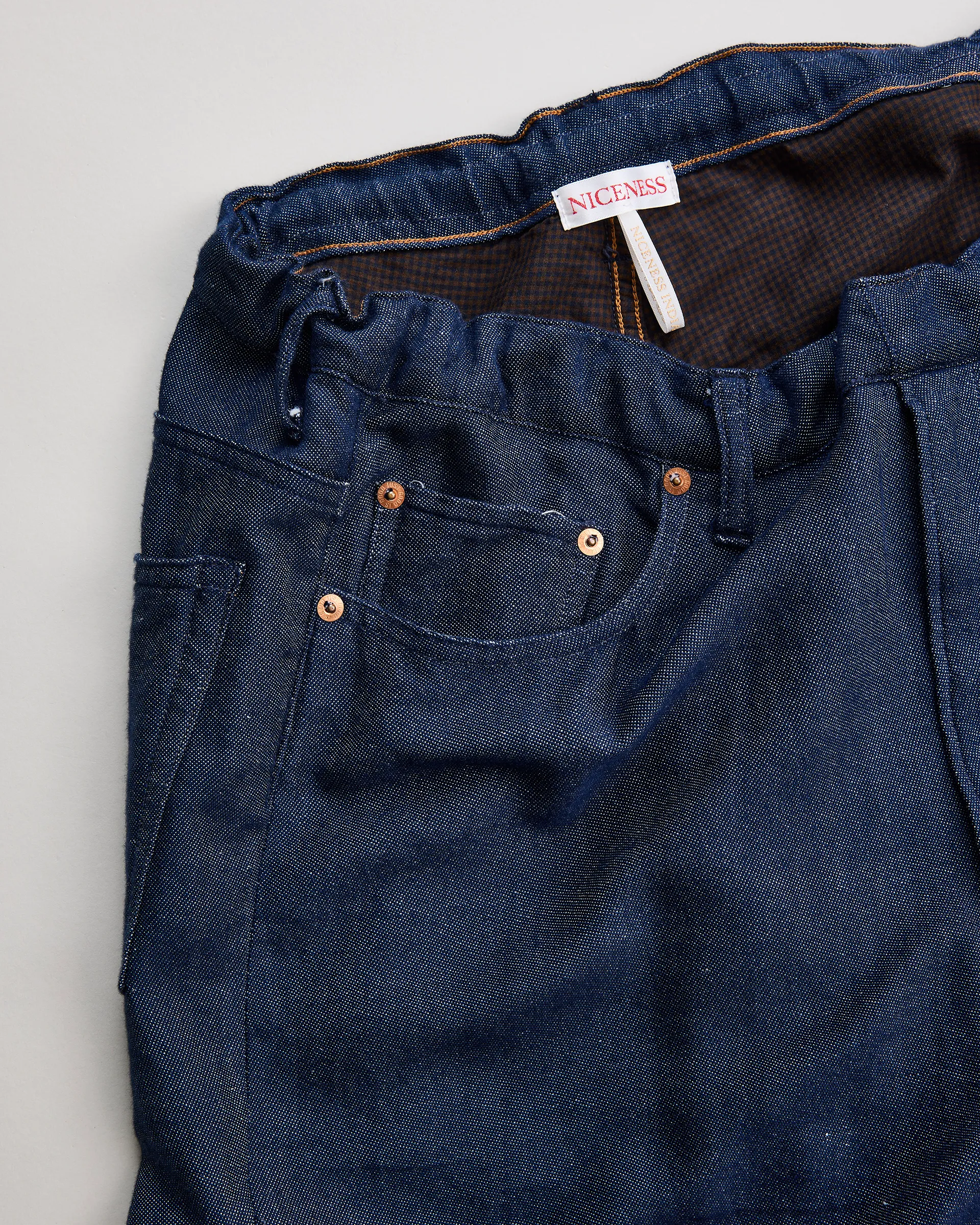 タテ糸に生成りの60番双糸、ヨコ糸に色糸の100番双糸を用いた特殊デニム生地で製作したイージーパンツ。NICENESS初期を想起させる1970年代のセミフレアデニムをリファレンスとして現代的にモディファイ。インド北部アムリッツァーのストール工場で織られた生地は空気を含んだような軽さと、しなやかで柔らかな手触りが特長。構築的でありながらリラックス感があり、シルエットは緩やかなフレアを描きながら上品な落ち感。懐かしさと新しさが静かに共存する時代を超えて育てる一本です。
