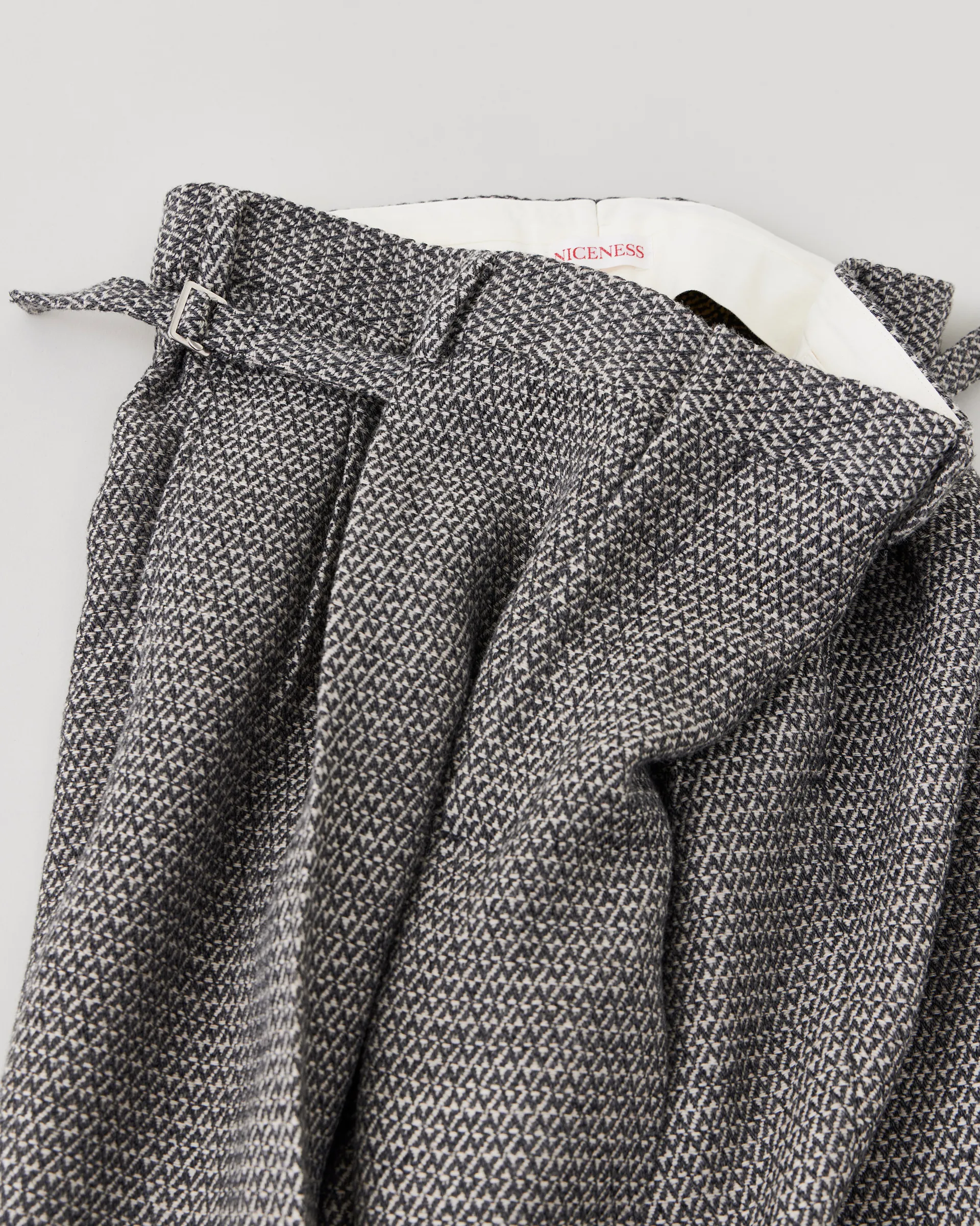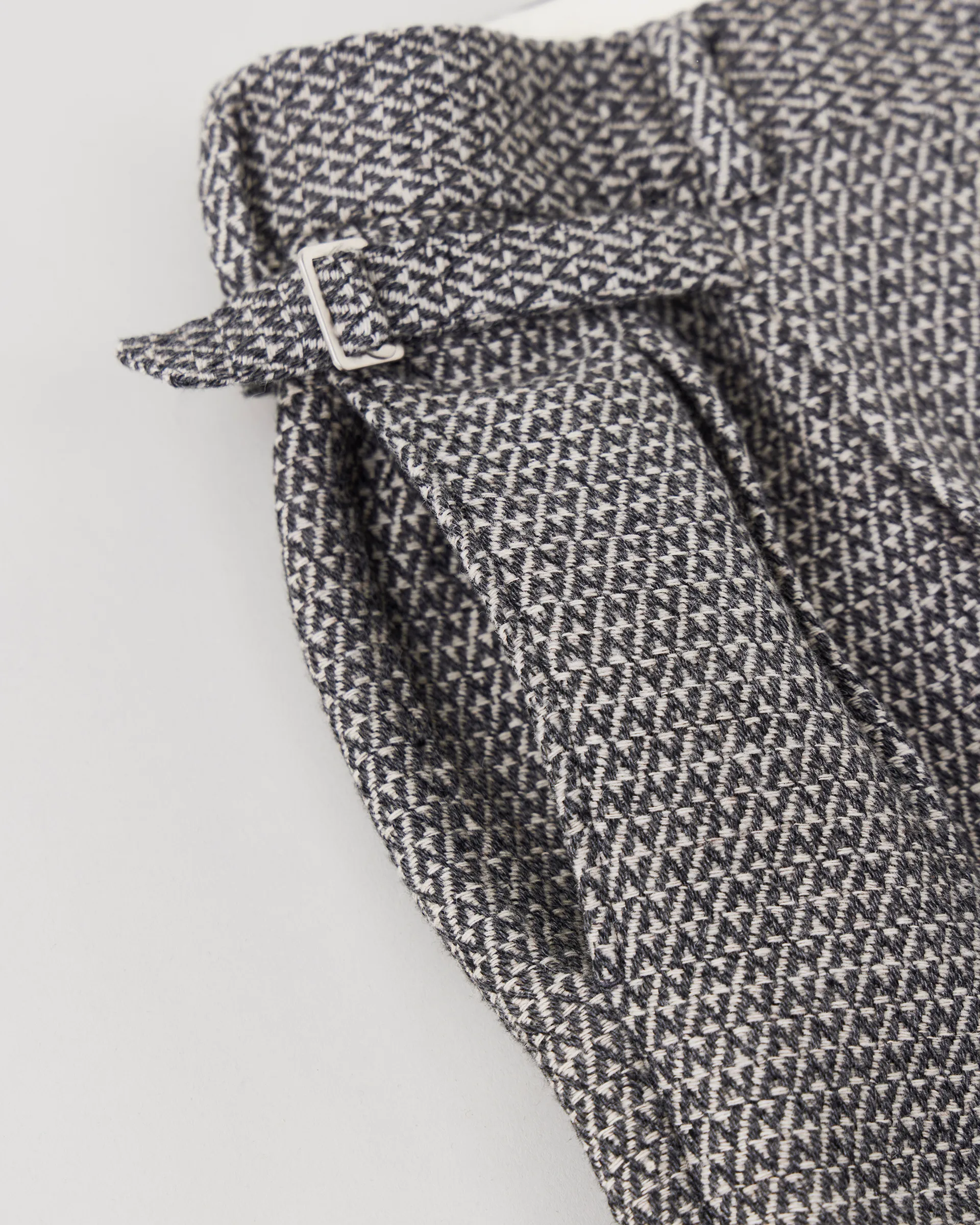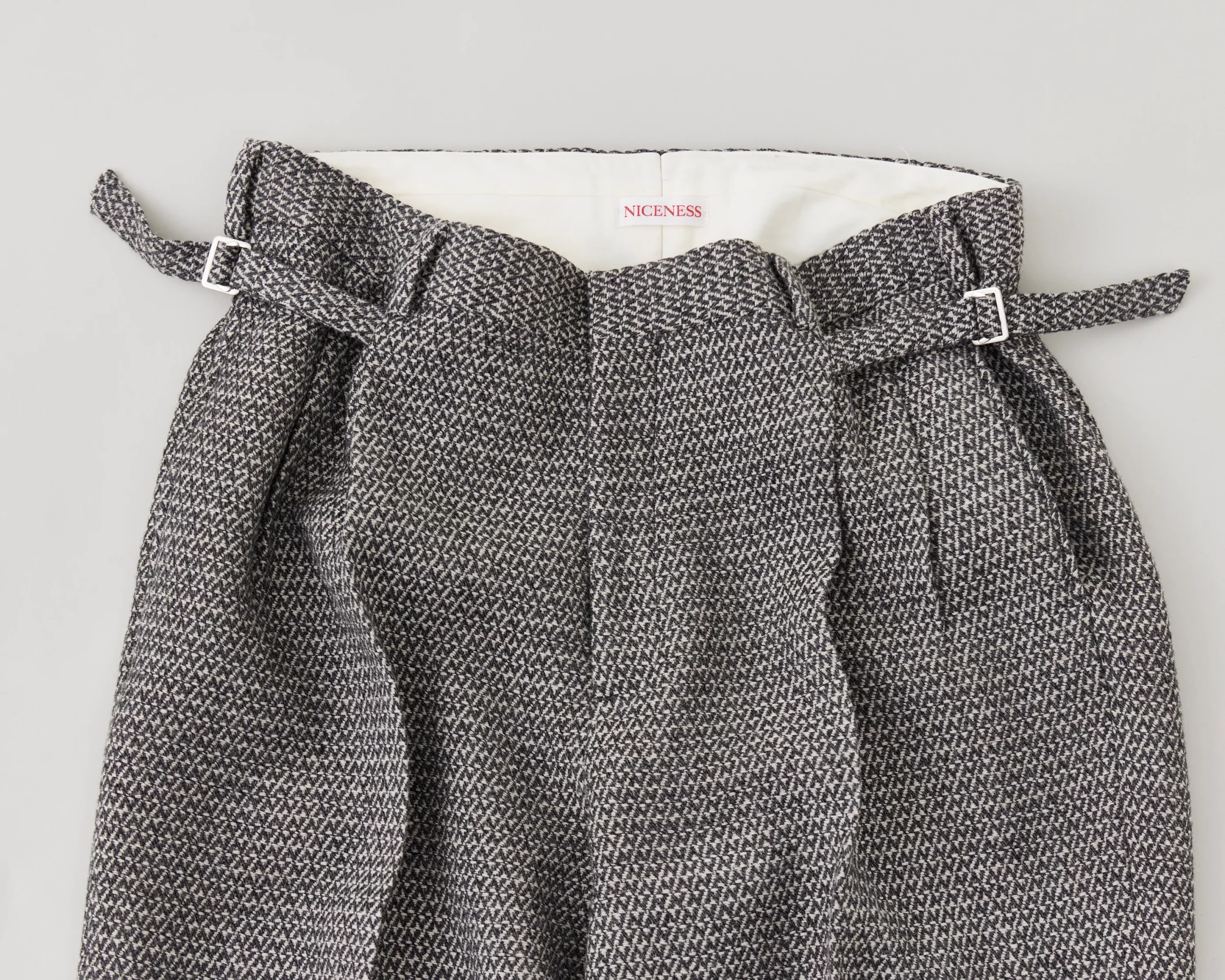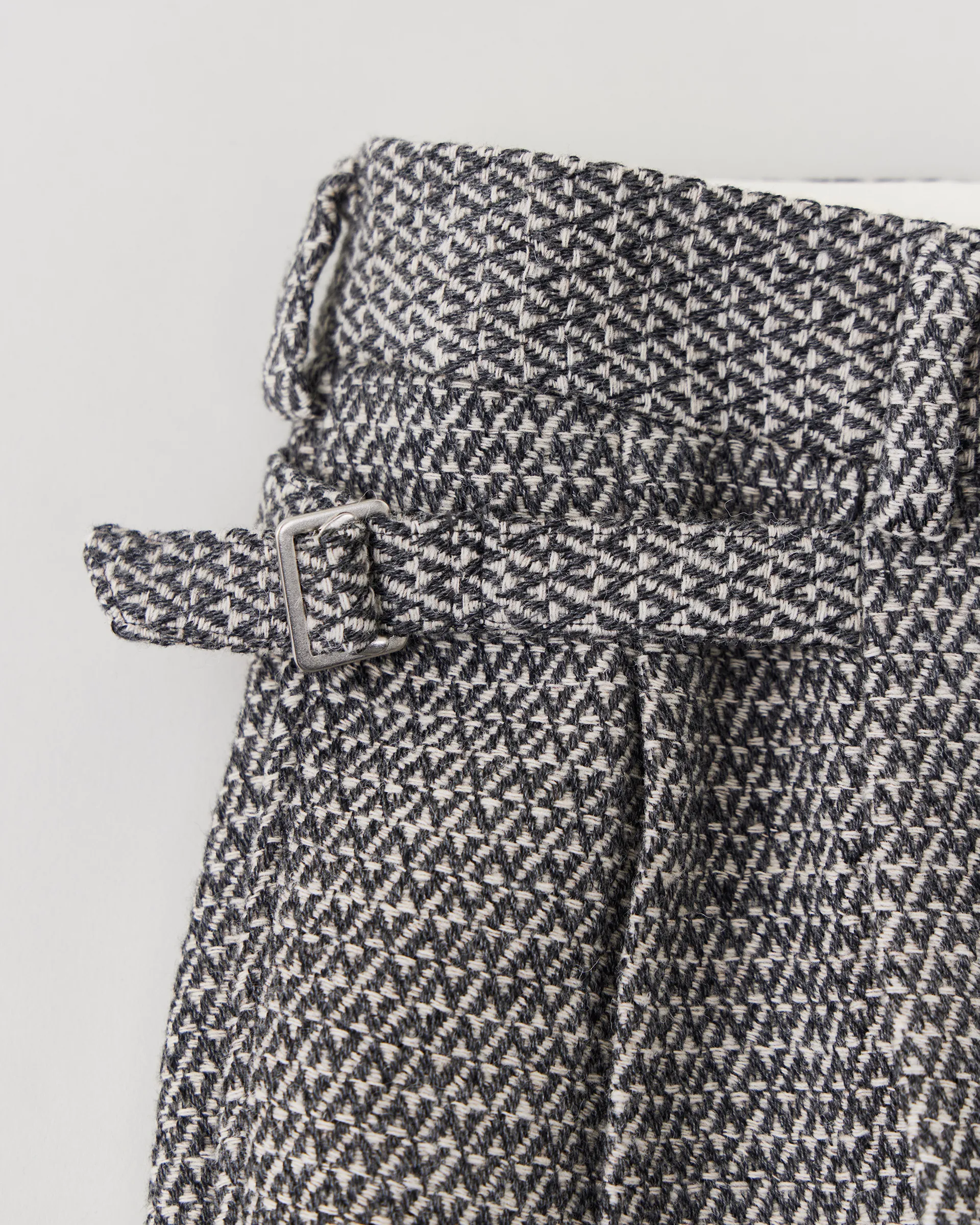 コットンとリネンの杢糸にメリノ混シェットランドウール糸で製織したビスポークのツイード生地で仕立てたサイドストラップトラウザー。ドビー織機で「N」を表現し、縮絨加工を施しています。フランスとイタリアのドレストラウザーを参考にクラシカルなハイウエスト設定となっており、1990年代のムードを宿すやや太めのシルエットに再構築。尾錠付きのサイドストラップでウエストサイズをアジャストいただけます。