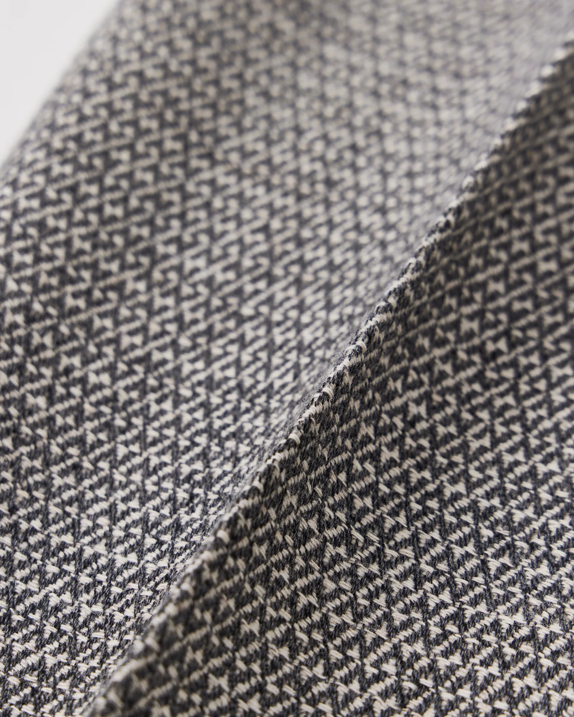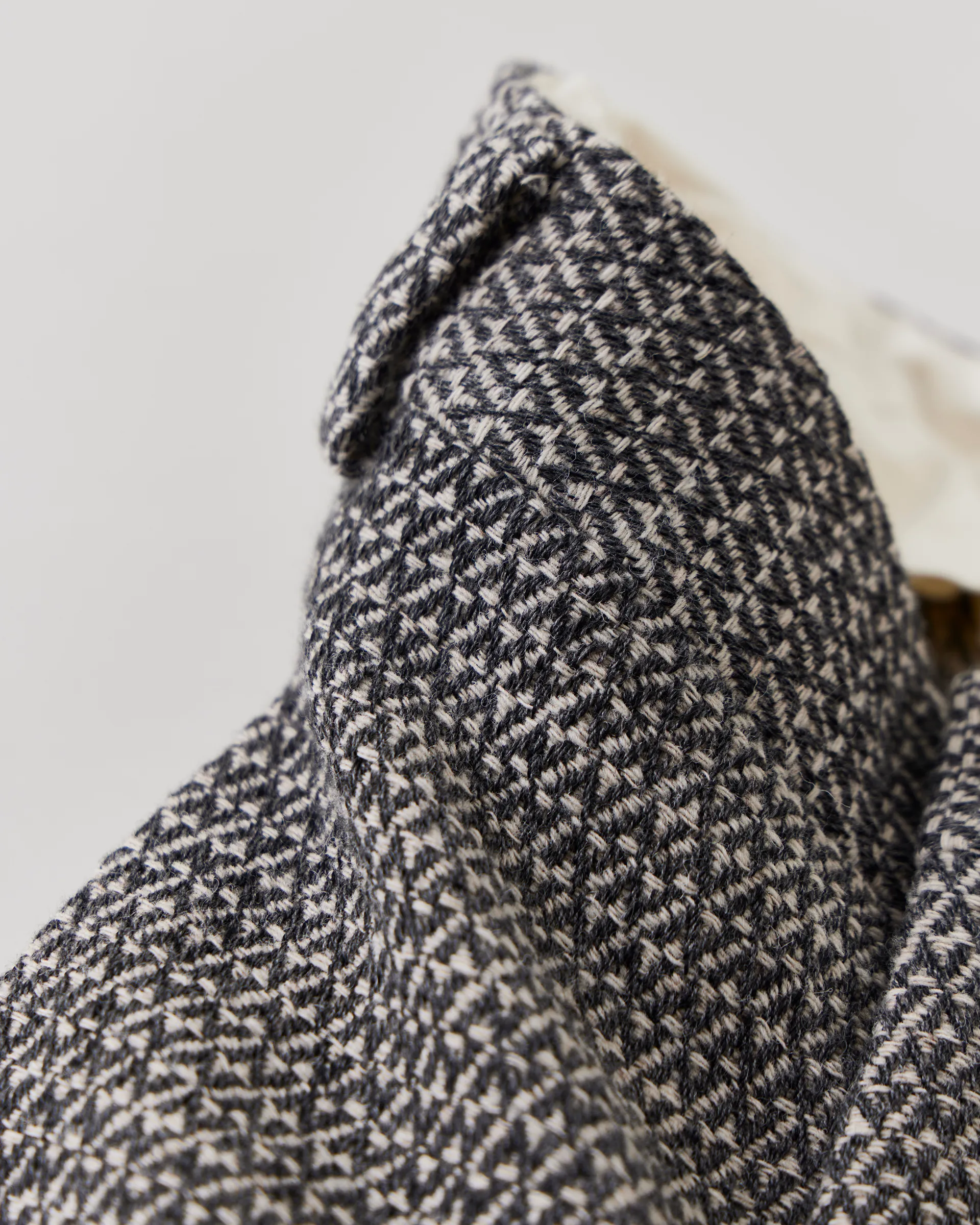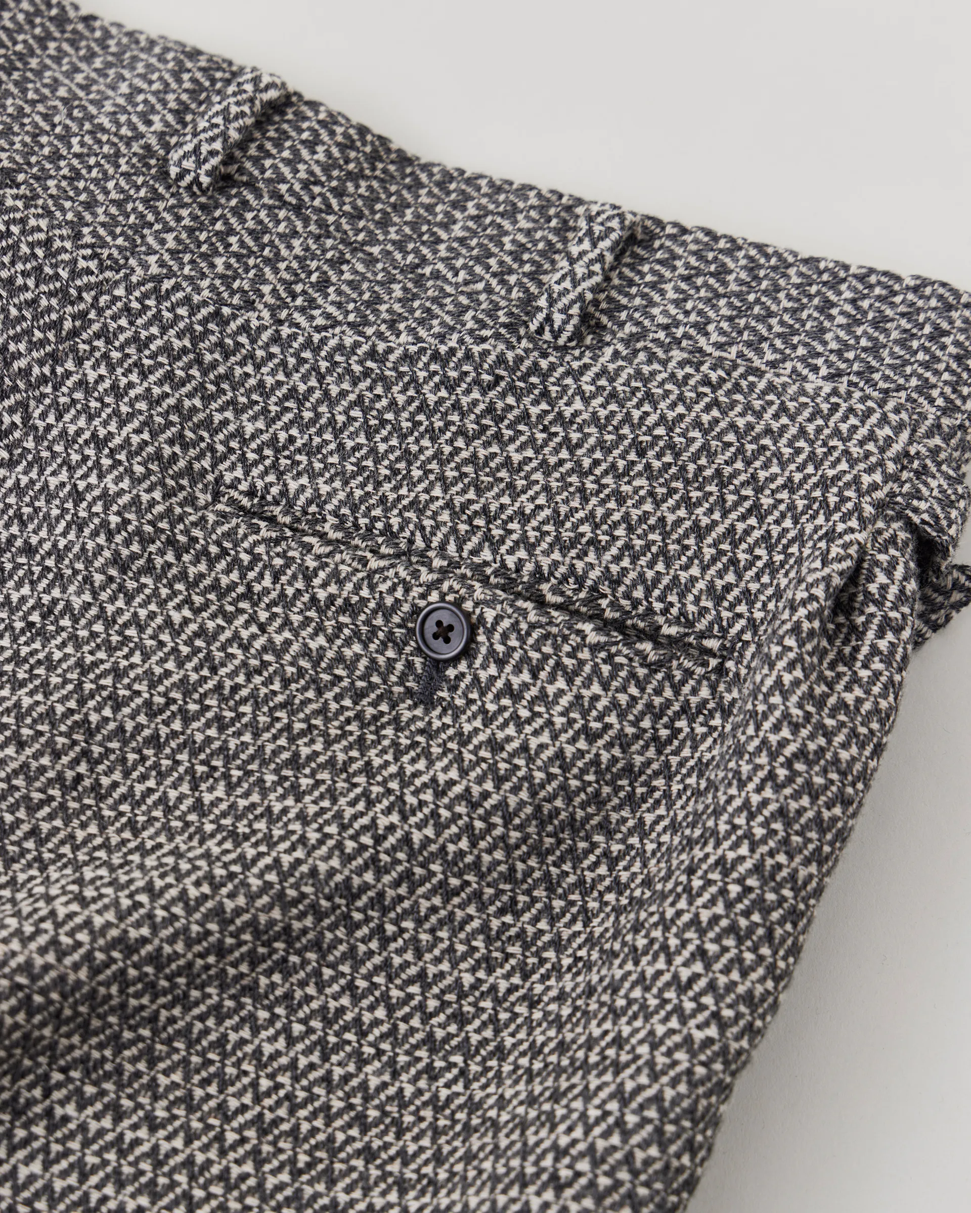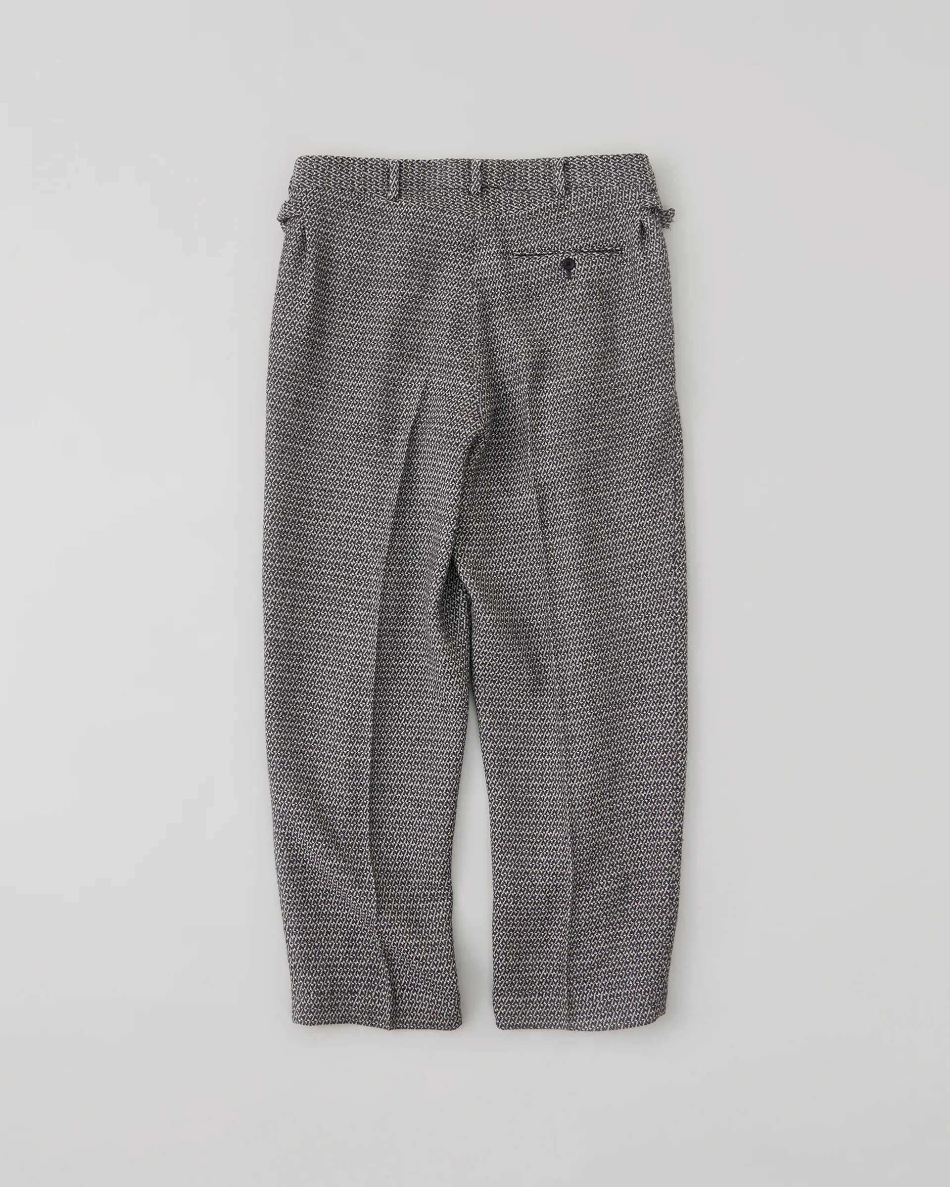 コットンとリネンの杢糸にメリノ混シェットランドウール糸で製織したビスポークのツイード生地で仕立てたサイドストラップトラウザー。ドビー織機で「N」を表現し、縮絨加工を施しています。フランスとイタリアのドレストラウザーを参考にクラシカルなハイウエスト設定となっており、1990年代のムードを宿すやや太めのシルエットに再構築。尾錠付きのサイドストラップでウエストサイズをアジャストいただけます。