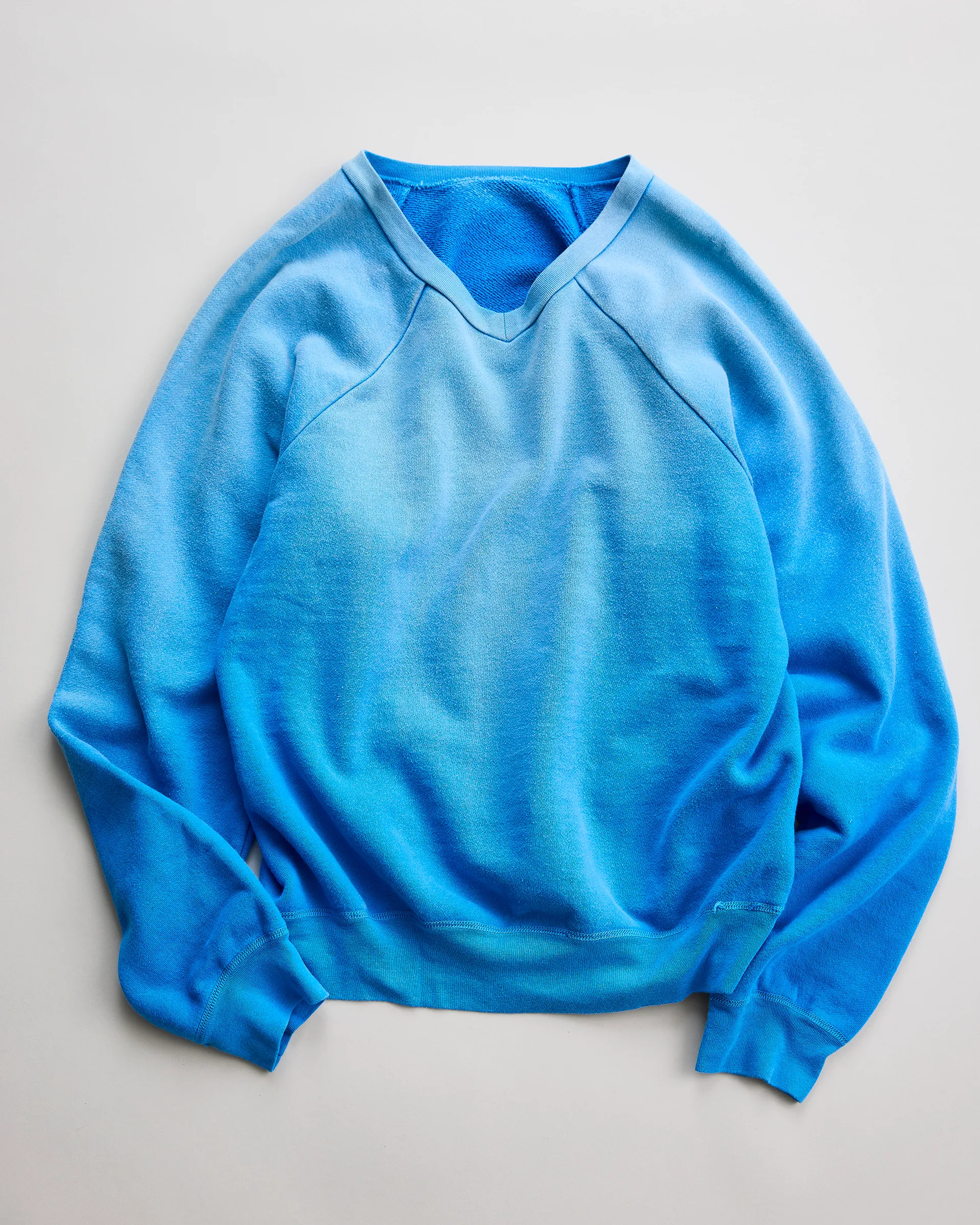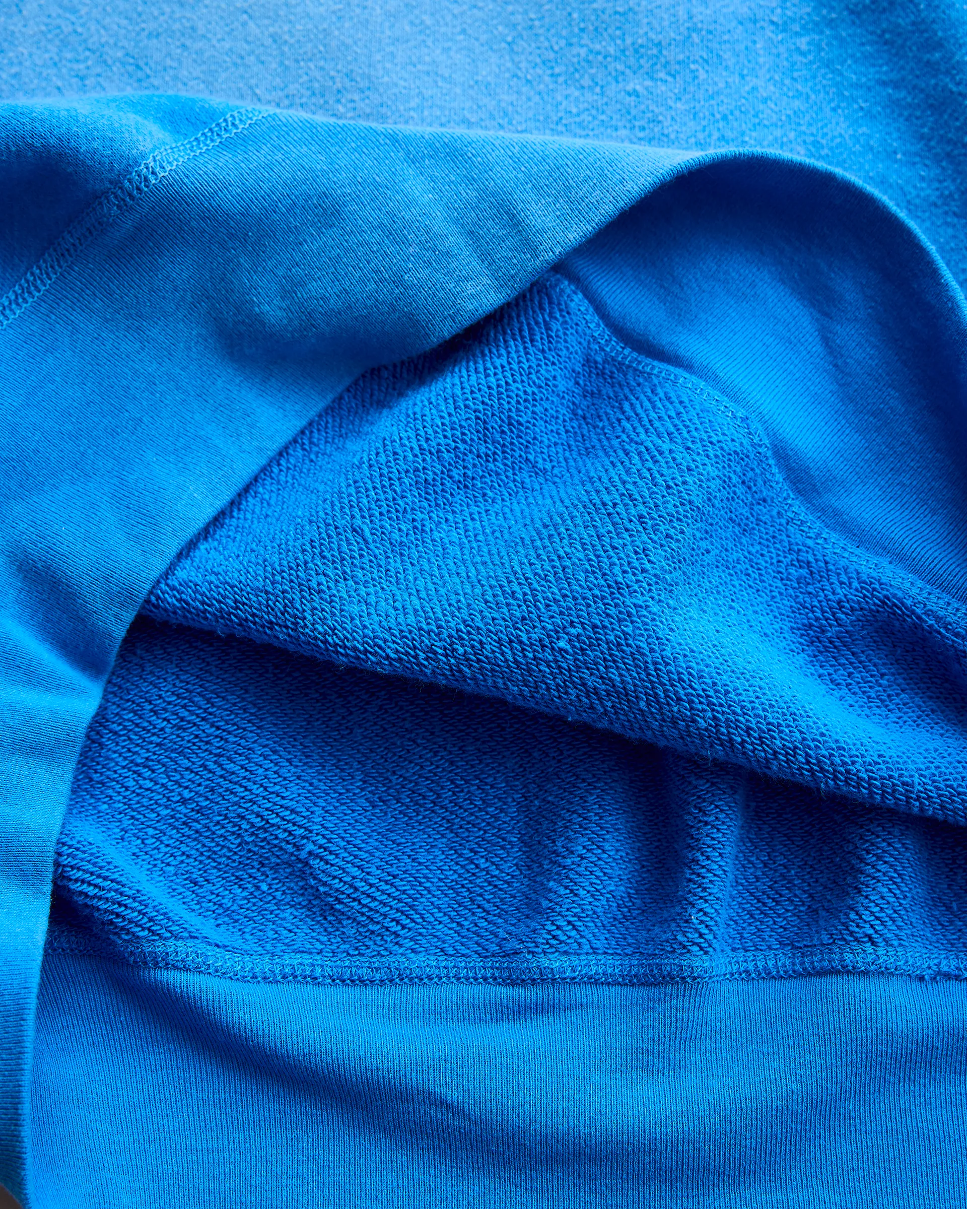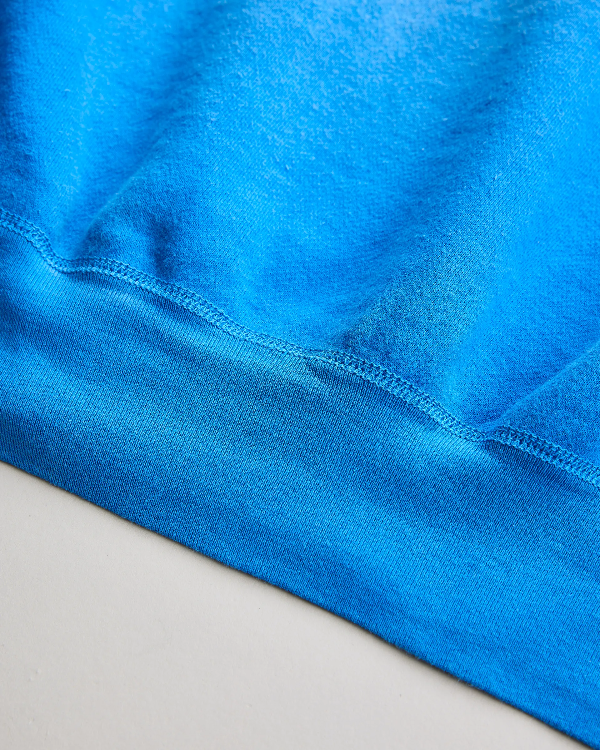 希少な旧式「アズマ編み機」を用いた丸胴のヘビーウェイト裏毛で製作したスウェットプルオーバーダブルフロント。型は1950年代〜60年代のヴィンテージスウェットをリファレンスとし、Vネックとクルーネックを前後どちらでも選べるダブルフロント仕様。ラグランスリーブや自然に斜行する縫製仕様でヴィンテージの空気感を再現しています。生地は空気を含んだふっくらとした質感と柔らかさ、肌馴染みの良さが魅力。職人によるエイジング加工を施し、時間を経たような奥行きと立体感を演出しています。