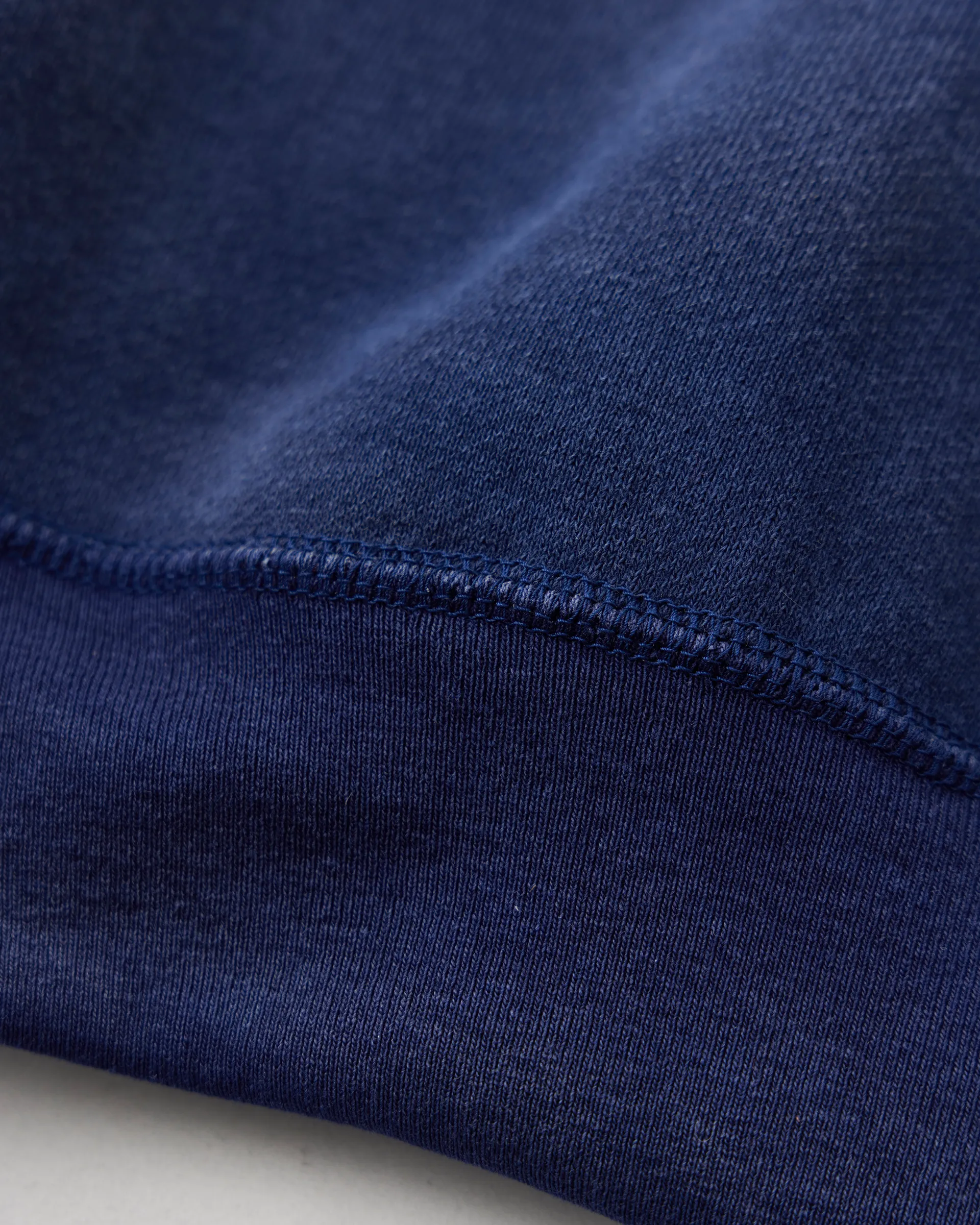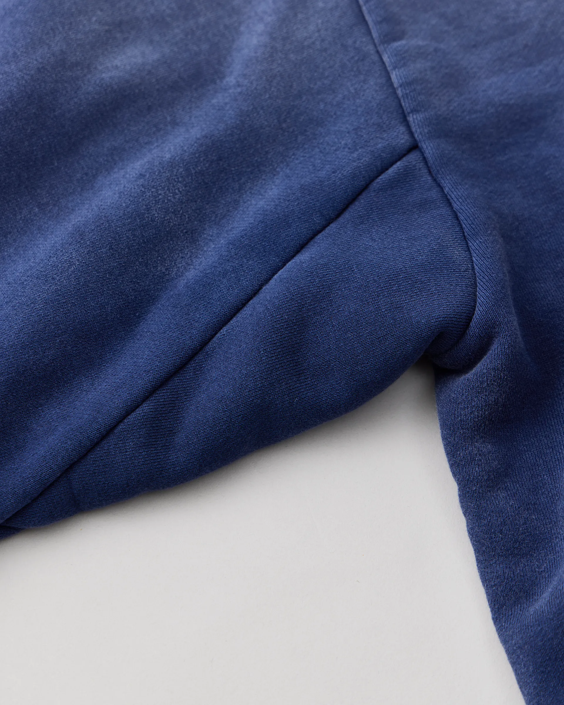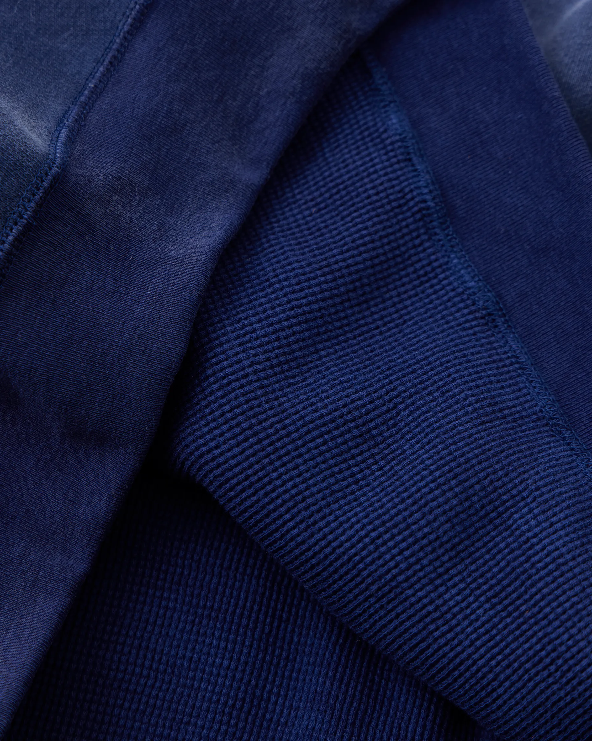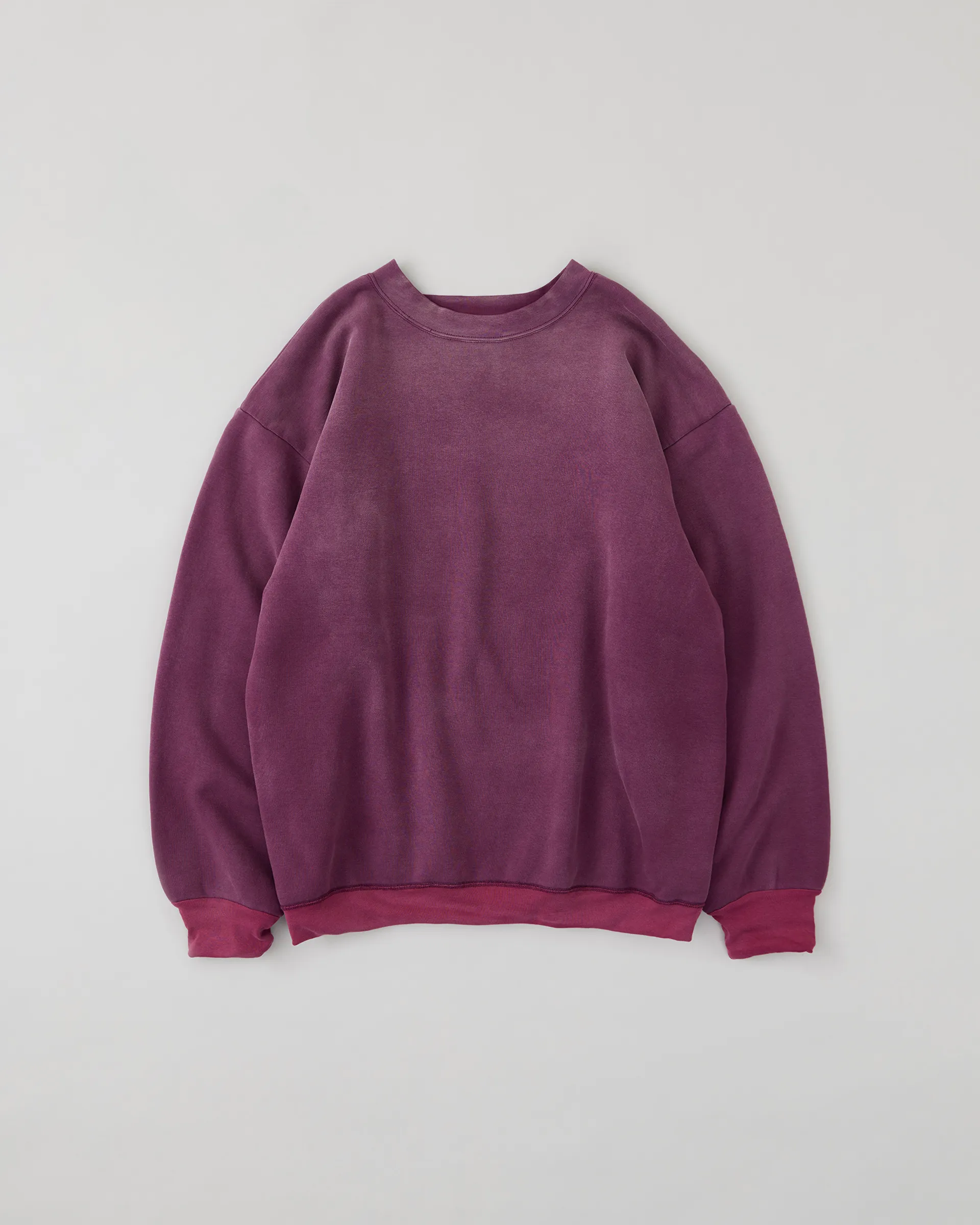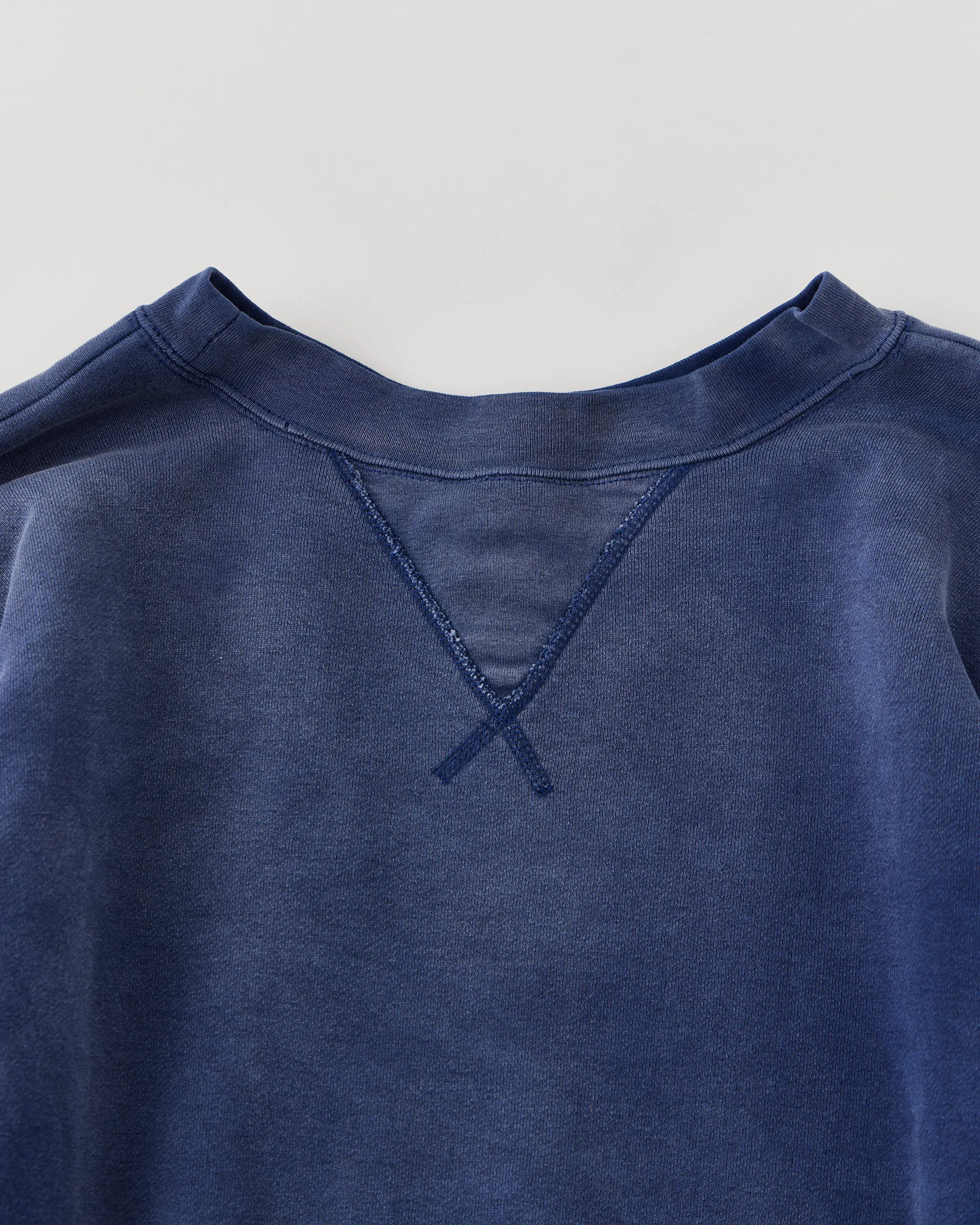 希少な旧式編み機「アズマ編み機」で編み立てた、ヘビーウェイトの裏毛素材による丸胴のクルーネックスウェット。3種類の異なる編み地を組み合わせ、職人が手作業で丁寧にエイジング加工を施しています。1920〜30年代の肉厚なスウェットシャツと日本の着物から着想を得た袖付けのデザインが特徴です。素材の膨らみと柔らかさに加え、ヴィンテージライクな質感が魅力です。