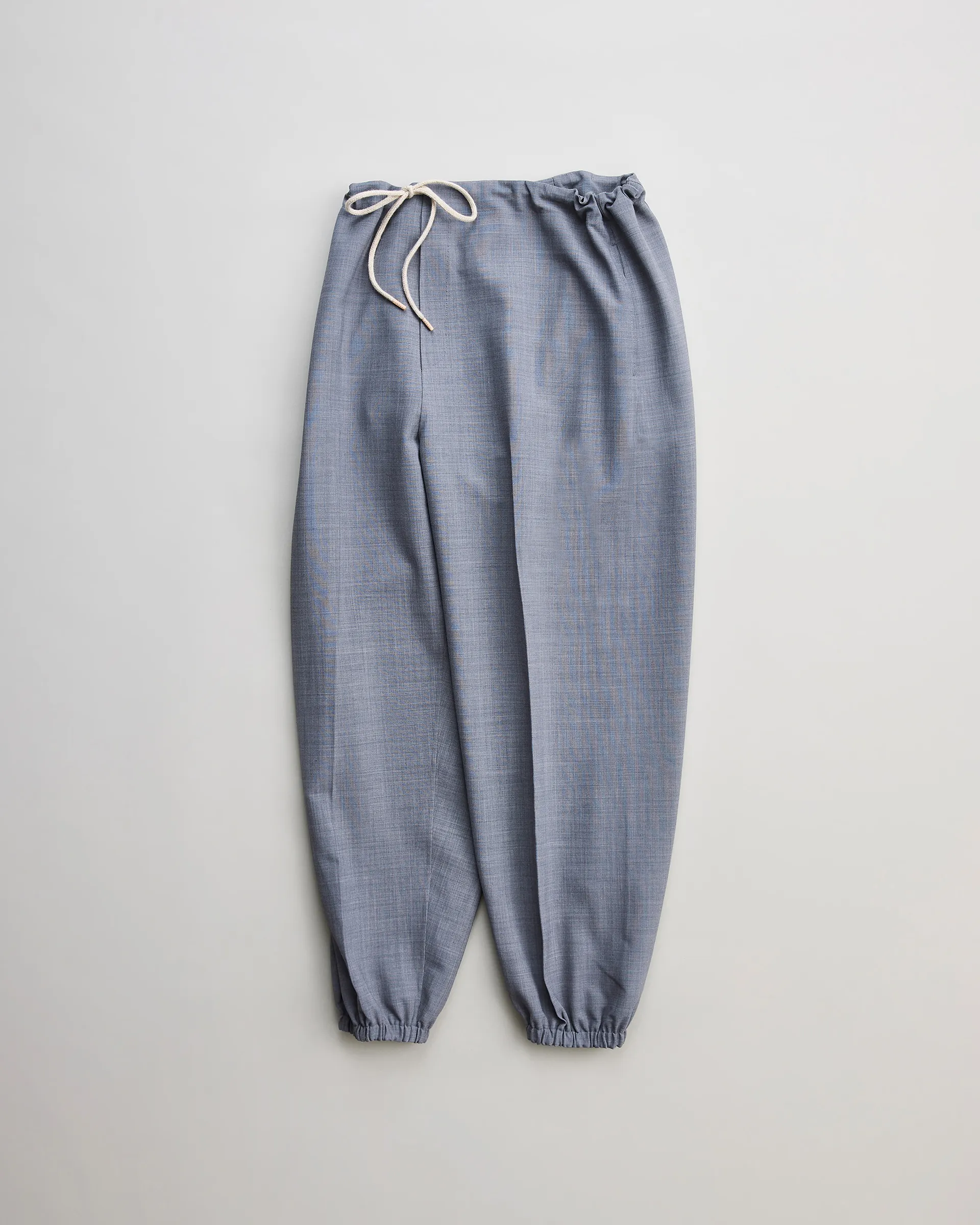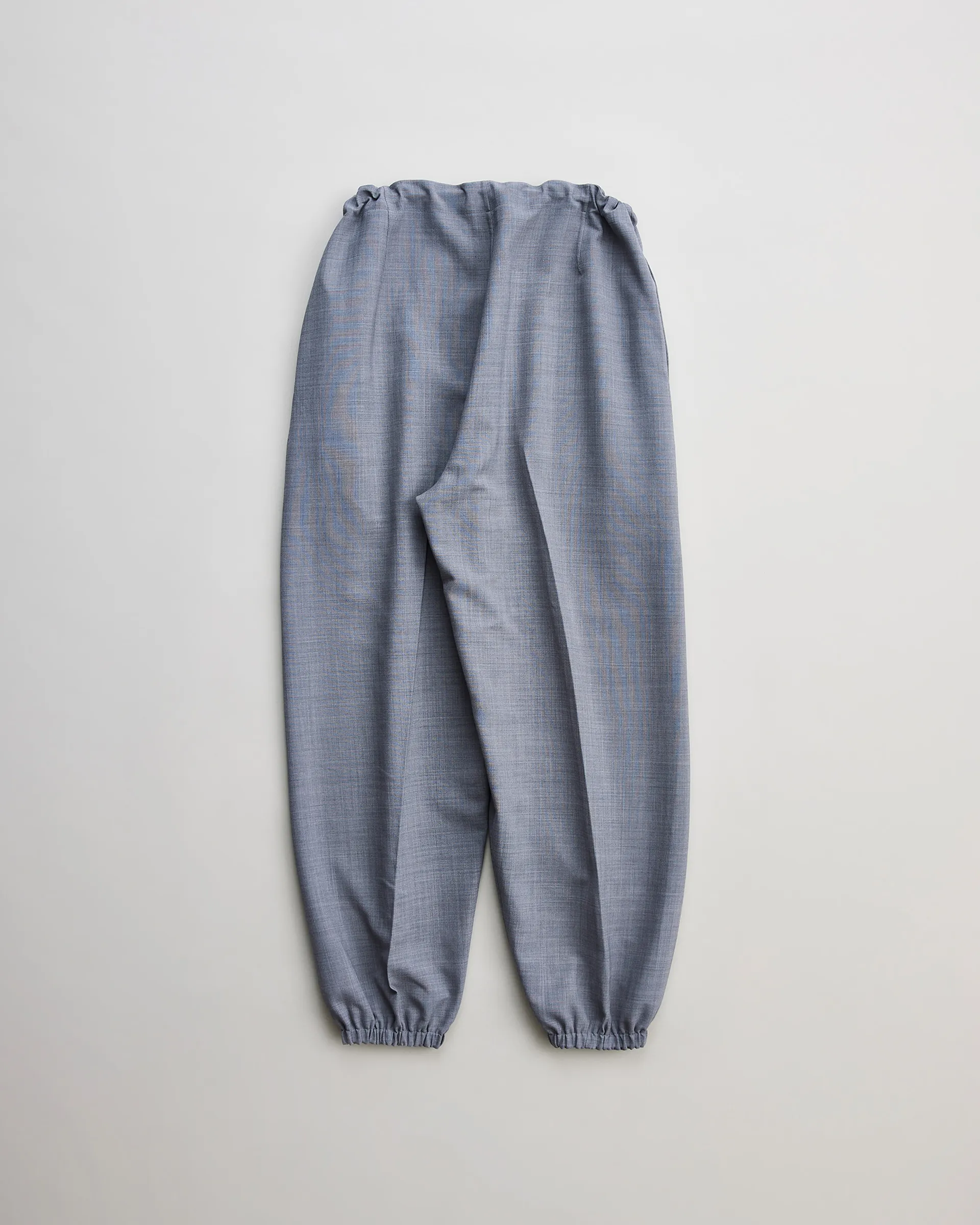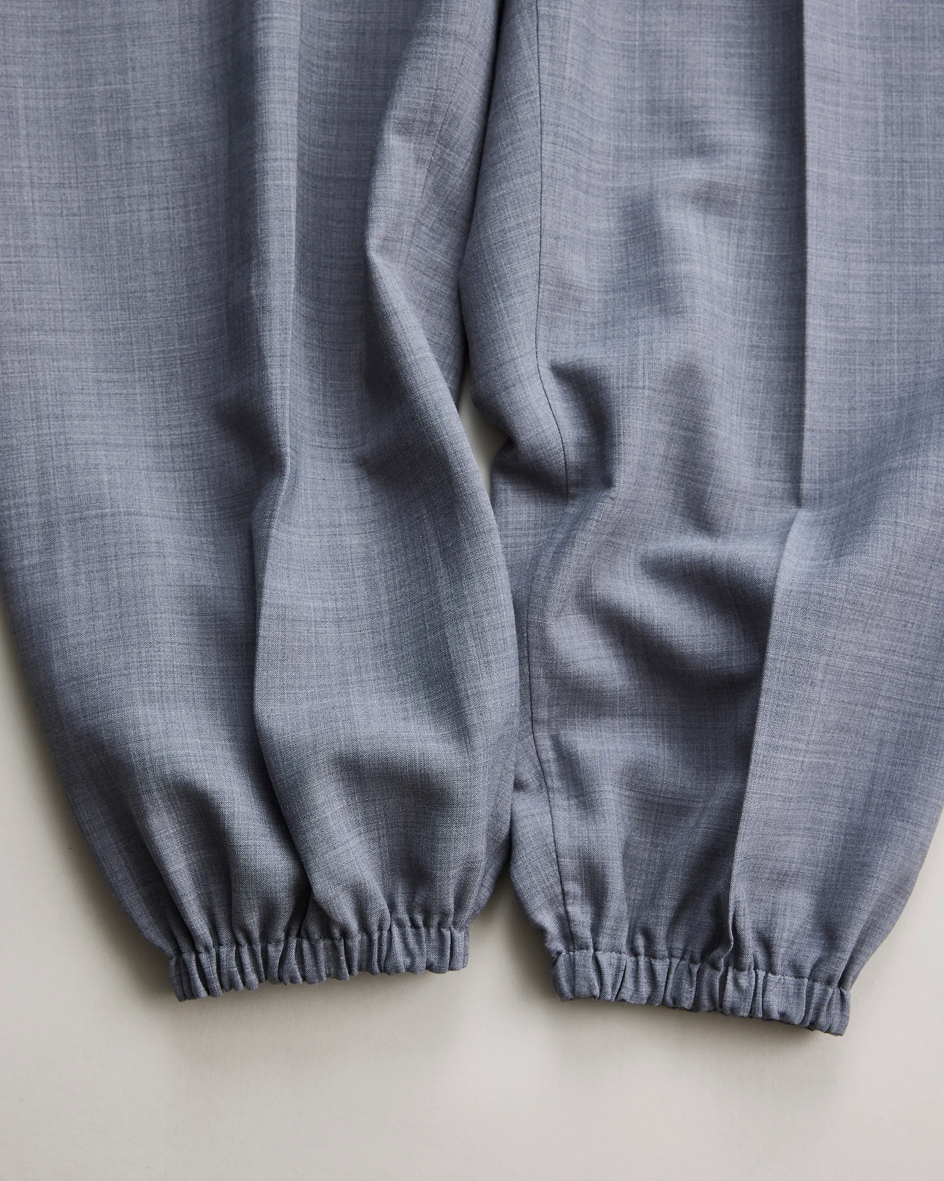 極細サイロスパンポリエステル/ウール糸を平二重織で製織した生地で構築したイージートラウザー。1960年代〜1970年代のスポーツスウェットトラウザーをリファレンスとし、ドレスやクチュールや90年代ストリートカルチャー要素を取り入れた新たなアプローチで製作。二重織による膨らみ感に加え、縦横に伸びる2WAY機能性が快適な着用感と上品なドレープを両立。ヴィンテージスウェットを想起させる杢調の色合いも特徴的な表情です。縫製は毛抜き合わせによるリバー仕立てを採用し、表裏ともに縫い代の出ないクリーンな仕上がりを実現しています。