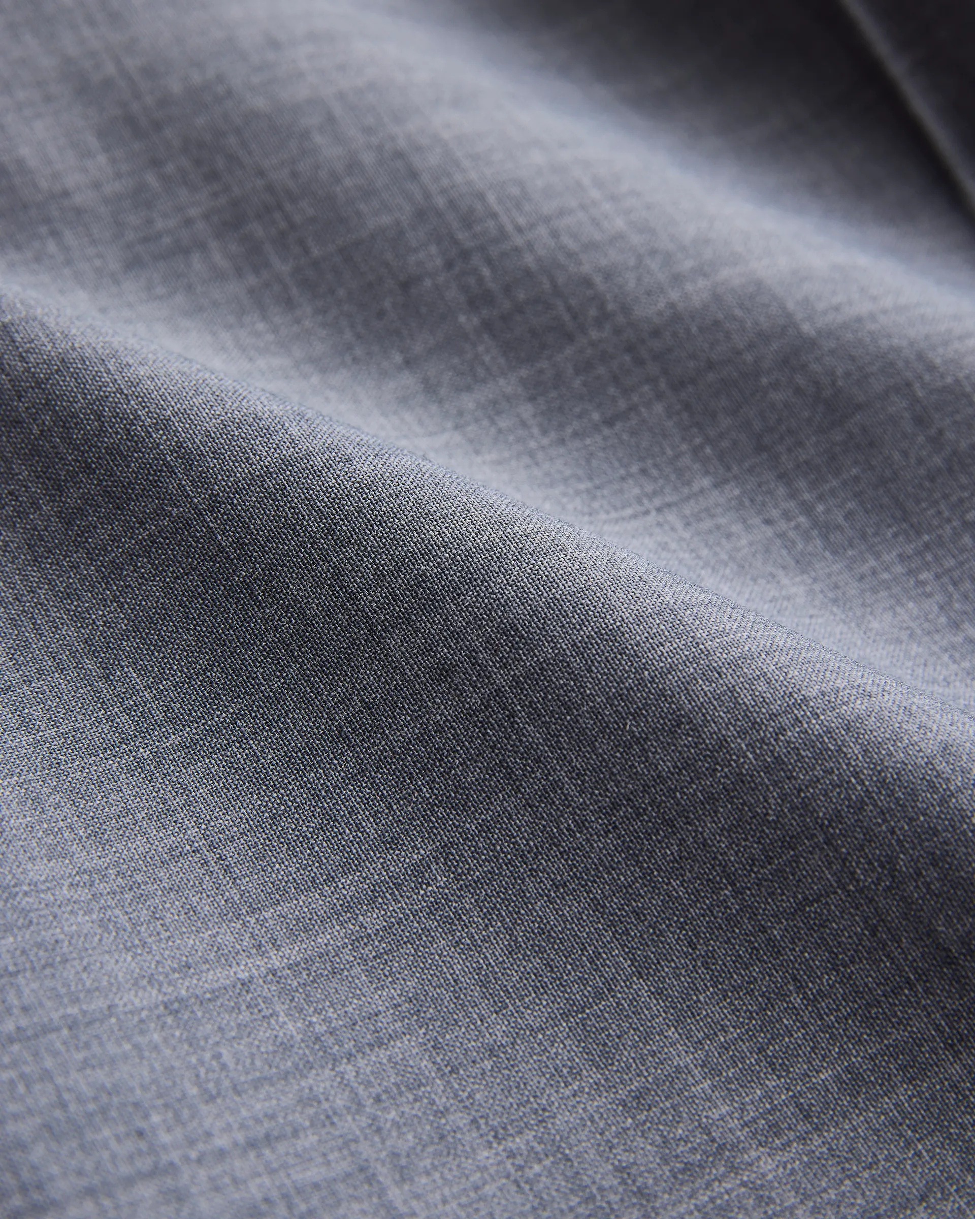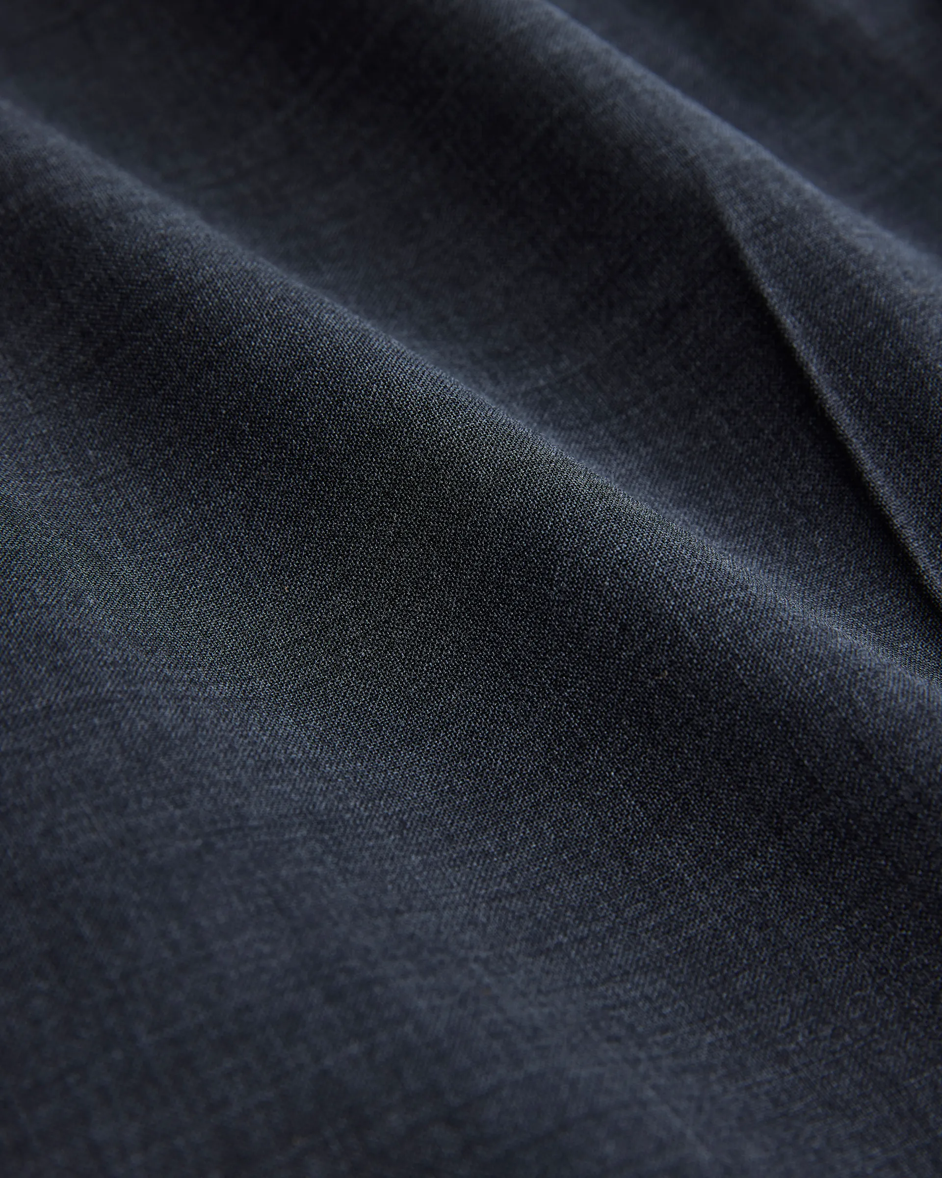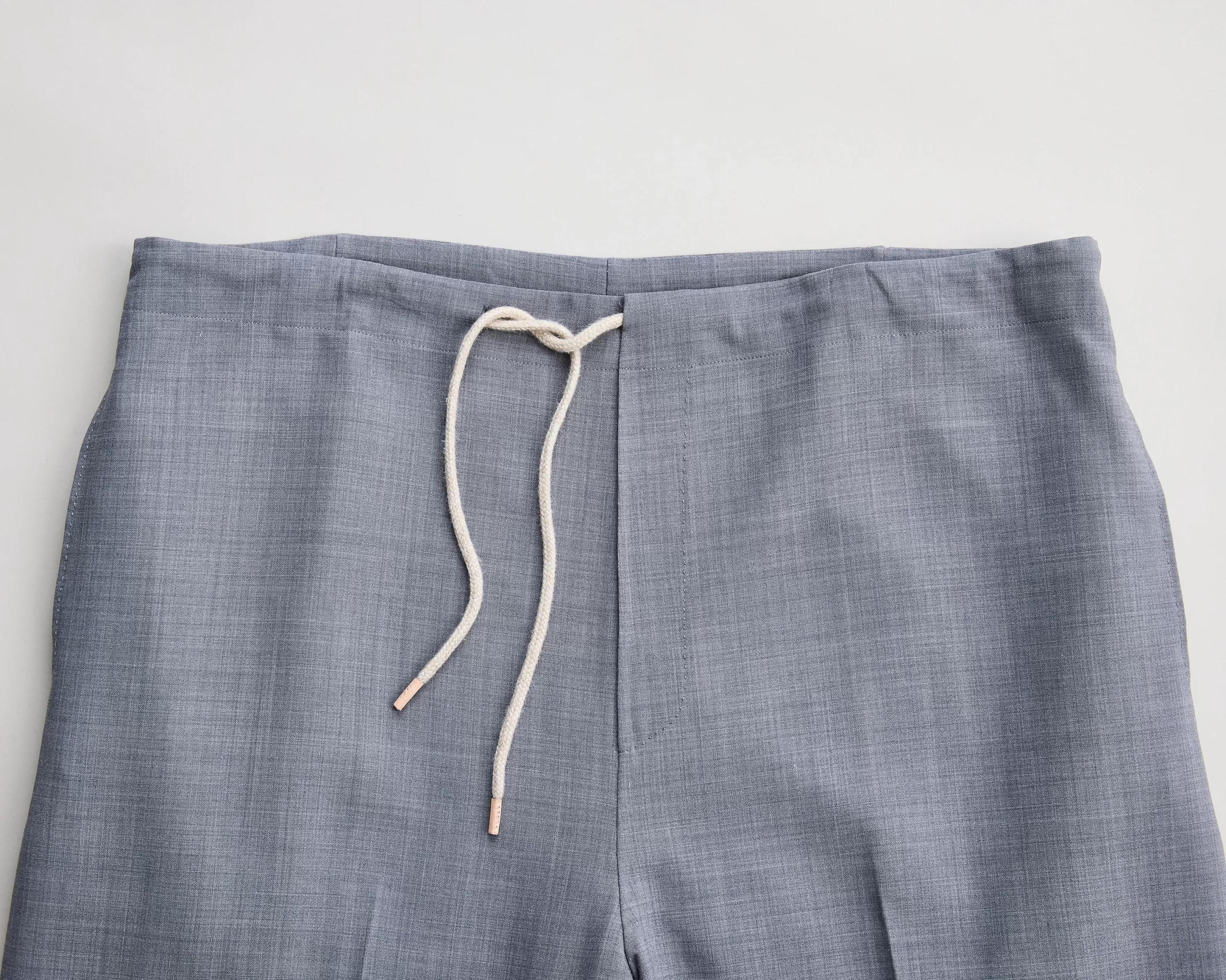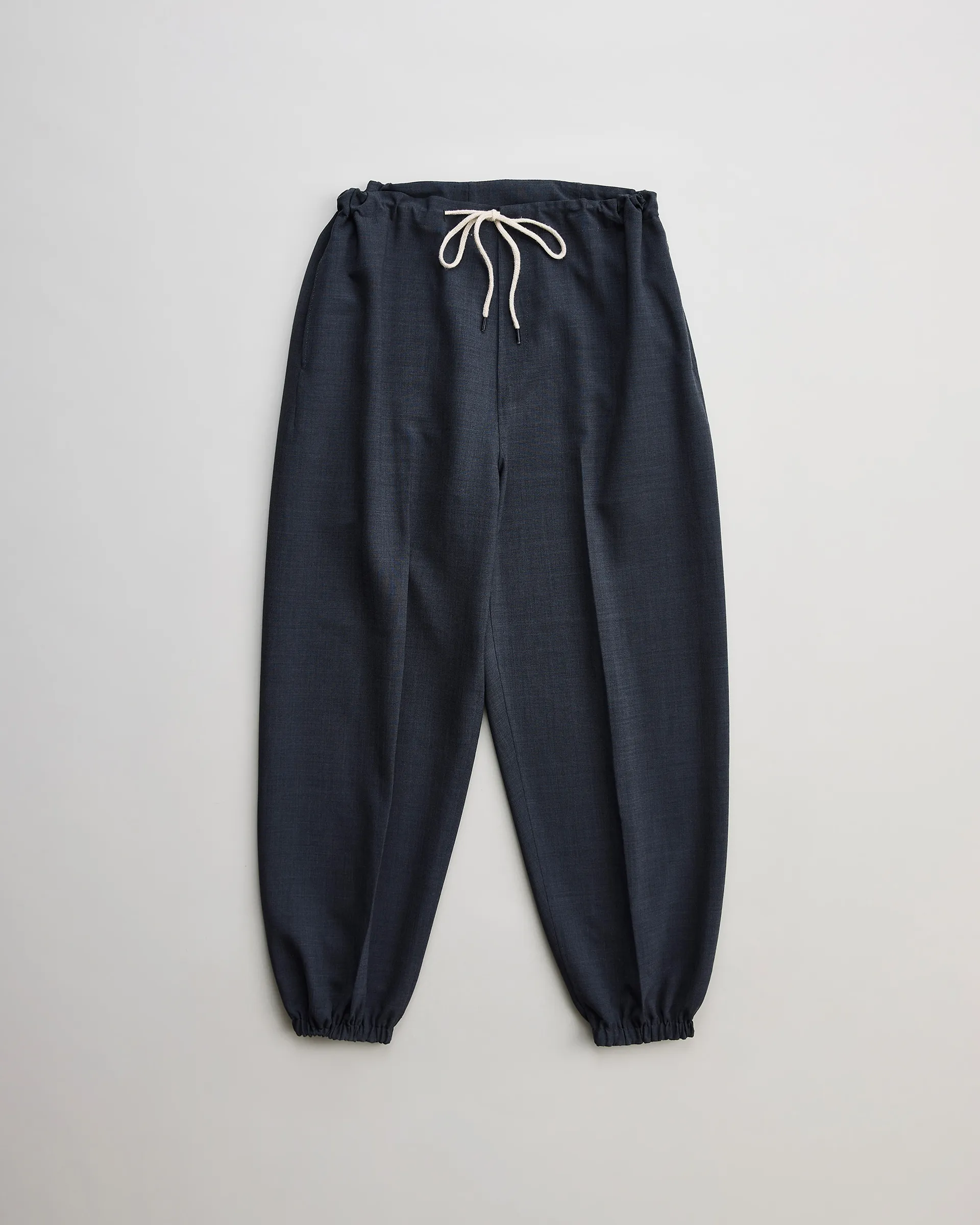 極細サイロスパンポリエステル/ウール糸を平二重織で製織した生地で構築したイージートラウザー。1960年代〜1970年代のスポーツスウェットトラウザーをリファレンスとし、ドレスやクチュールや90年代ストリートカルチャー要素を取り入れた新たなアプローチで製作。二重織による膨らみ感に加え、縦横に伸びる2WAY機能性が快適な着用感と上品なドレープを両立。ヴィンテージスウェットを想起させる杢調の色合いも特徴的な表情です。縫製は毛抜き合わせによるリバー仕立てを採用し、表裏ともに縫い代の出ないクリーンな仕上がりを実現しています。