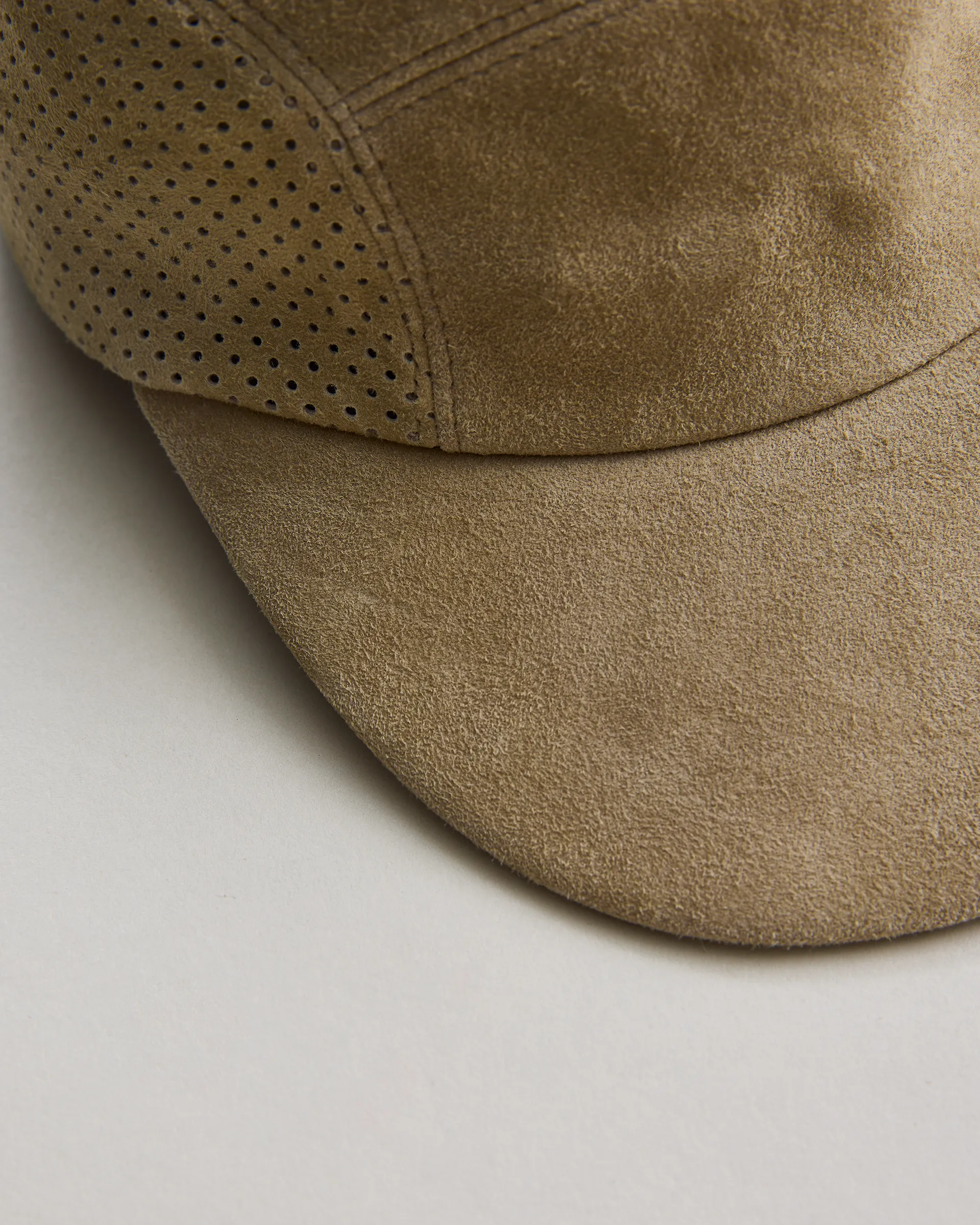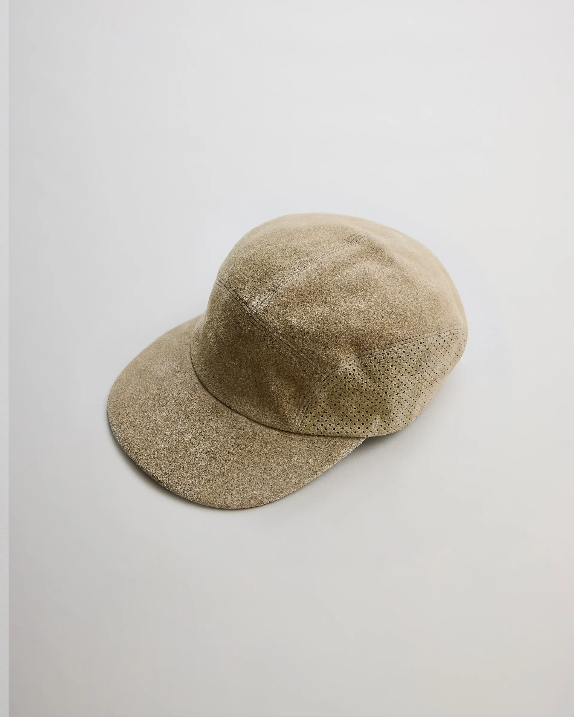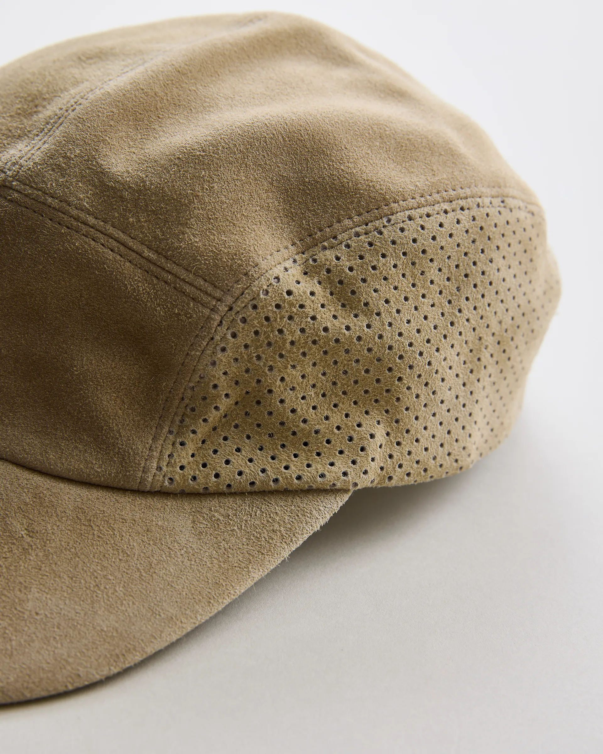 ヘアシープスエードとメッシュヘアシープで製作したメッシュパネルレザーキャップ。型は1990年代のワークキャップやフィッシングキャップをリファレンスとしたオリジナルパターン。柔らかくしなやかなヘアシープスエードが滑らかな毛艶と独特のくったり感を表現し、メッシュヘアシープが通気性と軽さをプラスして快適な着心地を実現しています。スポーティーな見た目とは相反する上質なレザーが新しいムードを演出するキャップです。