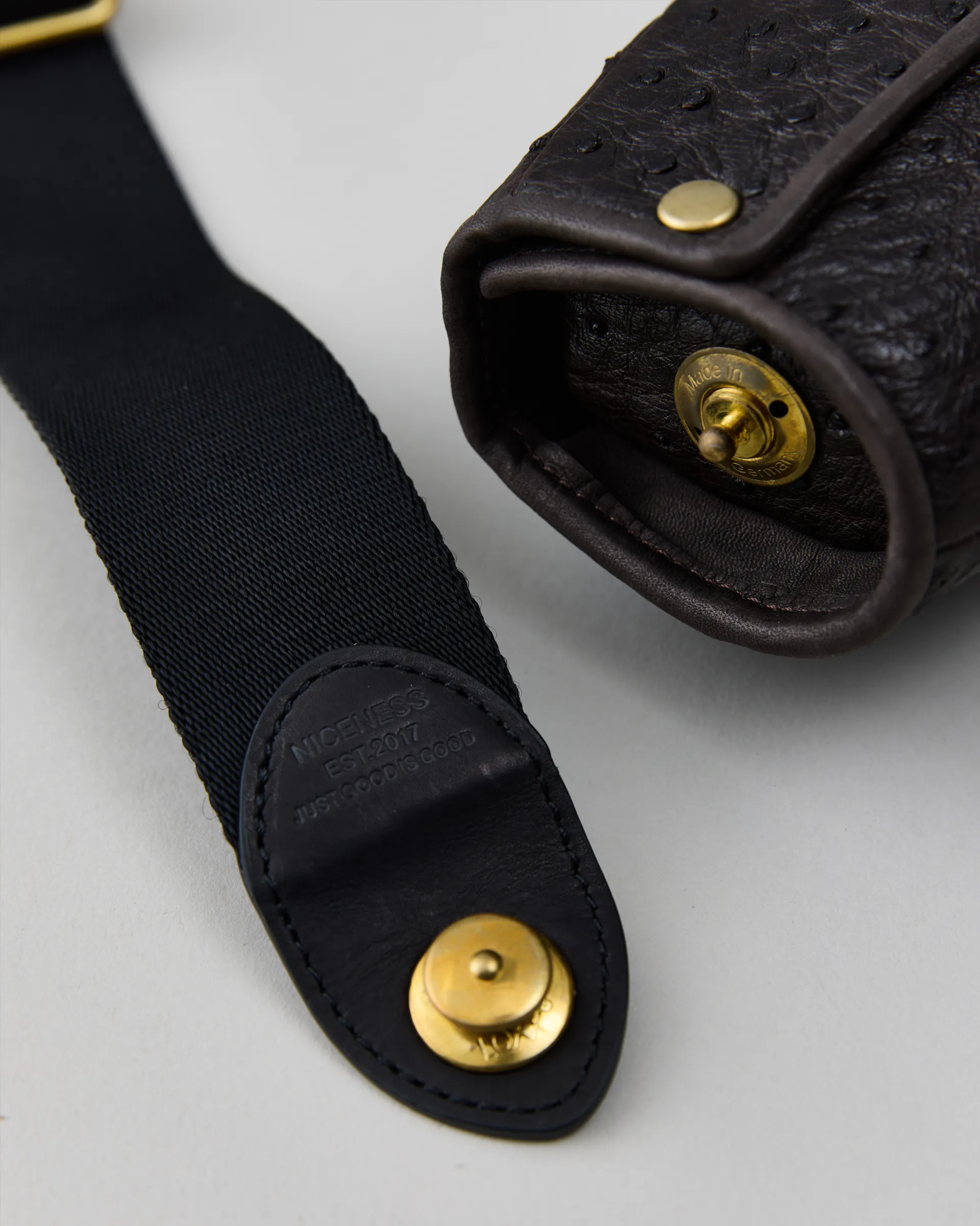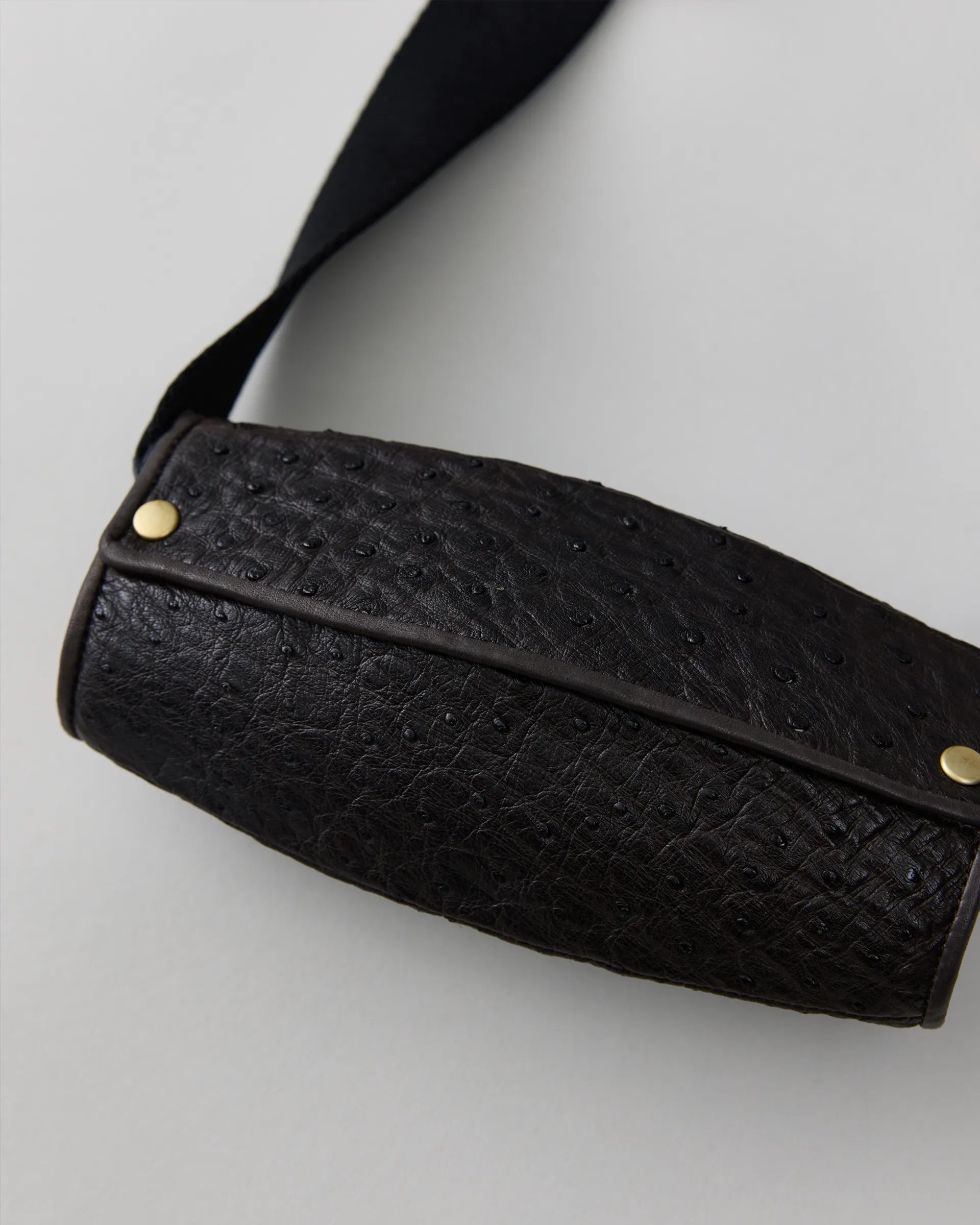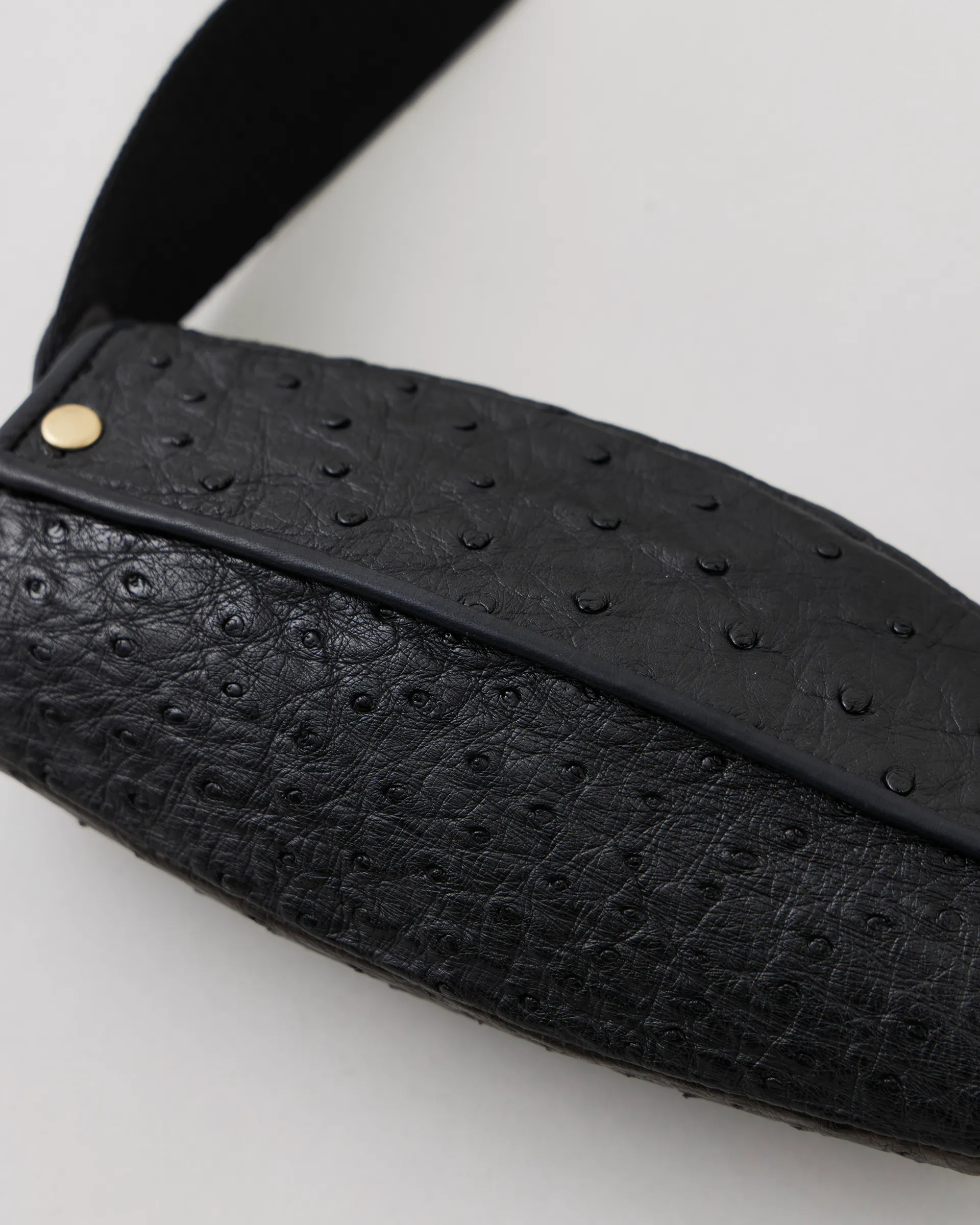 南アフリカのファームで管理、飼育されたオーストリッチレザーで製作したグラスバッグ。独特な楕円に似たバレル形状は、さまざまなグラスフレームに対応できるよう設計されたデザインです。内側には小分けのポケットもあり、ウエストポーチとしても使用可能です。