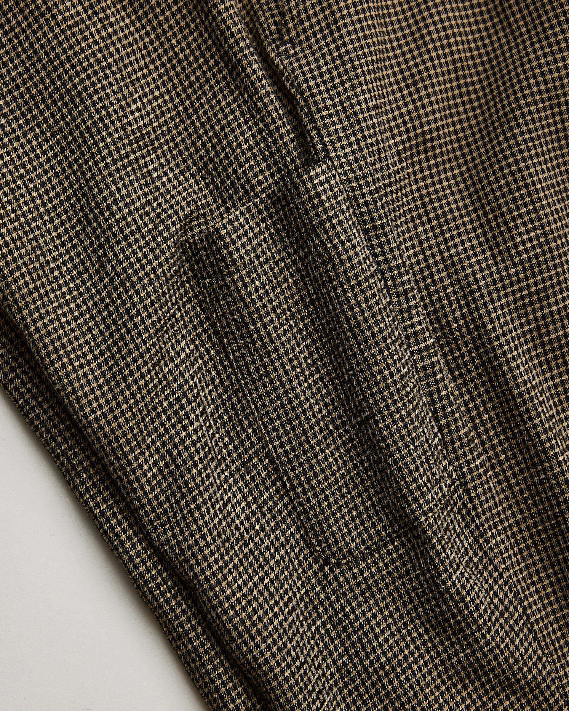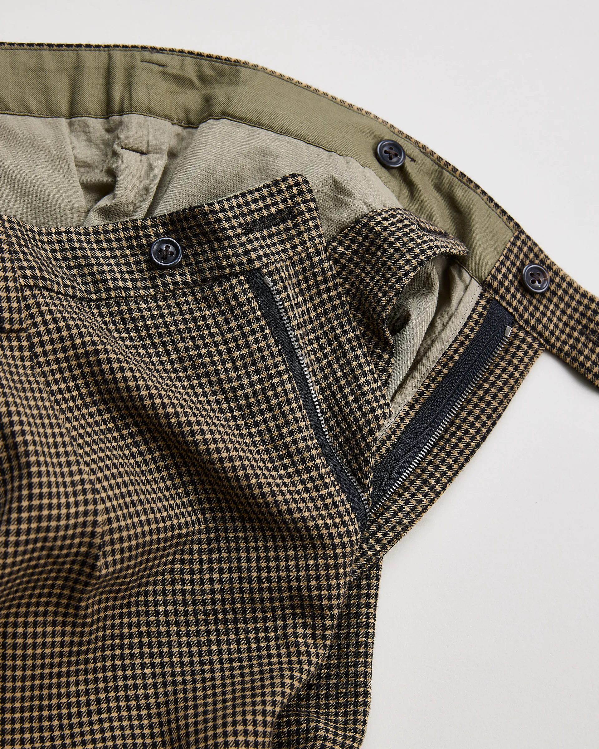 Super140’sの原料を使用したツイルチェックを特殊な起毛加工で仕上げた生地で製作したややワイドなスラックス。1990年代のフレンチスラックスのリラックスしたフォルムとイギリスのクラシックな仕立てをリファレンスとし、オリジナルパターンを製作。あえてローカウントで織り上げた生地に特殊な起毛加工を施すことで、空気を含んだような軽やかさと肌に触れたときの柔らかく上品なタッチを実現。腰まわりにゆとりを持たせつつ、裾にかけて緩やかにテーパードするシルエットで、動きやすさと洗練性を両立させリラックスした佇まいを演出しています。