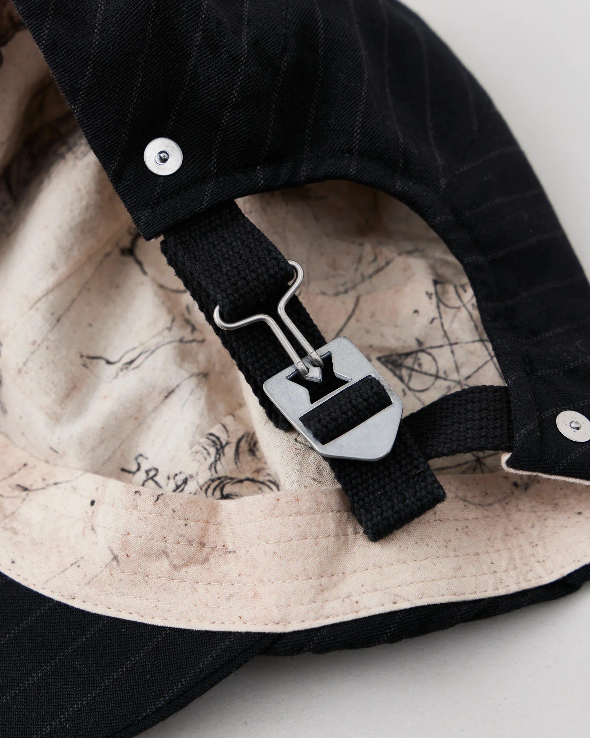 メリノウールの杢糸とリネンを用いたストライプ柄の生地を使用したロングブリムキャップ。デザインは1970年代のアメリカのフィッシングキャップやジェットキャップをリファレンスに再構築。クラウンは一枚生地で構成されており、頭の丸みをダーツで調整しています。
