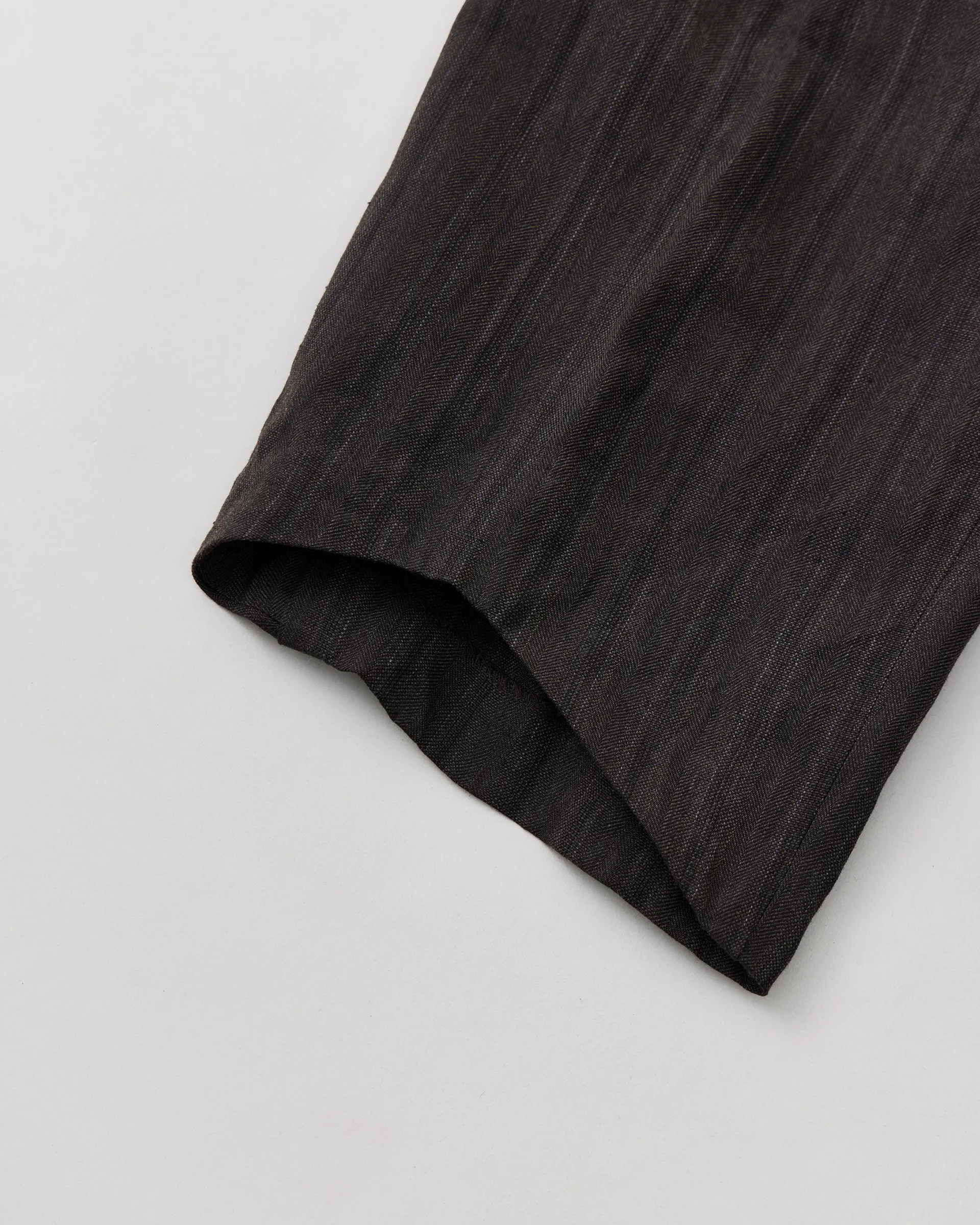 メリノウール杢糸と先染めのブラックリネンを使用したストライプ柄のフライングVトラウザー。1960s〜1970sのミュージックシーンを着想源に、当時流⾏したフライングVギターをモチーフとした後ろ裾をV字にカットアウトしたディテールを採用しています。仕上げでエアタンブラーを施し、着古したような雰囲気を表現しています。
