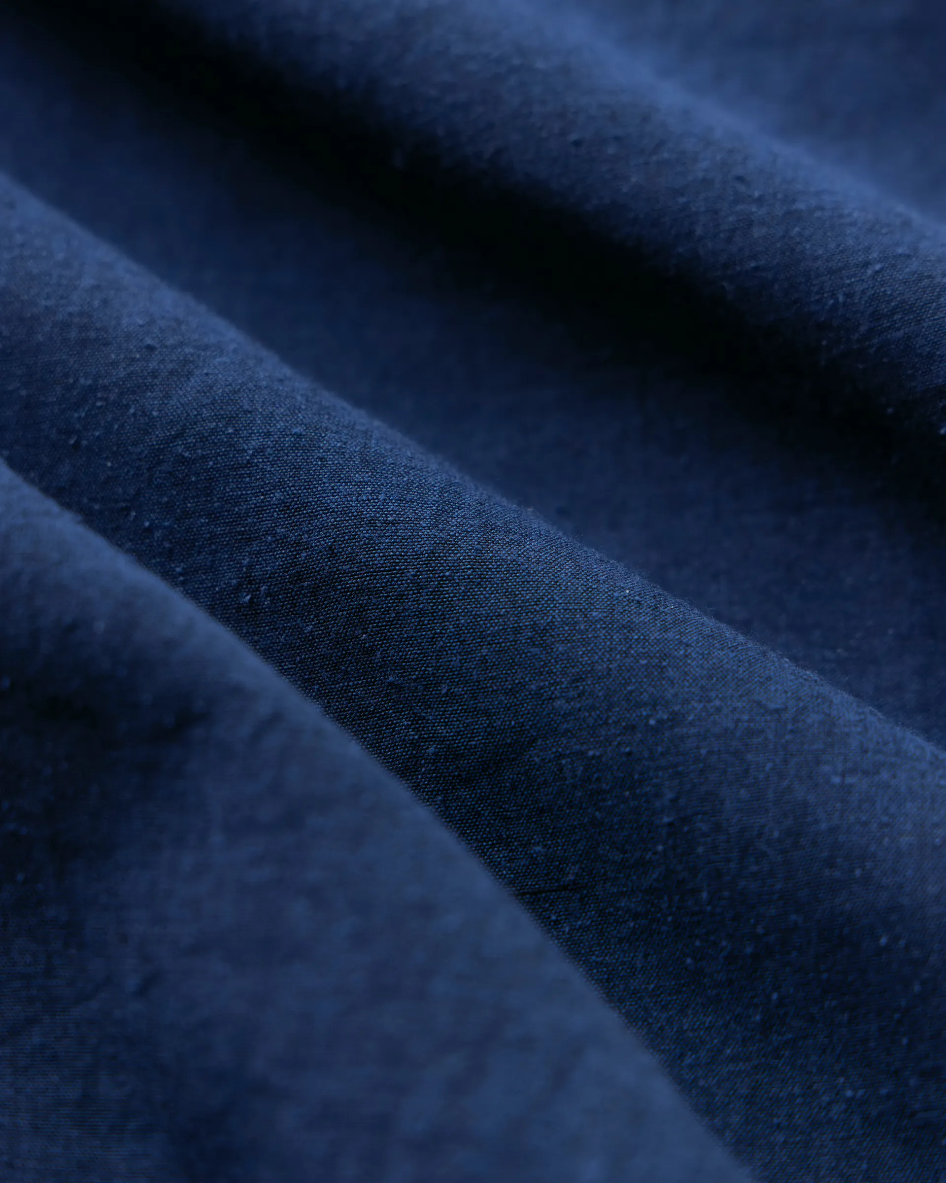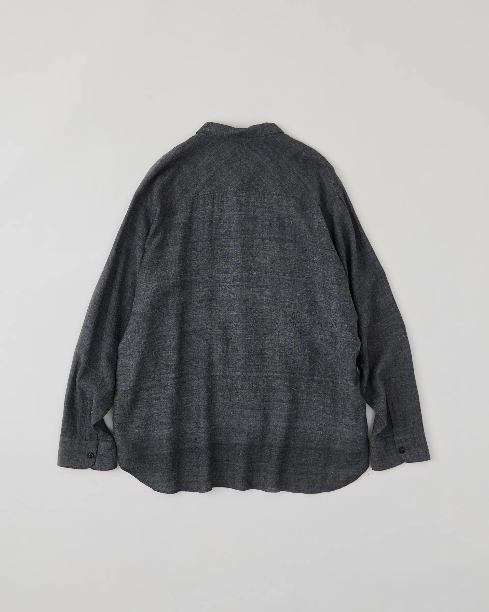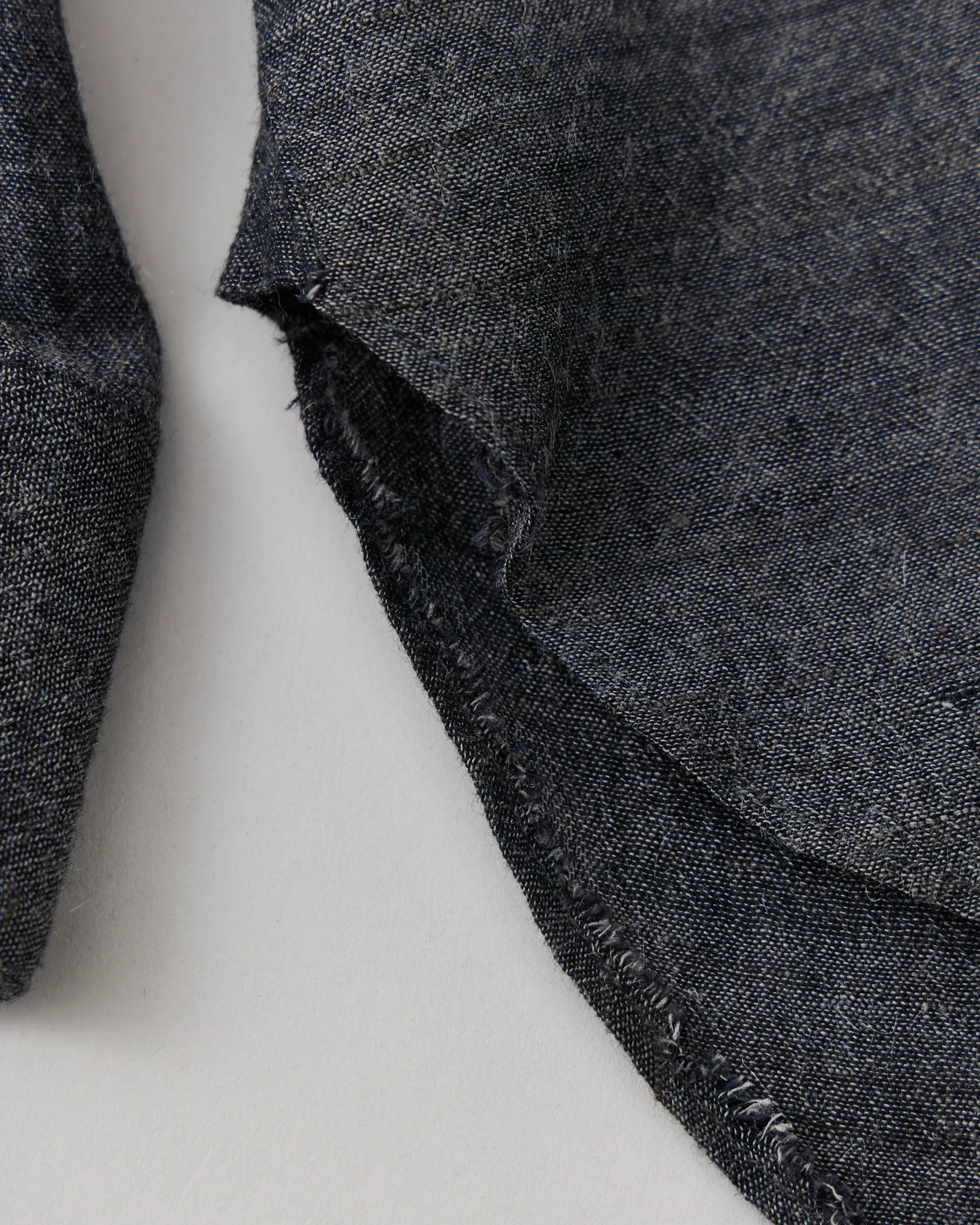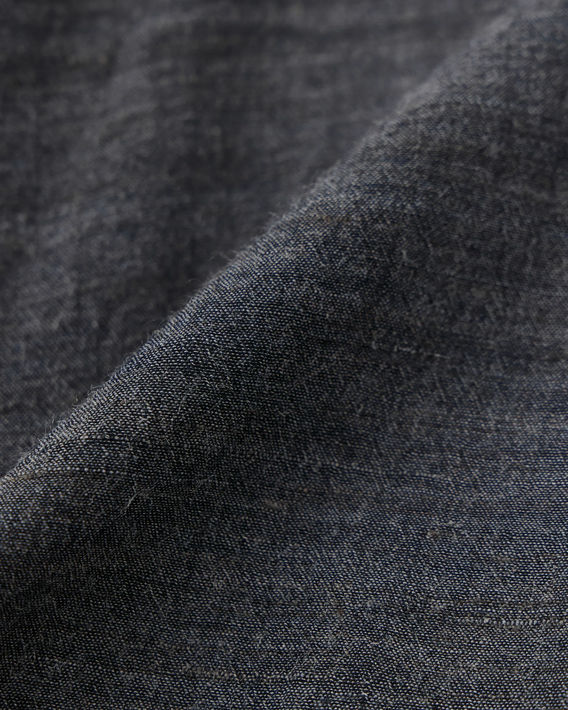 1920〜30年代の通称「ゴマシャン」をイメージして開発したシャンブレー生地のシャツ。素材はカディコットンとシルクで構成。シャツとジャケットの中間のようなややゆったりとした設計で、サイドシームに沿ってポケットを配置。古き良きアメリカの空気感をイメージして開発した素材に加え、随所にチェーンステッチやギャザーを手作業で入れるなど、インドならではの手仕事によるディテールワークが特徴です。