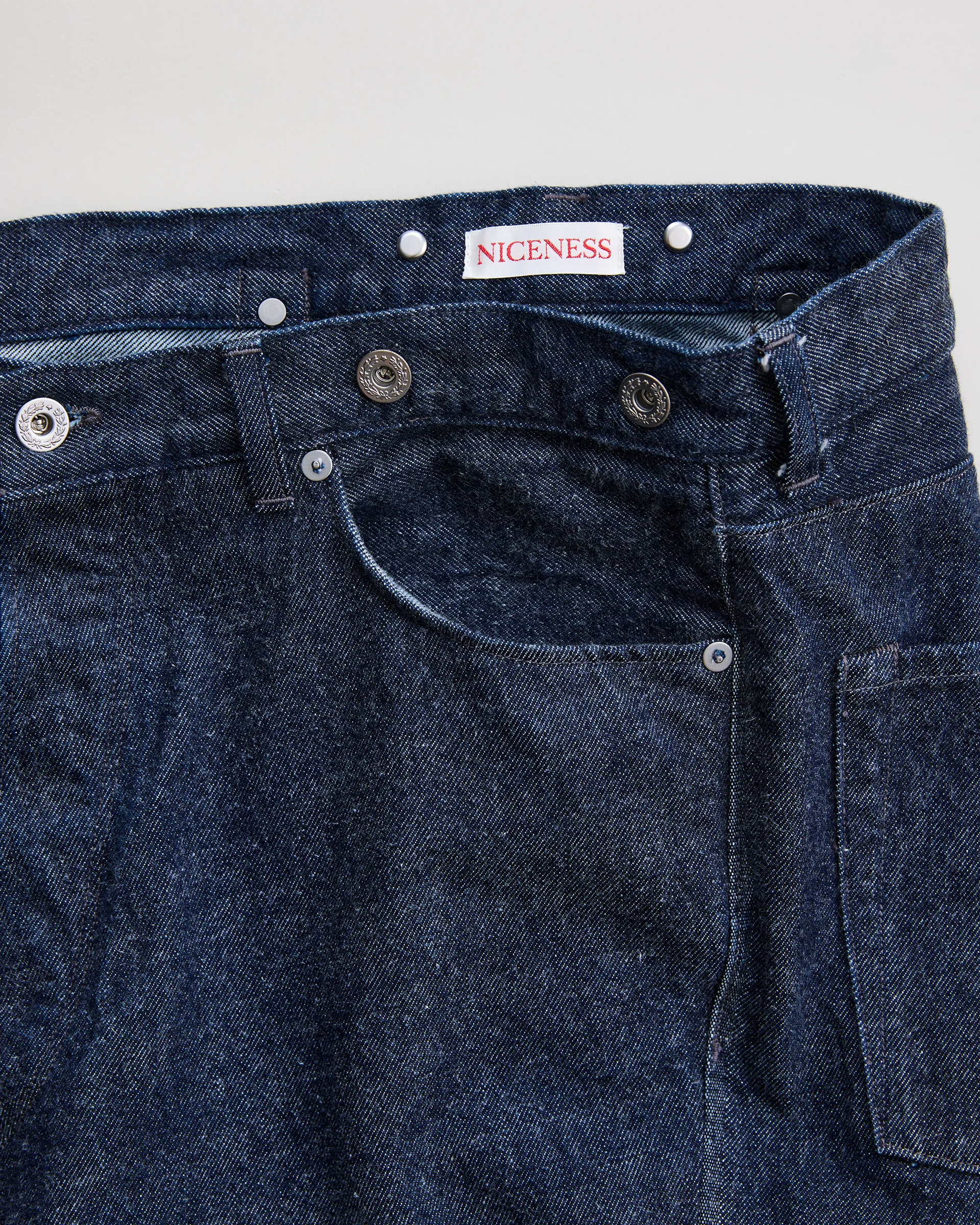 13ozの右綾生機デニム生地で製作したジーンズ。ヴィンテージジーンズに見られる「捻れ」の特性をリファレンスとし、左右のパターン取りを意図的に変え、左右非対称な構造が新たなバランスを生み出しています。生地はロープ染色によるピュアインディゴで染めた芯白の糸を用い、米綿を中心に中南米の高品質綿を混紡したムラ糸で織り上げた表情豊かなものを使用。加工を施していない生機(きばた)ならではの自然な毛羽立ちと、履き込むほどに現れる経年変化が魅力です。ワークウェアの文脈を踏まえながらも、次世代に向けた独自のフォルムを提案する一本。