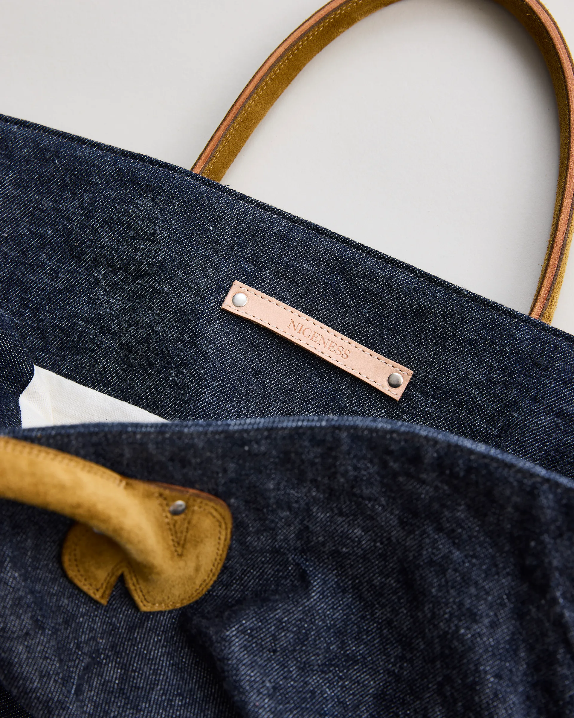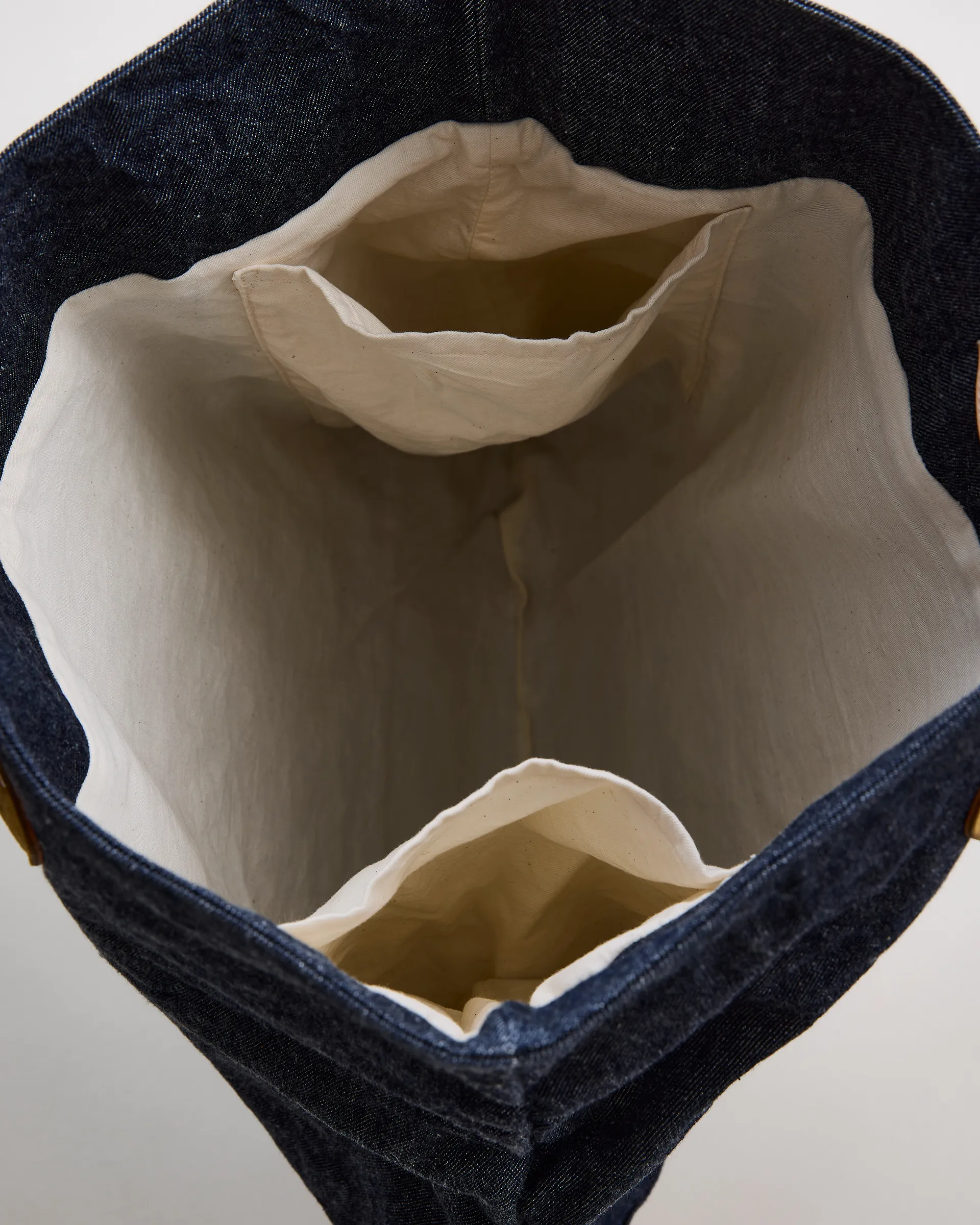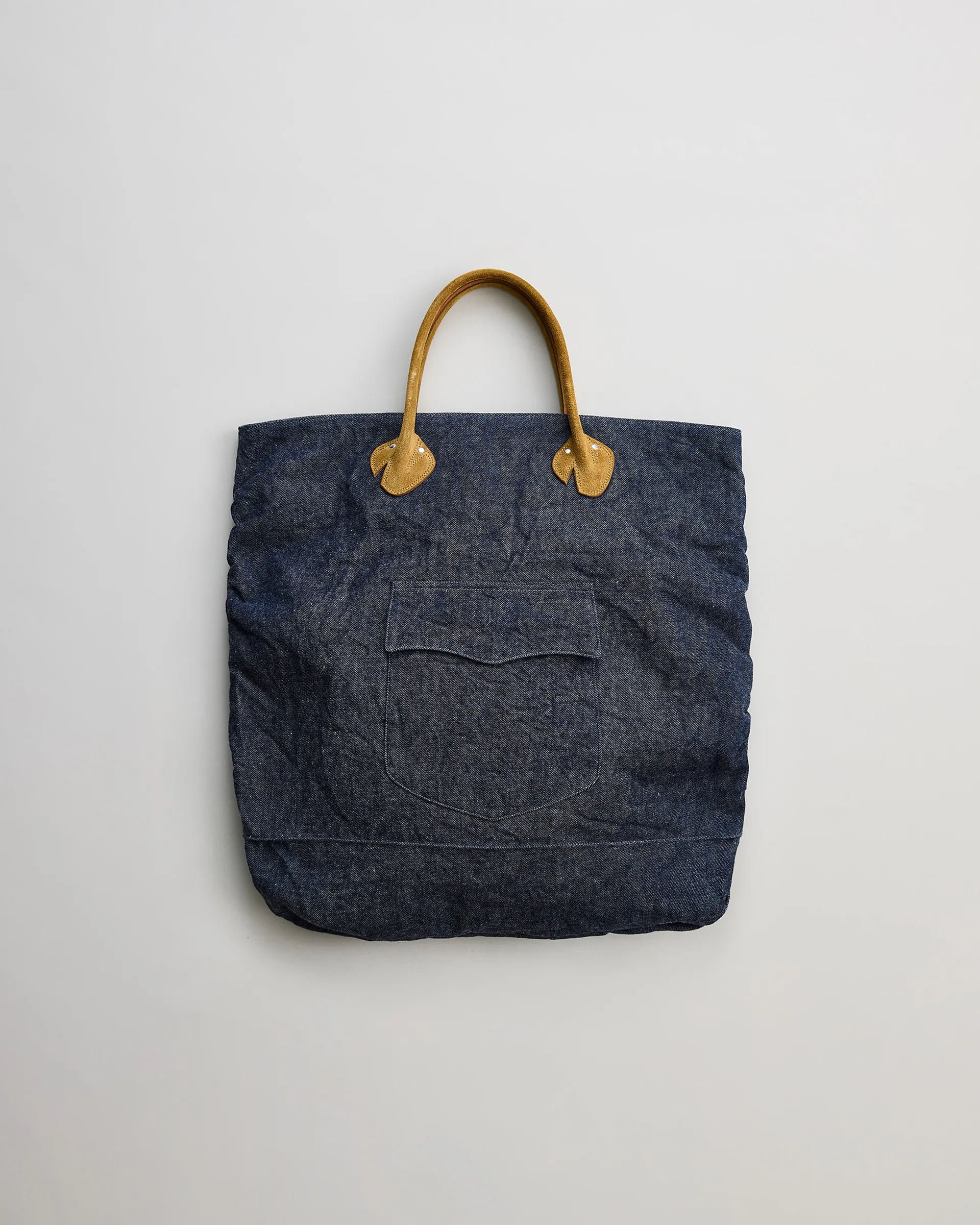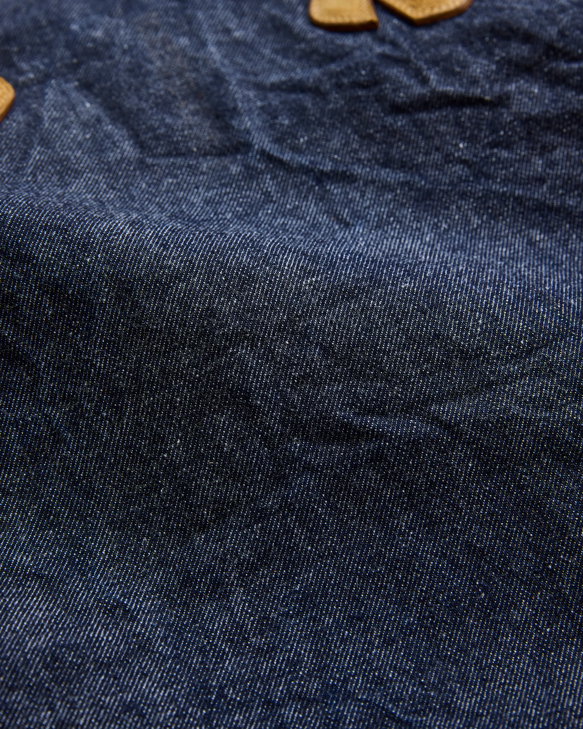 1970年代のUSヘルメットバッグと1980年代のUSトートバッグの形状をリファレンスに設計したNNシャーリングバッグ。表面には大きなフラップポケット、内側には2つの収納ポケットを配し機能性と個性を両立。素材は13ozの右綾デニム生地を使用。原綿は米綿や南米綿を中心に選定され、細番手にも対応可能な高品質綿をブレンド。芯白のタテ糸はロープ染色によるピュアインディゴ染めを施しています。バッグの袋部分には手作業でシャーリング(ギャザー)を入れ、経年変化による収縮を再現。素材・技術・デザインが三位一体となったバッグです。