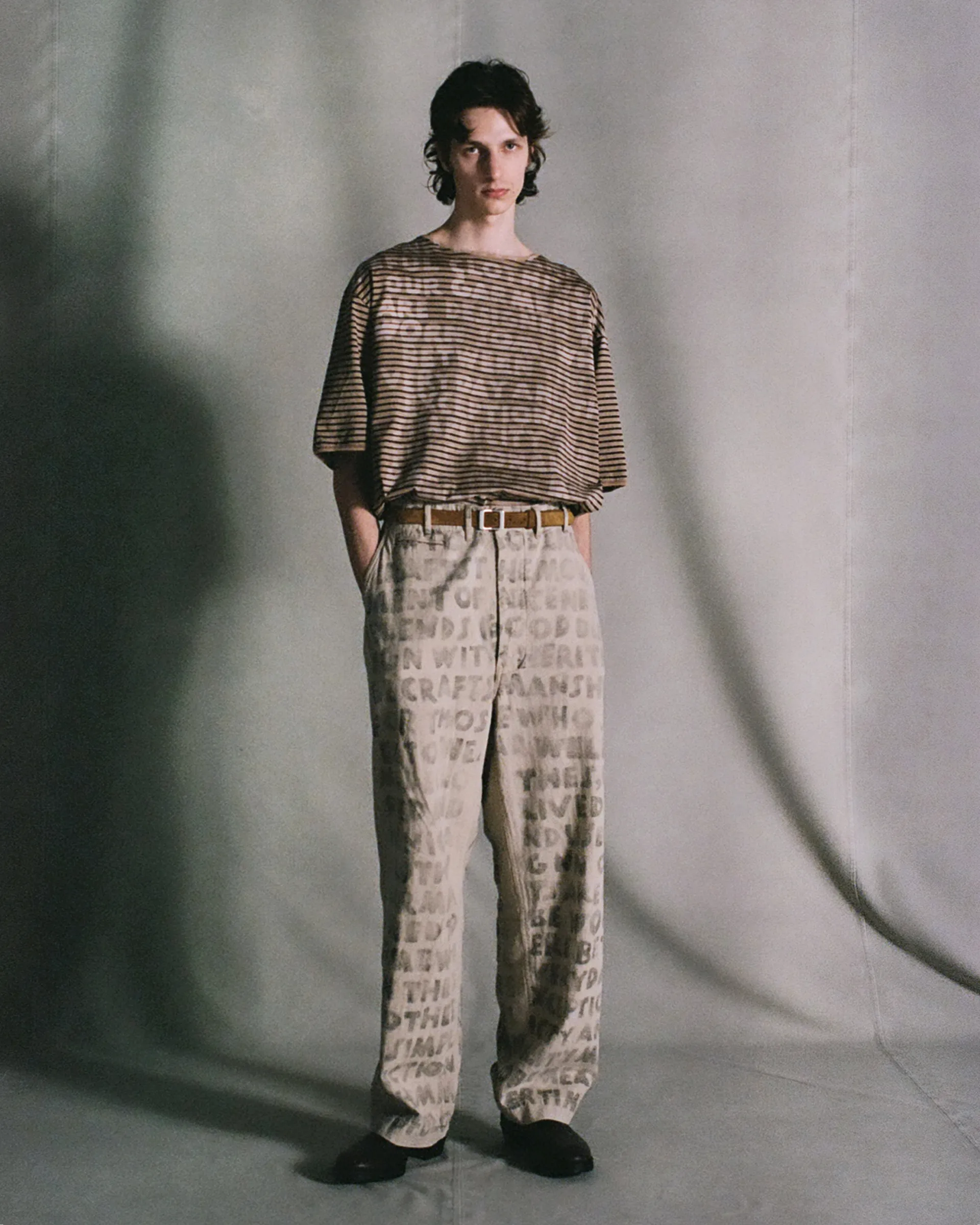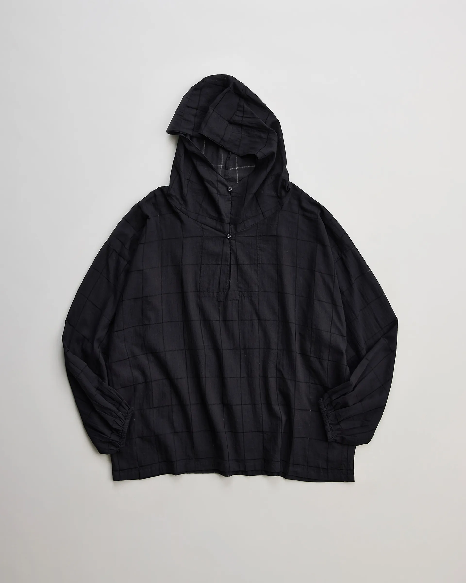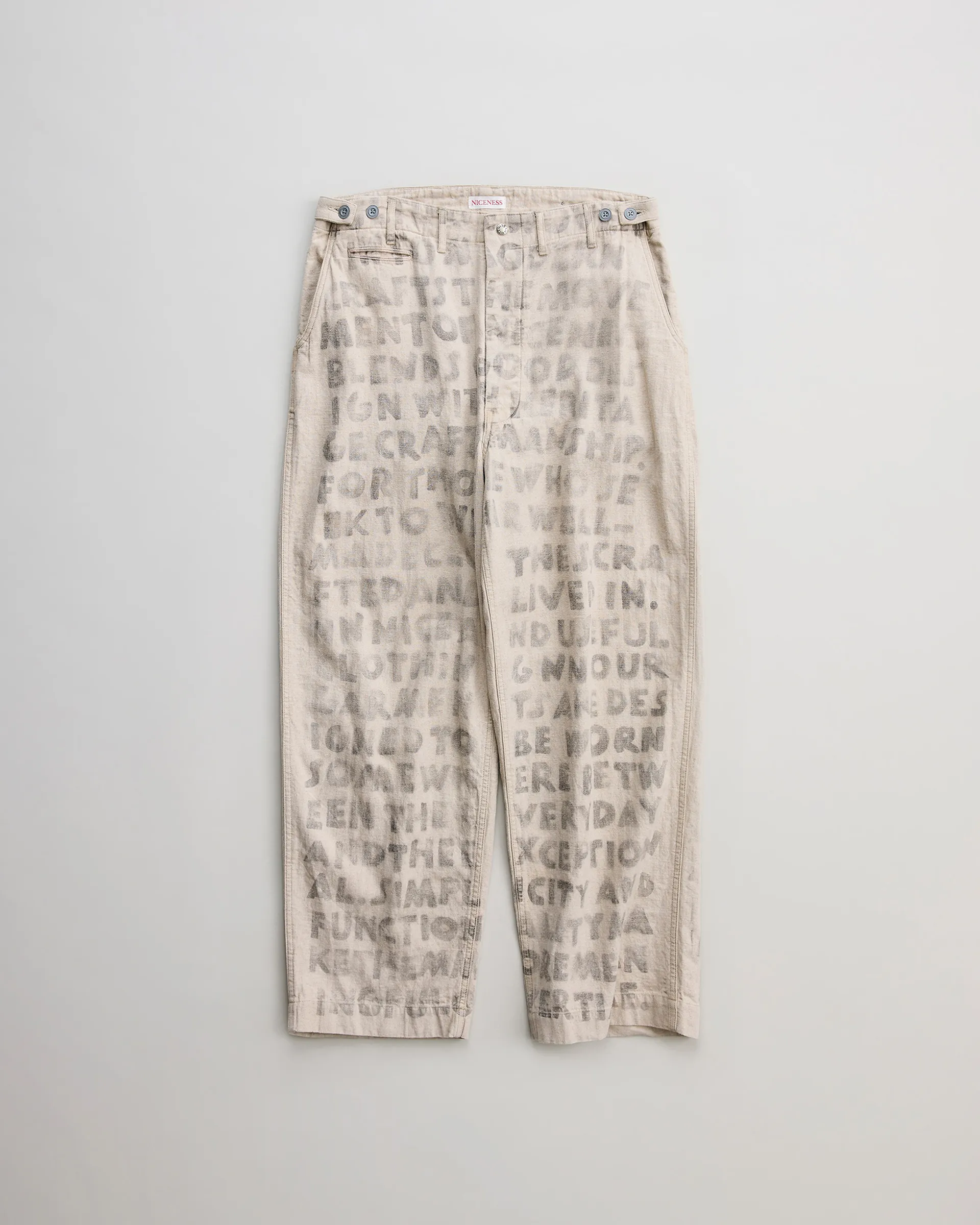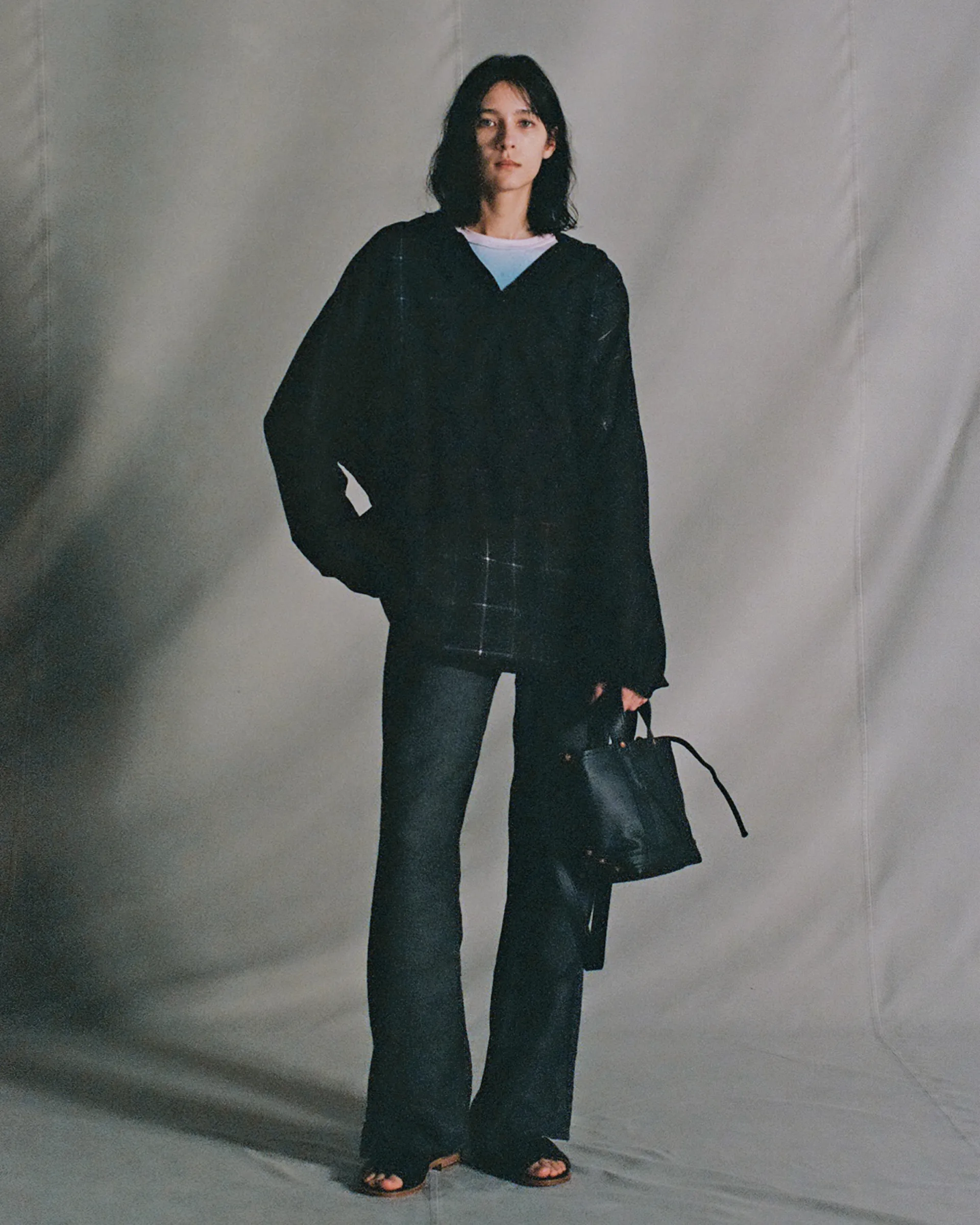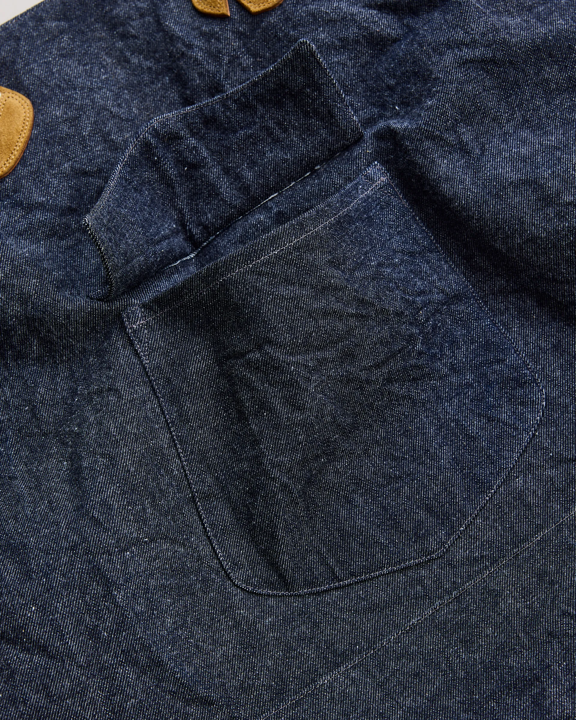 1970年代のUSヘルメットバッグと1980年代のUSトートバッグの形状をリファレンスに設計したNNシャーリングバッグ。表面には大きなフラップポケット、内側には2つの収納ポケットを配し機能性と個性を両立。素材は13ozの右綾デニム生地を使用。原綿は米綿や南米綿を中心に選定され、細番手にも対応可能な高品質綿をブレンド。芯白のタテ糸はロープ染色によるピュアインディゴ染めを施しています。バッグの袋部分には手作業でシャーリング(ギャザー)を入れ、経年変化による収縮を再現。素材・技術・デザインが三位一体となったバッグです。