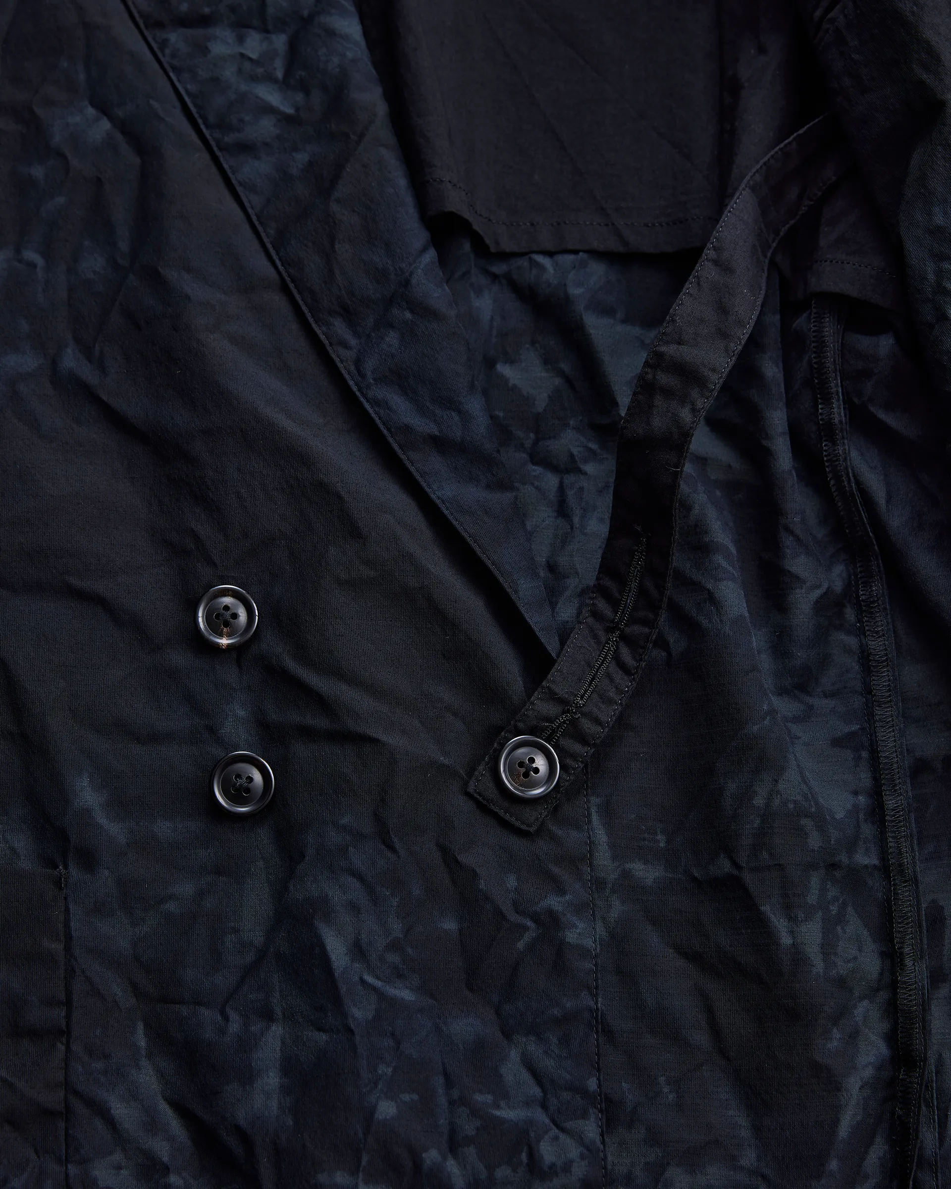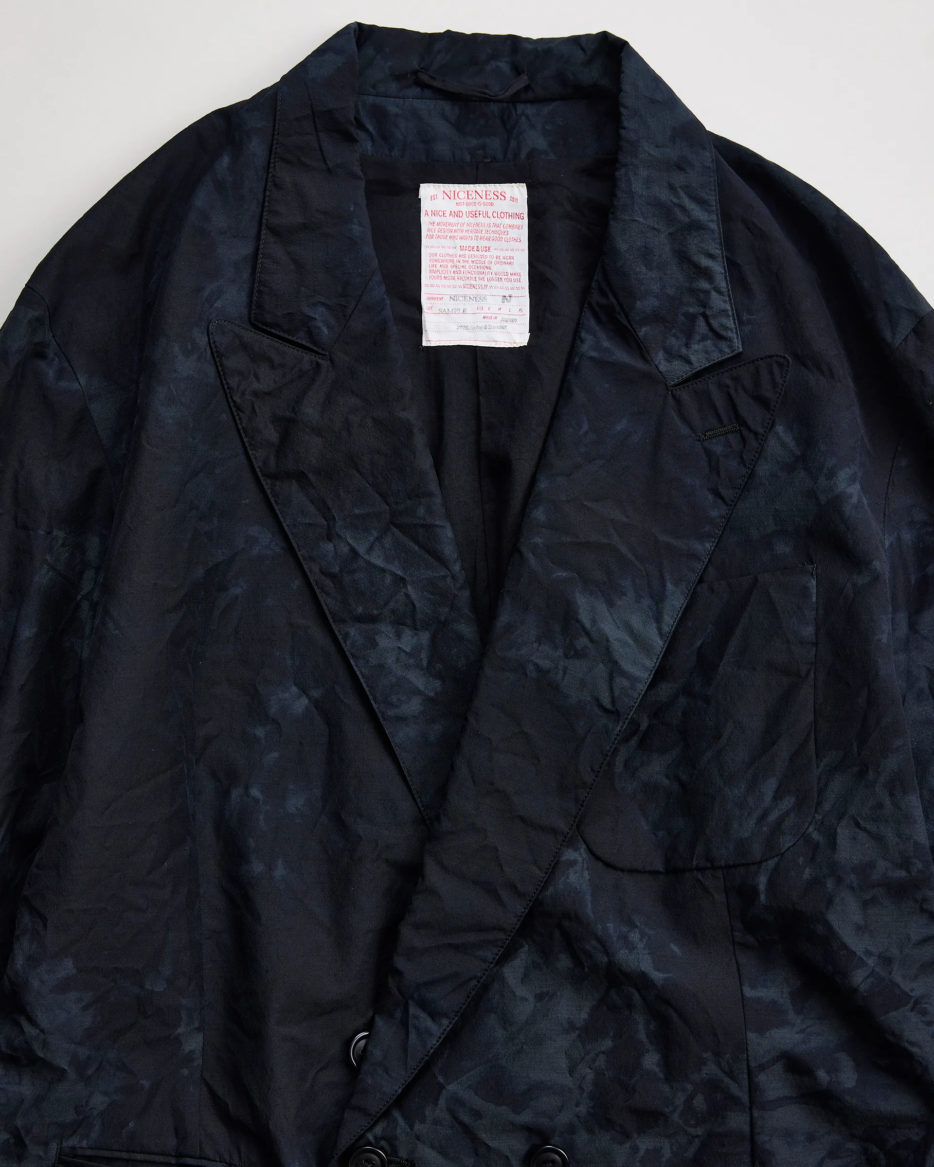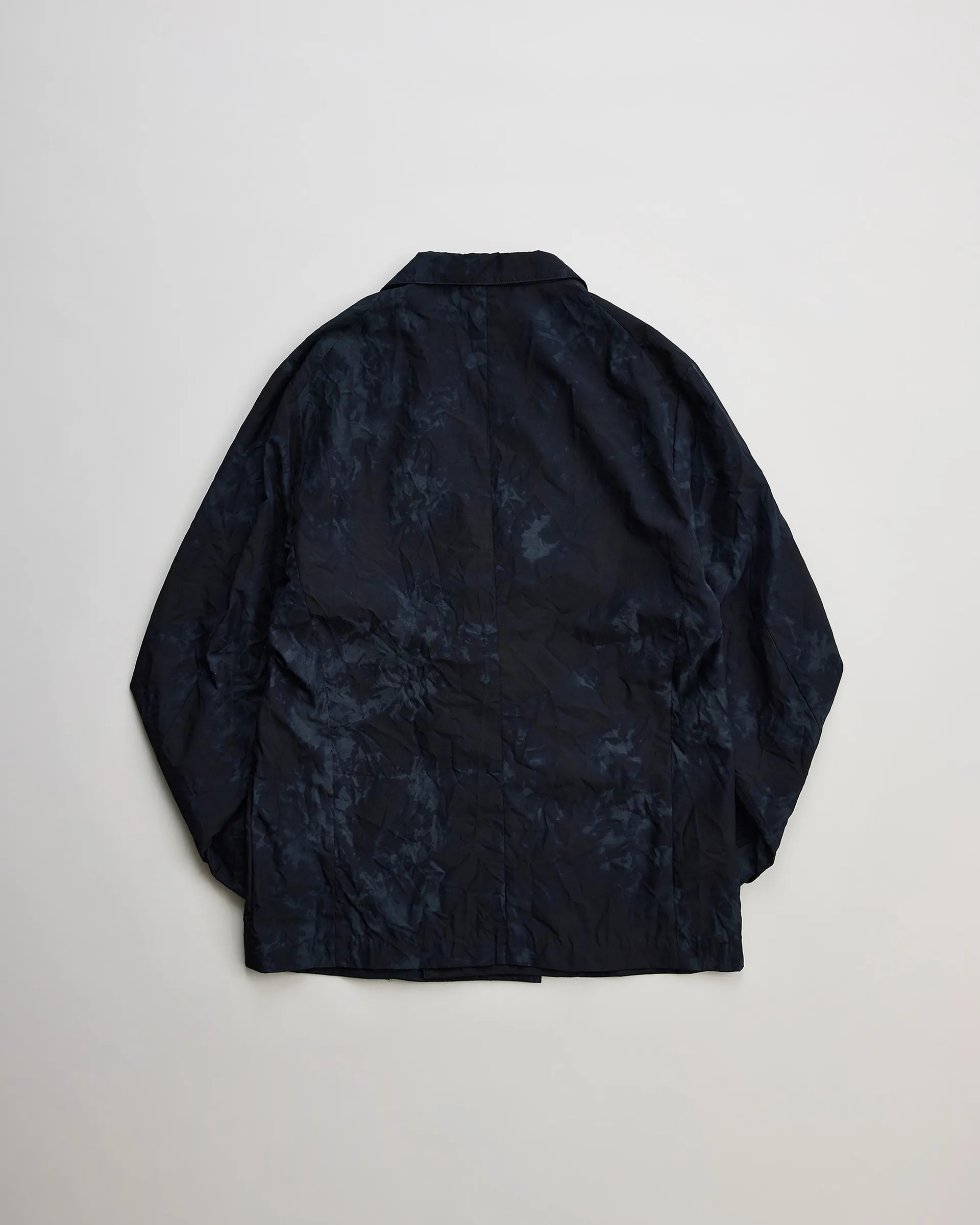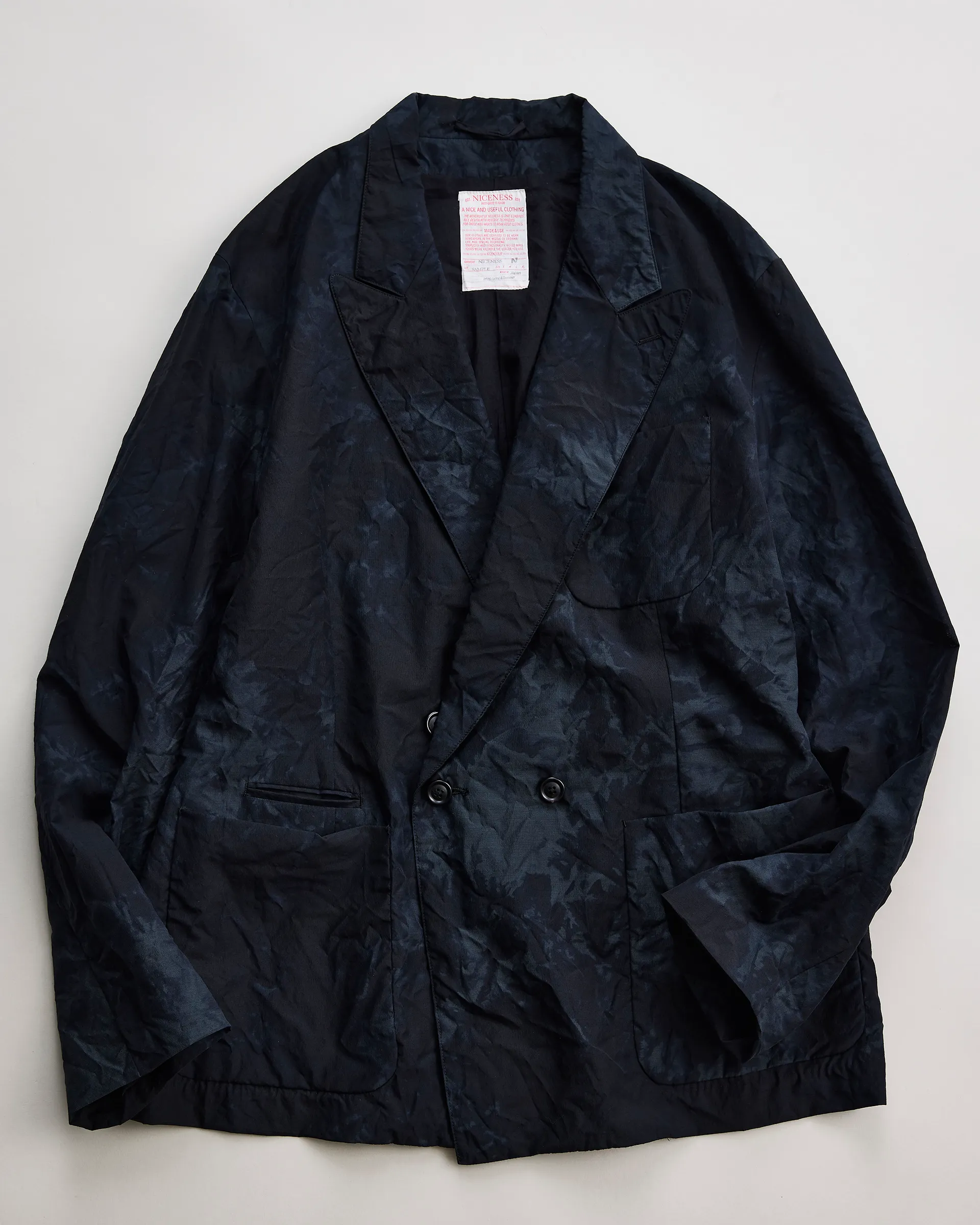 極細ナイロンフィラメントのセミダル糸、防縮ウールとナイロンの精紡交撚糸を使用した生地で製作したダブルブレストジャケット。型はフランスのクラシカルなテーラードスタイルとイギリスのダブルブレストジャケットの構造美をリファレンスとしたオリジナルパターン。ナイロンの品のある光沢と強撚ウールによるシャリ感・ハリ感が共存する春夏に最適なドライタッチのファブリックです。生地は職人の手作業による籠染め加工で仕上げ、一点物のような表情を実現。袖は一枚仕立ての立体構造。新旧の技術と東西の文化を内包しながらモダンに昇華された一着です。