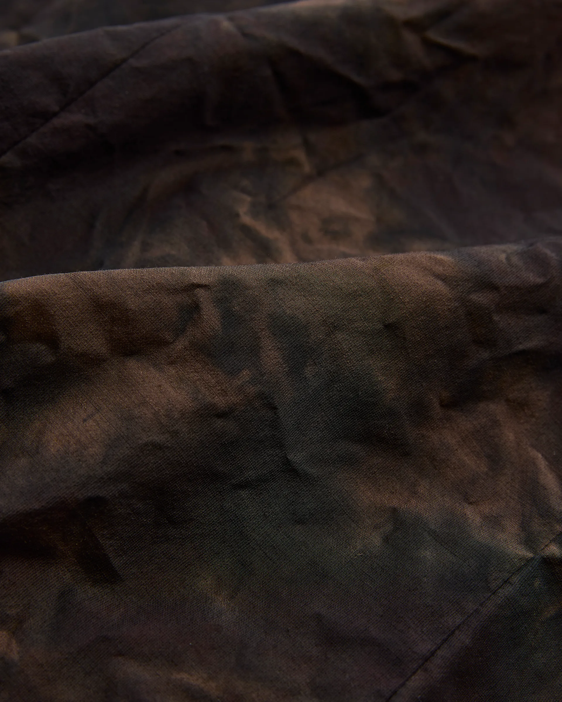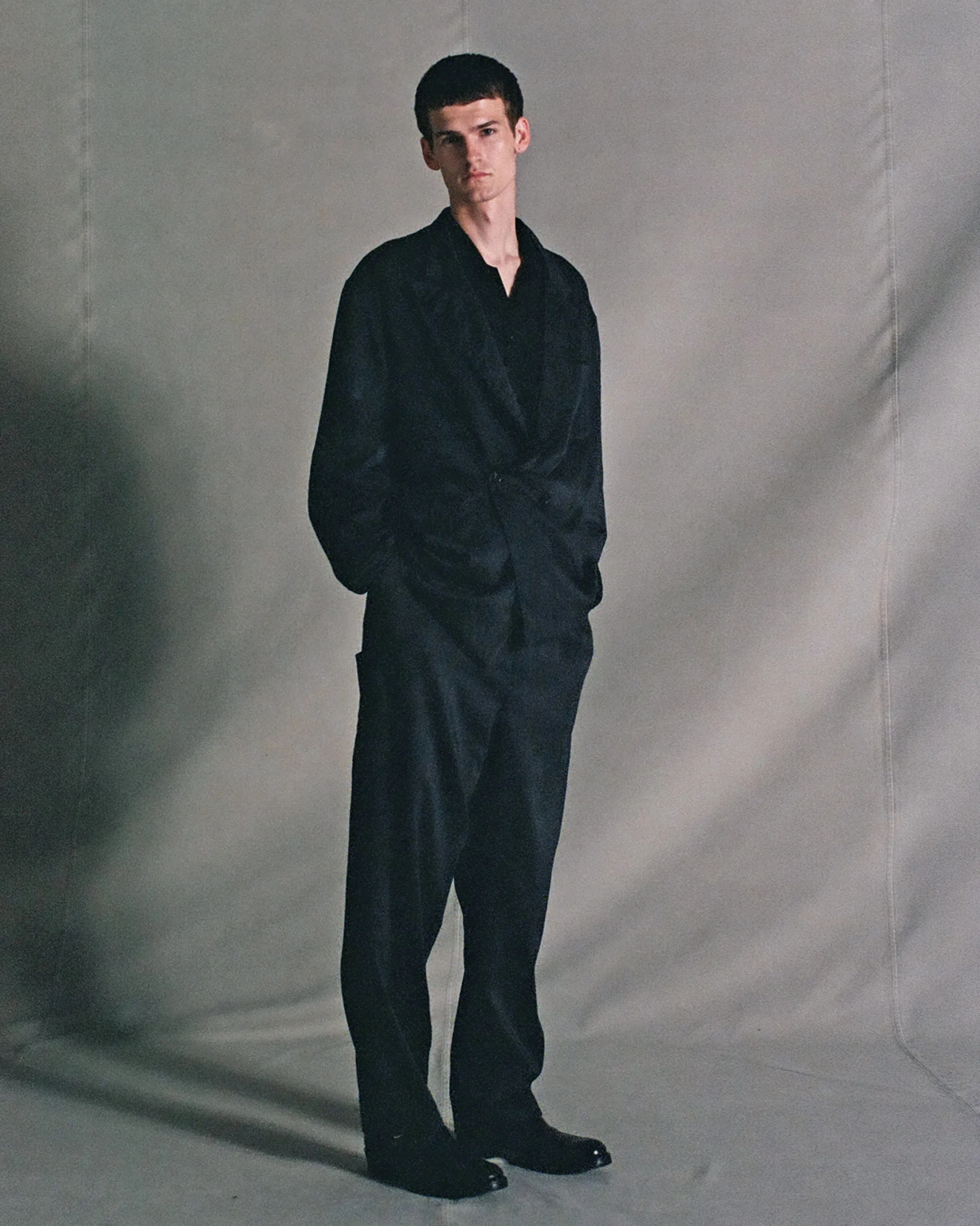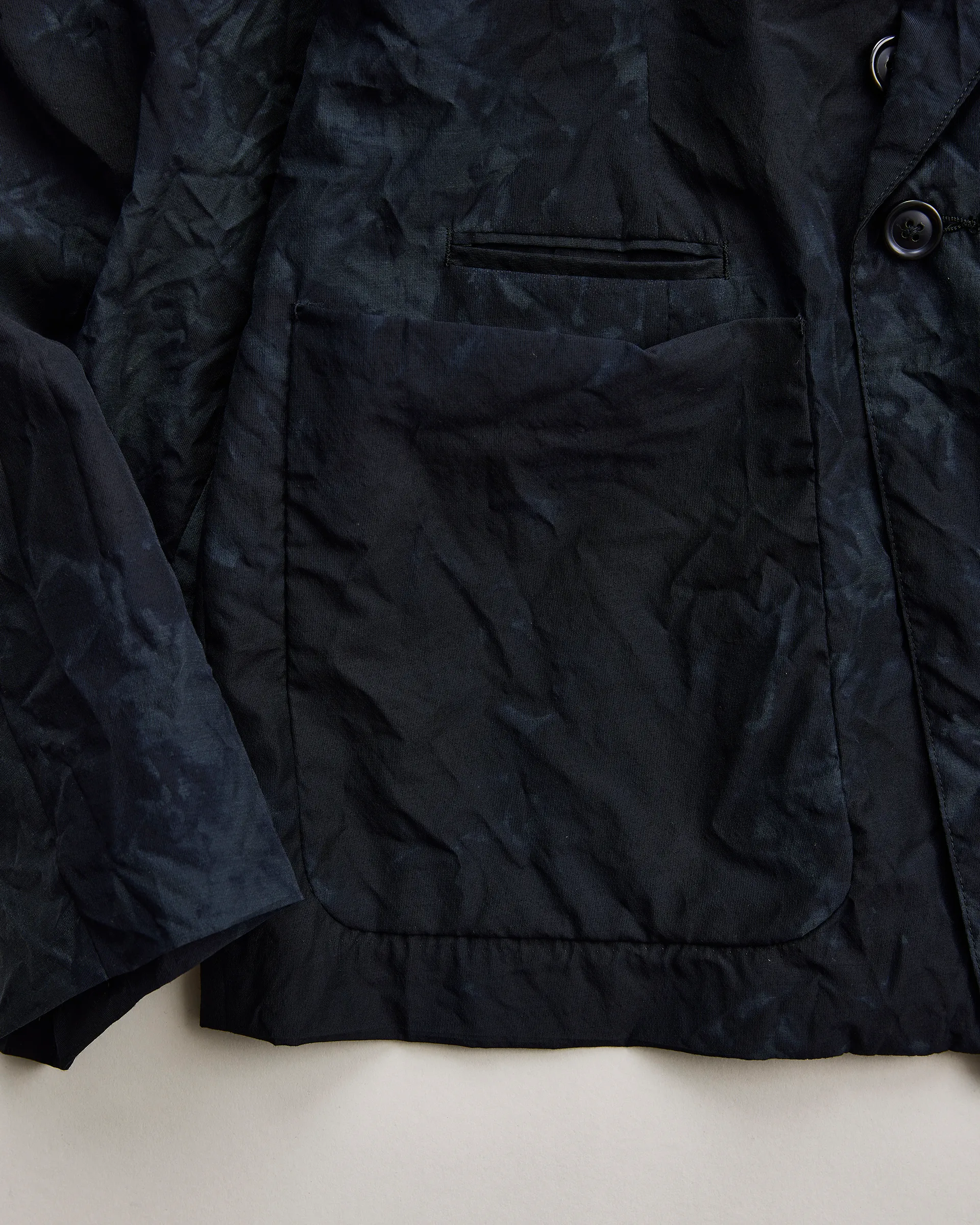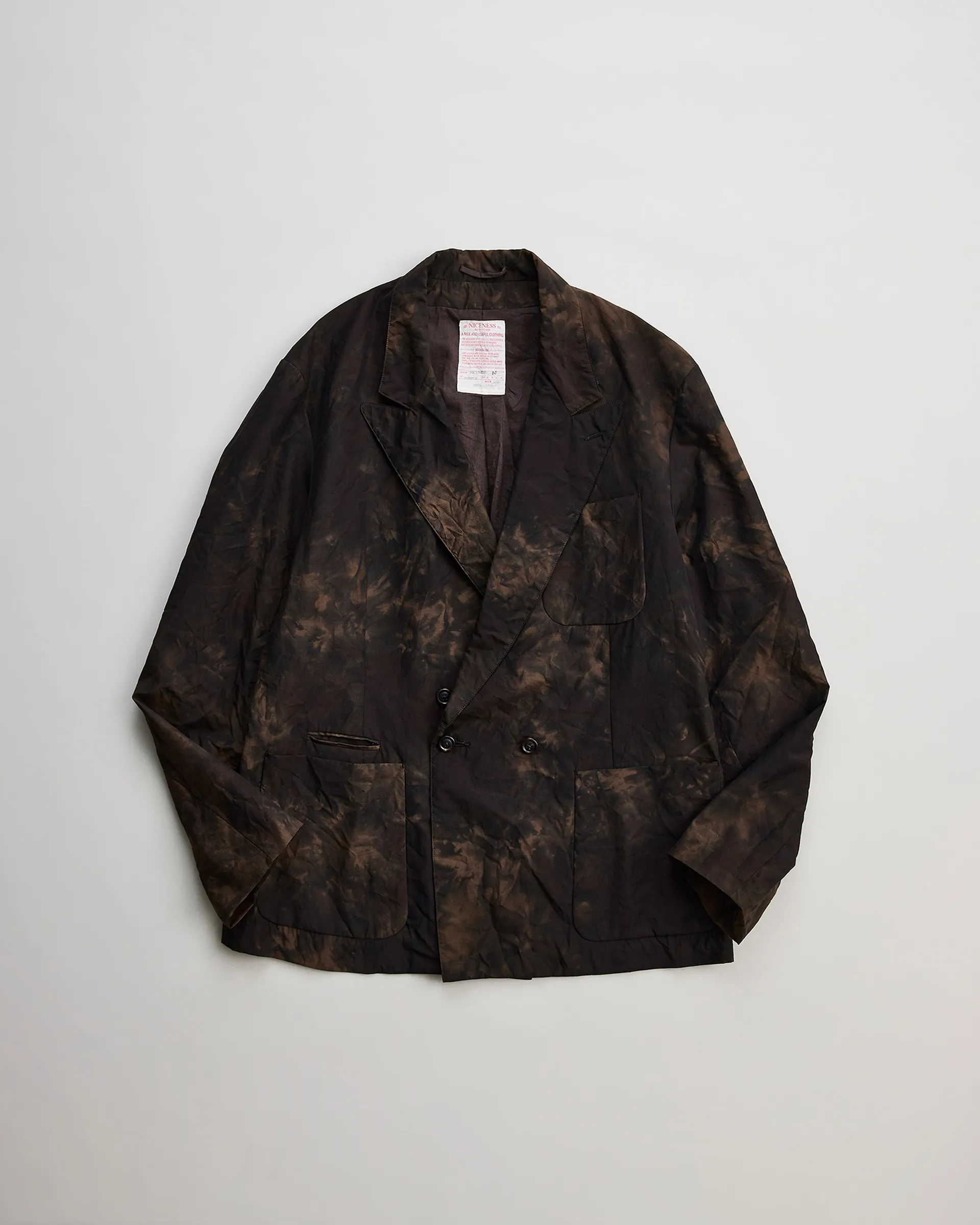 極細ナイロンフィラメントのセミダル糸、防縮ウールとナイロンの精紡交撚糸を使用した生地で製作したダブルブレストジャケット。型はフランスのクラシカルなテーラードスタイルとイギリスのダブルブレストジャケットの構造美をリファレンスとしたオリジナルパターン。ナイロンの品のある光沢と強撚ウールによるシャリ感・ハリ感が共存する春夏に最適なドライタッチのファブリックです。生地は職人の手作業による籠染め加工で仕上げ、一点物のような表情を実現。袖は一枚仕立ての立体構造。新旧の技術と東西の文化を内包しながらモダンに昇華された一着です。