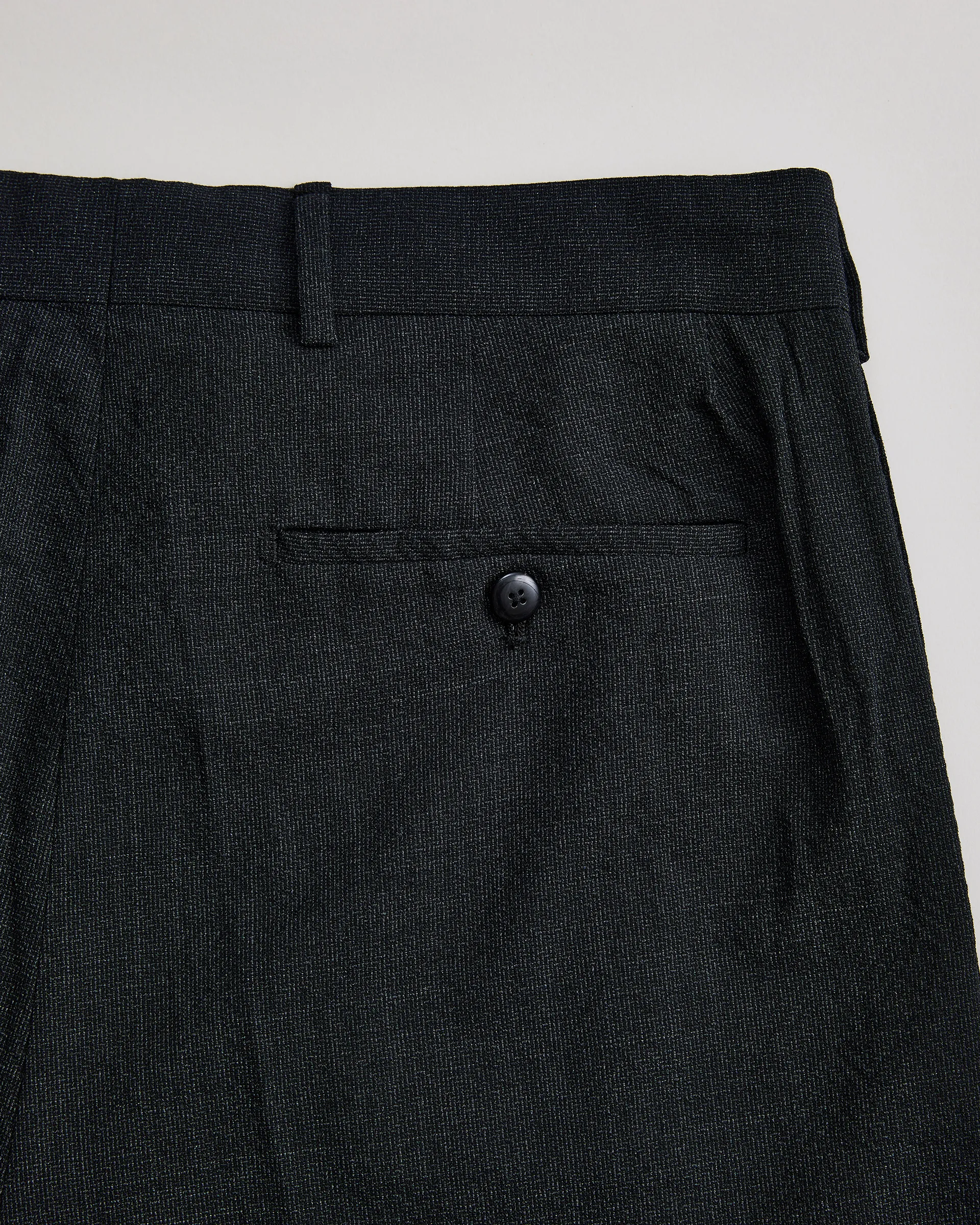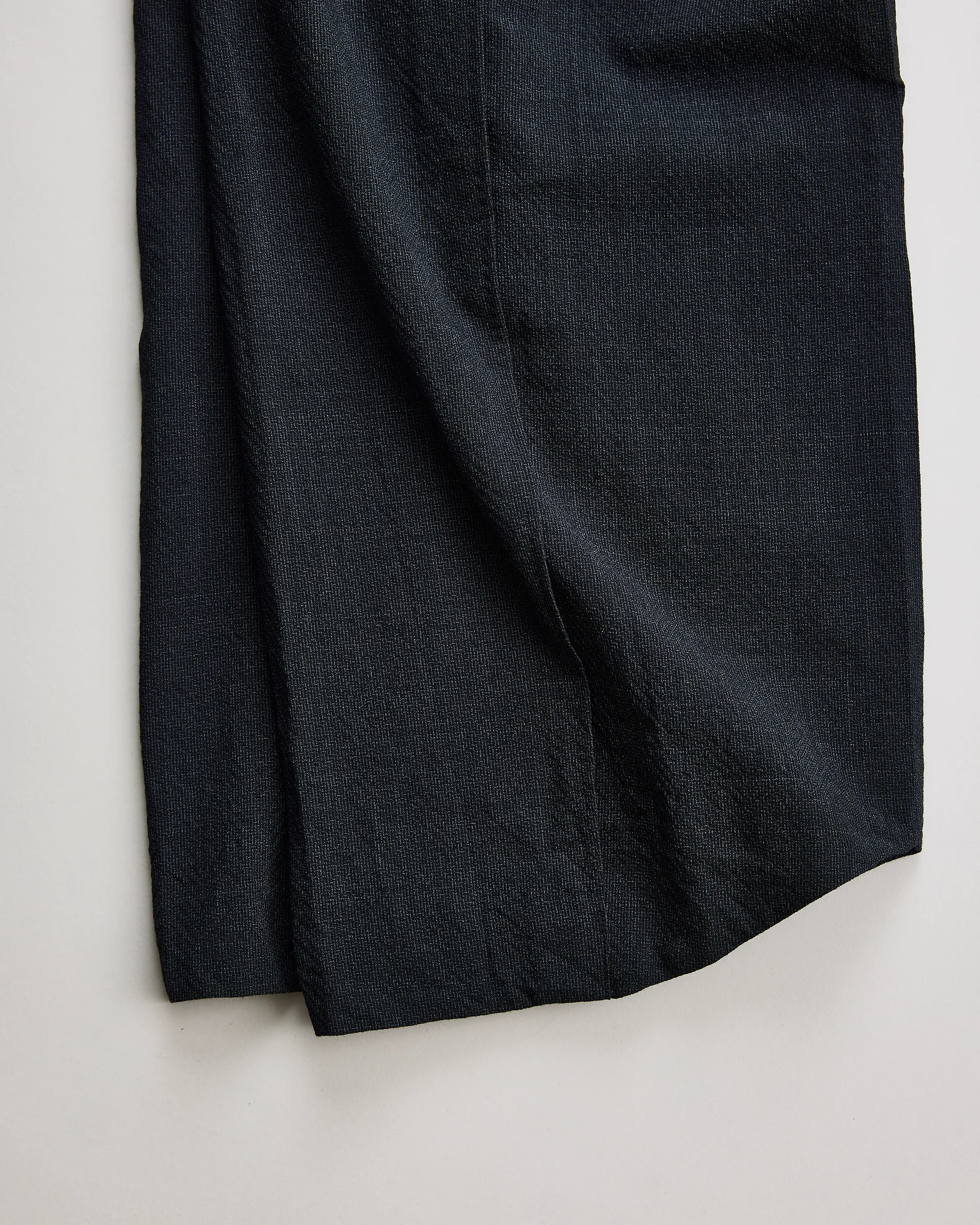 3種の細番手メリノウールをオリジナル紡績したZ撚り平織りヘリンボーン生地で製作したフライングVトラウザー。前後で裾設計バランスを変えた独自のフライングVパターンを採用し、フロントには自然な弛み、背面はストンと落ち、動きに呼応して表情が変化するシルエットを実現。黒色以外はTOP糸の使用により深みのある色合いとナチュラルなムラ感が奥ゆかしさを漂わせます。機能美と構築性を併せ持つシルエットに、素材の繊細さと奥行きを宿した都市と自然のどちらにも馴染む一本。着用を重ねることで深みを増し、静かに個性を育てていくトラウザーです。