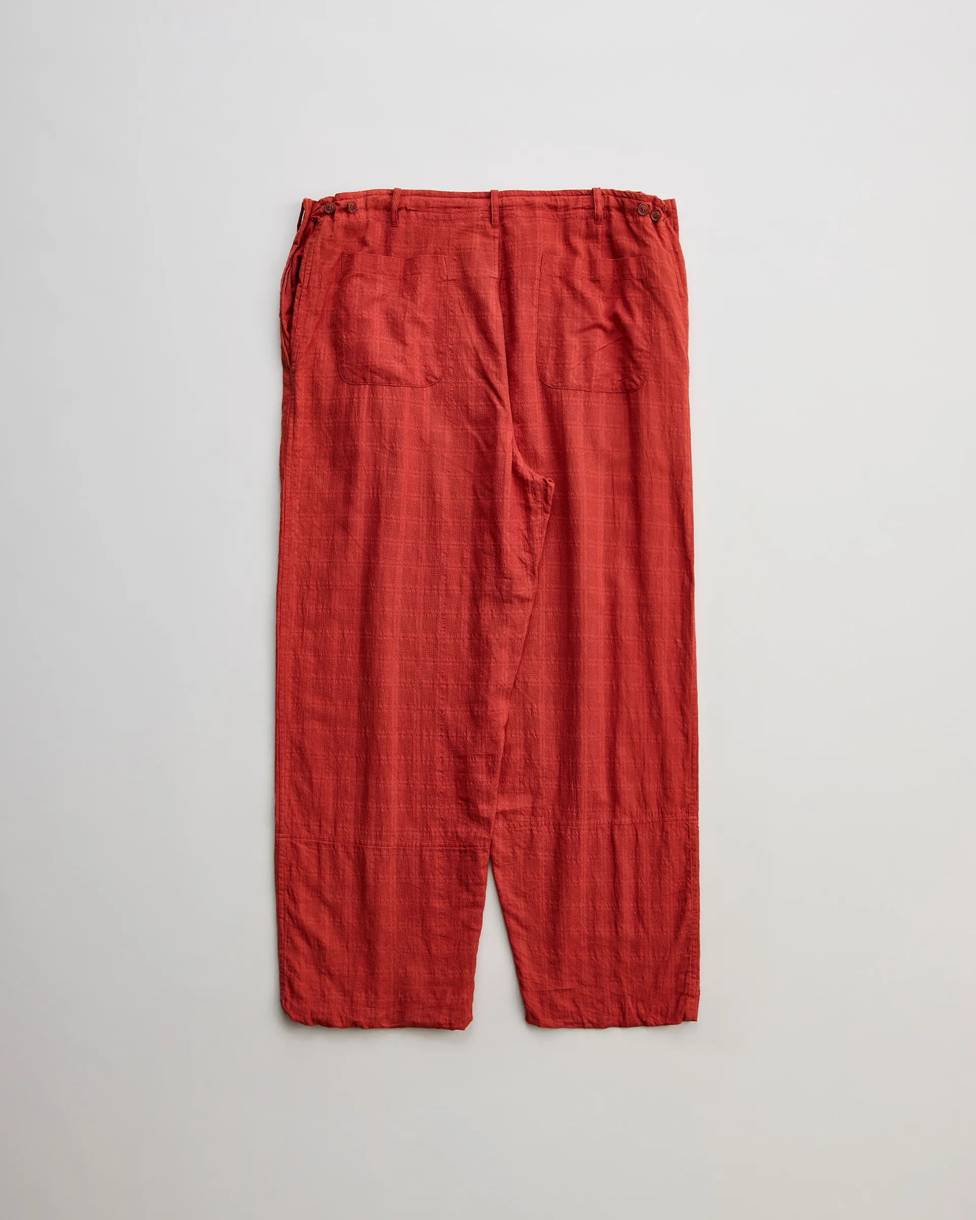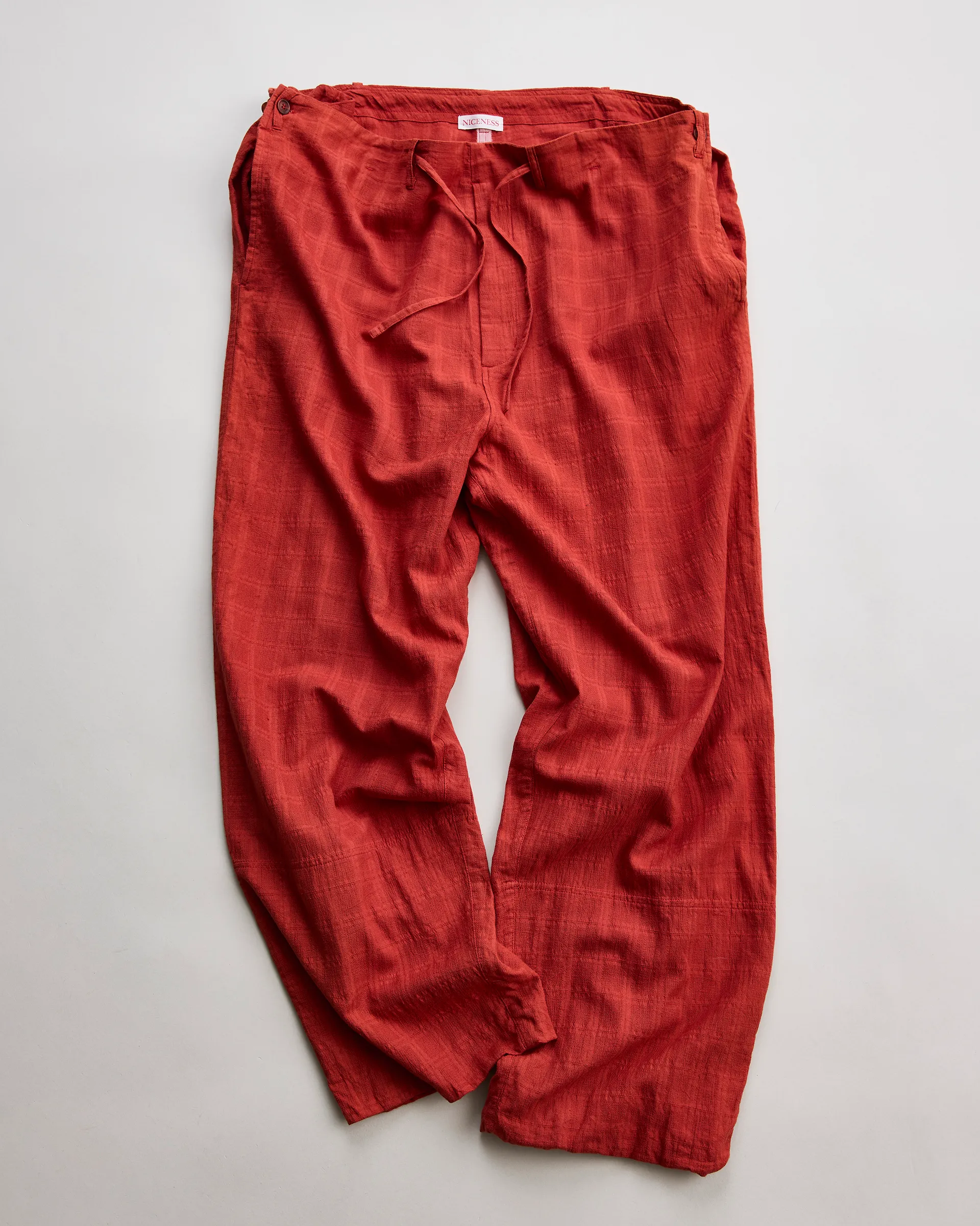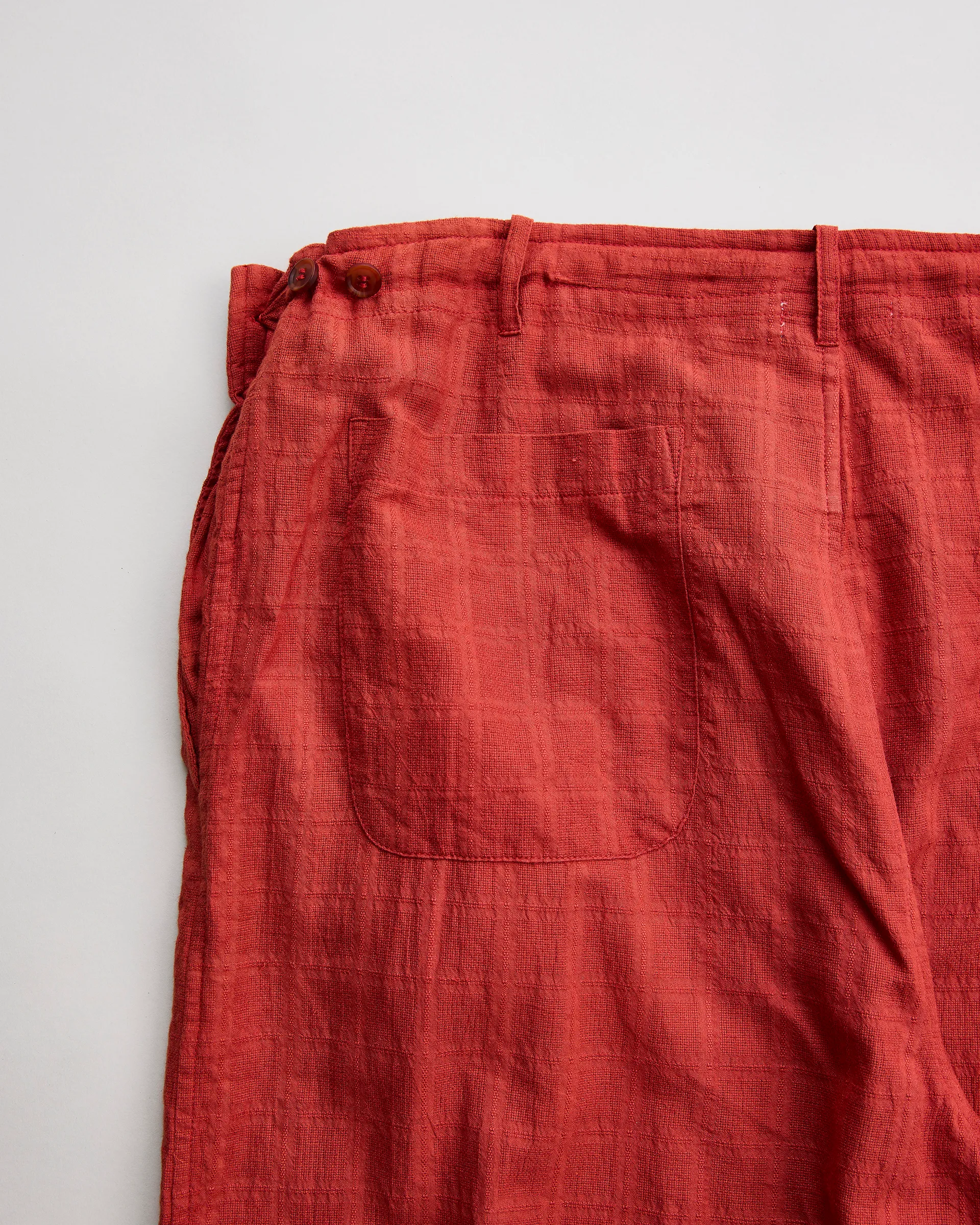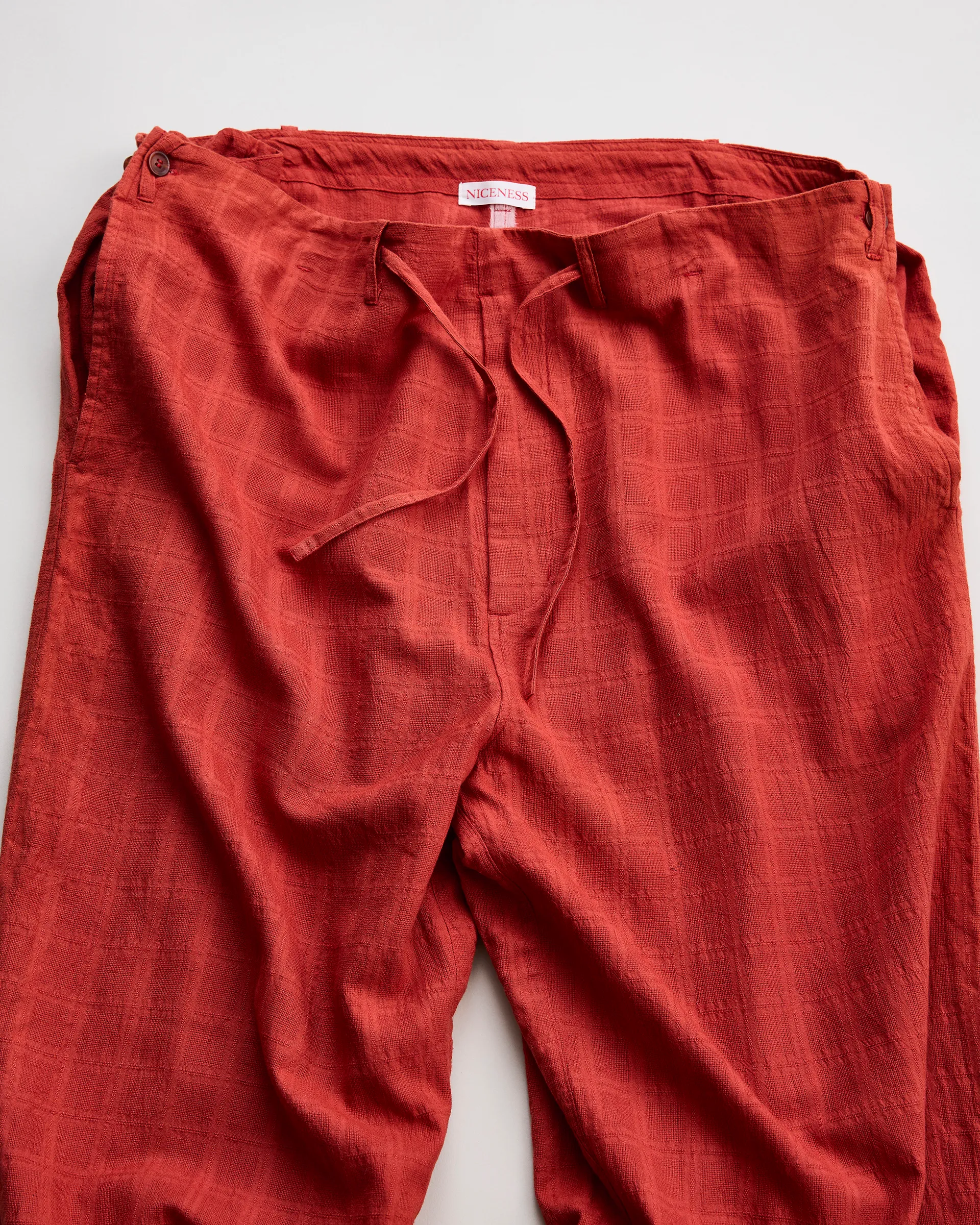 手紡ぎ・手織りのカディコットンに草木染めを施したジャカードチェック生地で製作したクルタパンツ。南アジアの伝統衣装「クルタパンツ」と、ヨーロッパのサイド開きセーラーパンツの構造を掛け合わせたハイブリッドデザイン。生地は特殊な手織りジャカード織機を用い、ドビー織りや絡み織りなど多様な技法を織り交ぜて奥行きのある独自のチェック柄を表現。ウエストはイージーパンツ仕様とし、快適な着用感と動きやすさを両立させています。伝統技法と異文化要素を現代的に再構築したNICENESSらしさが光る一着です。